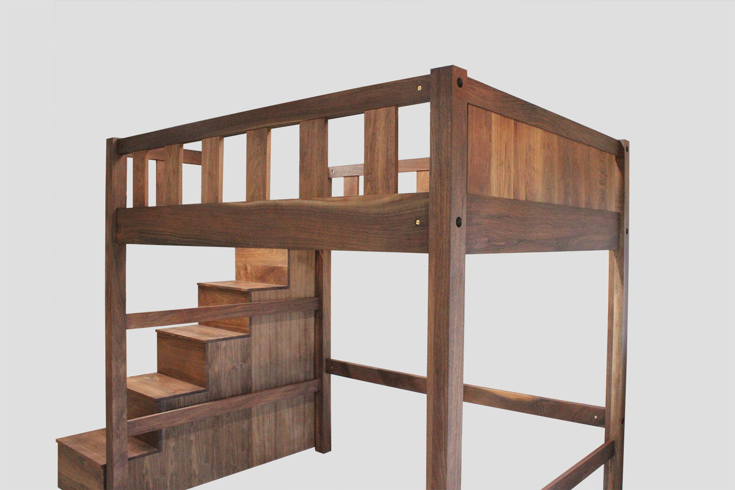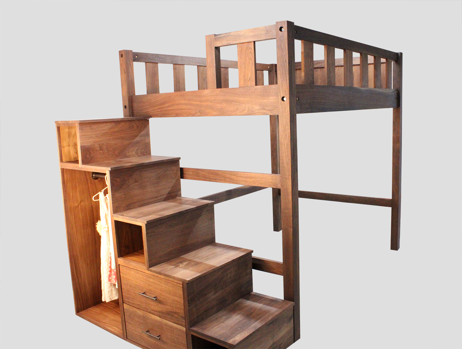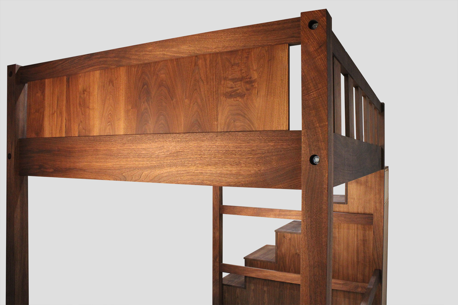 Our client was looking to elevate his daughter’s sleeping experience with a special furniture piece that’s one-of-a-kind. The Willow Loft Bed combines the natural beauty of wood with the practicality of a raised bed. Crafted from solid Black Walnut, this bed offers a stylish and space-saving solution for a smaller bedroom. The spacious staircase offers a fun and effortless way to the top, while incorporating a ton of storage via two large drawers, a wardrobe for hanging clothes, and three open cubbies to store or display smaller items. It’s a sophisticated and stunning piece of furniture that helps create a cozy and elegant space. Finished with hand-rubbed oil, the Willow Loft Bed was crafted to provide more than a lifetime of enjoyment.