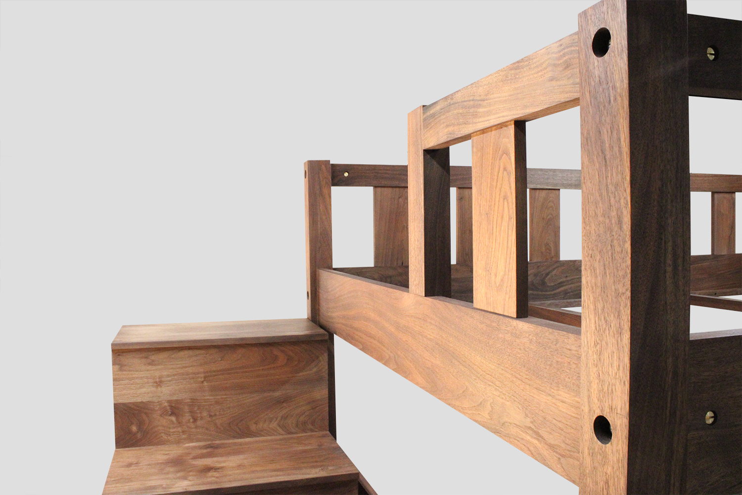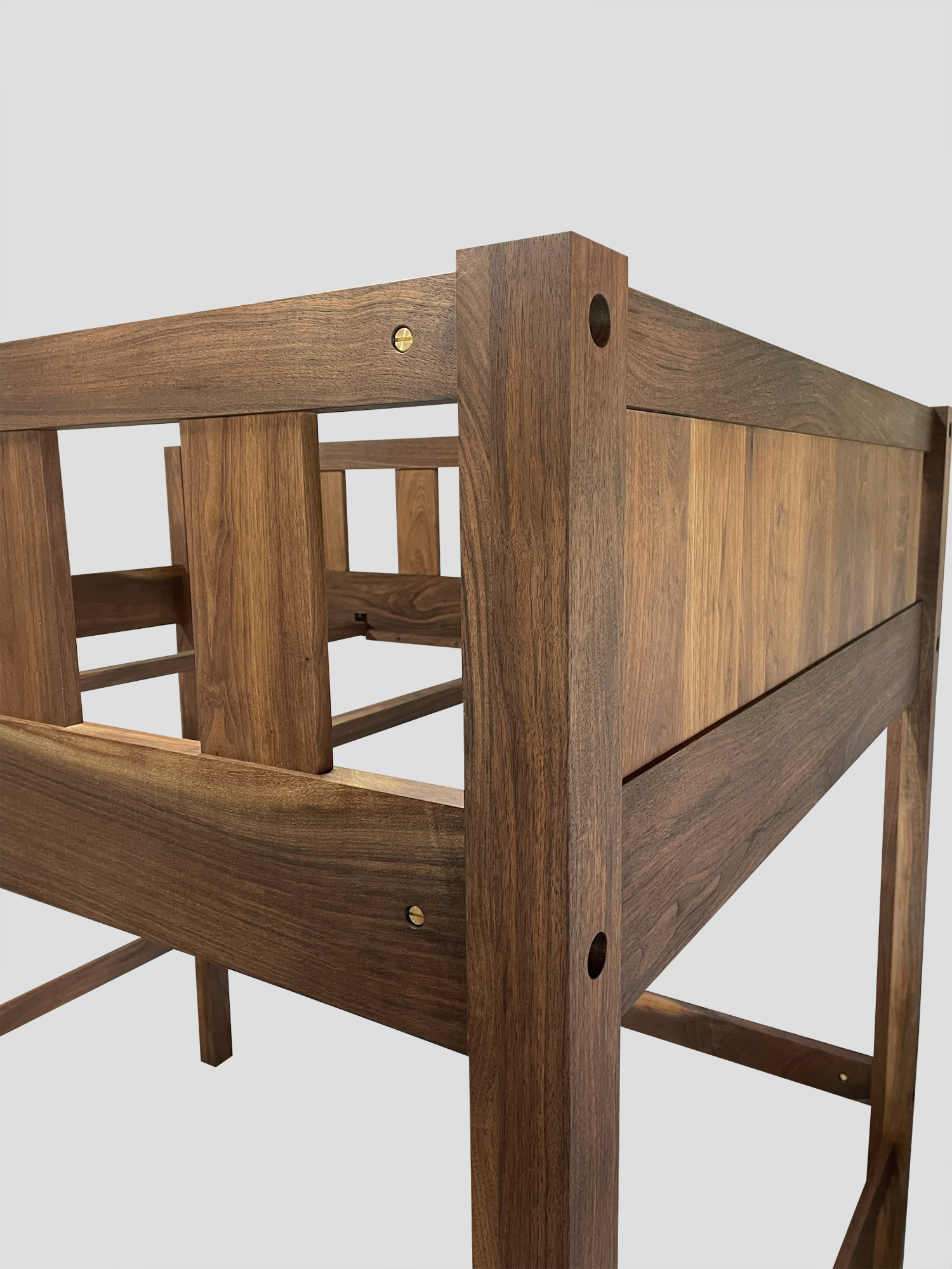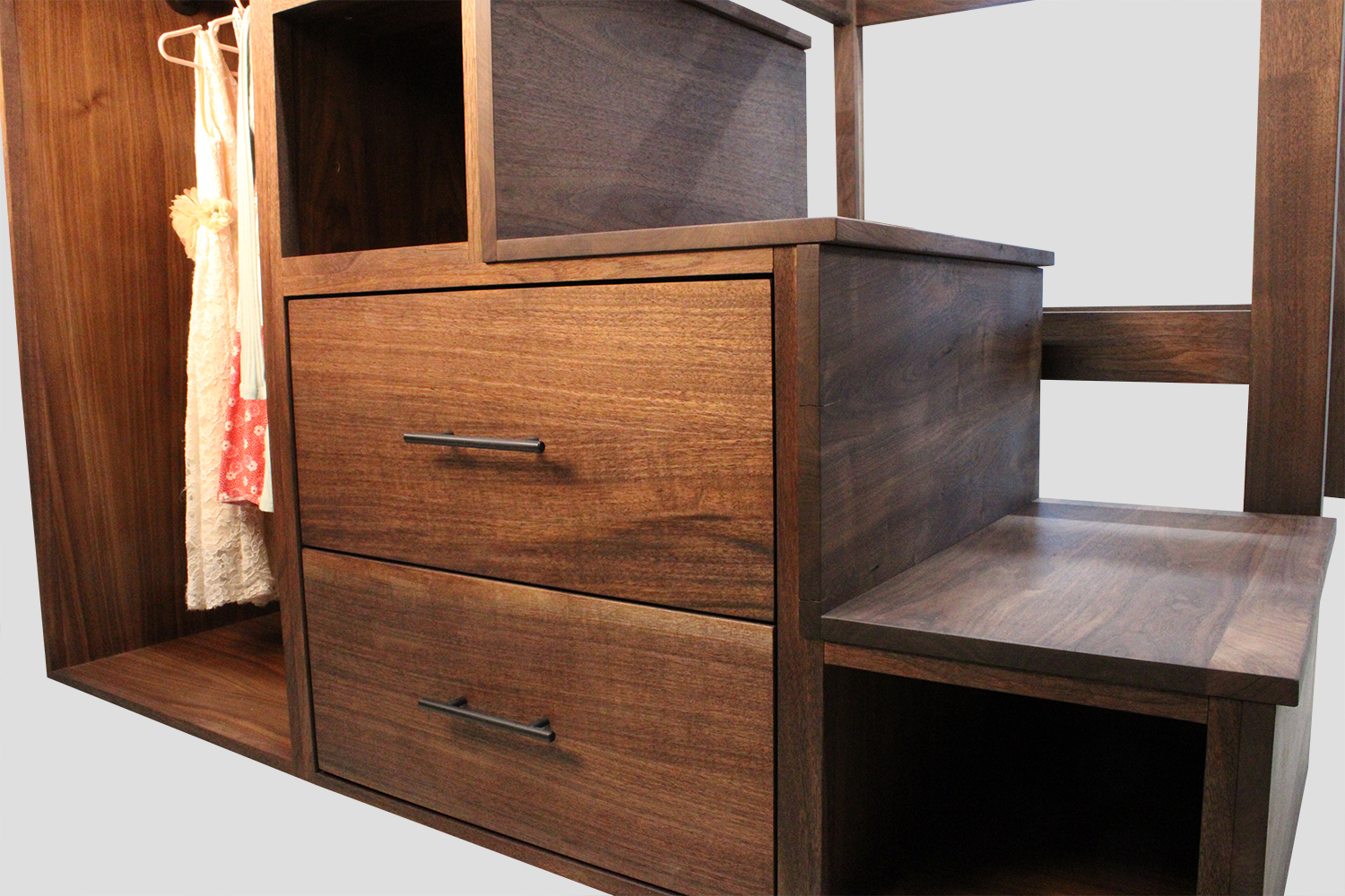 Our client was looking to elevate his daughter’s sleeping experience with a special furniture piece that’s one-of-a-kind. The Willow Loft Bed combines the natural beauty of wood with the practicality of a raised bed. Crafted from solid Black Walnut, this bed offers a stylish and space-saving solution for a smaller bedroom. The spacious staircase offers a fun and effortless way to the top, while incorporating a ton of storage via two large drawers, a wardrobe for hanging clothes, and three open cubbies to store or display smaller items. It’s a sophisticated and stunning piece of furniture that helps create a cozy and elegant space. Finished with hand-rubbed oil, the Willow Loft Bed was crafted to provide more than a lifetime of enjoyment.
