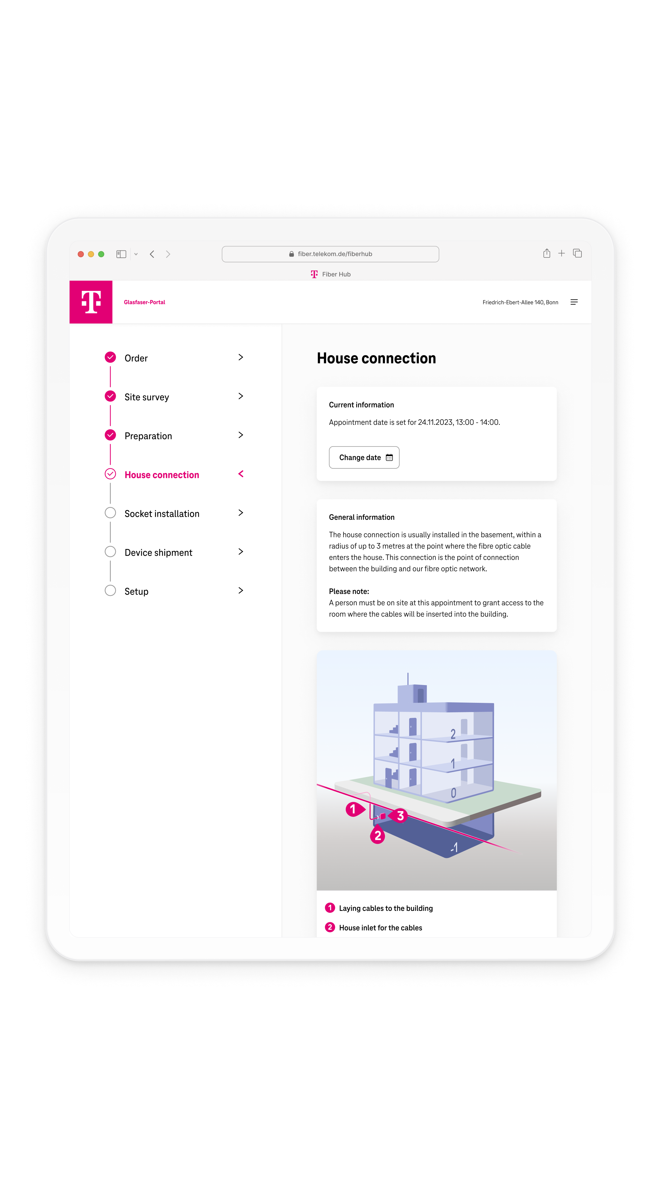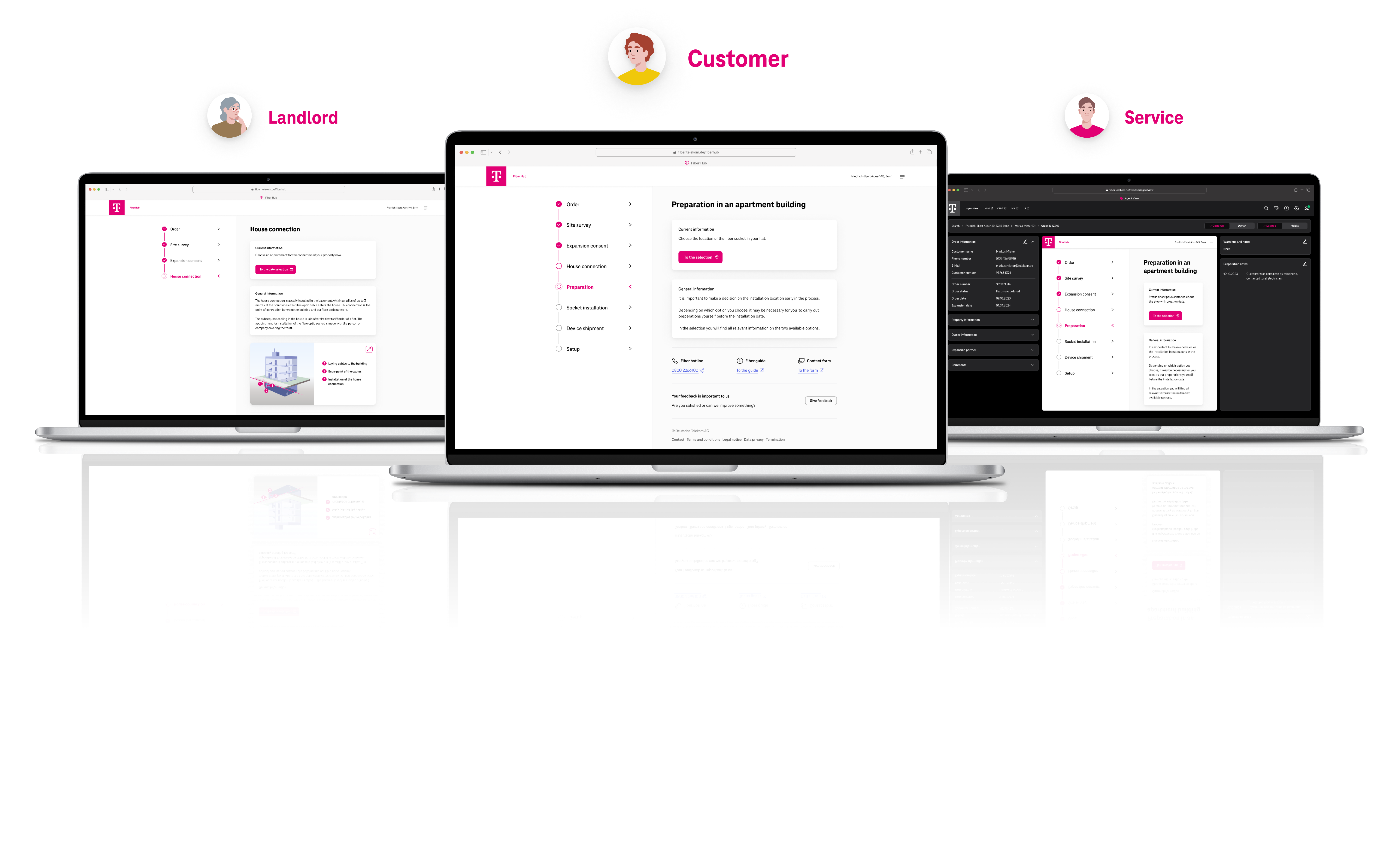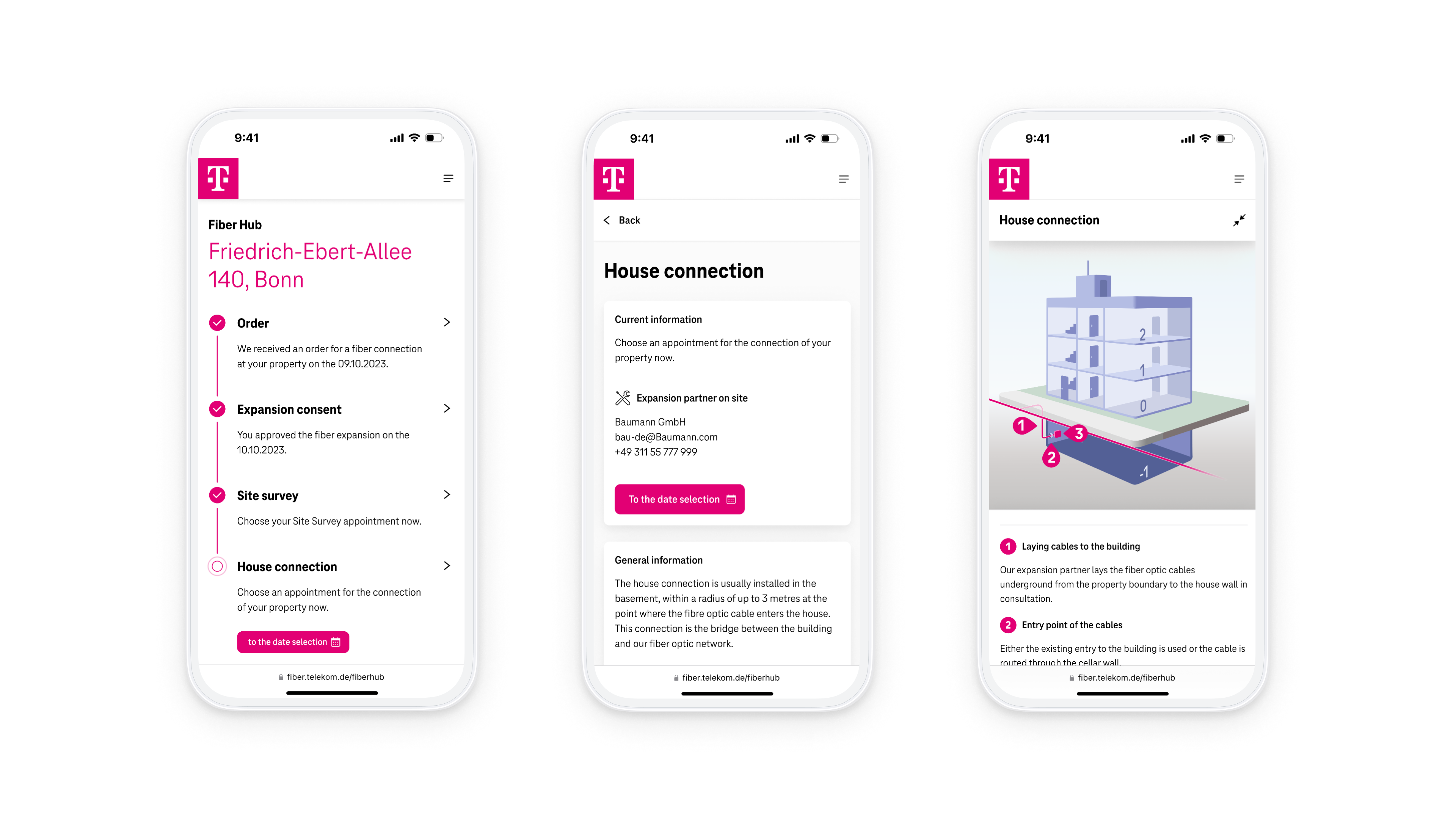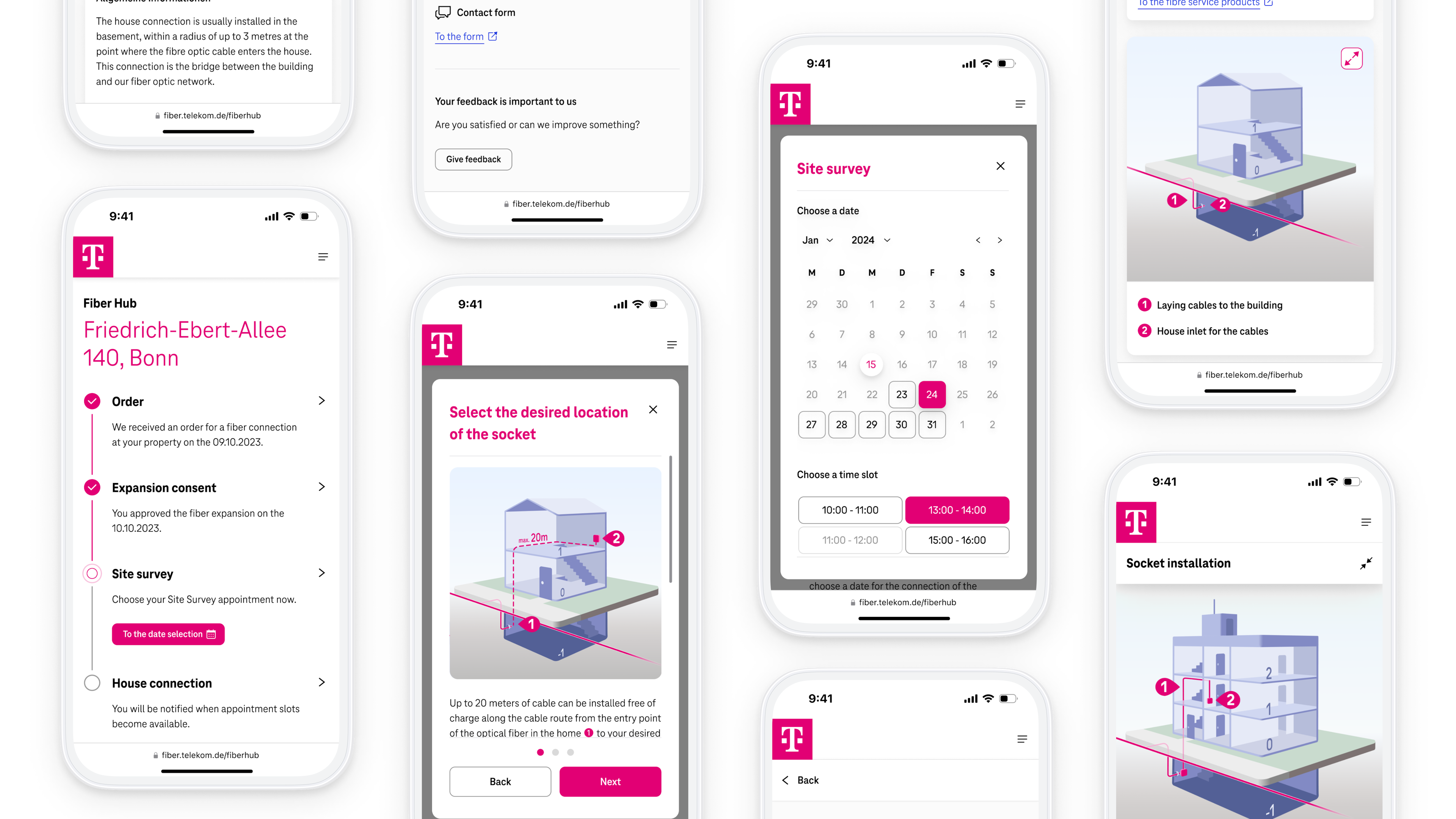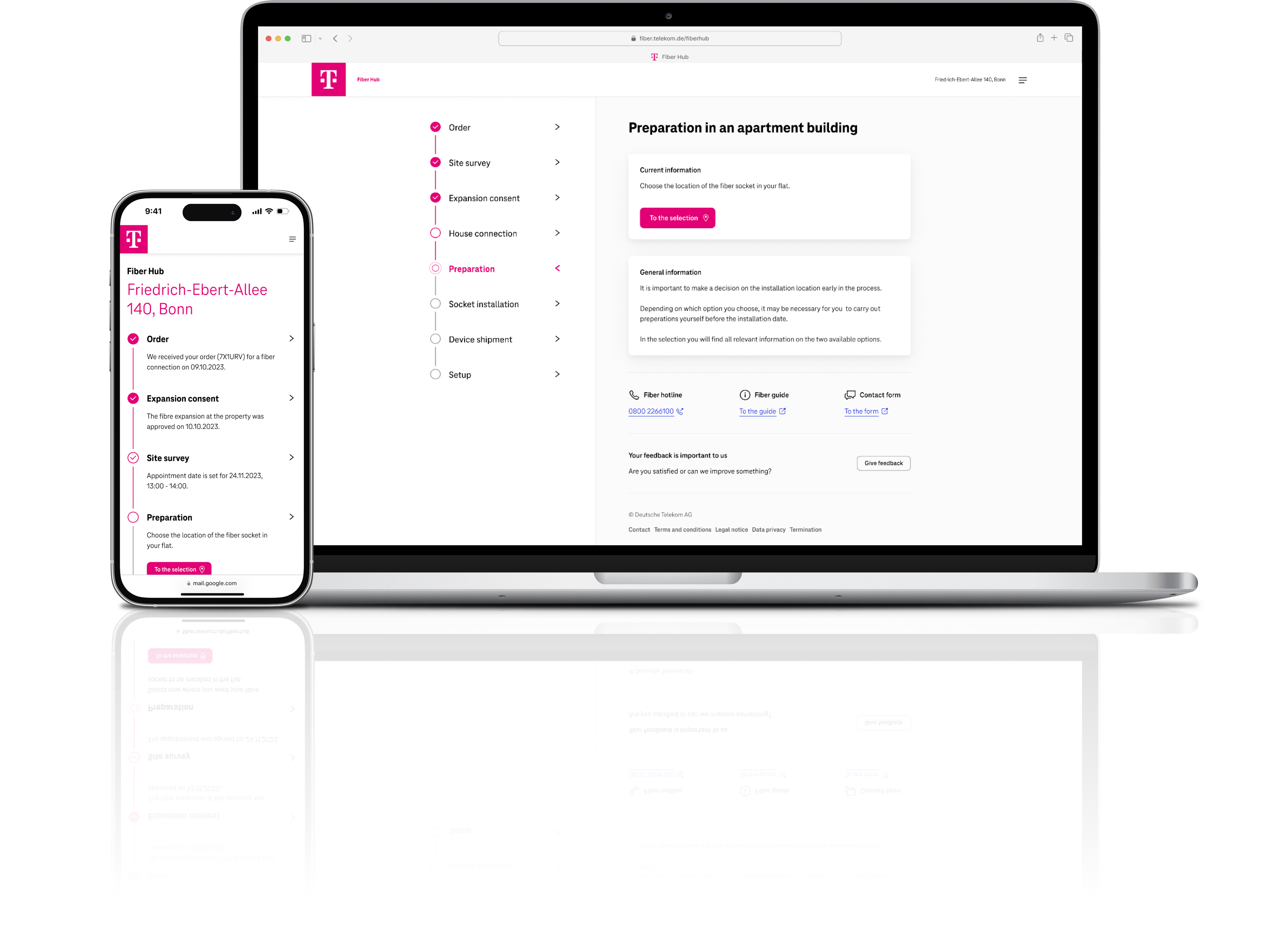 Millions of households in Germany need access to our fast fiber networks. In order to lay fiber optic cables into every home, we have to coordinate hundreds of construction companies nationwide simultaneously – and arrange each construction step individually with customers, landlords or property managers. To offer everyone full transparency and planning security, we have developed the Fiber Hub: an easily accessible central platform, that orchestrates all steps automatically and where customers can participate live in the expansion progress. The Fiber Hub translates complex building processes into an easy-to-understand, effortless experience.