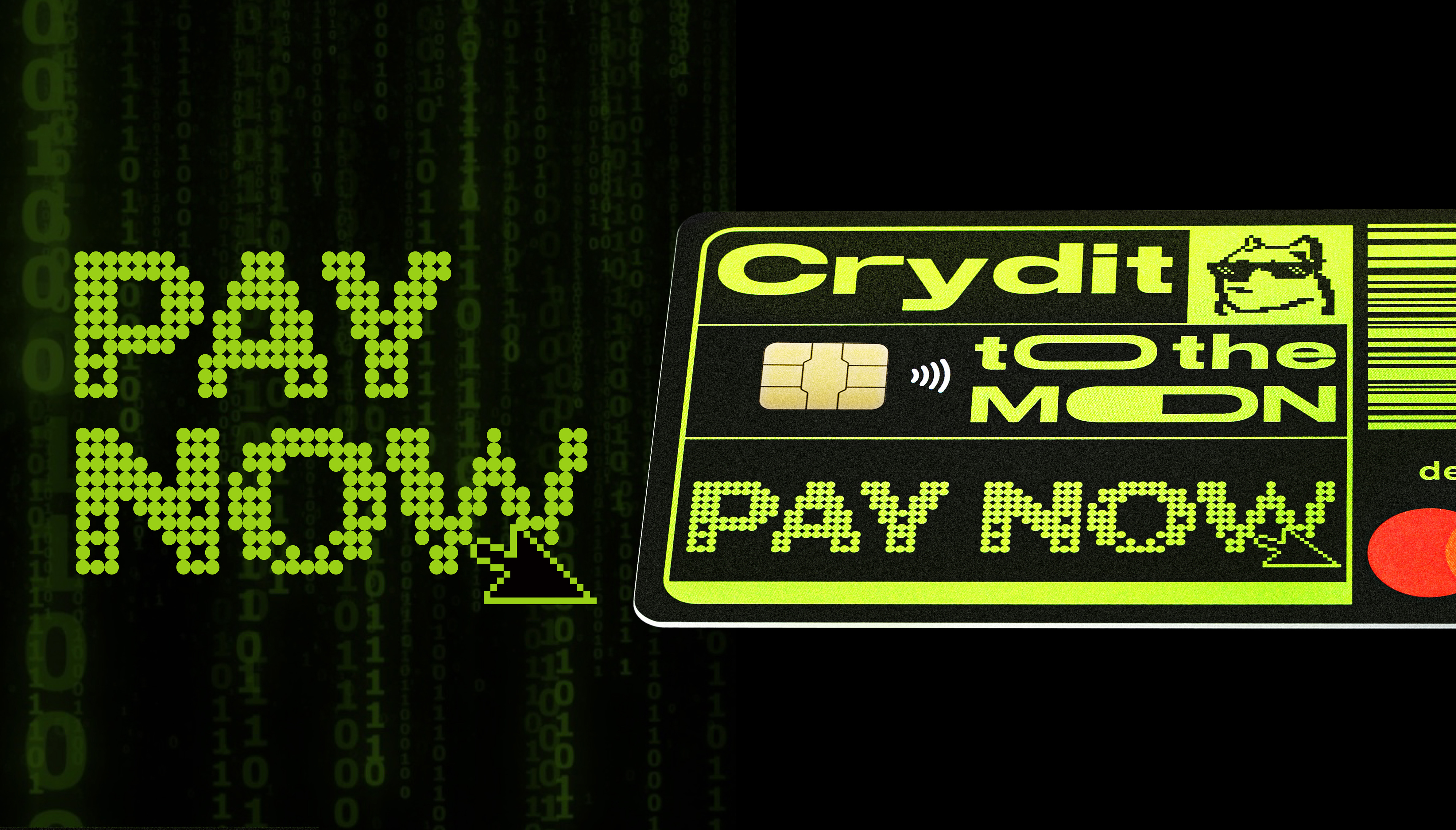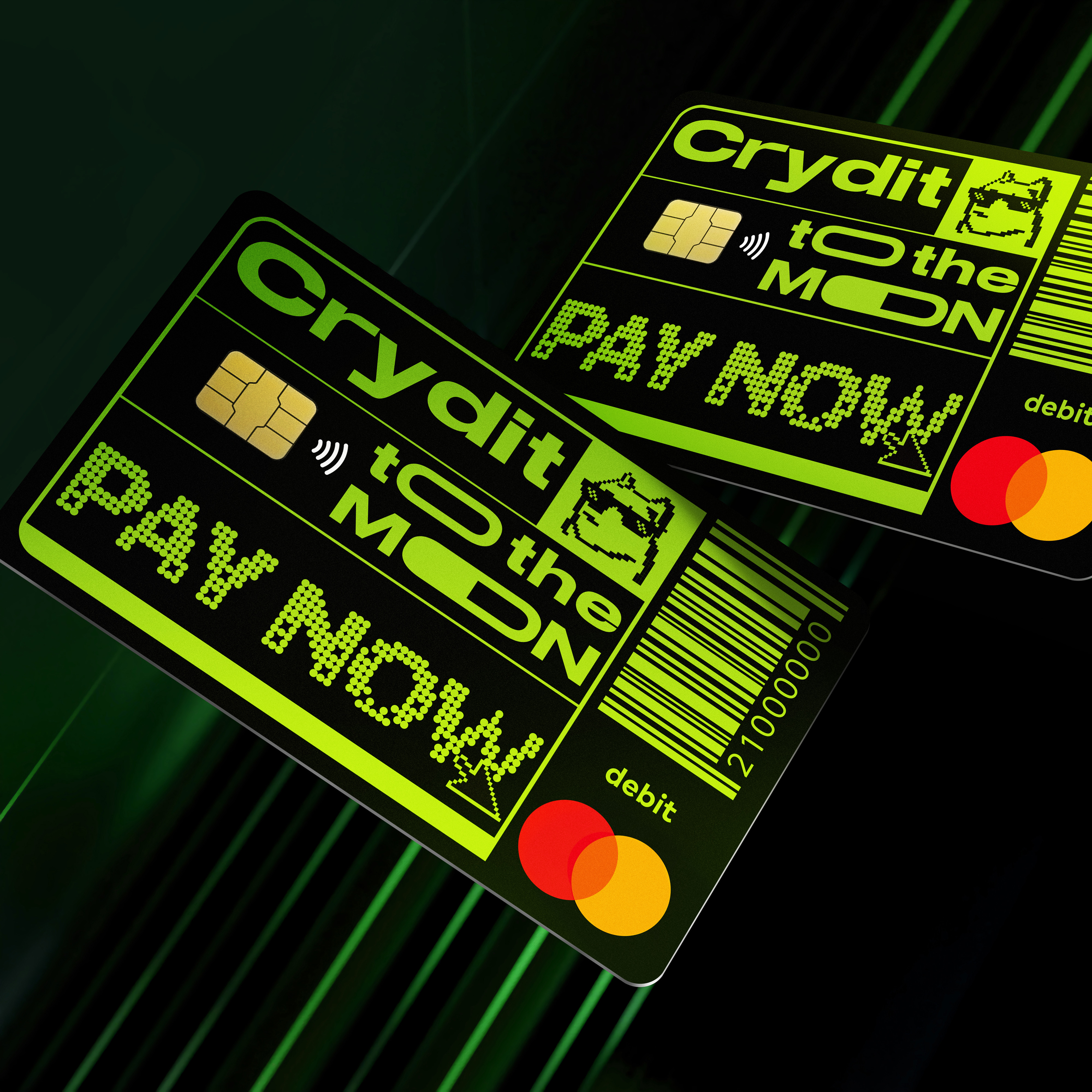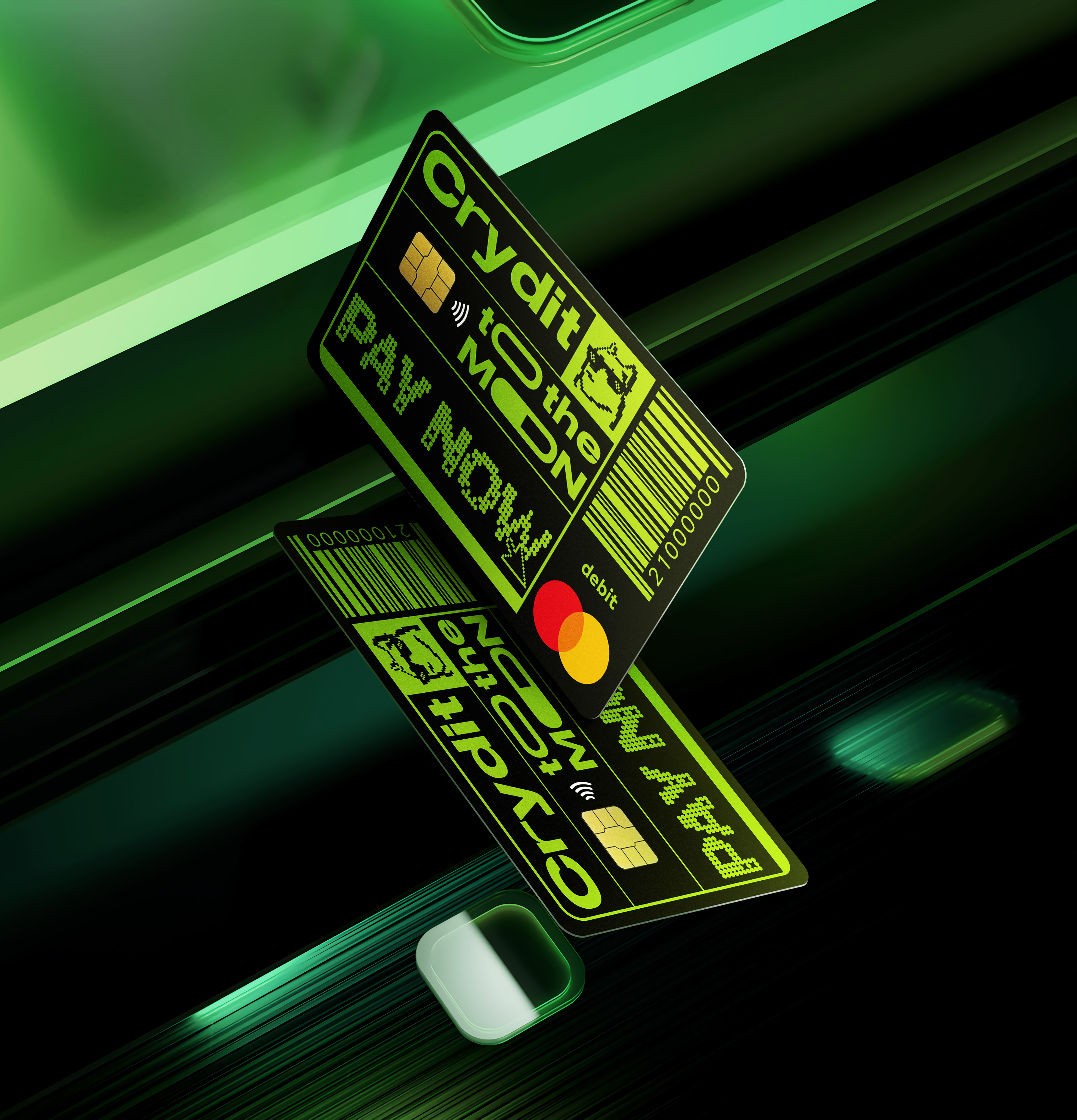 The card exudes a high-tech and futuristic aesthetic, epitomizing Crydit's very essence—unyielding exploration, relentless pursuit of freedom and dreams, and a bold challenge to conventional norms. The phrase "Pay Now" on the card is rendered in a pixel font popular within the Crypto community, conveying its rapid conversion capability and adaptability across various payment scenarios. The card is also adorned with iconic crypto elements, such as the "21,000,000" Bitcoin limit, a Doge icon, and the aspirational slogan "to the Moon". These playful and significant visual cues emphasize the seamless connection between Crydit Card and the crypto ecosystem, as well as its role in propelling users towards a brighter crypto future. Moreover, the predominant green hue serves two purposes: firstly, it capitalizes on the association of green with rising cryptocurrency values, leaving a secure and reliable impression on users. Secondly, it reflects the crypto industry's commitment to environmental sustainability through increased investments in renewable energy and the adoption of energy-efficient consensus algorithms. These design elements highlight that Crydit Card is more than just a convenient and secure tool for crypto-to-fiat currency conversion and daily payments; it resonates with the progressive values and lifestyles of crypto holders.