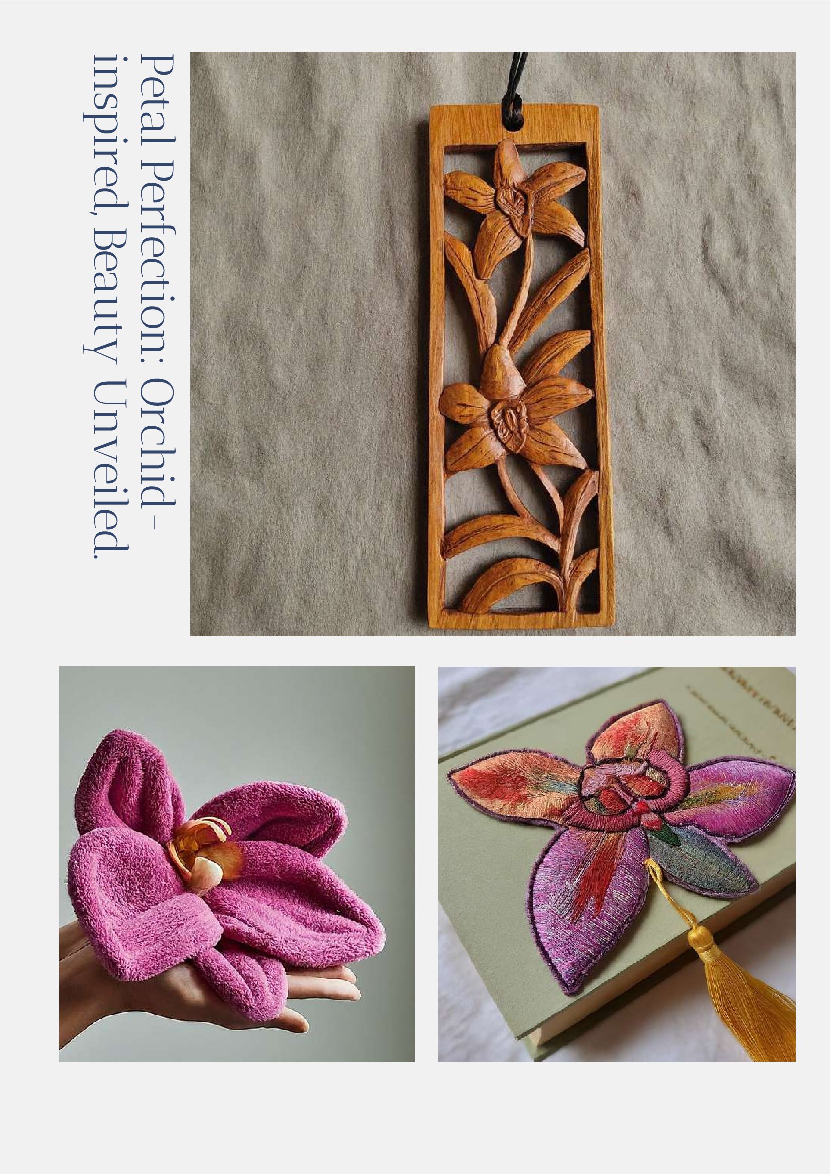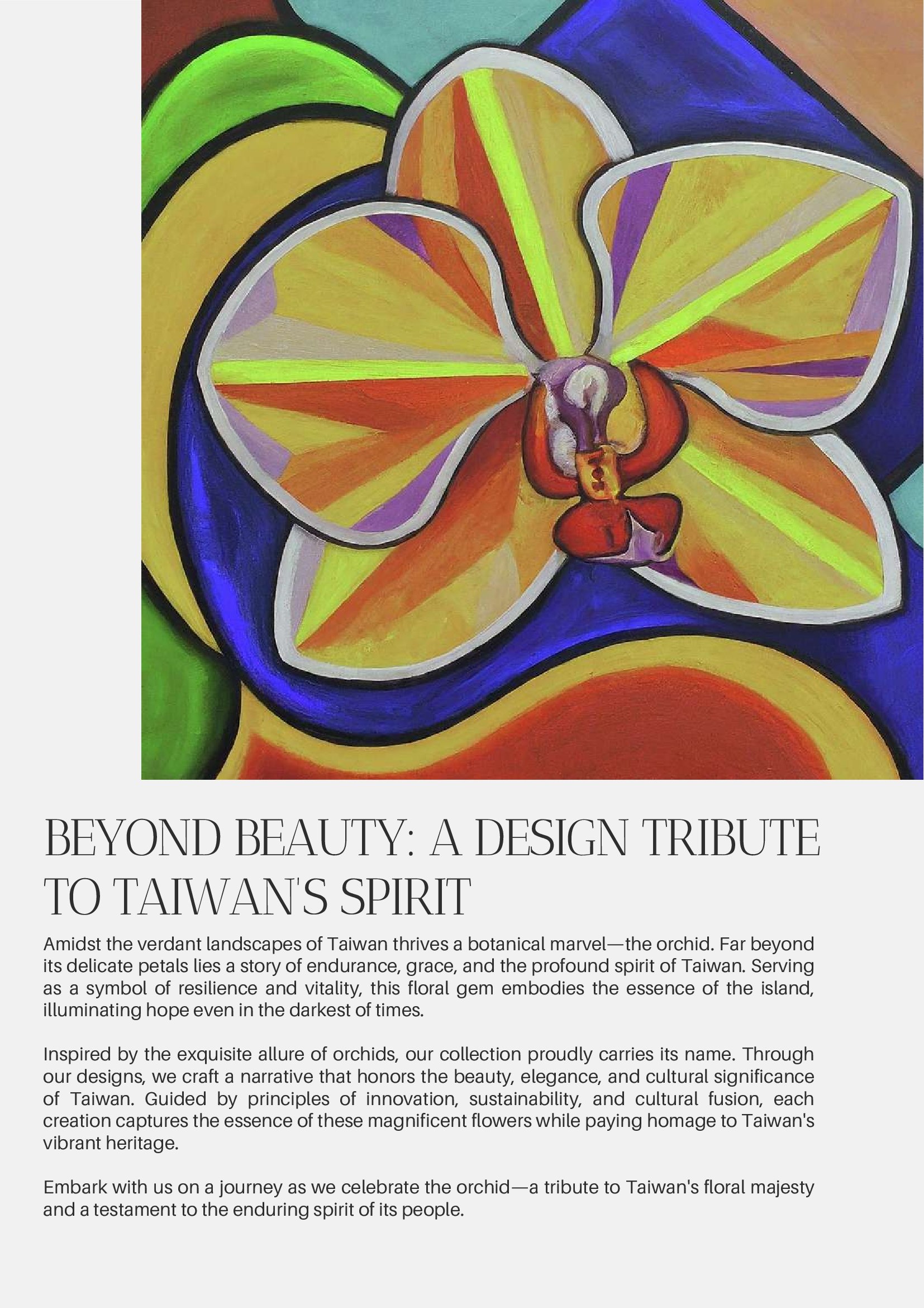 Inspired by the elegance and diversity of Taiwan's orchids, our collection pays homage to these floral treasures. Each design is meticulously crafted to celebrate the intricate beauty and cultural significance of orchids, weaving a narrative that reflects Taiwan's deep-rooted connection to nature and conservation efforts. From the delicate petals to the vibrant colors, every detail is thoughtfully considered to capture the essence of these magnificent flowers.