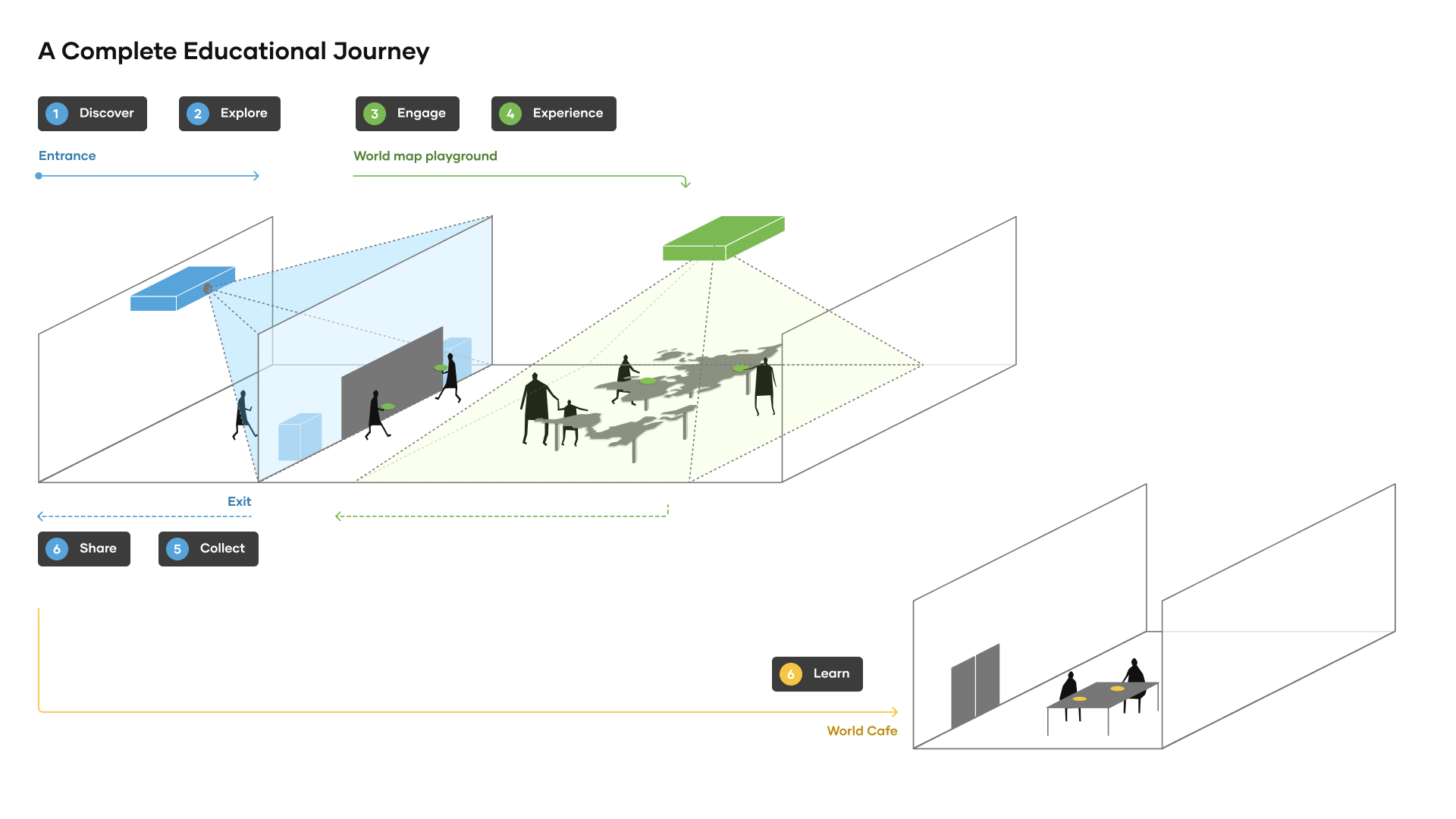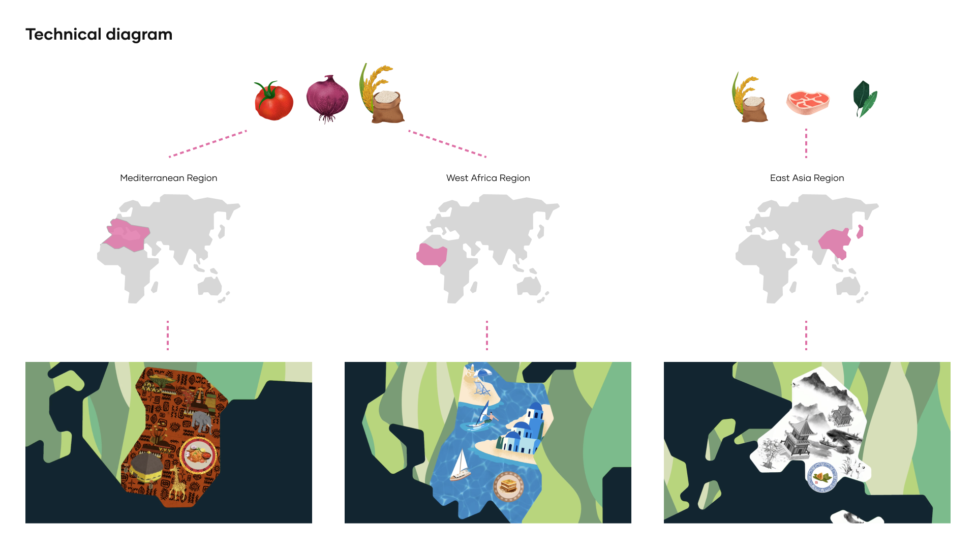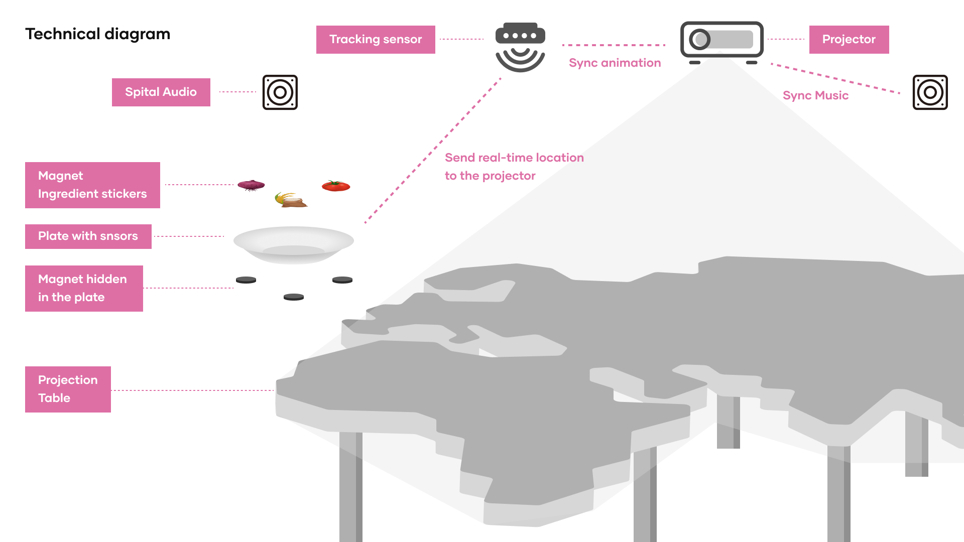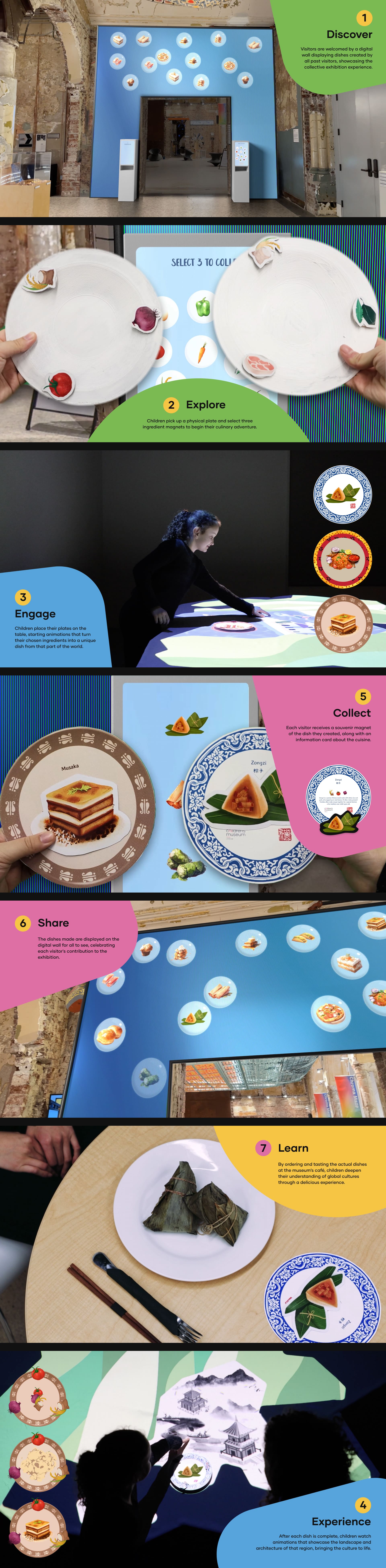 The adventure starts with children picking up a plate and selecting three food ingredient magnets. In the exhibition room, a large table with a world map projected on it awaits them. When they place their plates on the table, the region under the plate lights up and animates to show their chosen ingredients being cooked in this region. The ingredients then transform into a cuisine unique to that part of the world, projected onto the plate. This interactive experience brings each cuisine to life right on their plates, surrounded by animations of the region's landscape, architecture, animals, and music. It's an engaging and educational experience to showcase different cultures to children from the angle of food. As one region is explored, the exhibition invites kids to see how these ingredients are used in other parts of the world, enhancing the learning about cultural diversity. The journey wraps with each child receiving a magnet of the dish they created, complete with a card that provides more information about the cuisine, continuing the education after they leave the exhibition. And for an added treat, they can taste the actual dish in the museum’s café, turning their learning into a delicious reality.