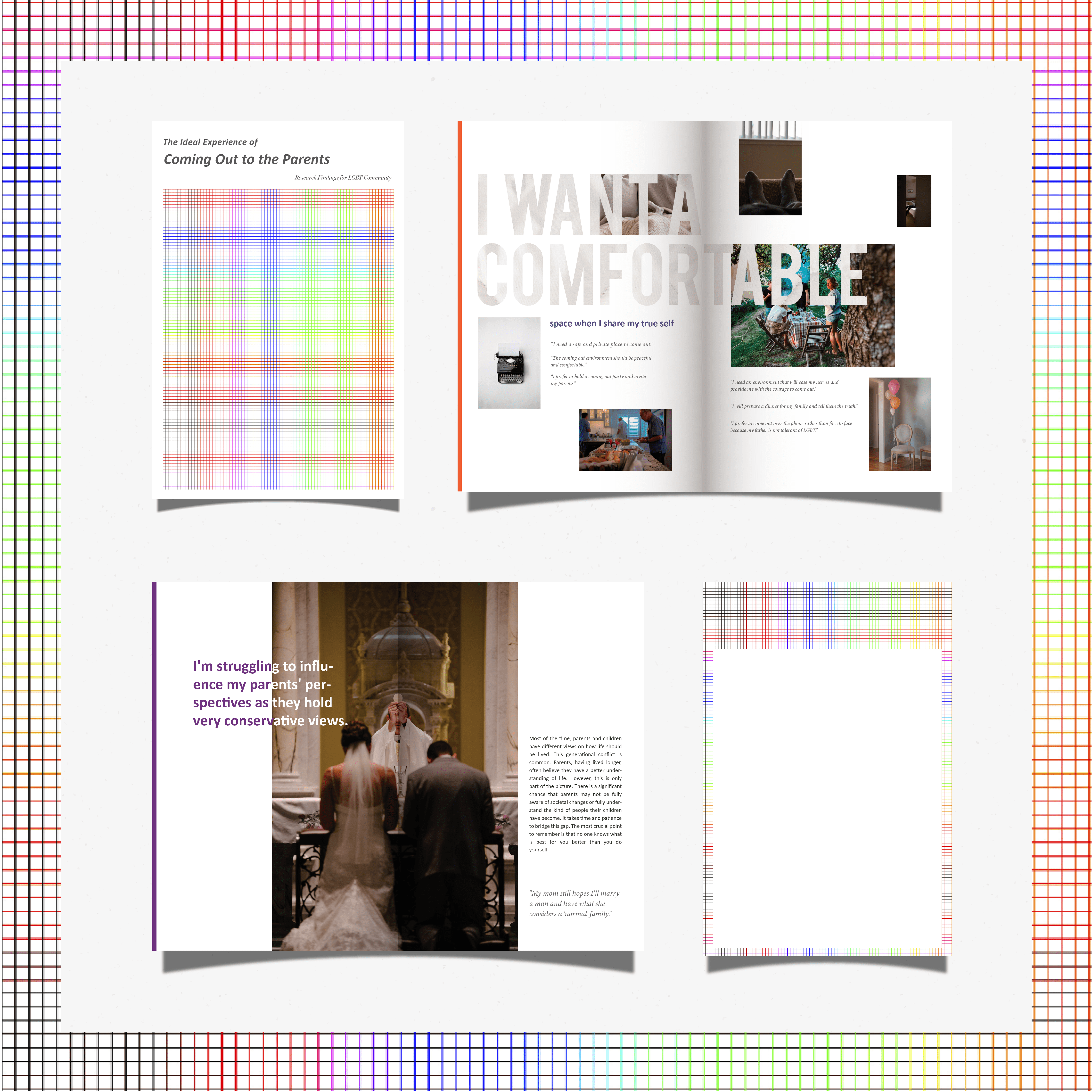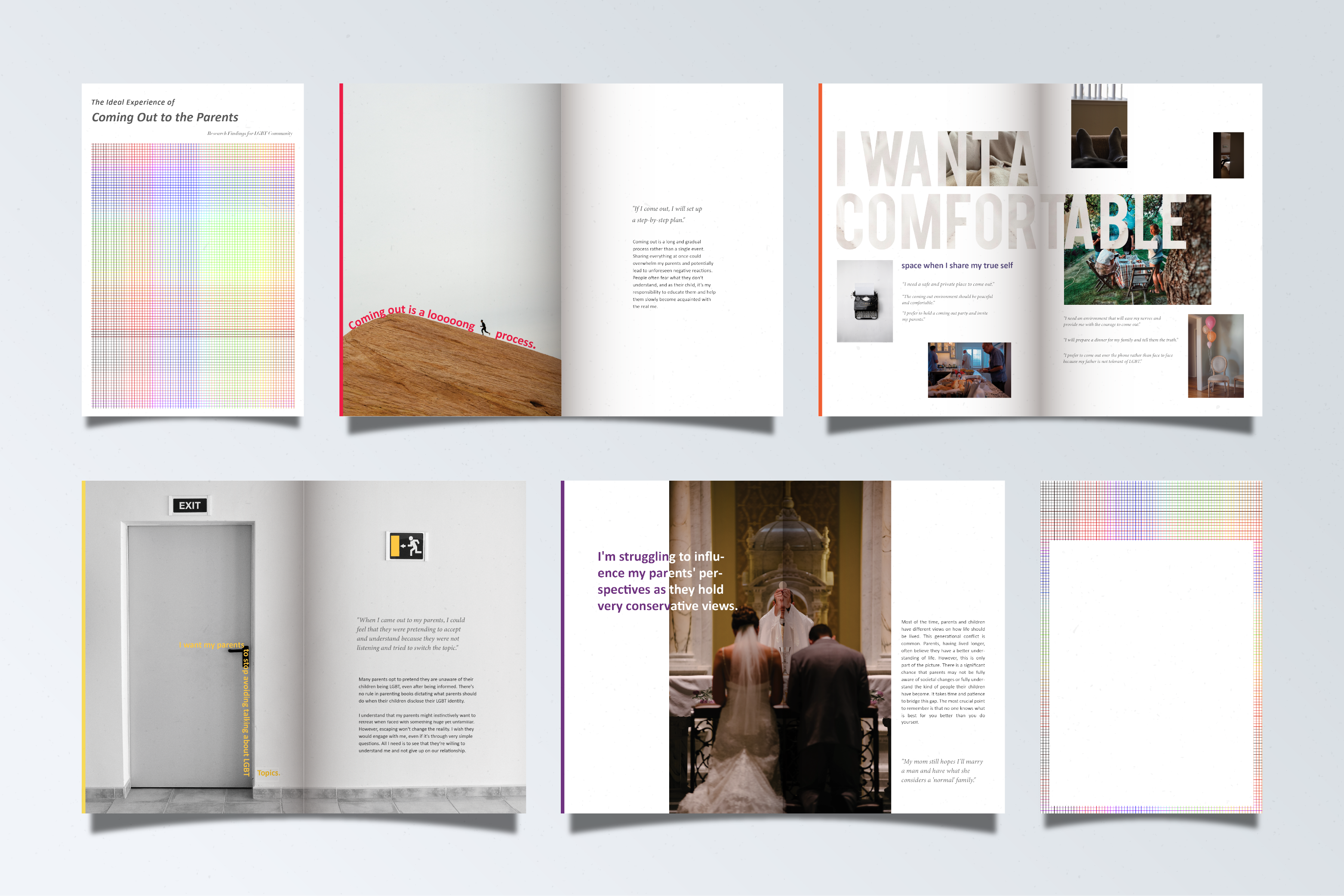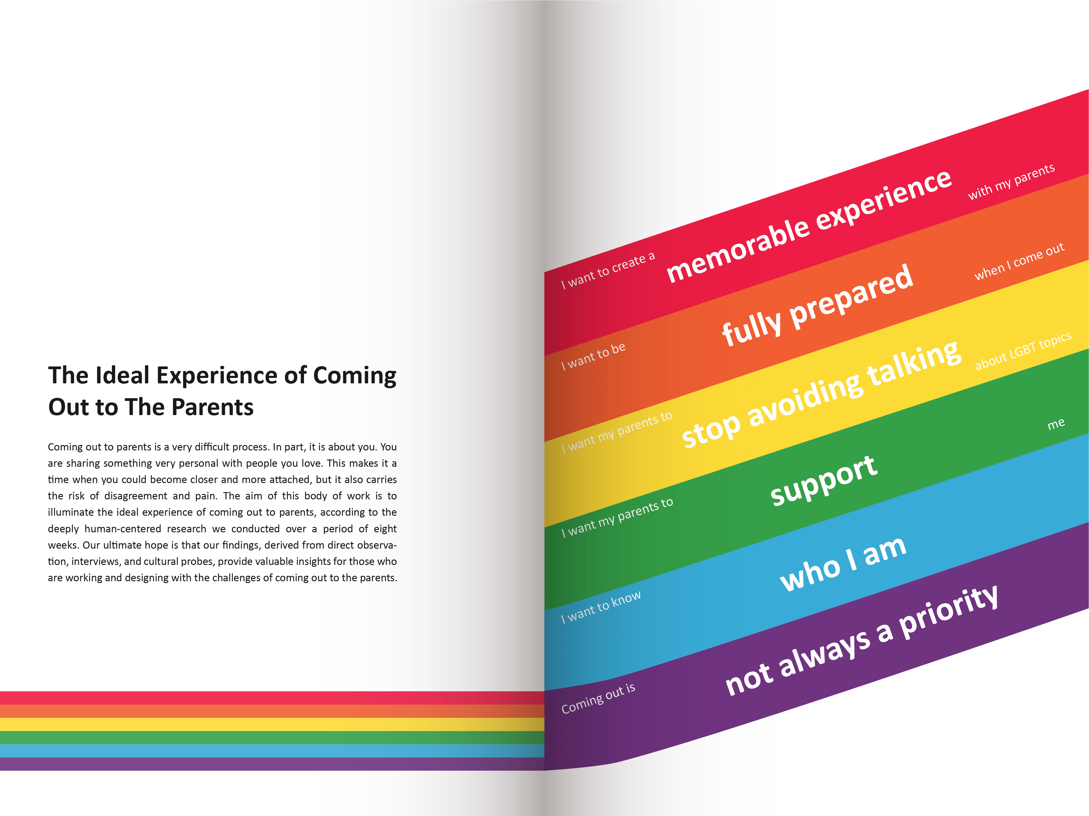 Coming out as LGBT is still difficult and traumatic for many people. This research magazine is based on the contextual research 6 UX specialists conducted on the ideal experience of coming out to parents. We used various methods, including observations, interviews with 26 participants globally, and cultural probes. We have affinitized and analyzed over 800 data points and compiled them into a framework to explain our findings. This magazine aims to provide further insights to designers and enlighten the LGBT community. We hope this magazine is a gift worth keeping and helps audiences see the coming out process from different perspectives and develop their personal understanding of the ideal coming out experience.