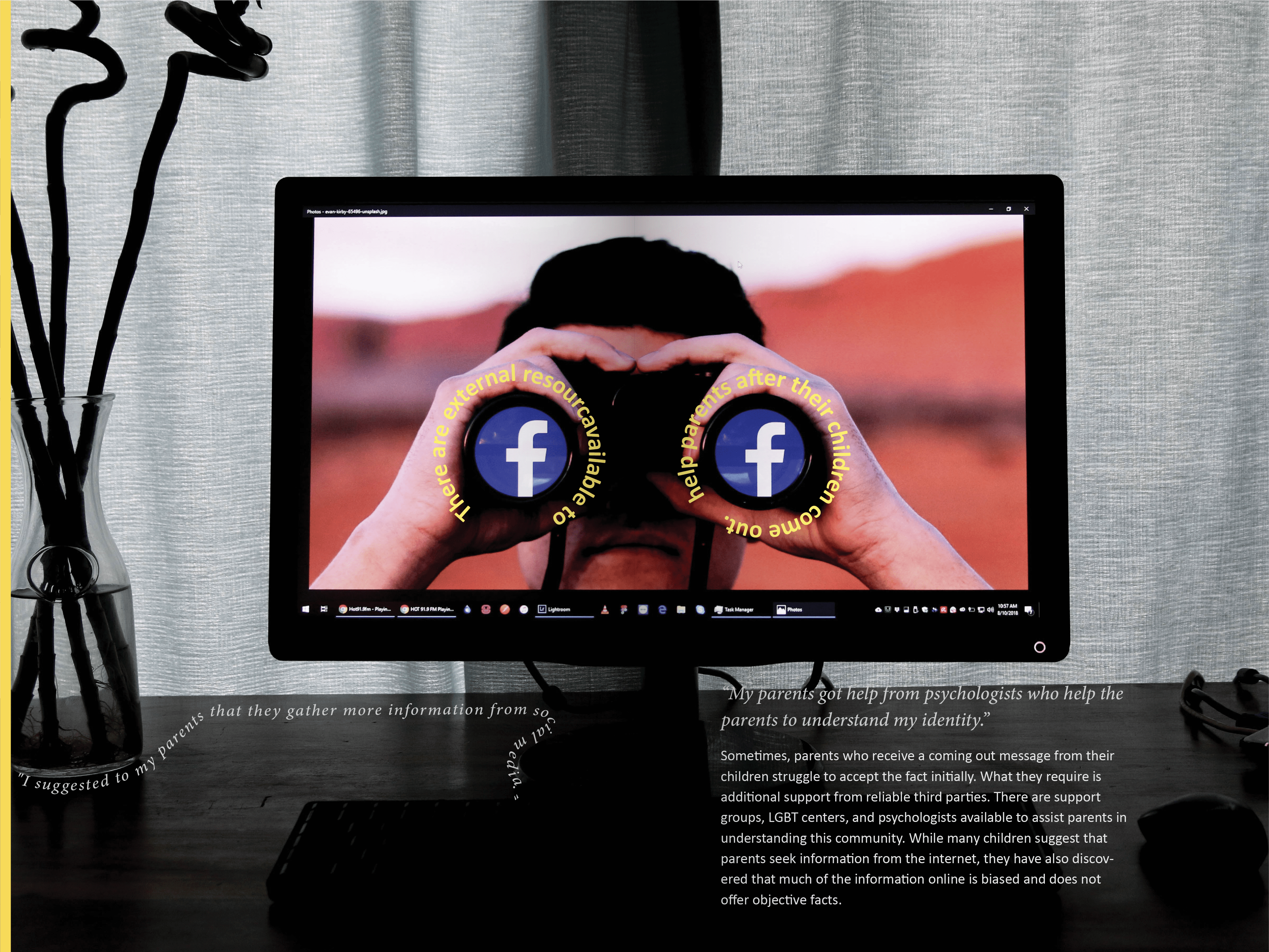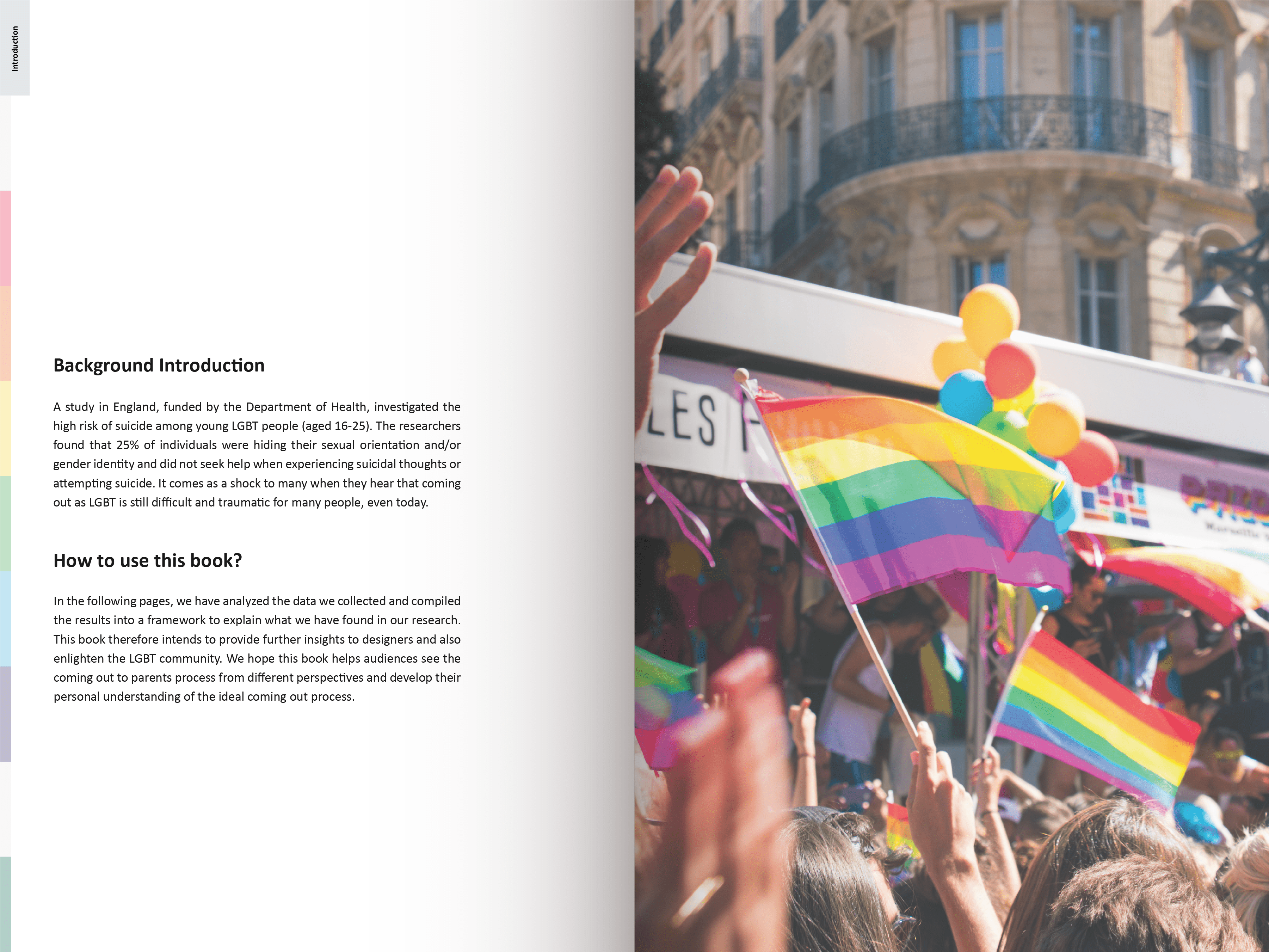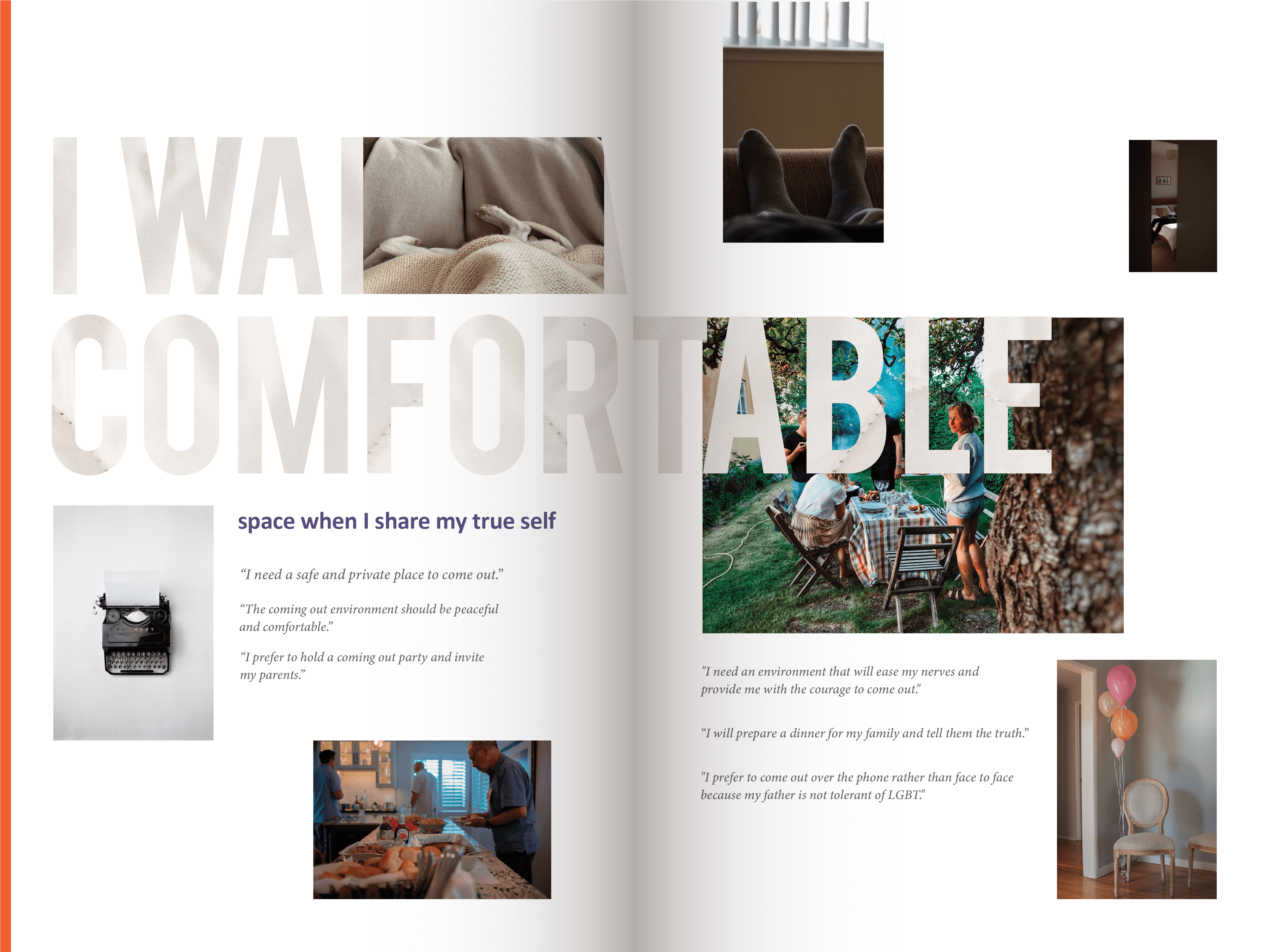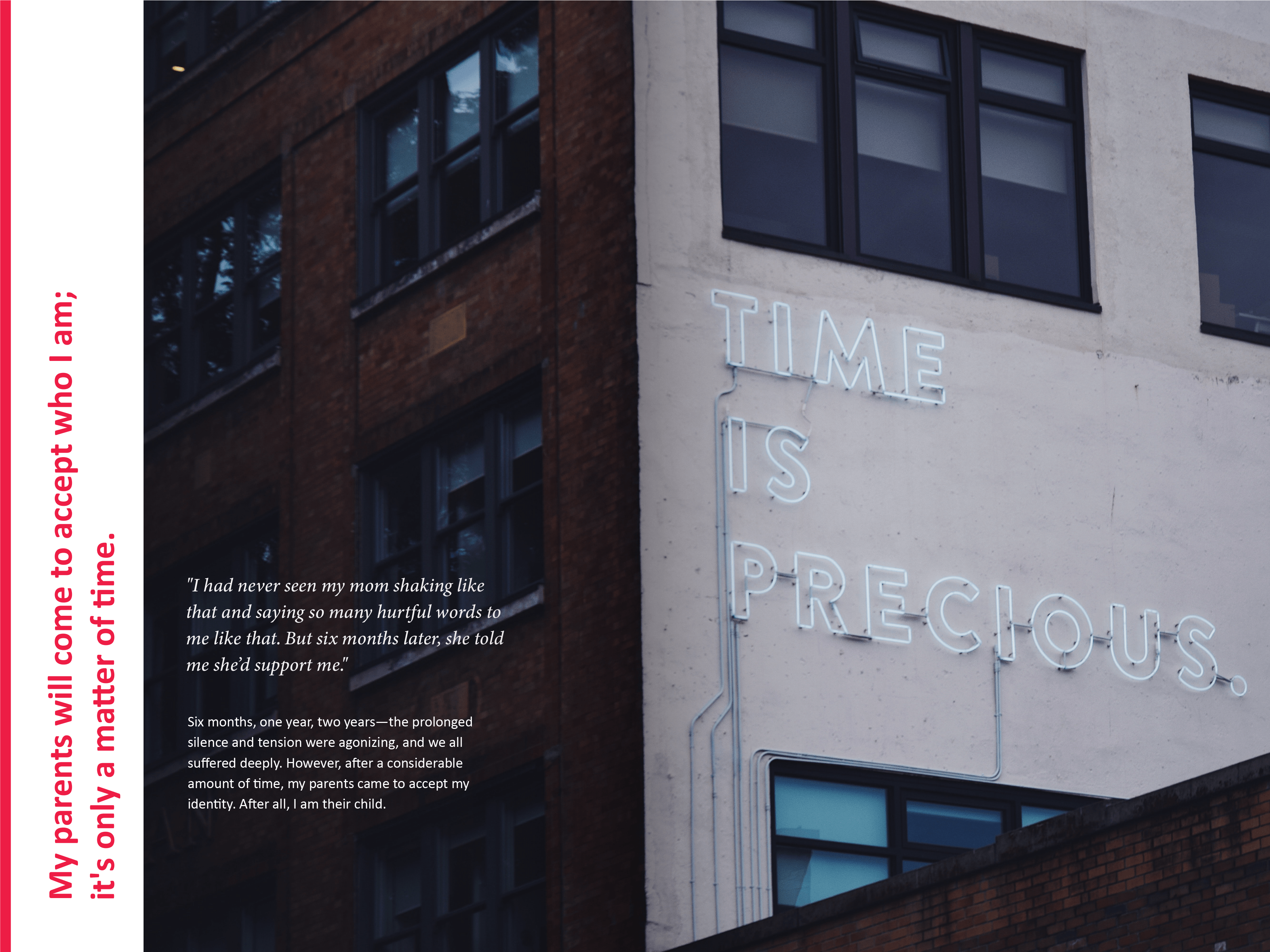 Coming out as LGBT is still difficult and traumatic for many people. This research magazine is based on the contextual research 6 UX specialists conducted on the ideal experience of coming out to parents. We used various methods, including observations, interviews with 26 participants globally, and cultural probes. We have affinitized and analyzed over 800 data points and compiled them into a framework to explain our findings. This magazine aims to provide further insights to designers and enlighten the LGBT community. We hope this magazine is a gift worth keeping and helps audiences see the coming out process from different perspectives and develop their personal understanding of the ideal coming out experience.