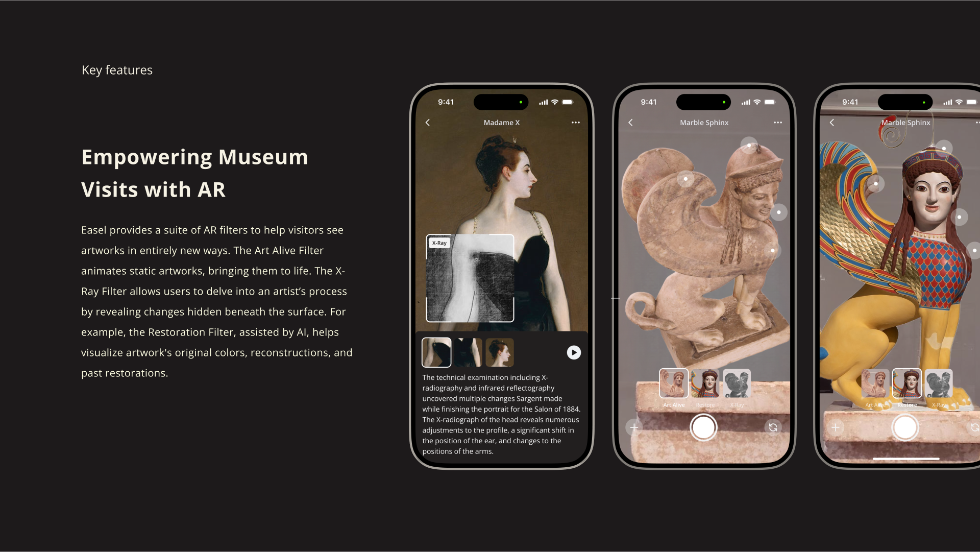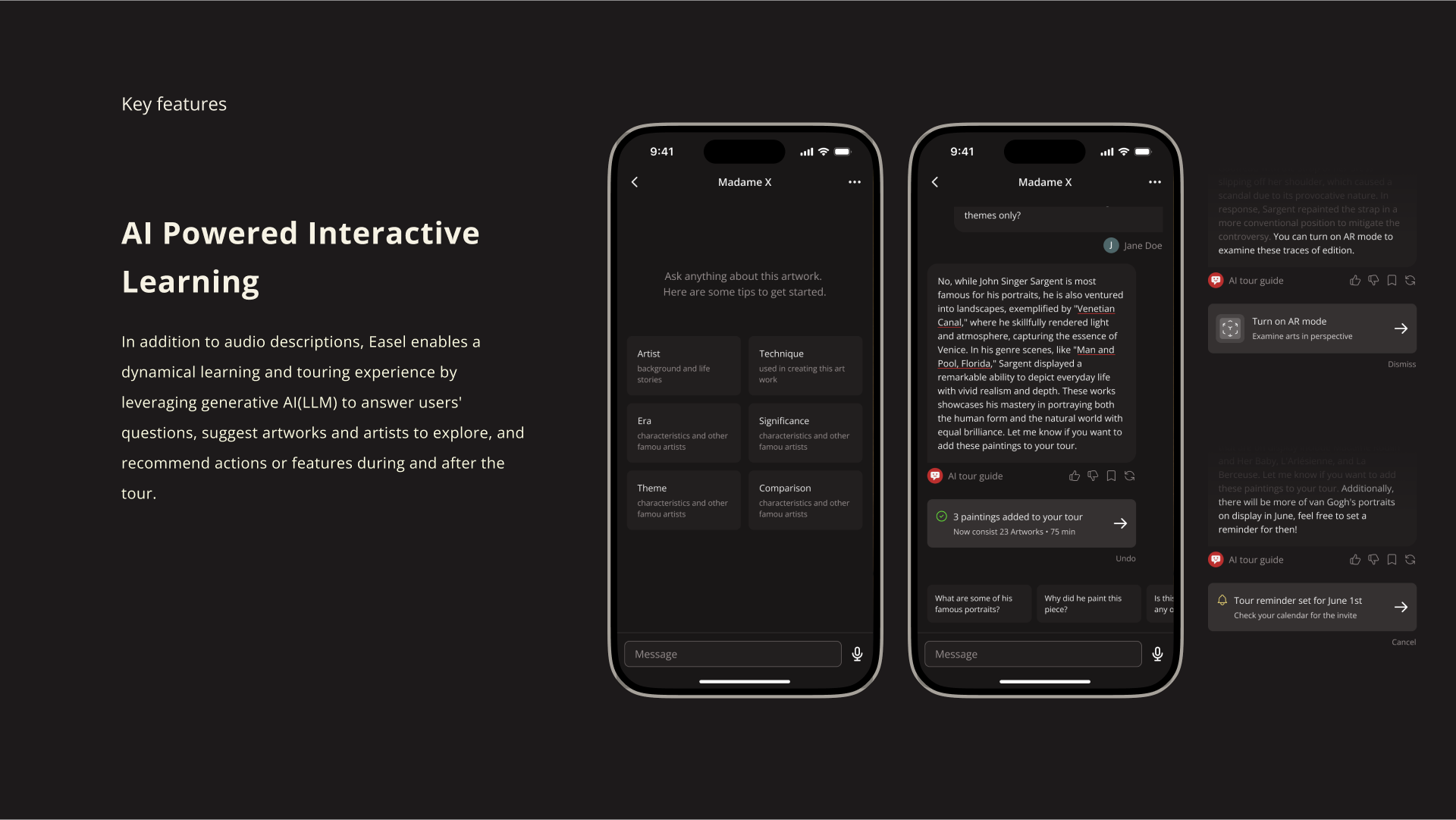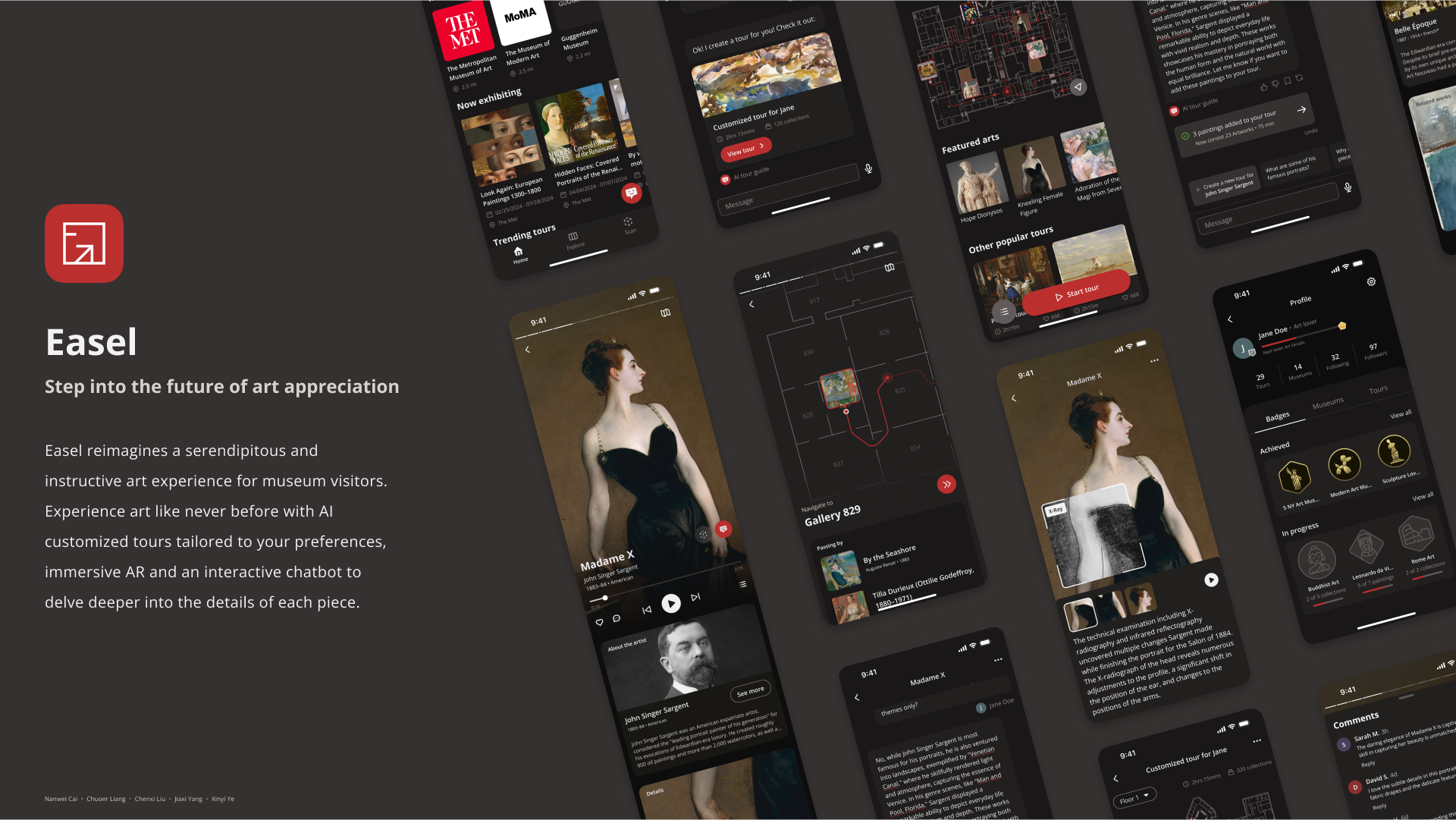 Easel, an AI-powered museum app, offers customized tours tailored to visitor's preferences, immersive AR experiences, and an interactive chatbot for in-depth exploration of each artwork. In an era where traditional museum visits can feel restrictive, constrained by static displays and generic guided tours, Easel emerges as a transformative solution. It addresses these limitations by revolutionizing how visitors interact with art. By offering personalized, AI-driven tours that cater specifically to individual preferences and interests, Easel fundamentally enhances the museum experience.