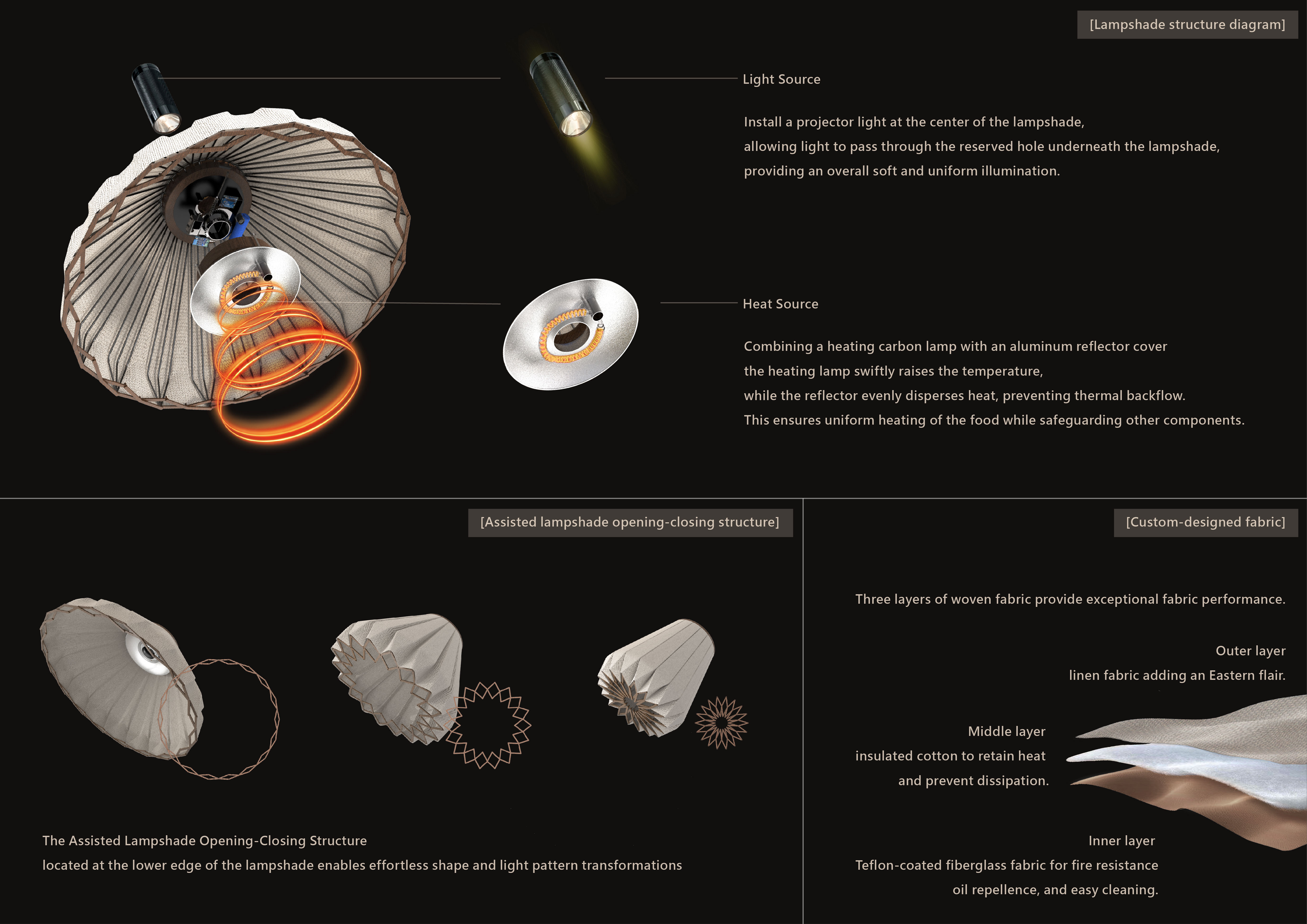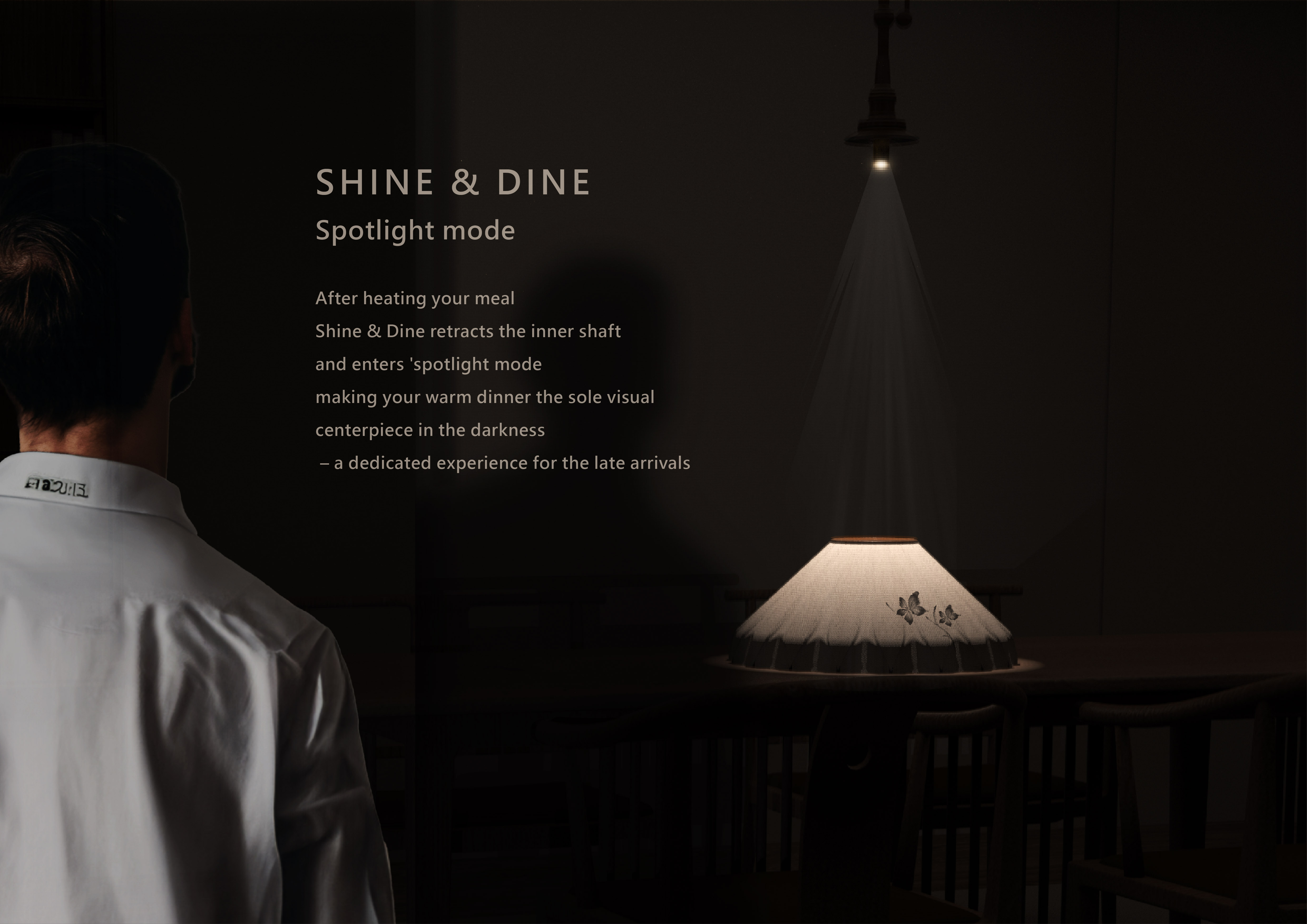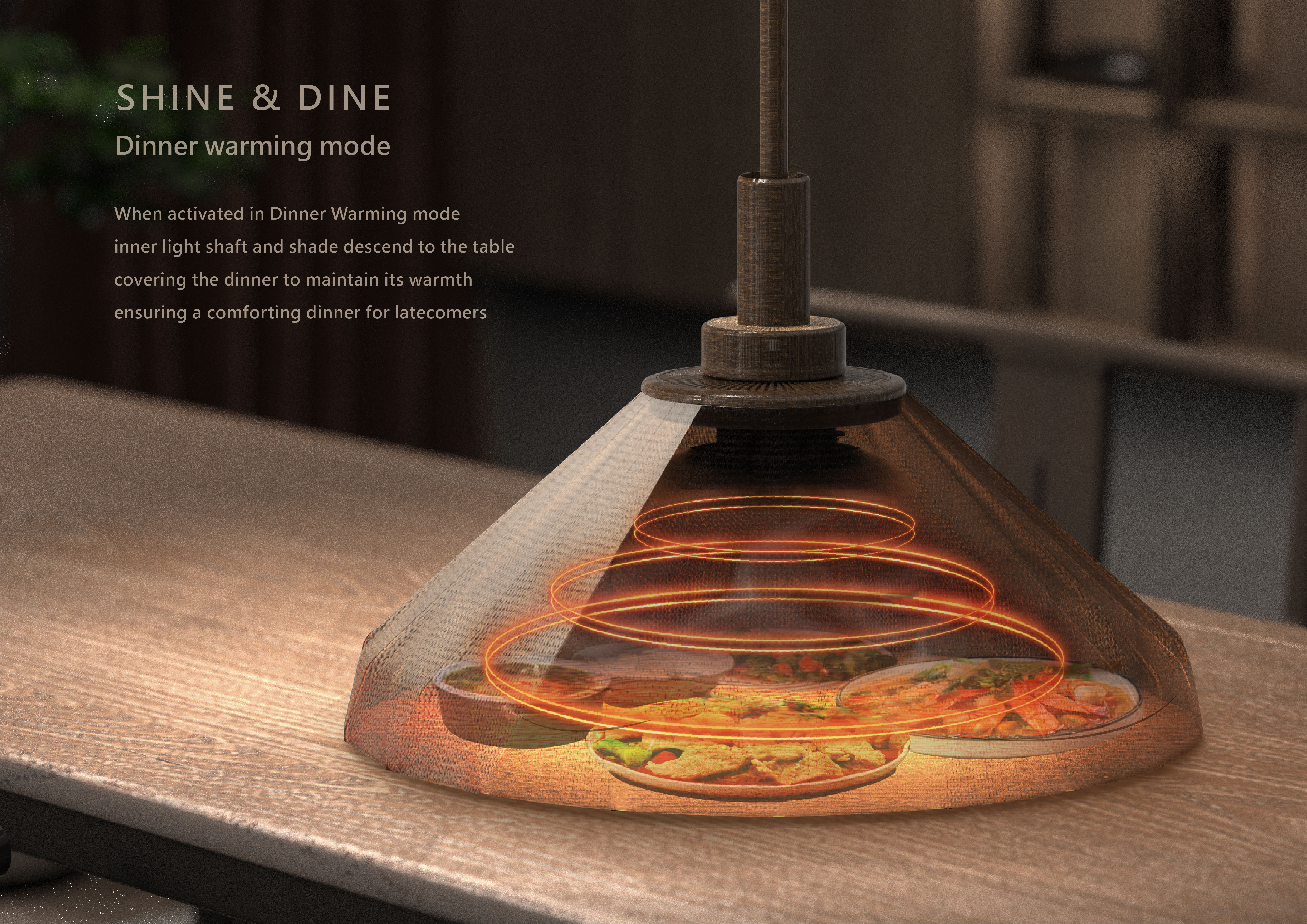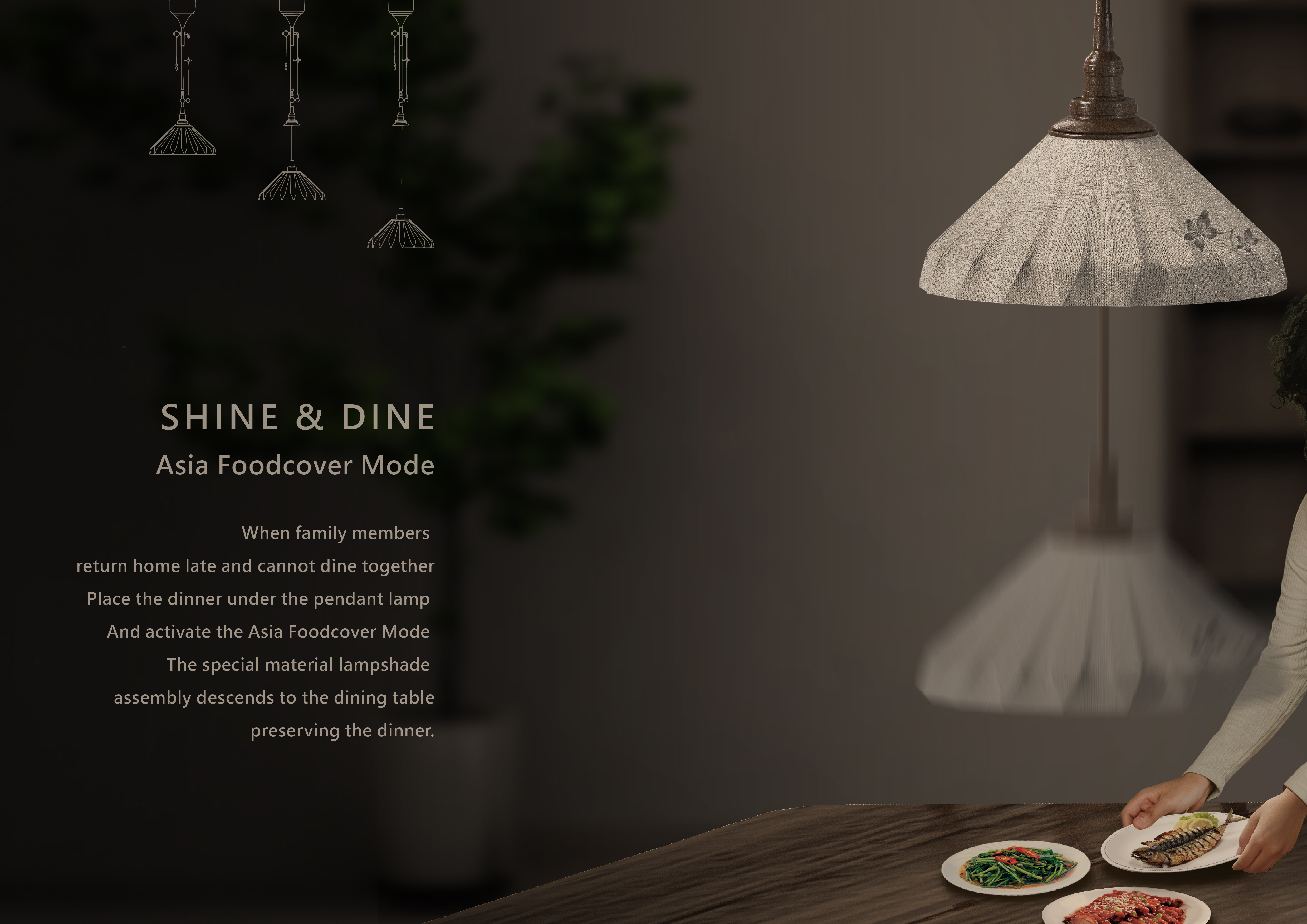 Shine & Dine incorporates the traditional concept of Asia food covers with heat preservation into its pendent lighting design. In Asia culture, hot food represents the warmth of home, but for those returning late at night, this can often be just a distant dream. After overtime work, night owls return to a vacant home, where cold dishes and a dark environment only intensify their sense of loneliness. Shine & Dine draws inspiration from a deep understanding of the emotions of these night owls.