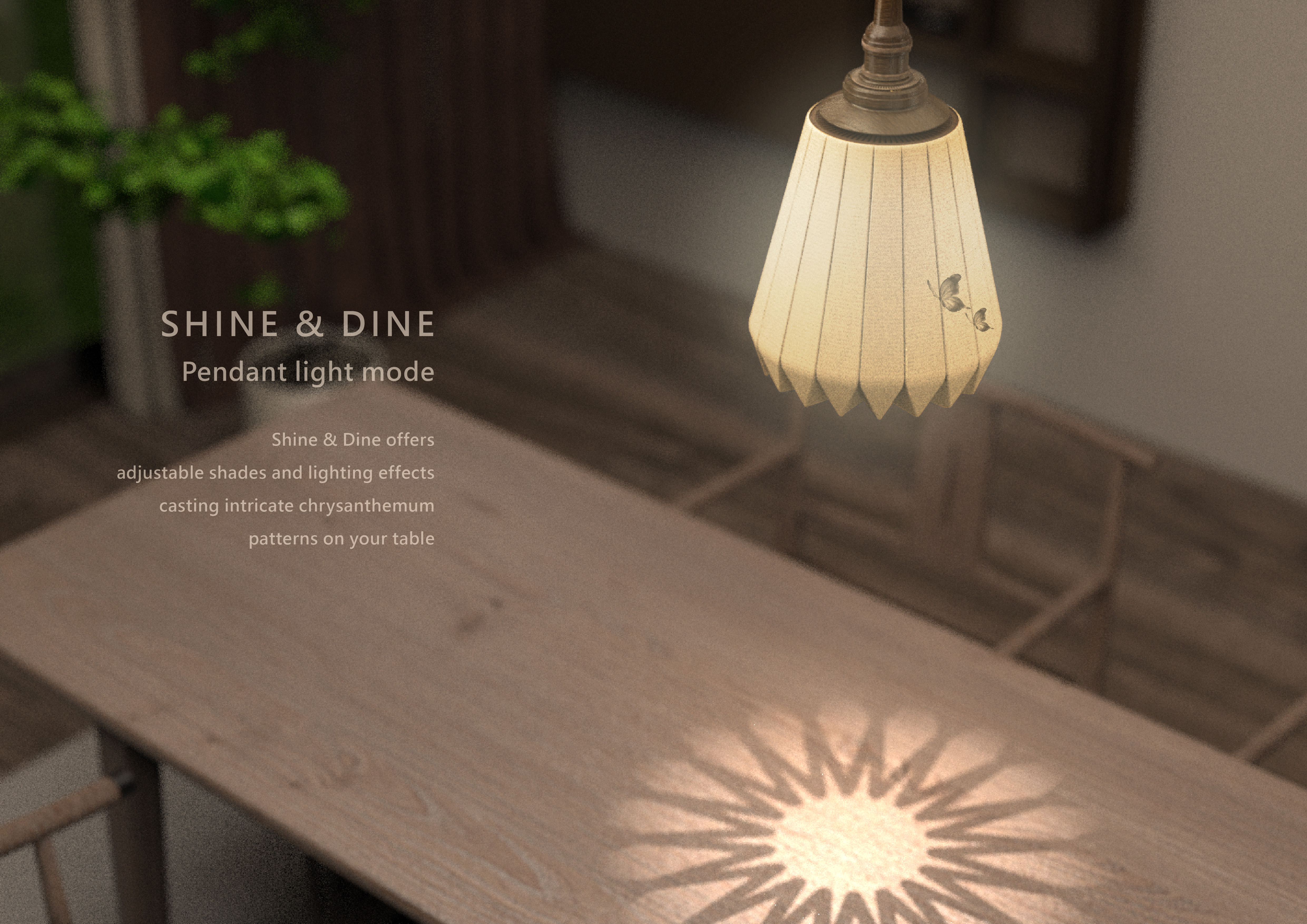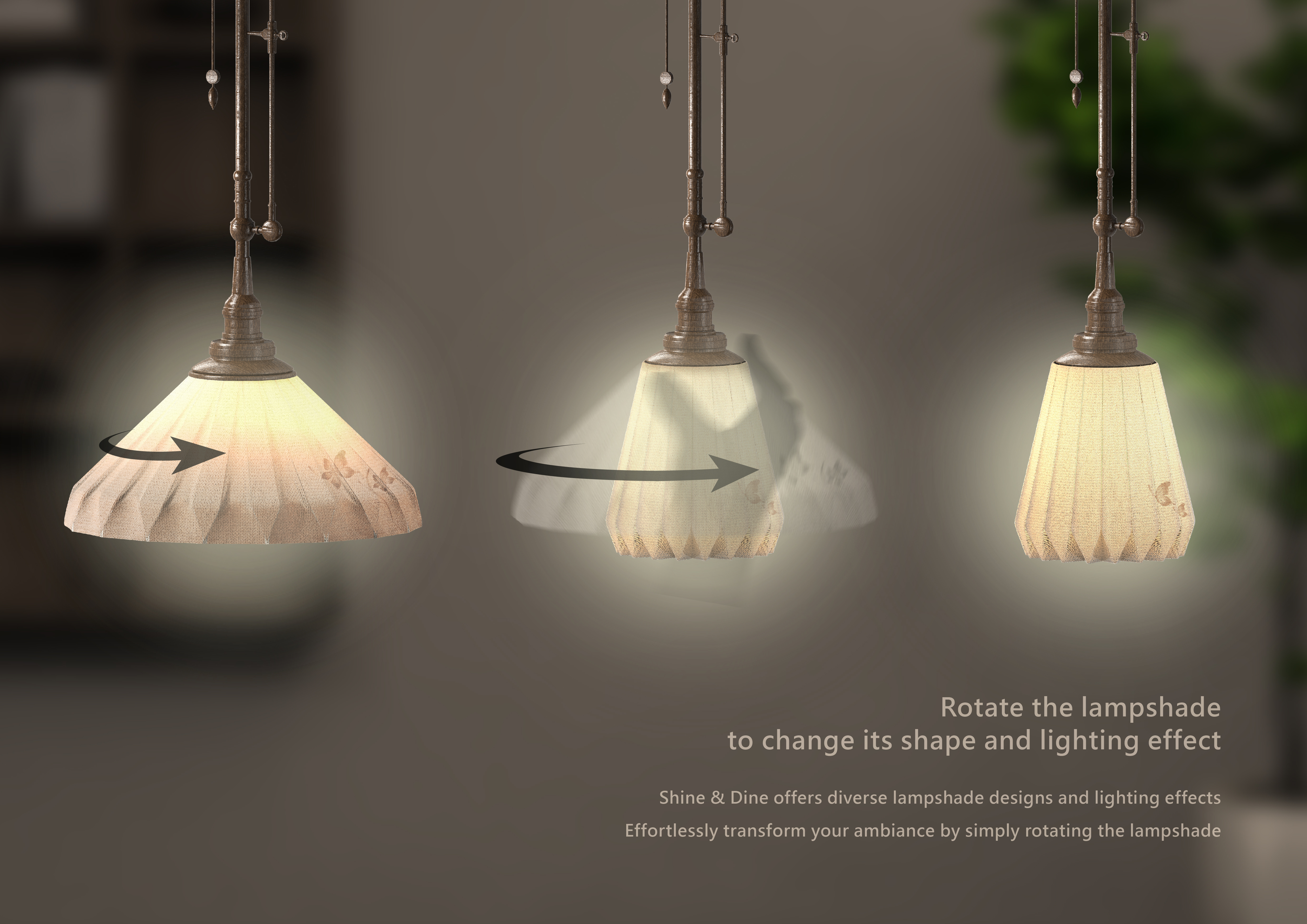 When night owls return home, in the endless darkness, Shine & Dine shines like a brilliant pearl, the sole focus that makes them feel the warmth specially prepared for them. Shine & Dine features an adjustable lampshade, allowing for changes in light and shade to create different lighting effects. Whether used as a pendant light or an Eastern food cover, it perfectly adapts to various scenes and needs.