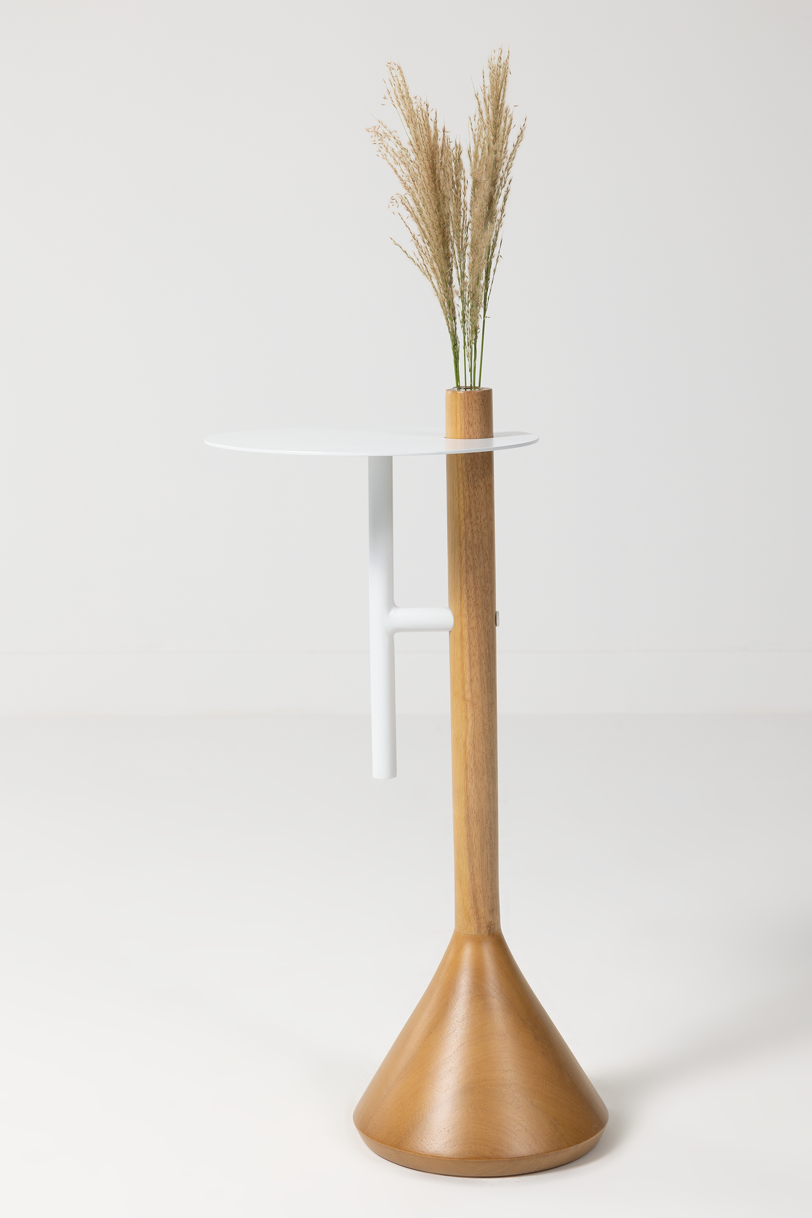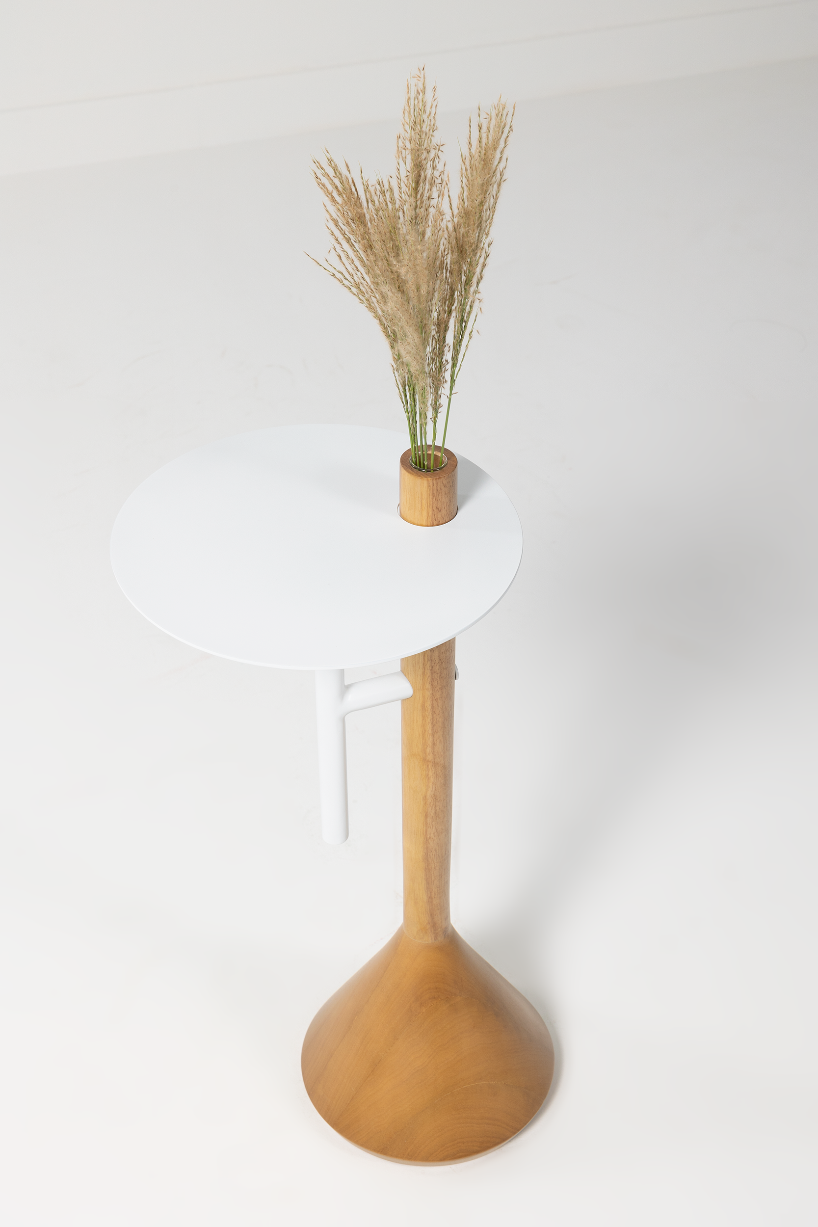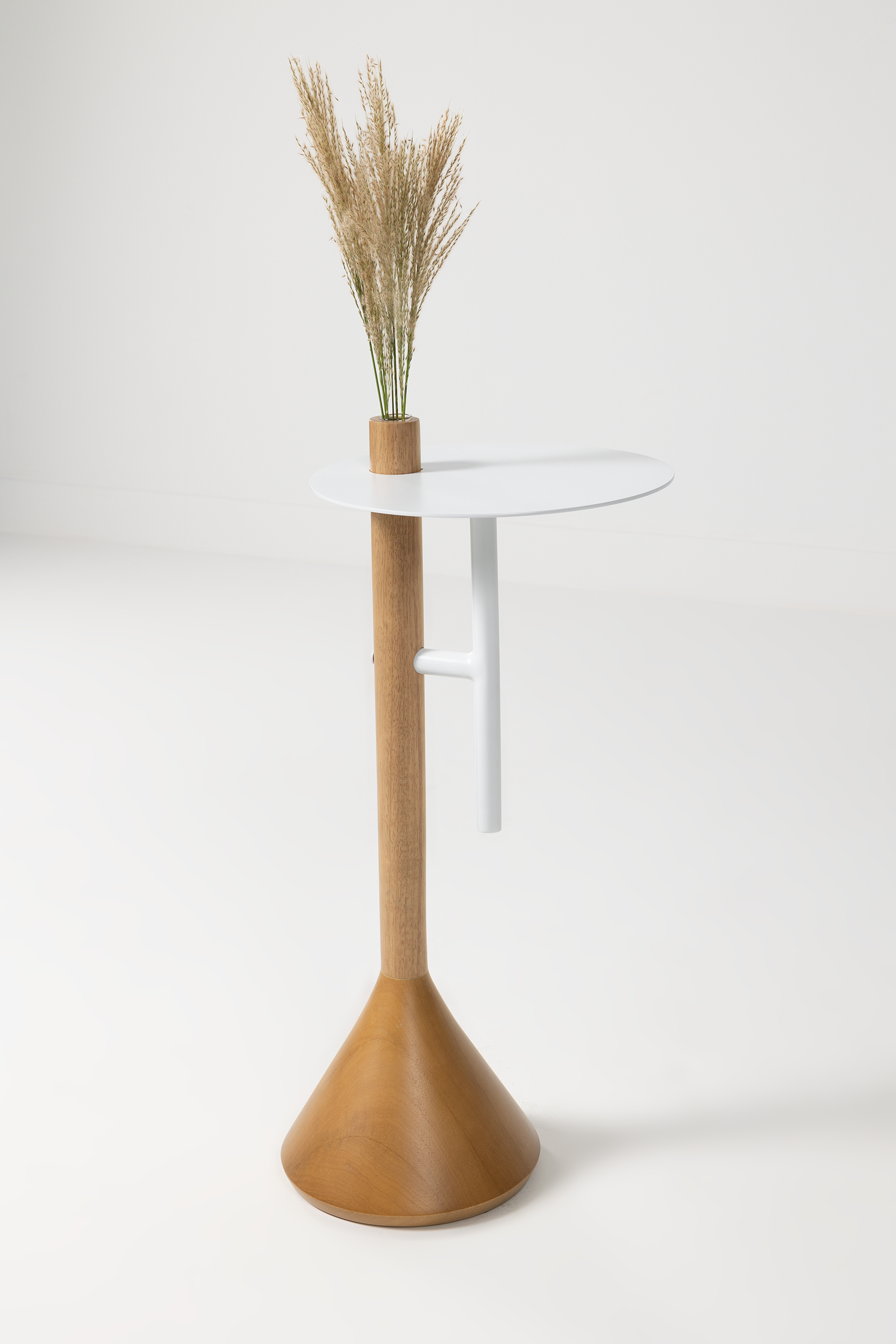 The versatile and adaptable design of the Woodpecker side table translates this interaction in a unique way. The central wooden structure poetically represents the stem of a tree. At the top, to symbolize the top of the tree, the product features details such as a flower holder, providing a natural touch. The side table, which fits laterally, symbolizes the woodpecker as it strikes the stem of the tree, offering a unique and meaningful aesthetic, providing not only functionality, but also a subtle visual narrative stemming from the interaction between fauna and flora.