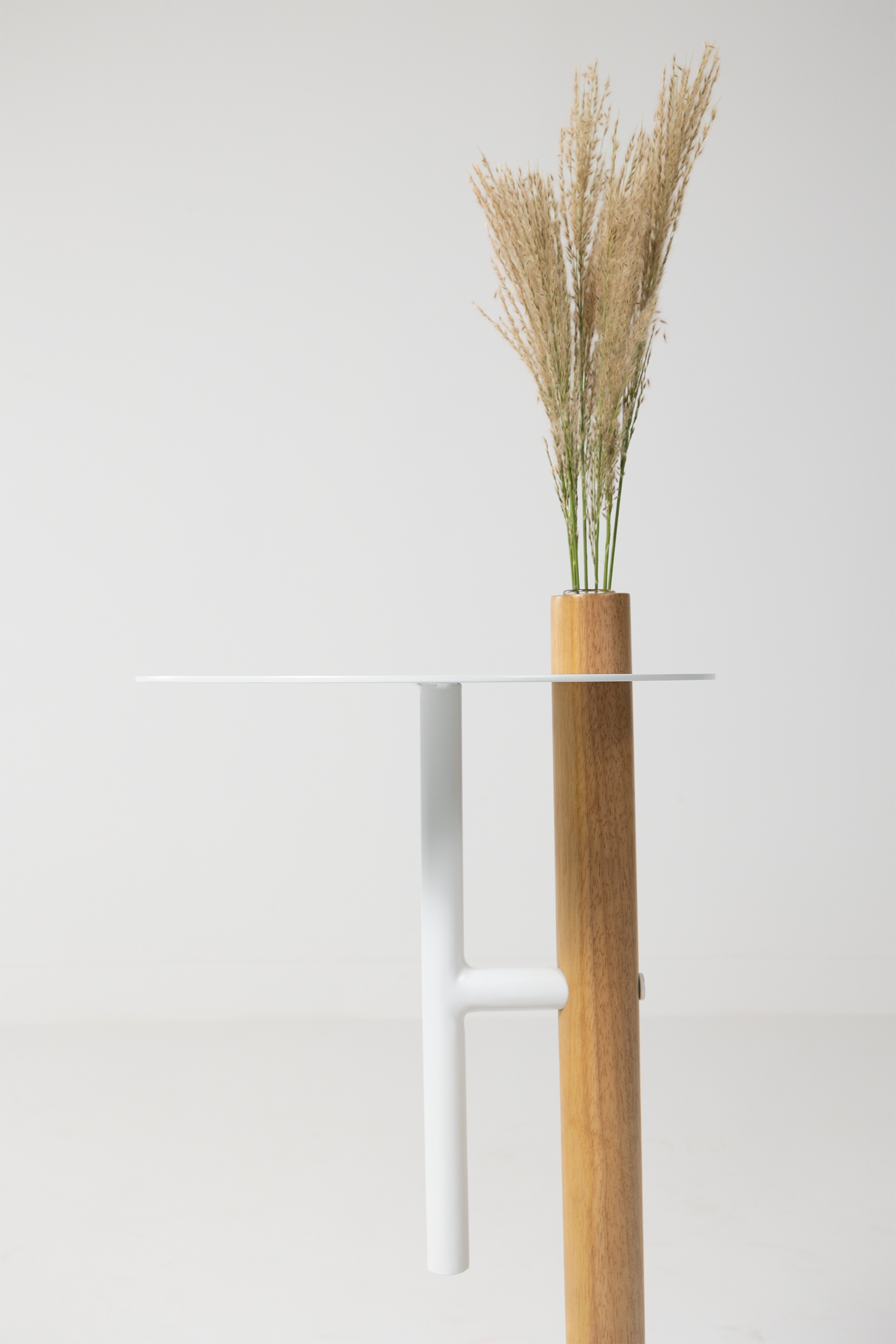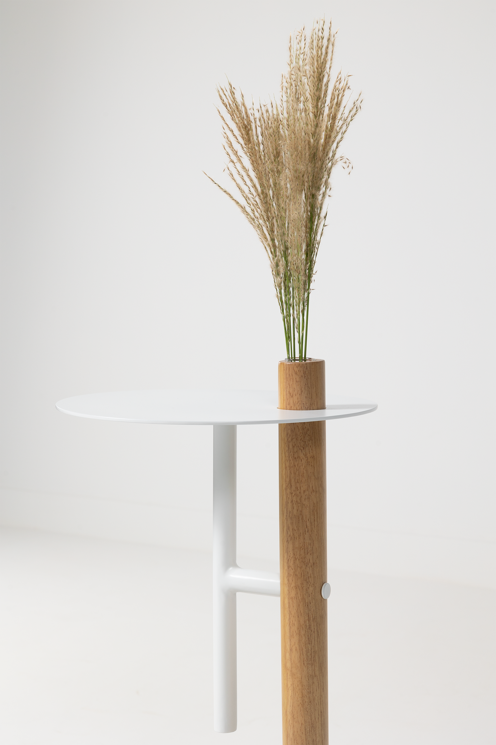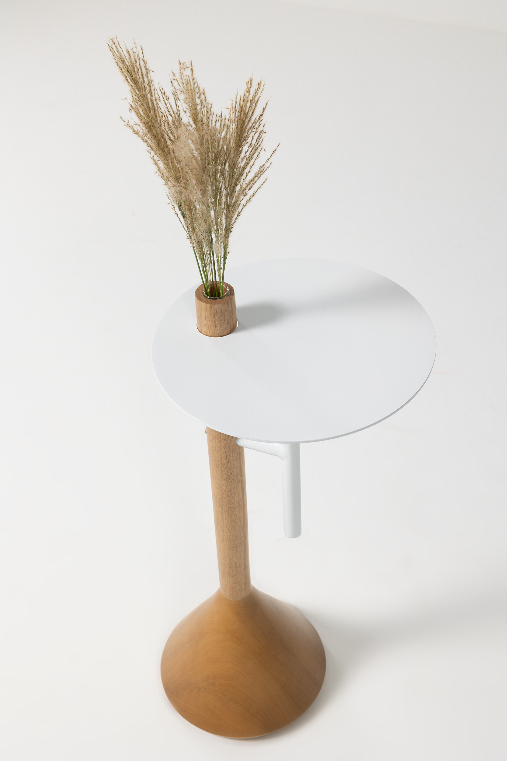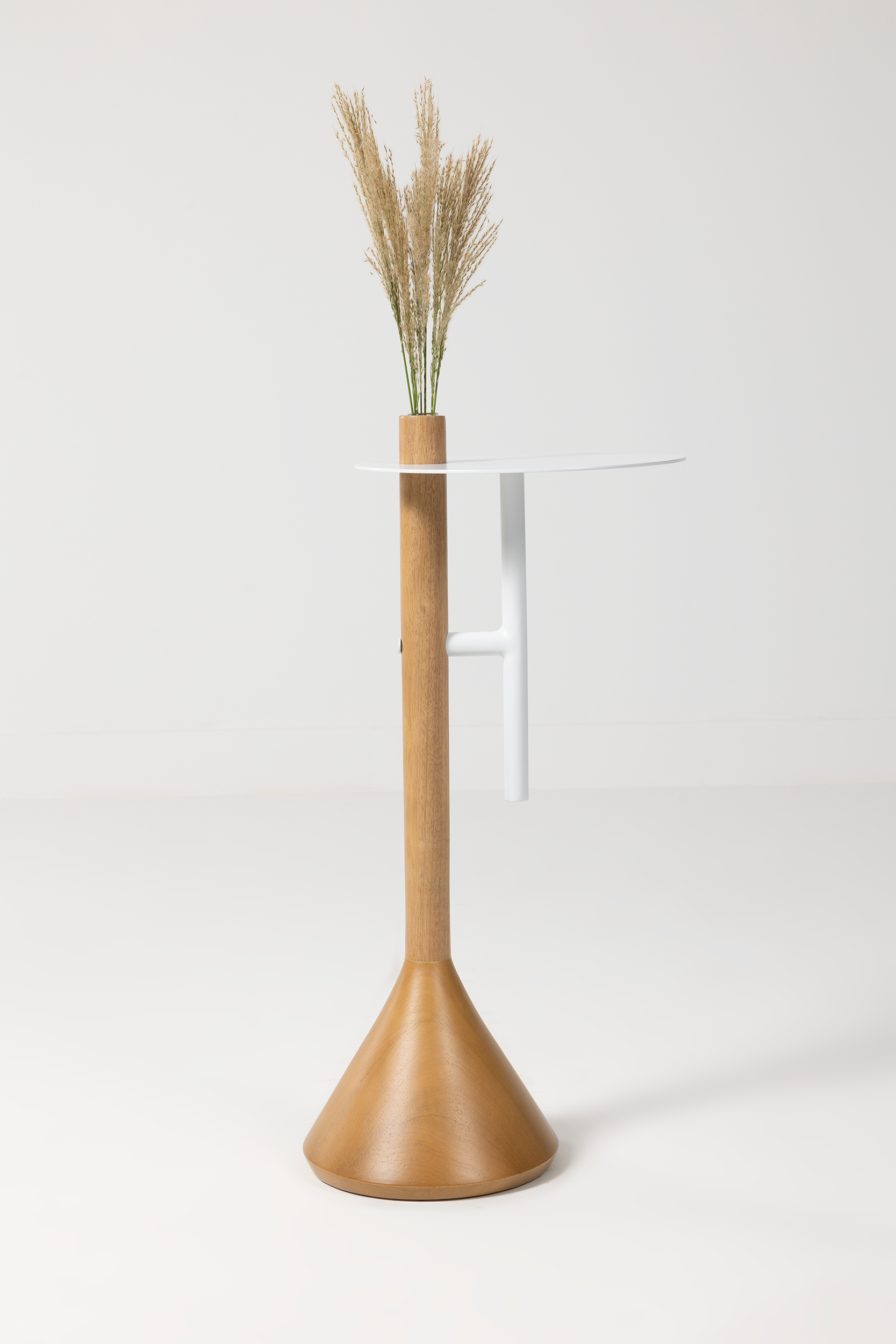 The versatile and adaptable design of the Woodpecker side table translates this interaction in a unique way. The central wooden structure poetically represents the stem of a tree. At the top, to symbolize the top of the tree, the product features details such as a flower holder, providing a natural touch. The side table, which fits laterally, symbolizes the woodpecker as it strikes the stem of the tree, offering a unique and meaningful aesthetic, providing not only functionality, but also a subtle visual narrative stemming from the interaction between fauna and flora.