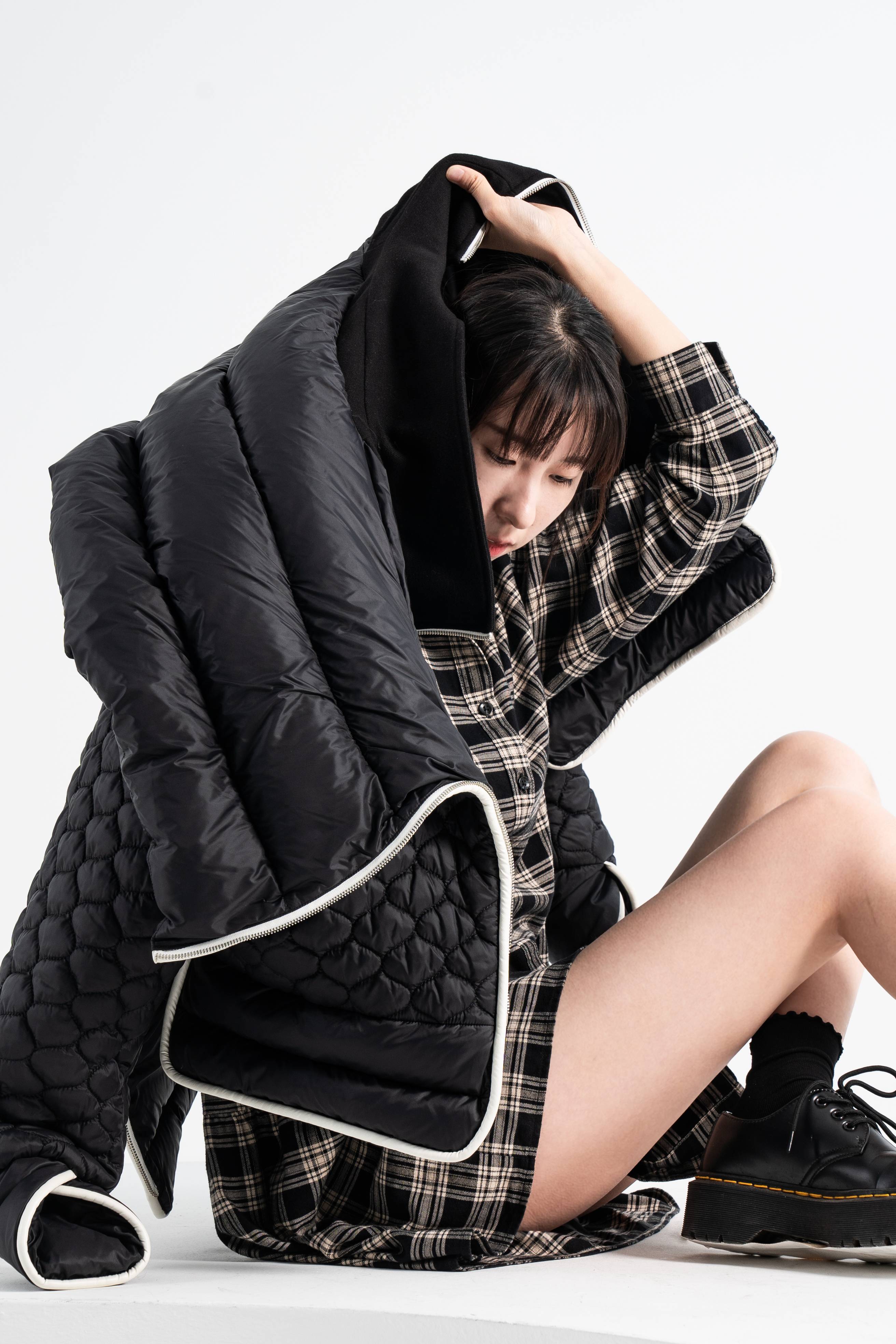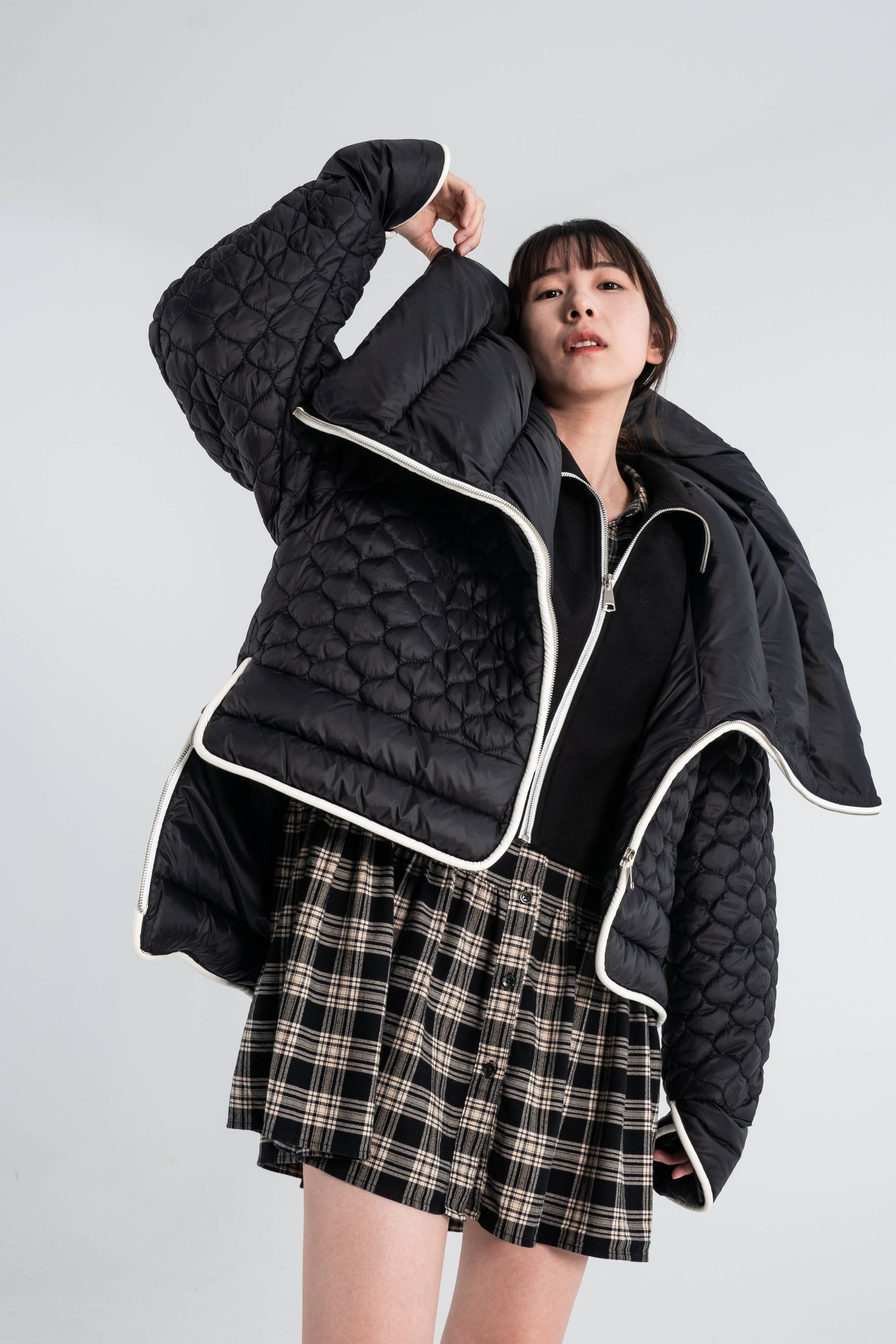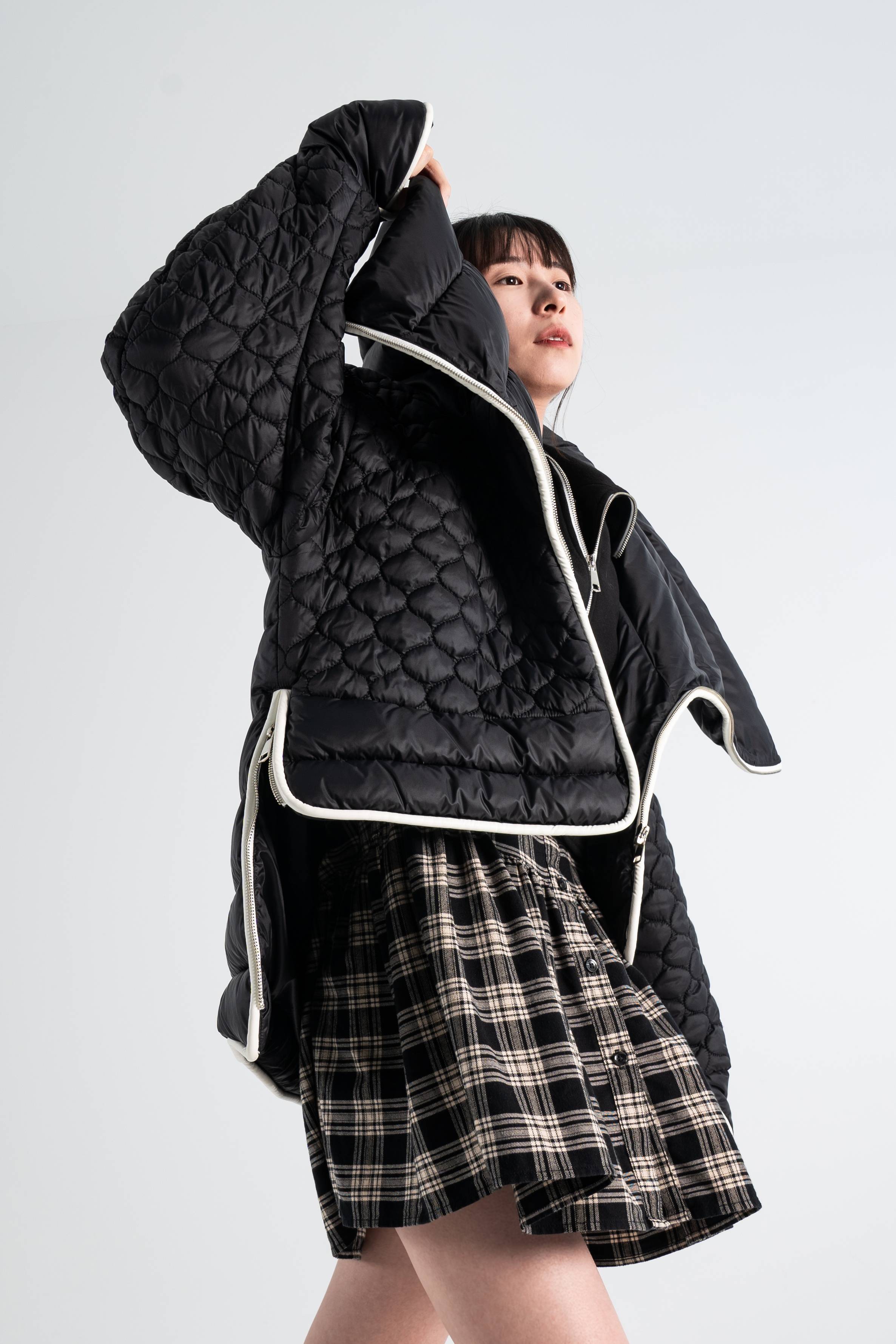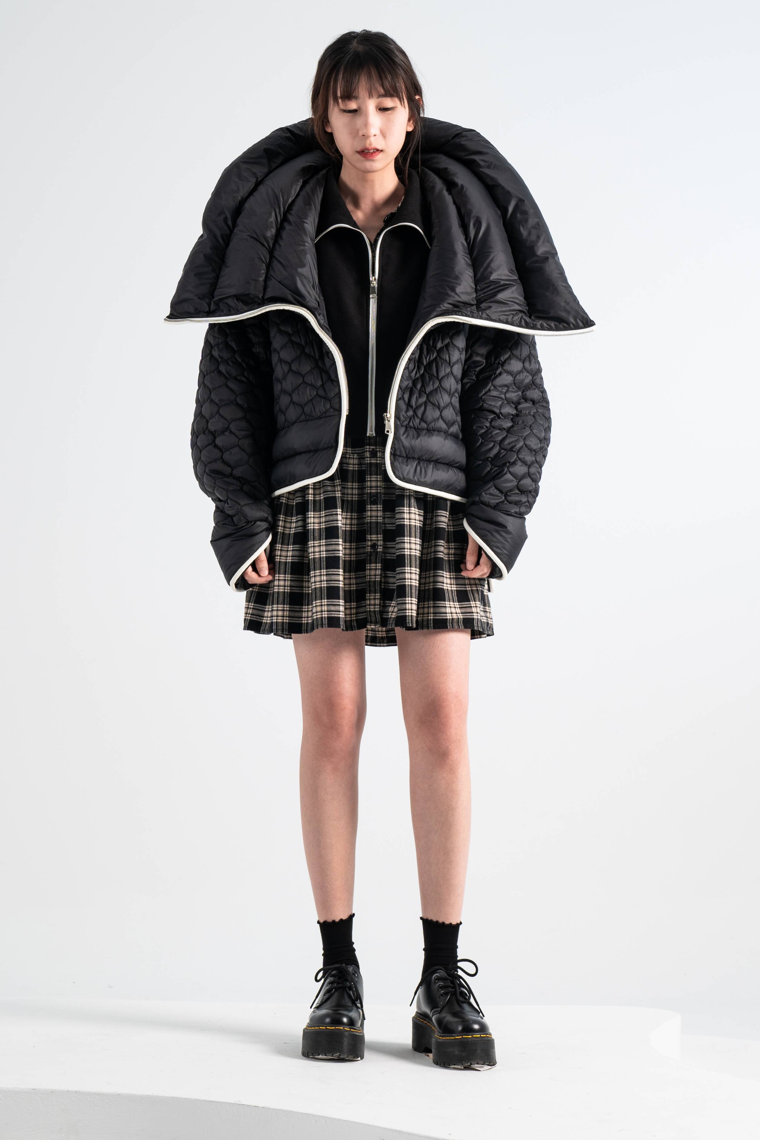 "Mo Yun," understood in the Chinese context as deep and ink-like shadows of clouds, derives its naming inspiration from the cotton armor widely used among generals and soldiers during the Qing Dynasty. Centuries ago, Manchu warriors clad in such armor braved the harsh cold and snow, eventually establishing a vast empire. The lightness, warmth, and robust stability of this cavalry cotton armor played a significant role, offering a clear advantage over the traditional heavy iron armor in the instantly decisive ancient battlefields. Within this context, the design concept of the Mo Yun down jacket originates from this type of cavalry cotton armor, incorporating military elements and functionality into modern apparel in an innovative way."Mo Yun" employs a dual-layer zipper design: the inner layer is made of nylon, offering lightweight, warmth, and excellent wrinkle resistance; the outer layer uses waterproof down material, enhancing the garment's practicality and weather resistance. In terms of design, the overall tone of the down jacket is primarily black, with white trim applied to the zippers, hem, and cuff edges, creating a sharp visual contrast. The hem features a high-low cut, enhancing ease of movement and adding visual flow. The exaggerated stand collar pays homage to the historical cotton armor’s ear and neck protection, also providing superior warmth and protection for the wearer. When the outer layer is unzipped, the collar naturally drapes backward over the shoulders, symbolizing the majesty of a general. The geometric quilting, regularly arranged on the surface, mimics the nail patterns of the cotton armor, enriching the texture and dimensions of the garment; while the irregular connected sleeve design replicates the sleeve style of traditional cotton armor, enhancing the overall design cohesion and fashion sense.