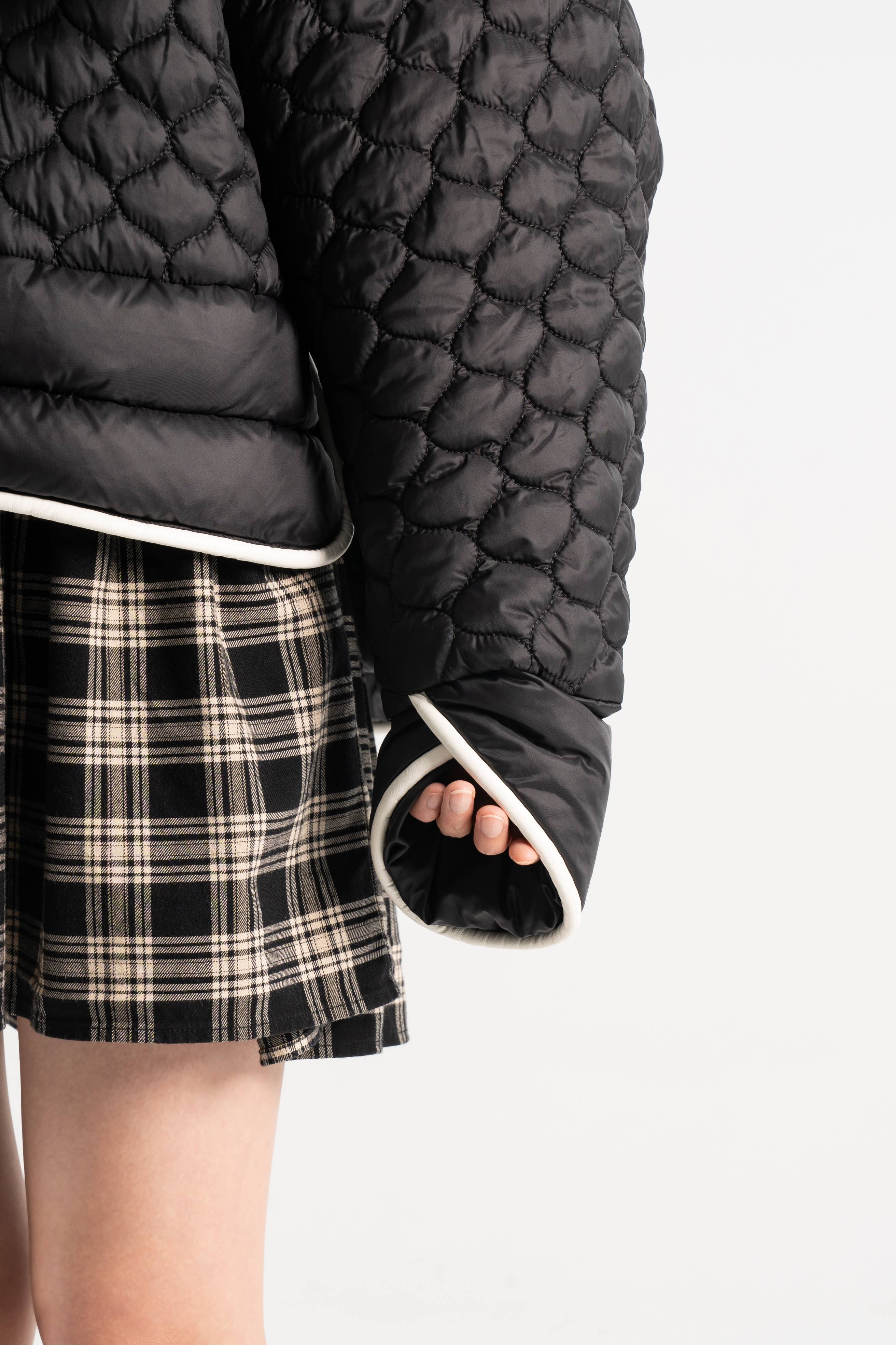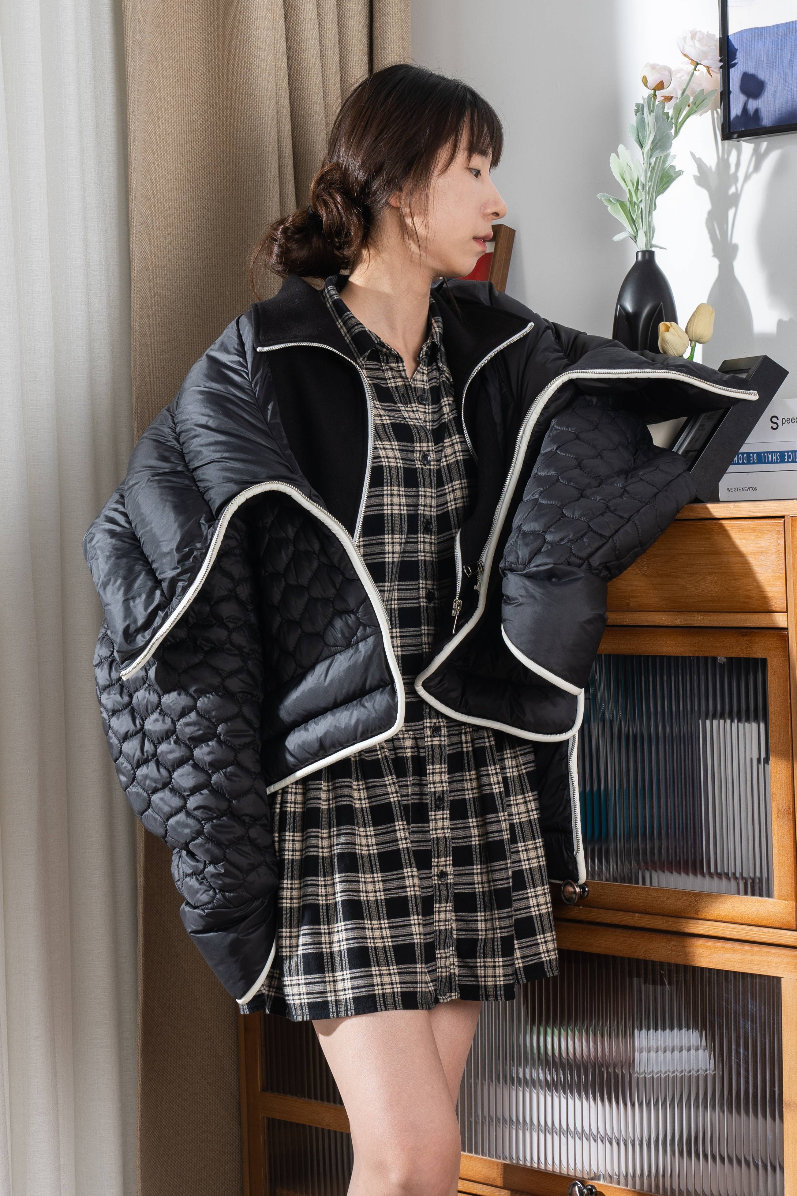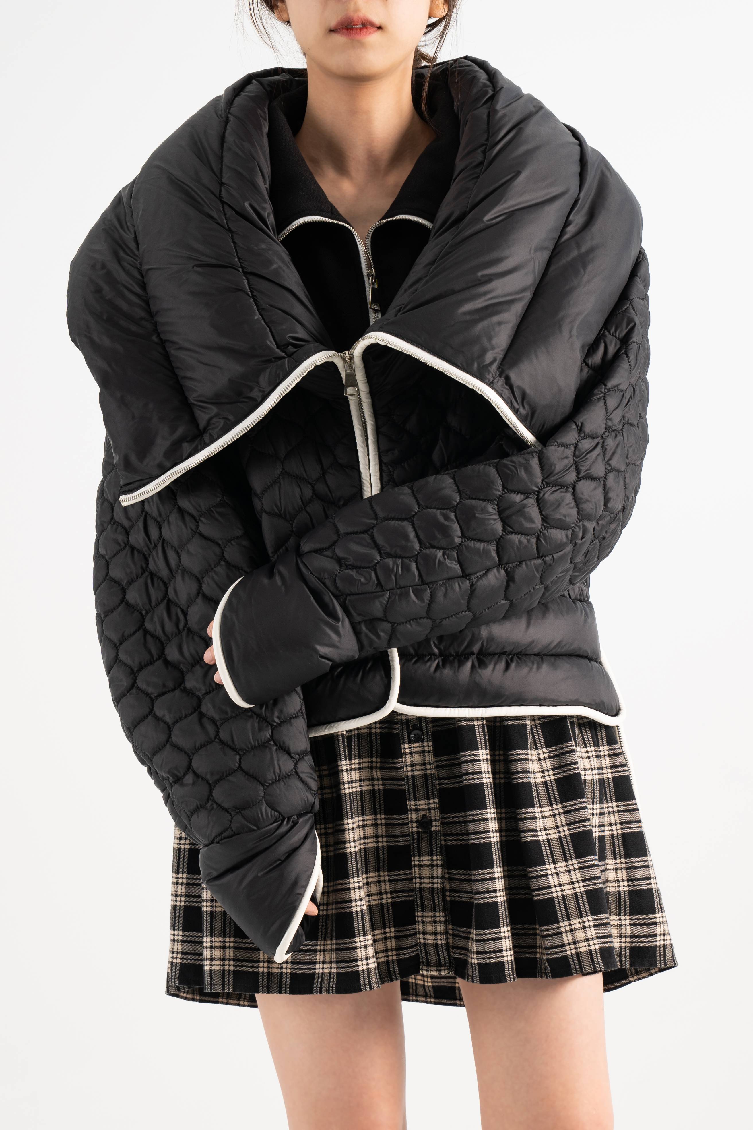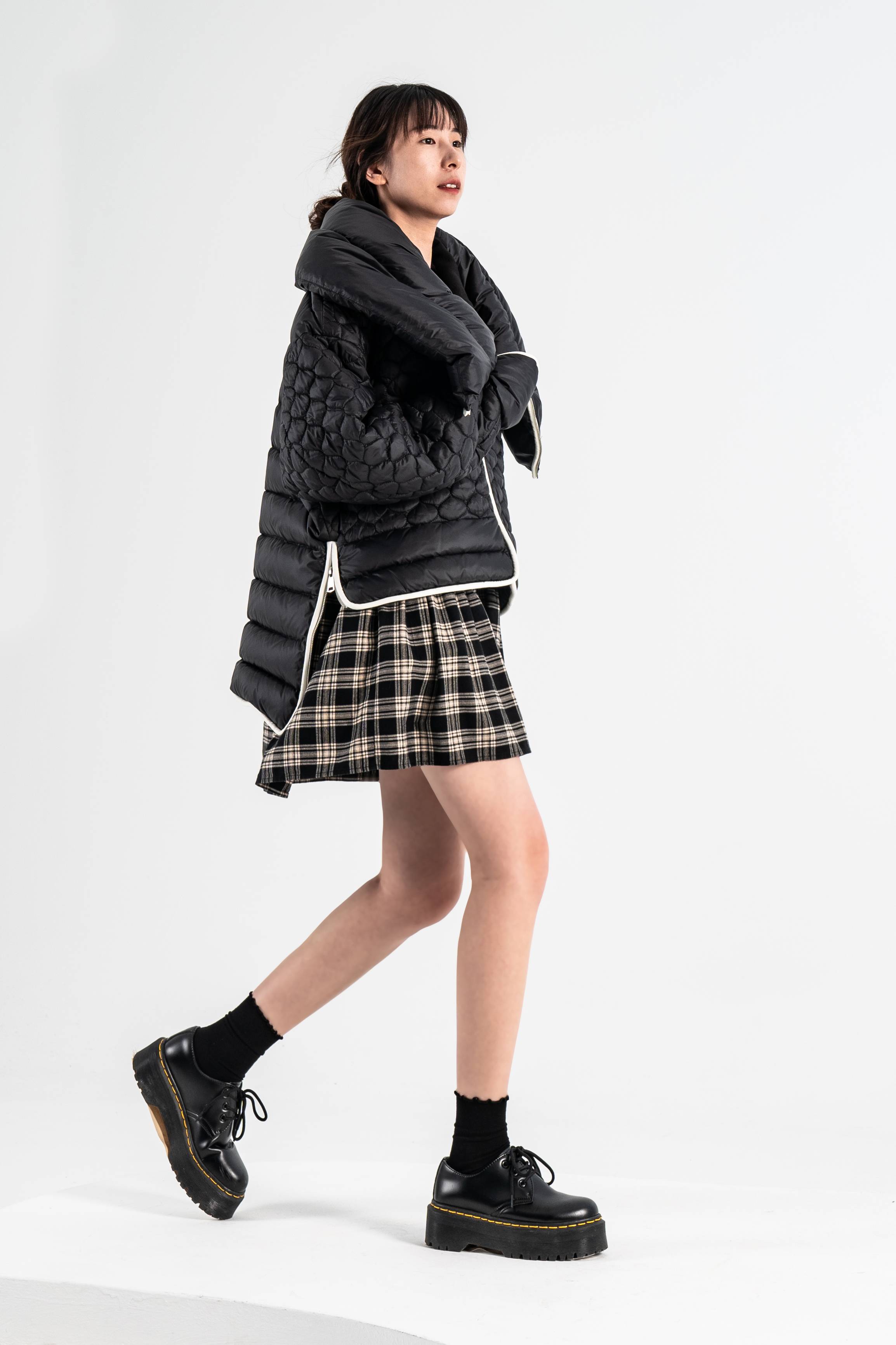 "Mo Yun," understood in the Chinese context as deep and ink-like shadows of clouds, derives its naming inspiration from the cotton armor widely used among generals and soldiers during the Qing Dynasty. Centuries ago, Manchu warriors clad in such armor braved the harsh cold and snow, eventually establishing a vast empire. The lightness, warmth, and robust stability of this cavalry cotton armor played a significant role, offering a clear advantage over the traditional heavy iron armor in the instantly decisive ancient battlefields. Within this context, the design concept of the Mo Yun down jacket originates from this type of cavalry cotton armor, incorporating military elements and functionality into modern apparel in an innovative way."Mo Yun" employs a dual-layer zipper design: the inner layer is made of nylon, offering lightweight, warmth, and excellent wrinkle resistance; the outer layer uses waterproof down material, enhancing the garment's practicality and weather resistance. In terms of design, the overall tone of the down jacket is primarily black, with white trim applied to the zippers, hem, and cuff edges, creating a sharp visual contrast. The hem features a high-low cut, enhancing ease of movement and adding visual flow. The exaggerated stand collar pays homage to the historical cotton armor’s ear and neck protection, also providing superior warmth and protection for the wearer. When the outer layer is unzipped, the collar naturally drapes backward over the shoulders, symbolizing the majesty of a general. The geometric quilting, regularly arranged on the surface, mimics the nail patterns of the cotton armor, enriching the texture and dimensions of the garment; while the irregular connected sleeve design replicates the sleeve style of traditional cotton armor, enhancing the overall design cohesion and fashion sense.