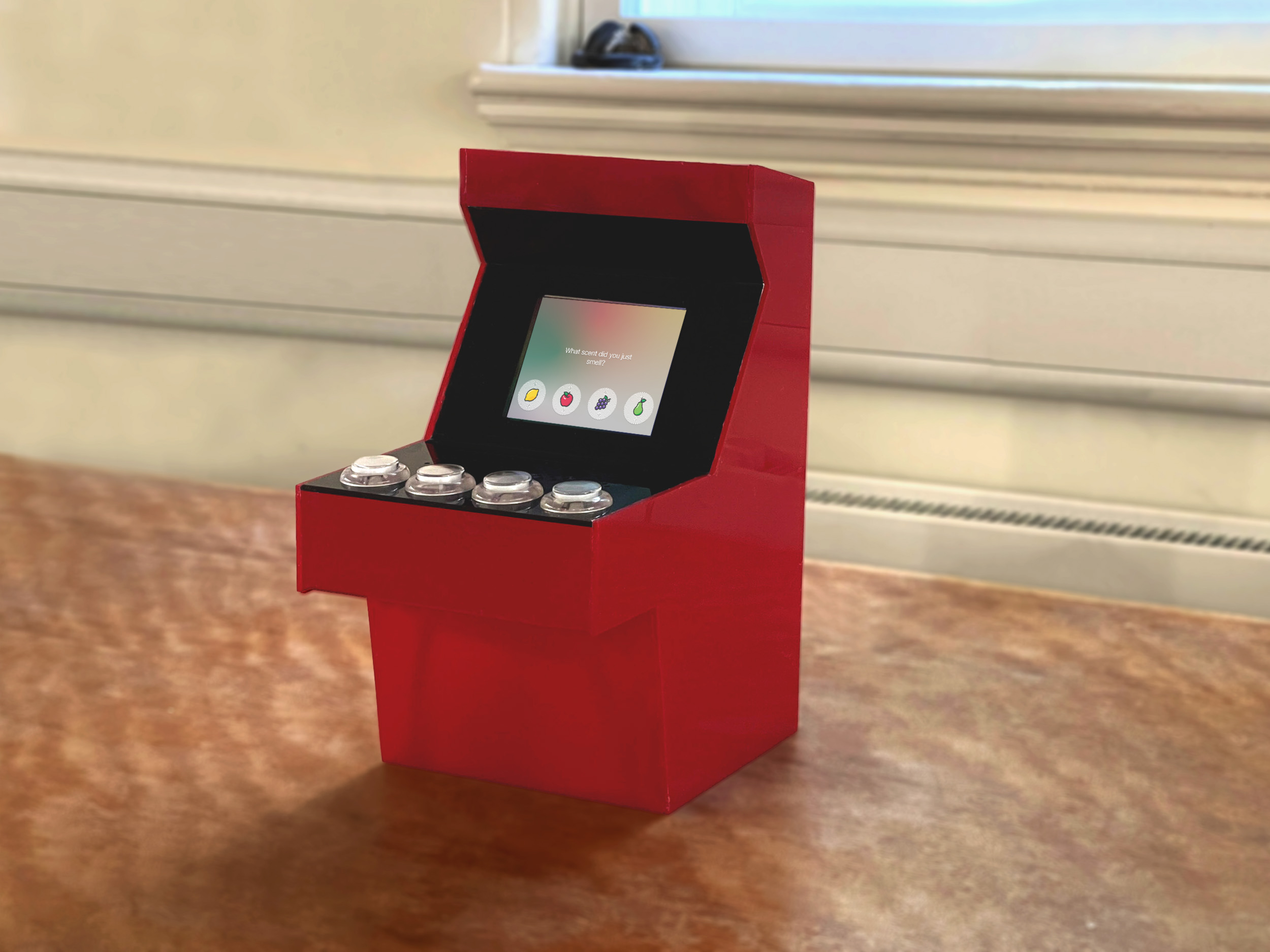 Seent is a gamified smell training device designed for individuals with anosmia (loss of smell). It combines digitalization with an arcade-style appearance, offering a unique solution to the challenge of smell rehabilitation. The device operates in two simple steps: practice and assessment. During the practice phase, users are exposed to a palette of four distinct scents, continuously delivered one after the other by the device. Following this, users engage in the assessment phase, where they test their smell sensitivity by guessing which scent is released. This interactive process enables individuals to gradually recover and enhance their sense of smell in a digital format.
