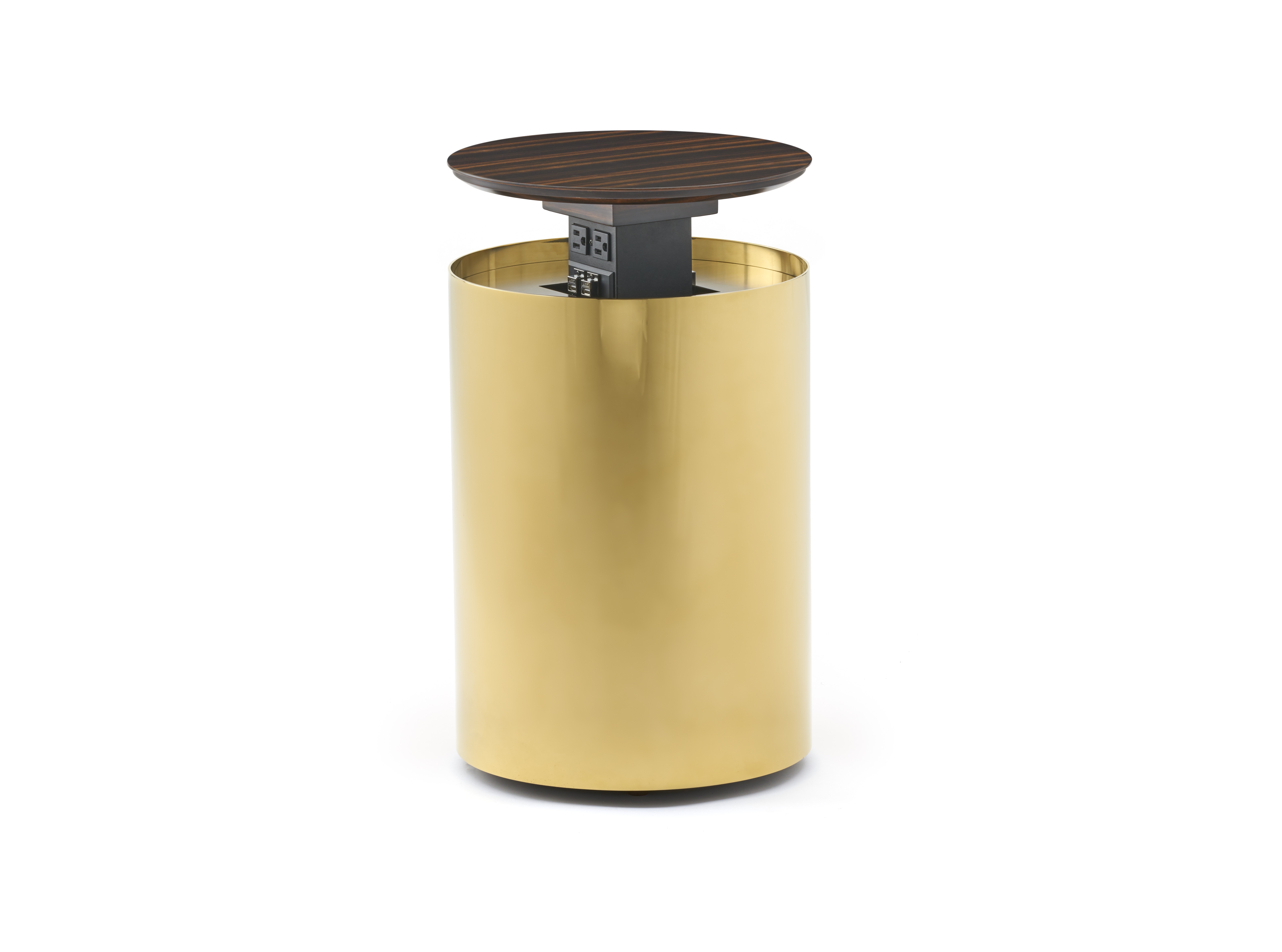 The Powerful Cylinder is as interesting-looking as it is functional. When the top is closed, it leaves the user guessing and exploring its beauty; but press on the top of the table and the power access exposes itself in a fluid vertical motion. It is constructed of figured, quarter-cut wood top with a polished-brass metal frame. 14”L x 14”W x 20”H.