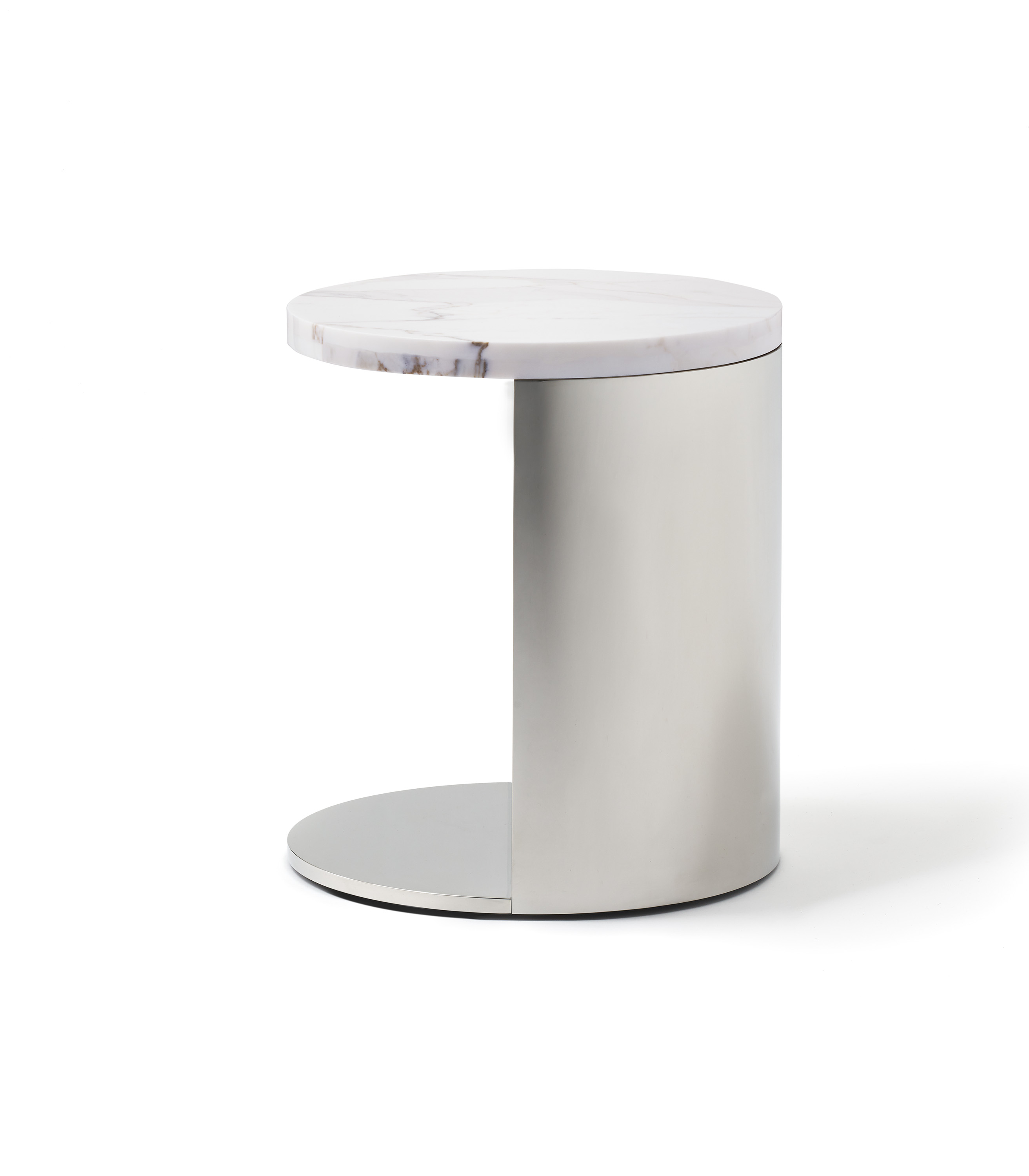 The Powerful C-Table discreetly conceals multiple power options. With its polished stainless steel base, this table gives the illusion of a floating marble top. The top can rotate up to 360 degrees, allowing for a variable layout and exposing plug access for extra functionality. Custom materials and finishes available. 20"L x 20"W x 23"H.