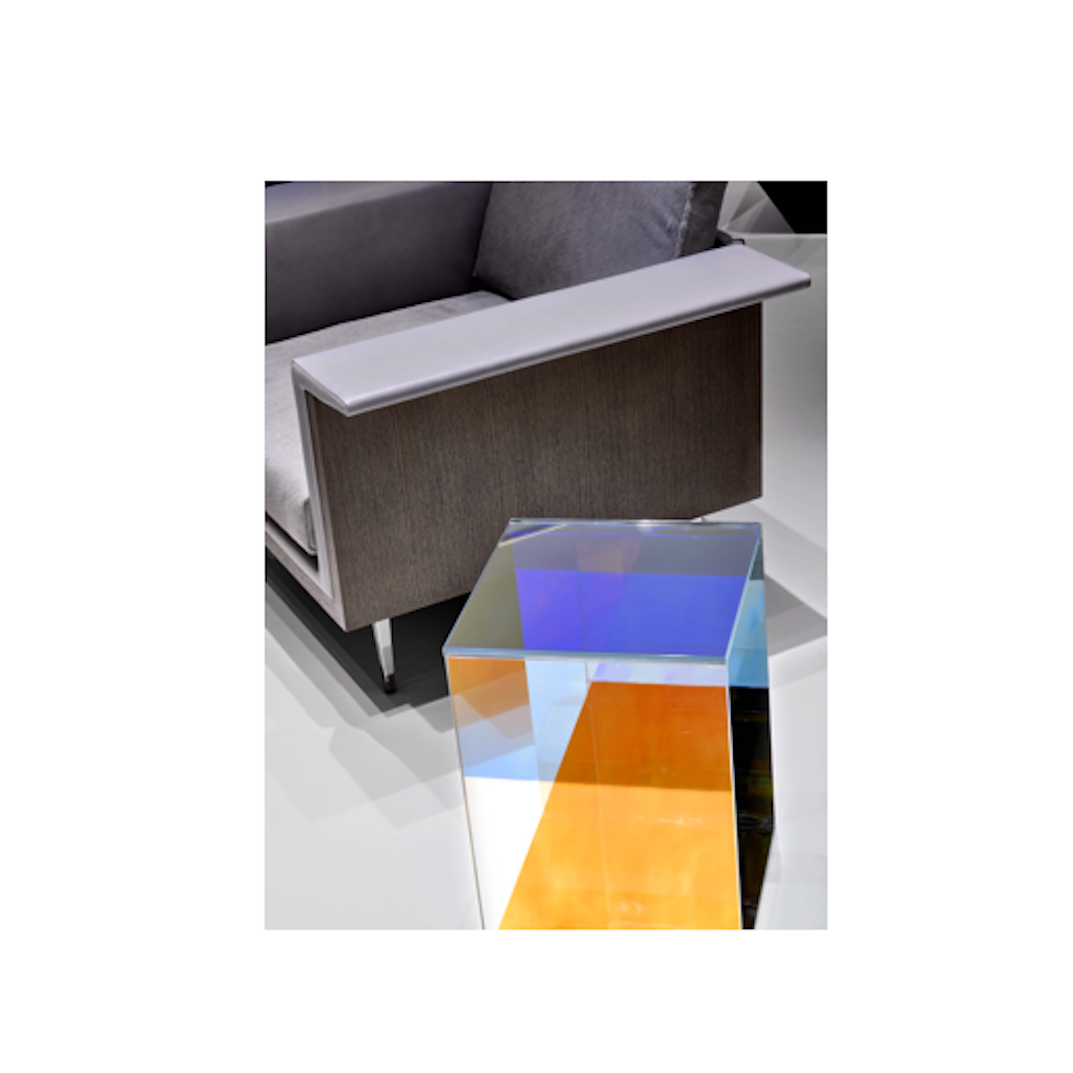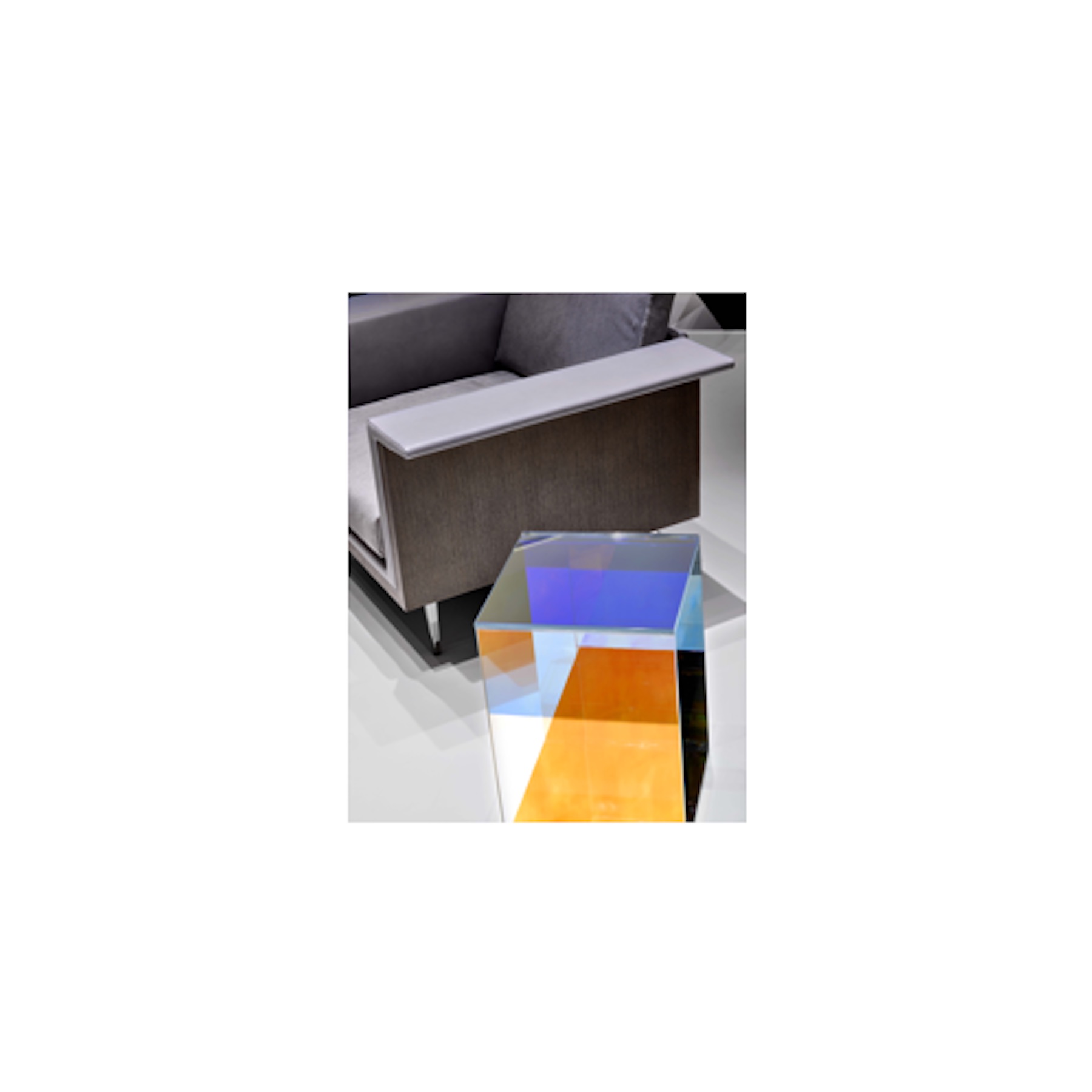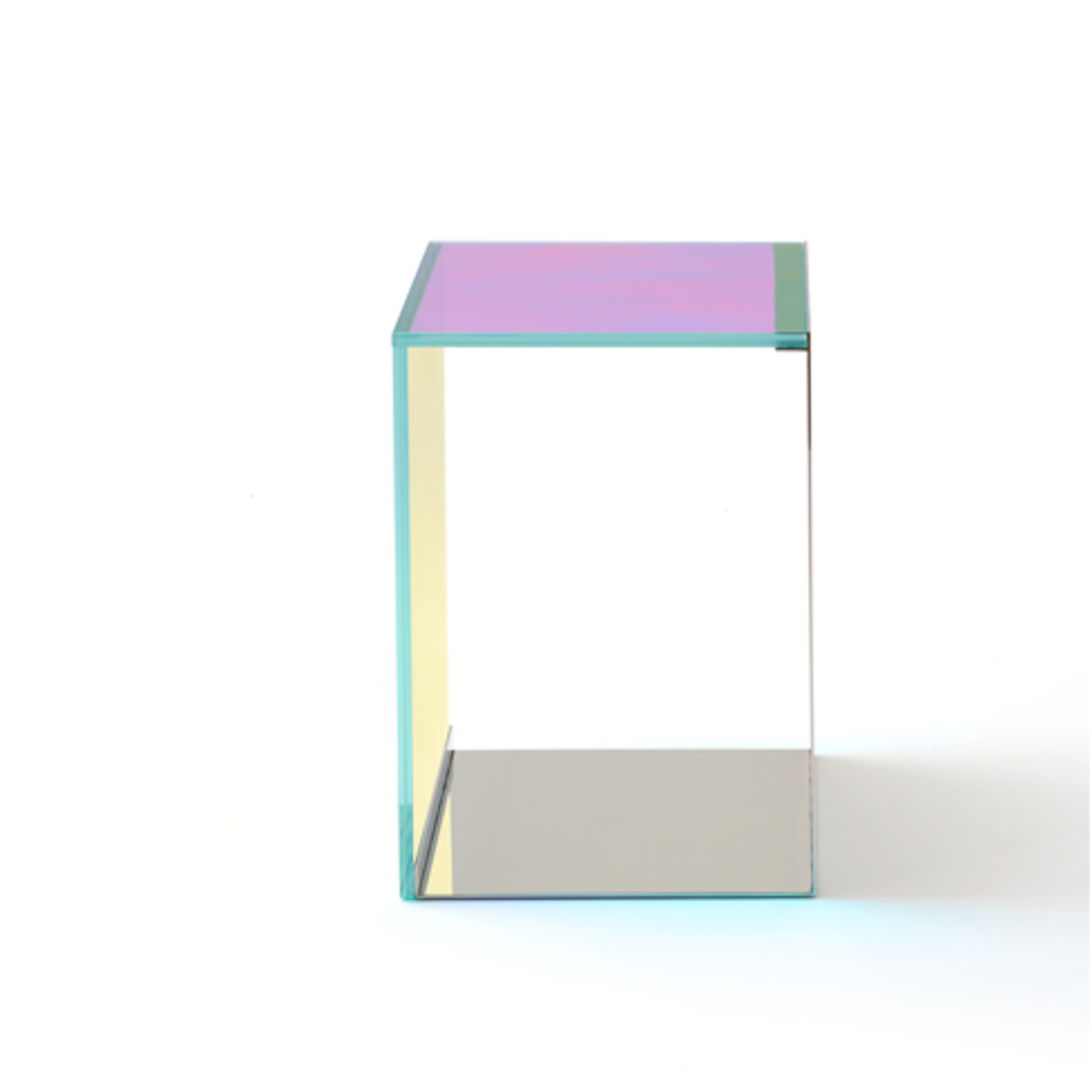 Driven by the goal to create a table that looks different from every angle, Dichroic explores the relationship between lighting, color, location and reflection. Made from glass with micro-layers of metals and oxides that refract light into multiple hues with a stainless steel frame, it is a signature piece for its simplicity and dynamic beauty. The design is minimal and structural in profile and measures 13"L x 13W x 18.5"H.
