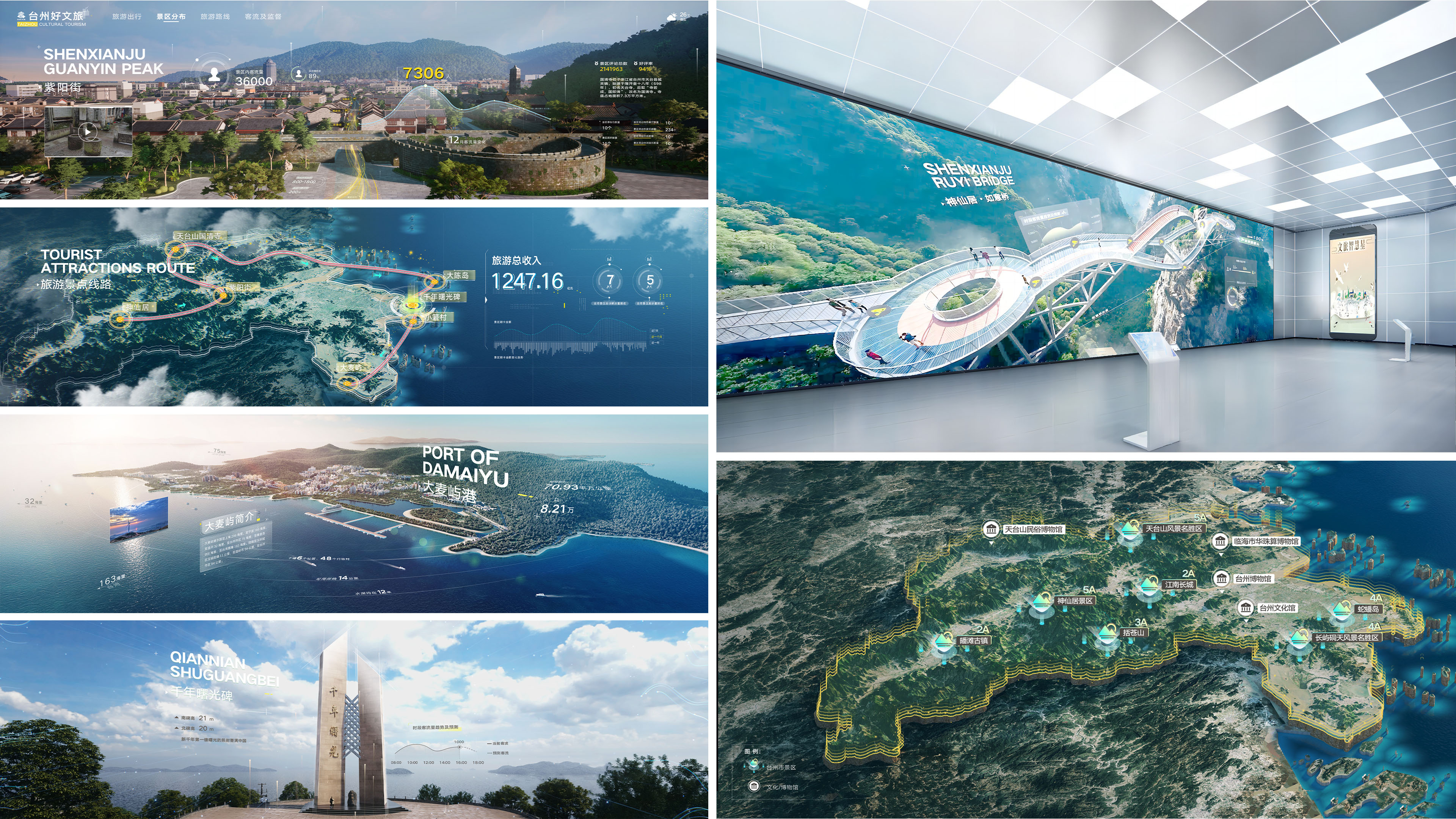 Cutting-edge virtual reality technology and 3D interactive design were utilized to create a realistic digital landscape of the cultural tourism, including famous attractions such as Tiantai Mountain and Shenxianju. Through simulation mapping technology, the images are presented in a more three-dimensional and realistic way, and devices such as interactive digital tables and virtual cell phones enhance the immersive experience, allowing audiences to explore more deeply.