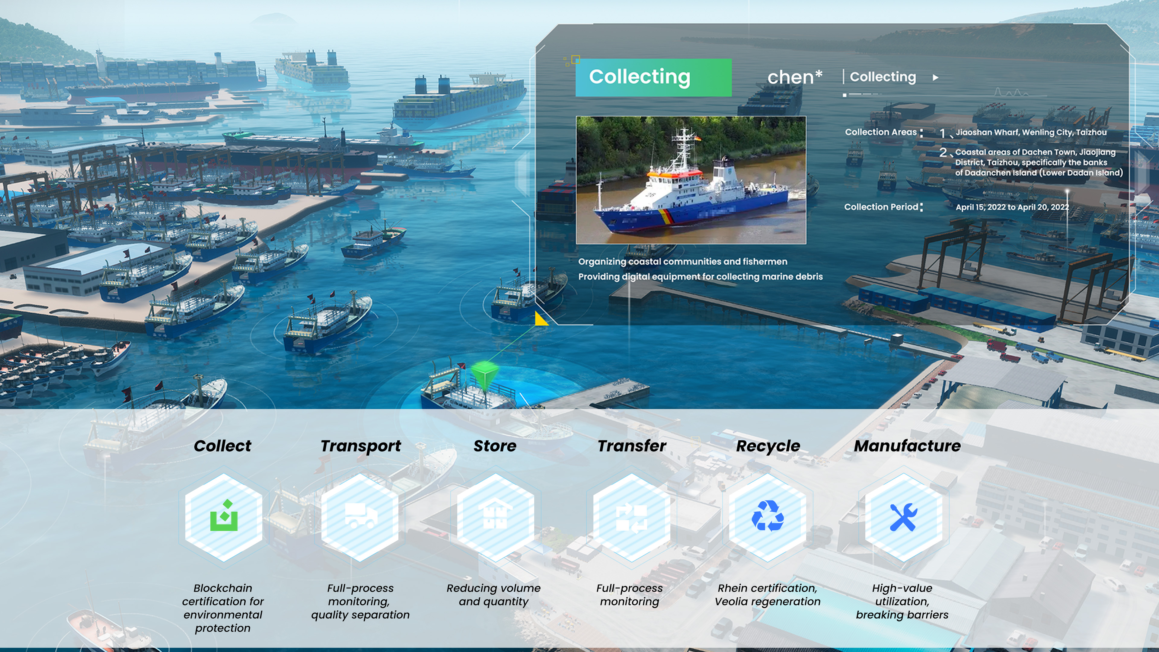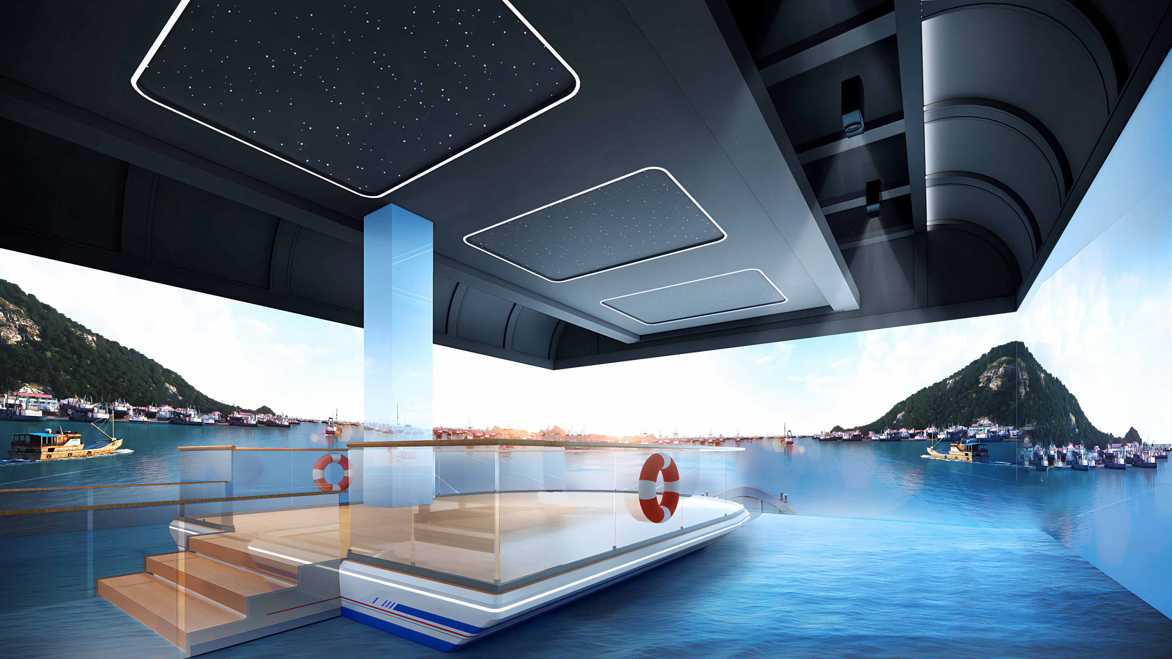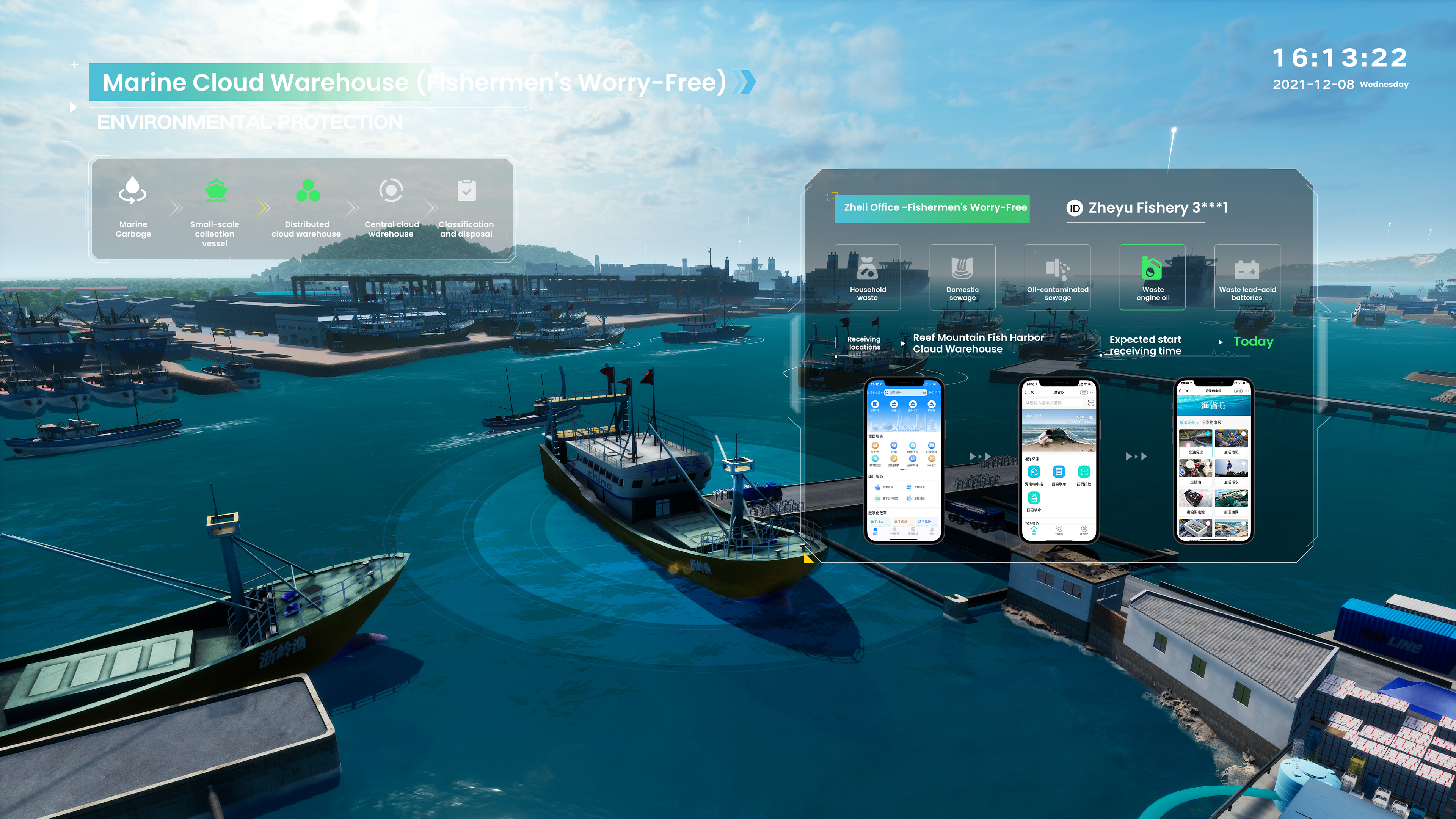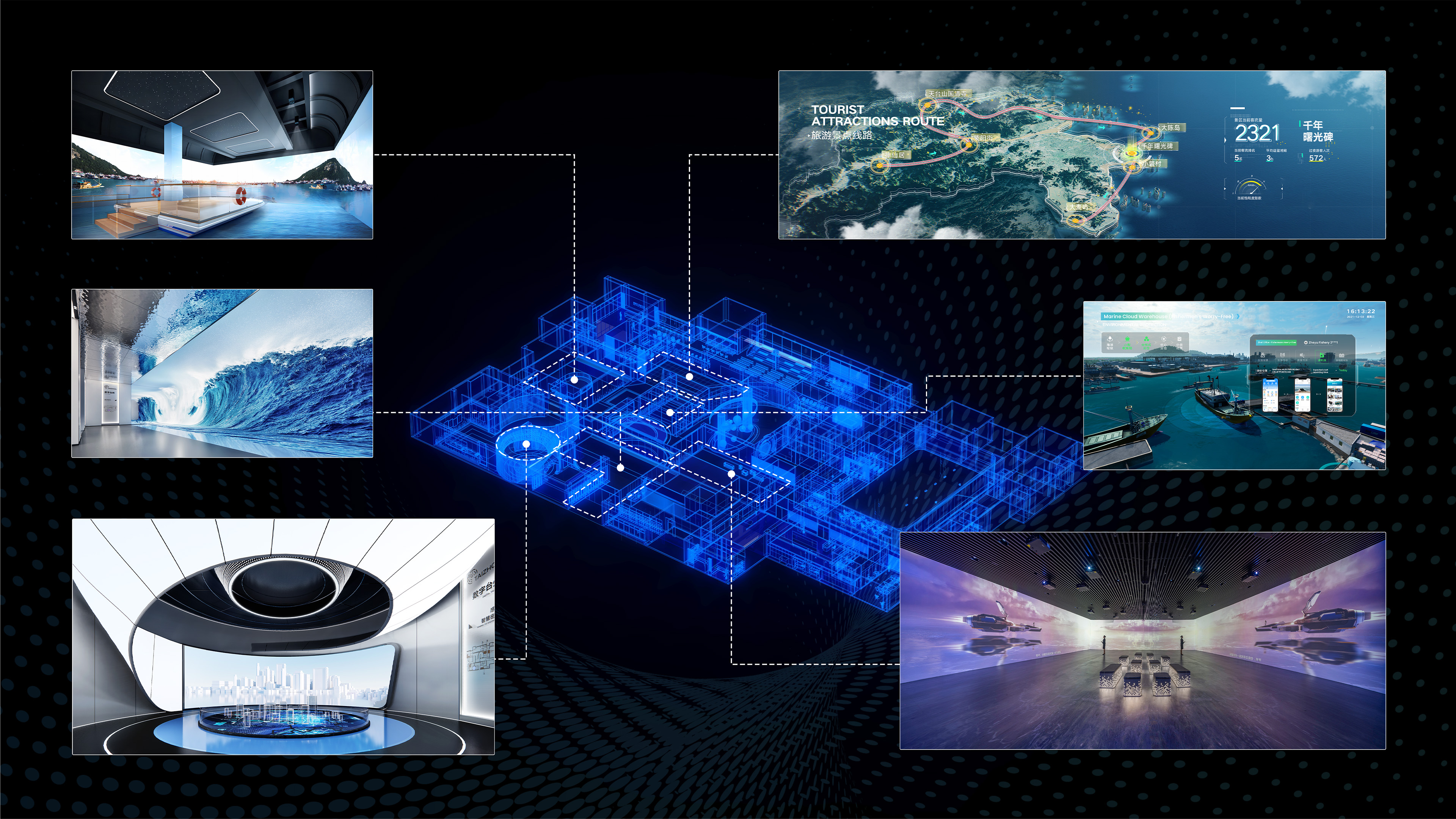 The exhibition area is centered around intricately designed vessels and seamlessly integrates with grandstands and tri-fold screens. Drawing inspiration from the coastal characteristics of Taizhou, the space employs multiple seamless edge-blending technologies, high-definition projection, and surround sound systems to create an immersive maritime environment. The exhibition incorporates real-life scenarios like flood and typhoon emergency responses and ship fisheries management. Through a full-scenario 3D roaming mode, visitors can realistically experience emergency response procedures for weather-related disasters such as typhoons and the management of ship fisheries. Anchored in the unique charm of Taizhou's coastal region, the exhibition immerses the audience completely in the enchanting digital marine world.