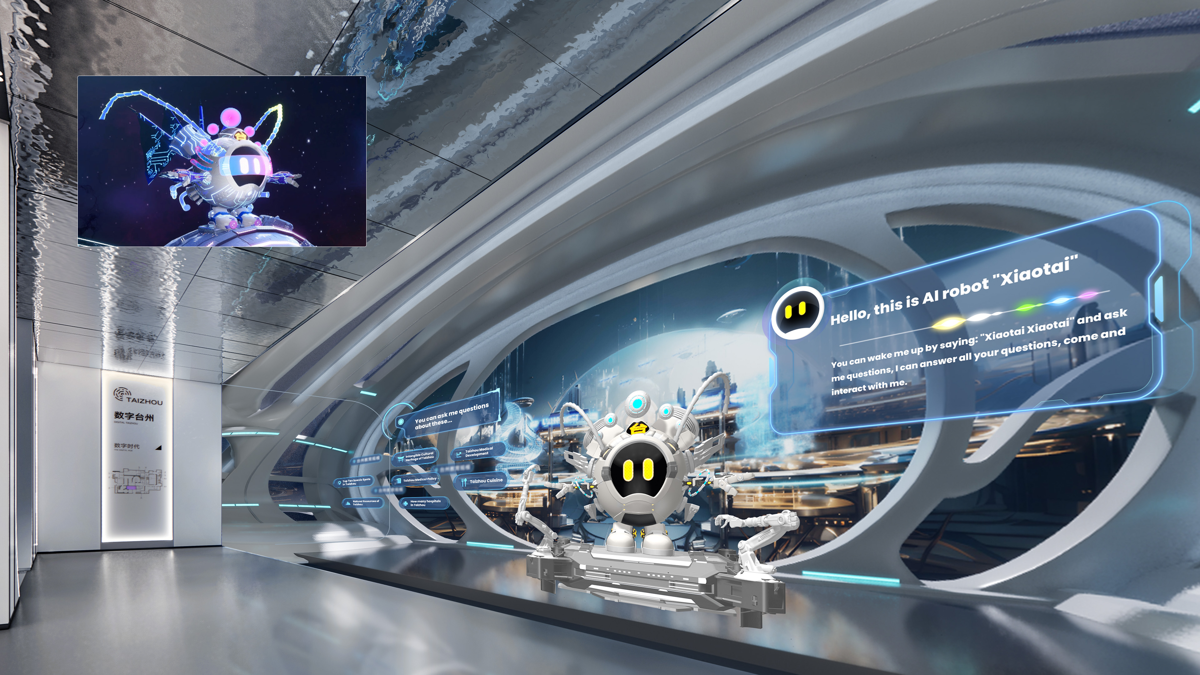 Entering the venue's lobby, a vivid depiction of the digital era unfolds on the curved screen, presenting the blueprint for Taizhou's digital age. The lifelike 3D effects complement the play of light and shadow, delivering a powerful impact of digital technology that seems to transport viewers into a futuristic world. Integration of the Xiaotai IP character with interactive gameplay in the lobby provides visitors with a richer and more immersive experience. Through this innovative approach, visitors can better understand and learn about digital technology and its applications across various fields while enhancing the enjoyment and engagement of their visit through interactive games.
