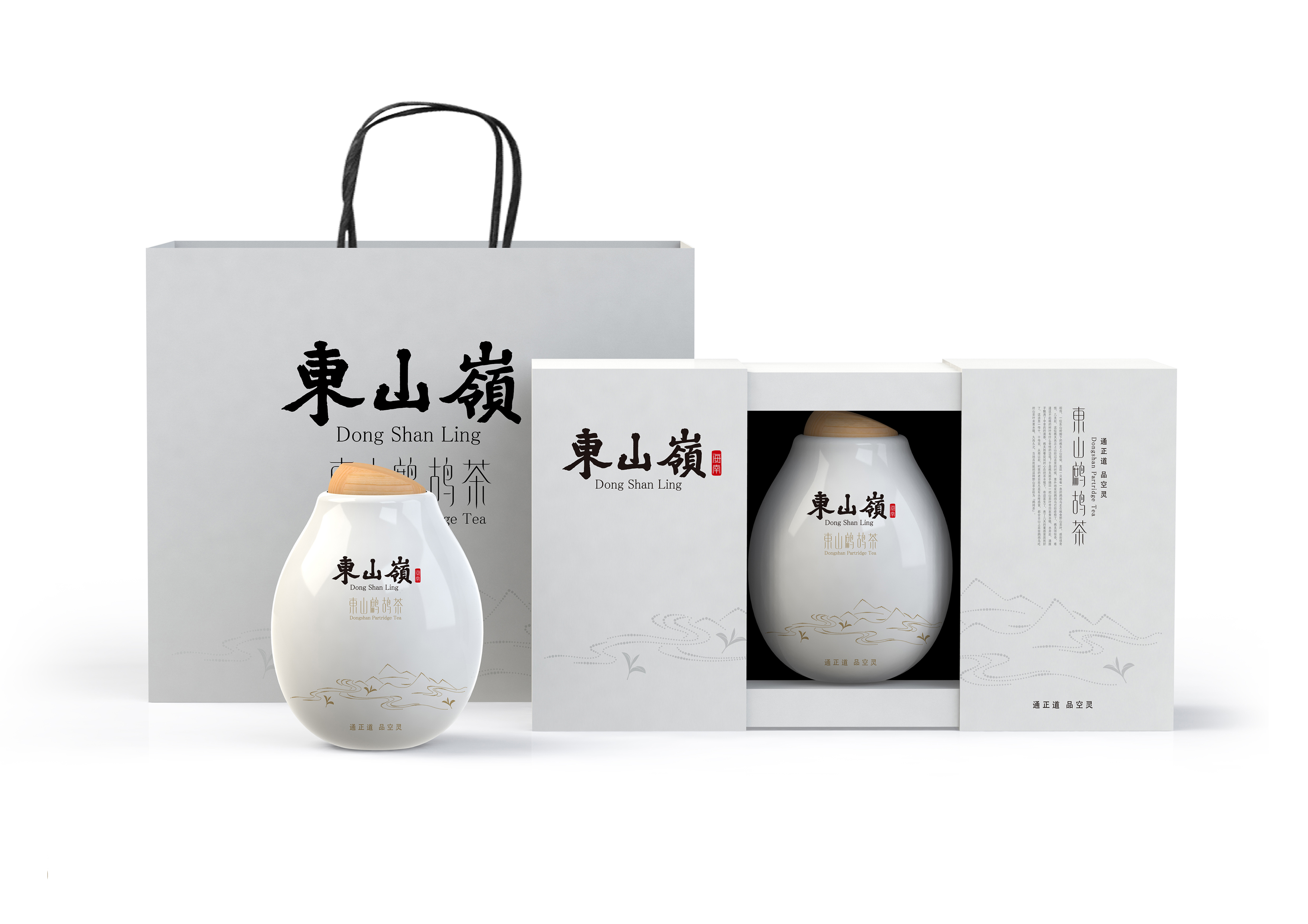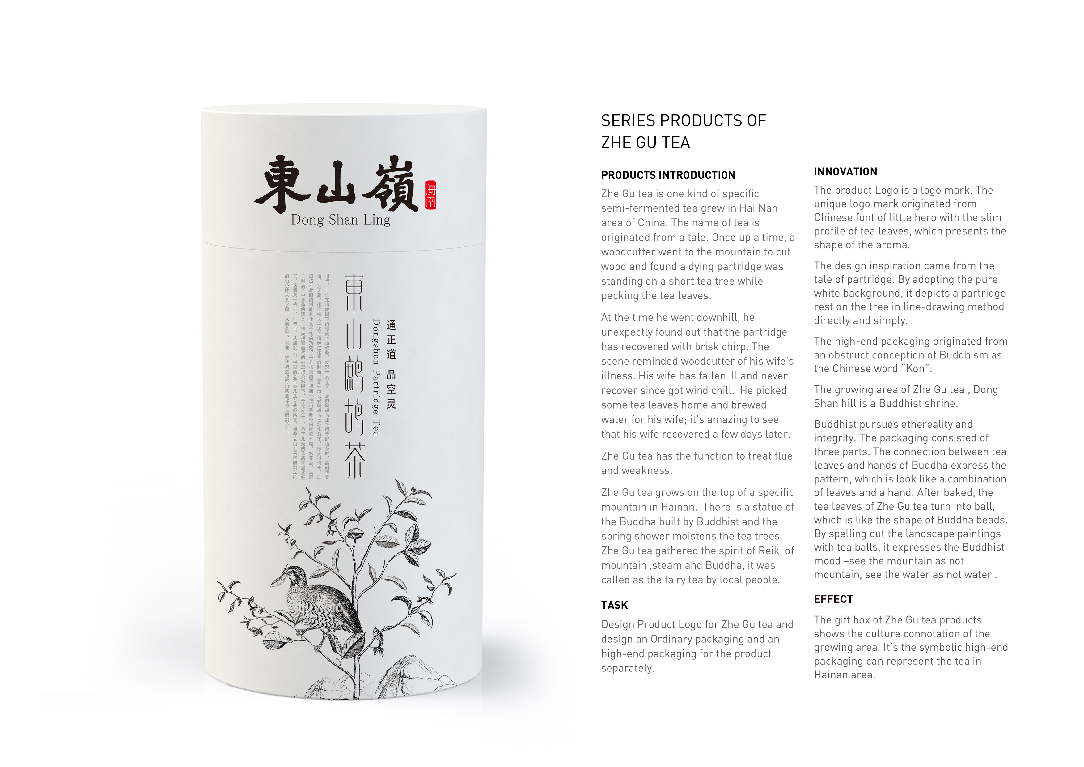 Zhe Gu Tea's unique logo originates from Chinese Xiao Zhuan font and was improved to resemble slim tea leaves. The bird on the package symbolizes the ancient tale in which a dying Zhe Gu bird revived after eating tea leaves. The growing area of this tea, Dong Shan hill, is known for its Buddhist shrine. After baking, tea turns into ball looking like Buddha beads which inspired the high end ceramic package’s round shape. The landscape painting is consisted of tea balls conveying a sense of Zen.