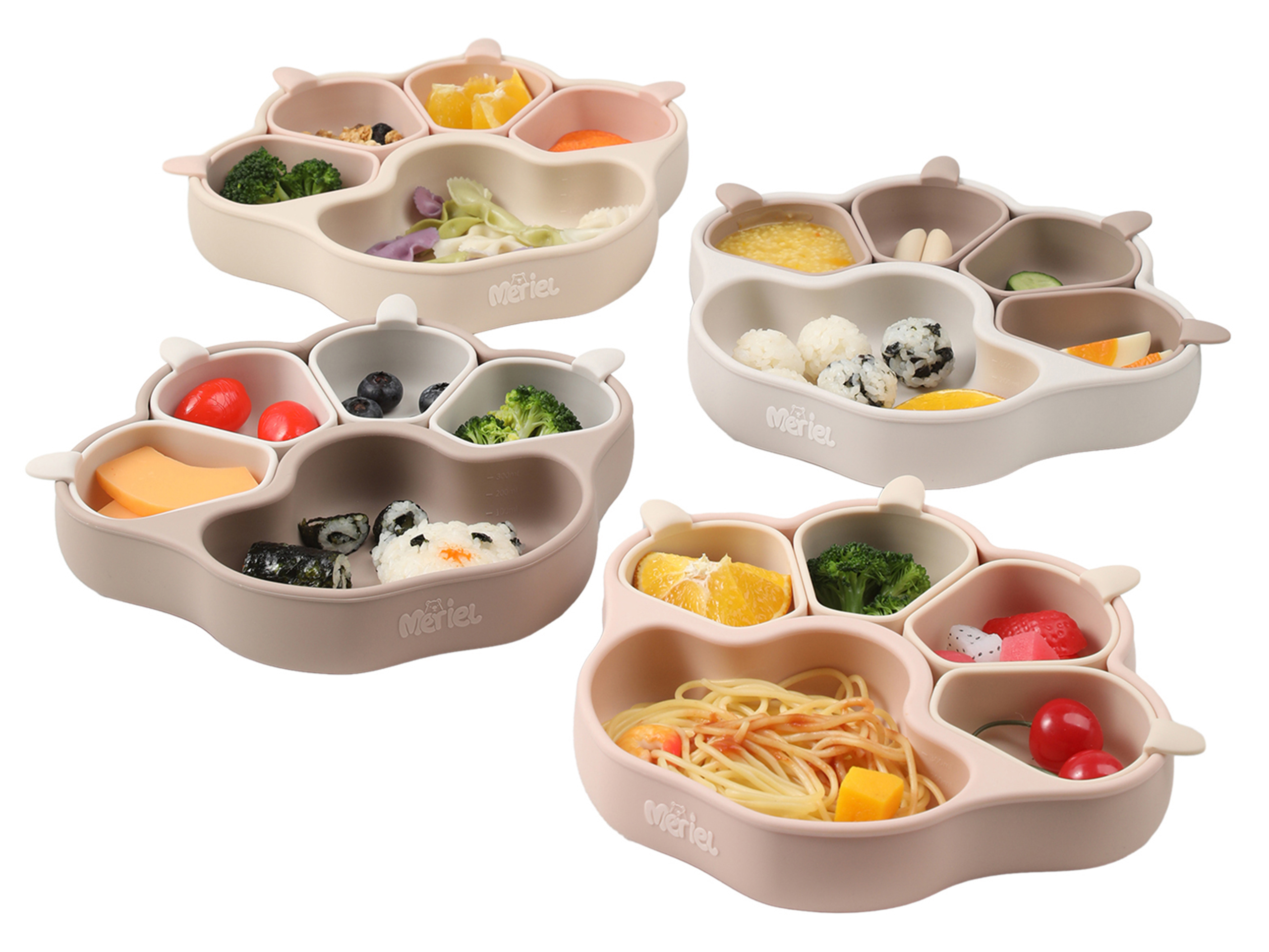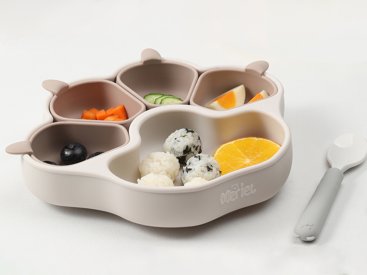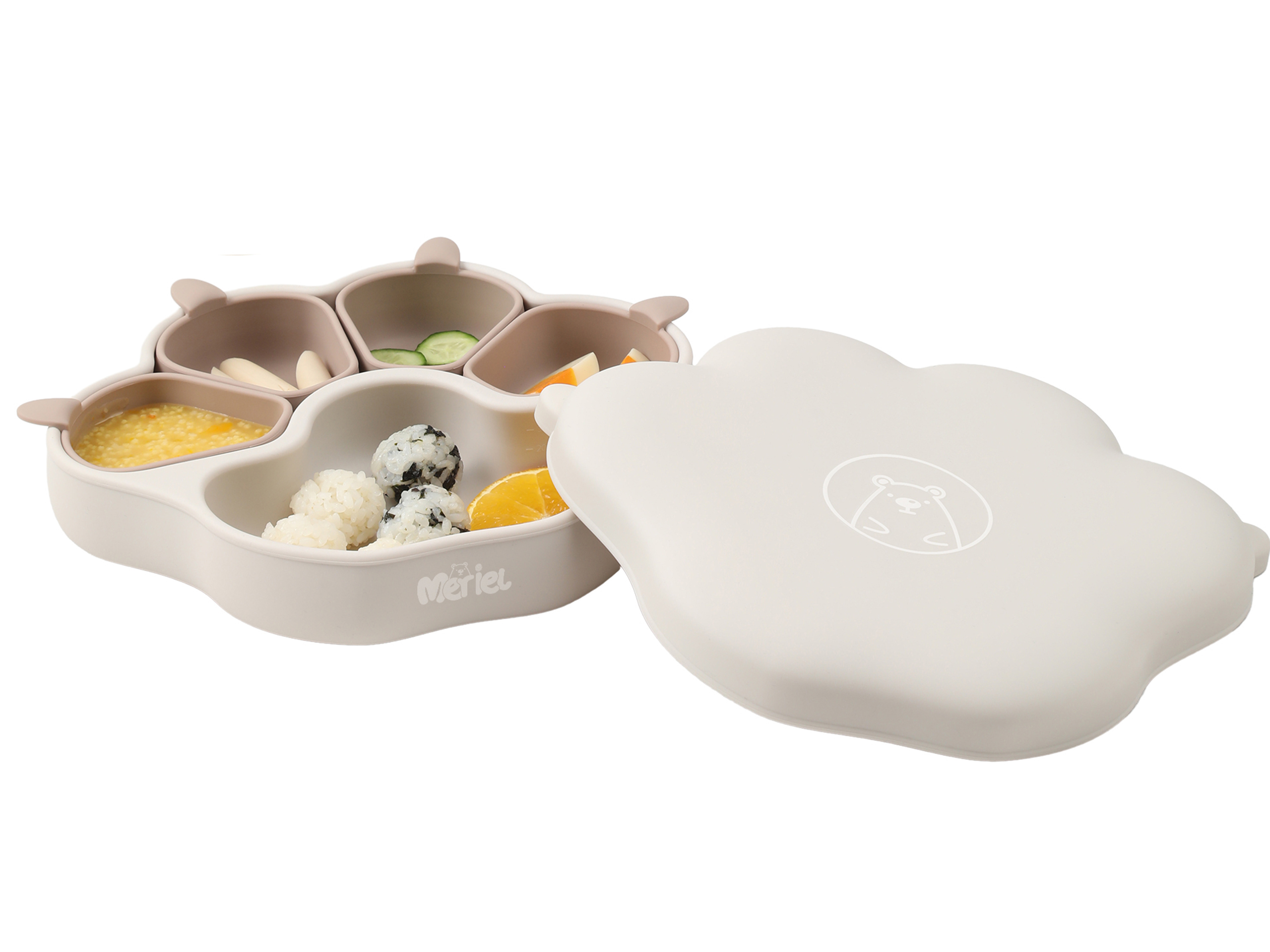 Meriel is a composable bear paw plate with an adorable appearance. Made from 100% platinum silicone, each component of it can be detached and used either in combination or separately. When used compose, it helps parents provide a balanced nutritional mix for their babies, preventing juices from mixing and affecting the texture of the food. The individual divided bowls can be used for steaming baby food at high temperatures or serving baby snacks. The suction cup at the bottom has a very strong hold, preventing babies from overturning it. Its temperature resistance ranges from -40 to 250°C,Supports high-temperature boiling and freezing.