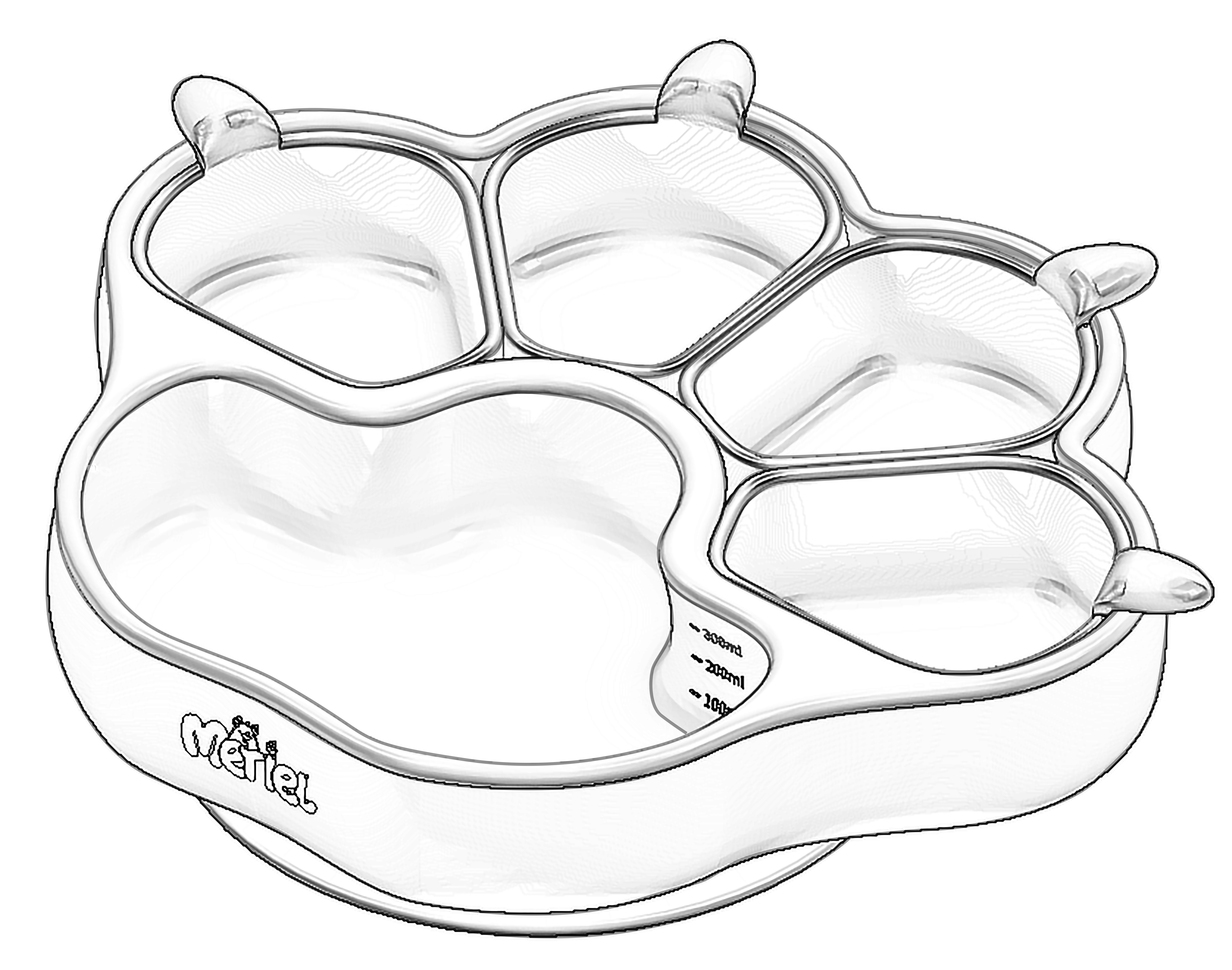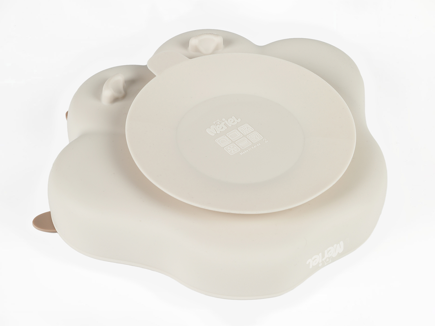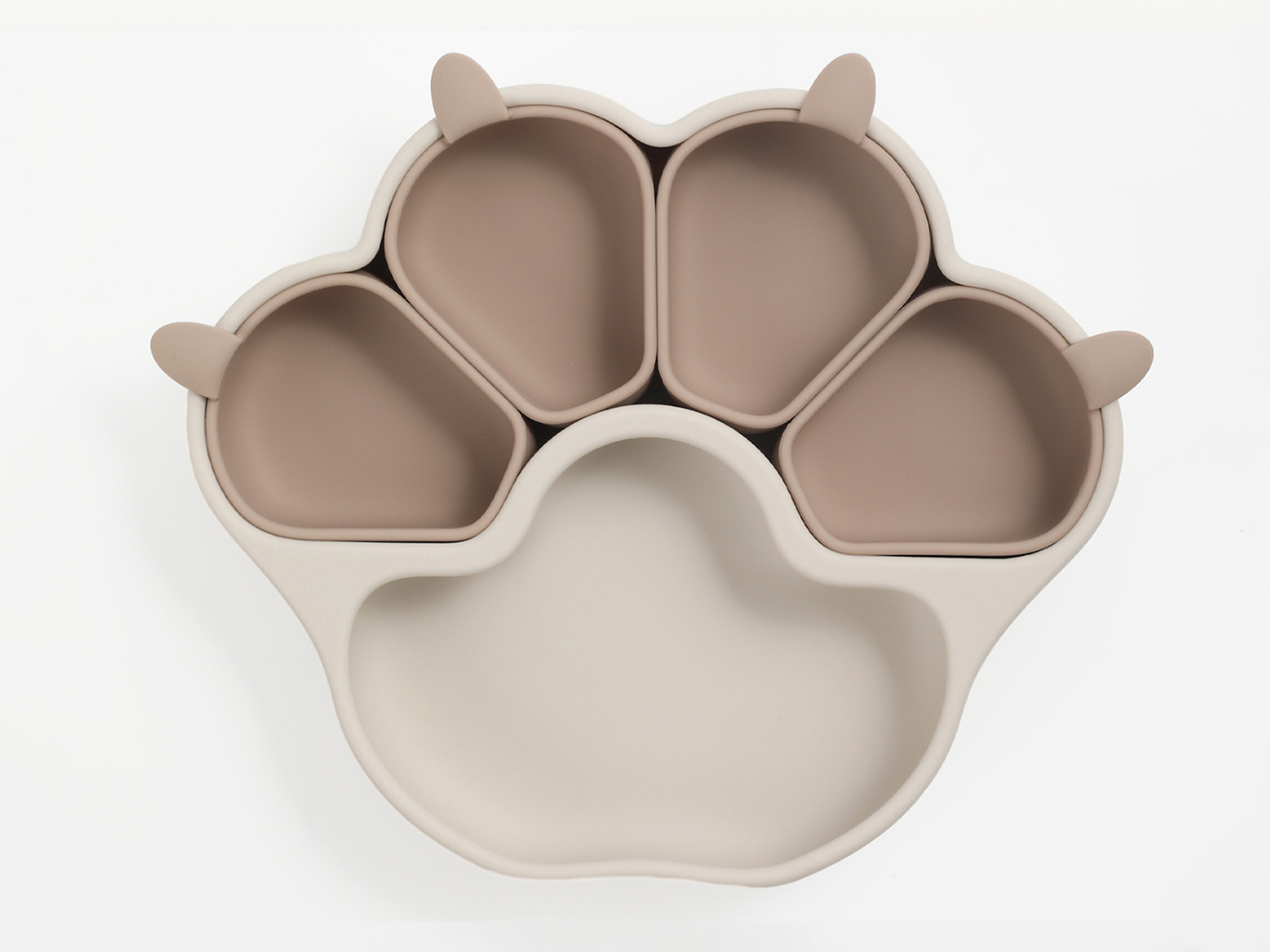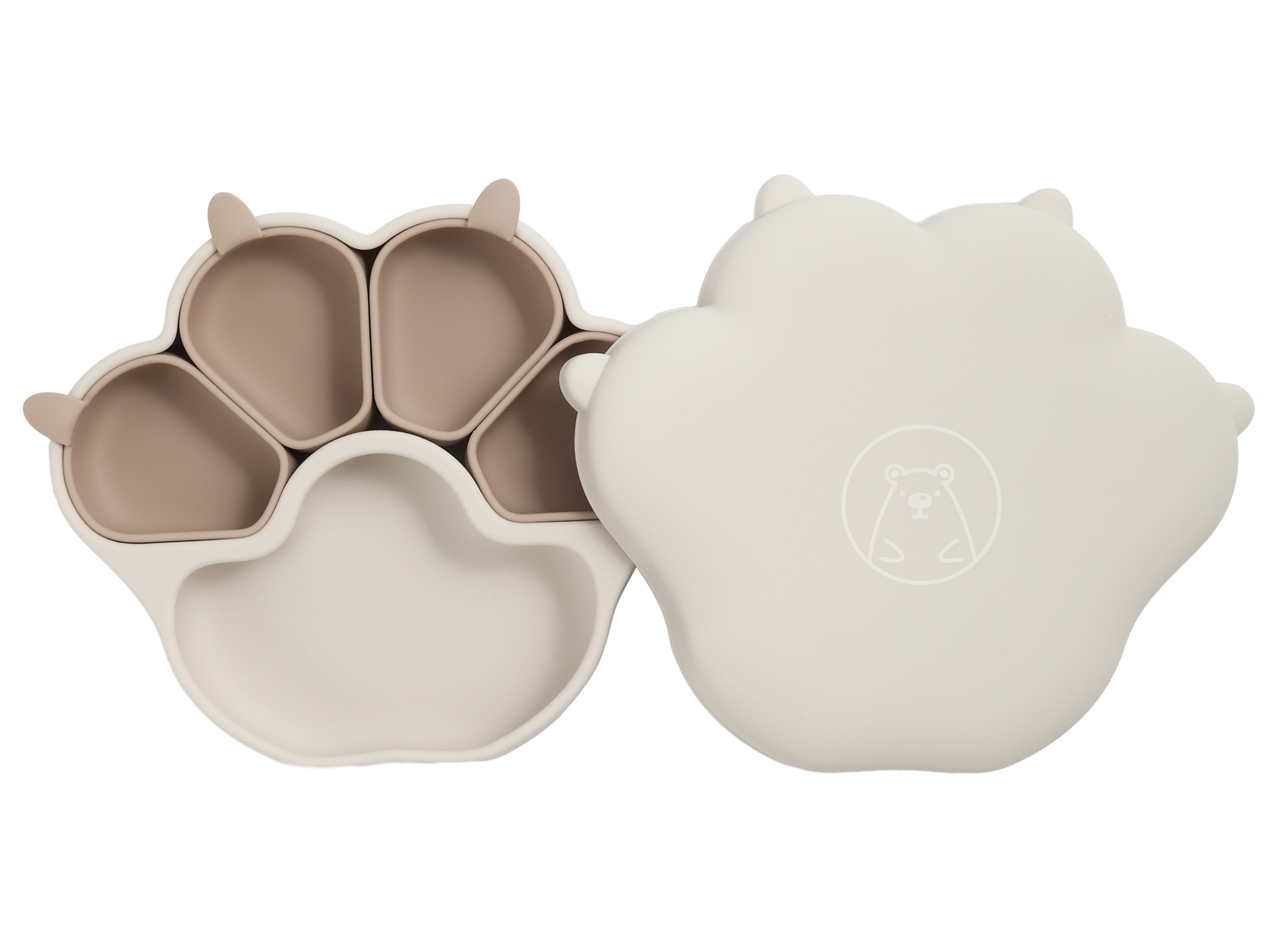 Meriel is a composable bear paw plate with an adorable appearance. Made from 100% platinum silicone, each component of it can be detached and used either in combination or separately. When used compose, it helps parents provide a balanced nutritional mix for their babies, preventing juices from mixing and affecting the texture of the food. The individual divided bowls can be used for steaming baby food at high temperatures or serving baby snacks. The suction cup at the bottom has a very strong hold, preventing babies from overturning it. Its temperature resistance ranges from -40 to 250°C,Supports high-temperature boiling and freezing.