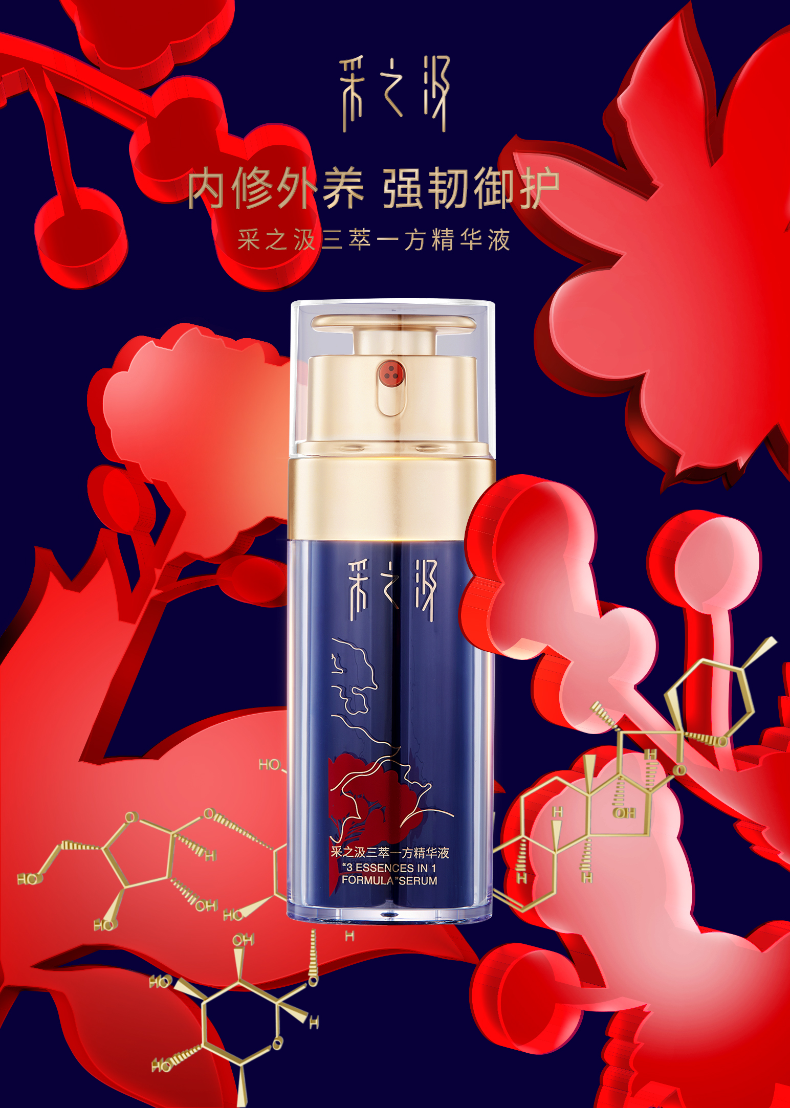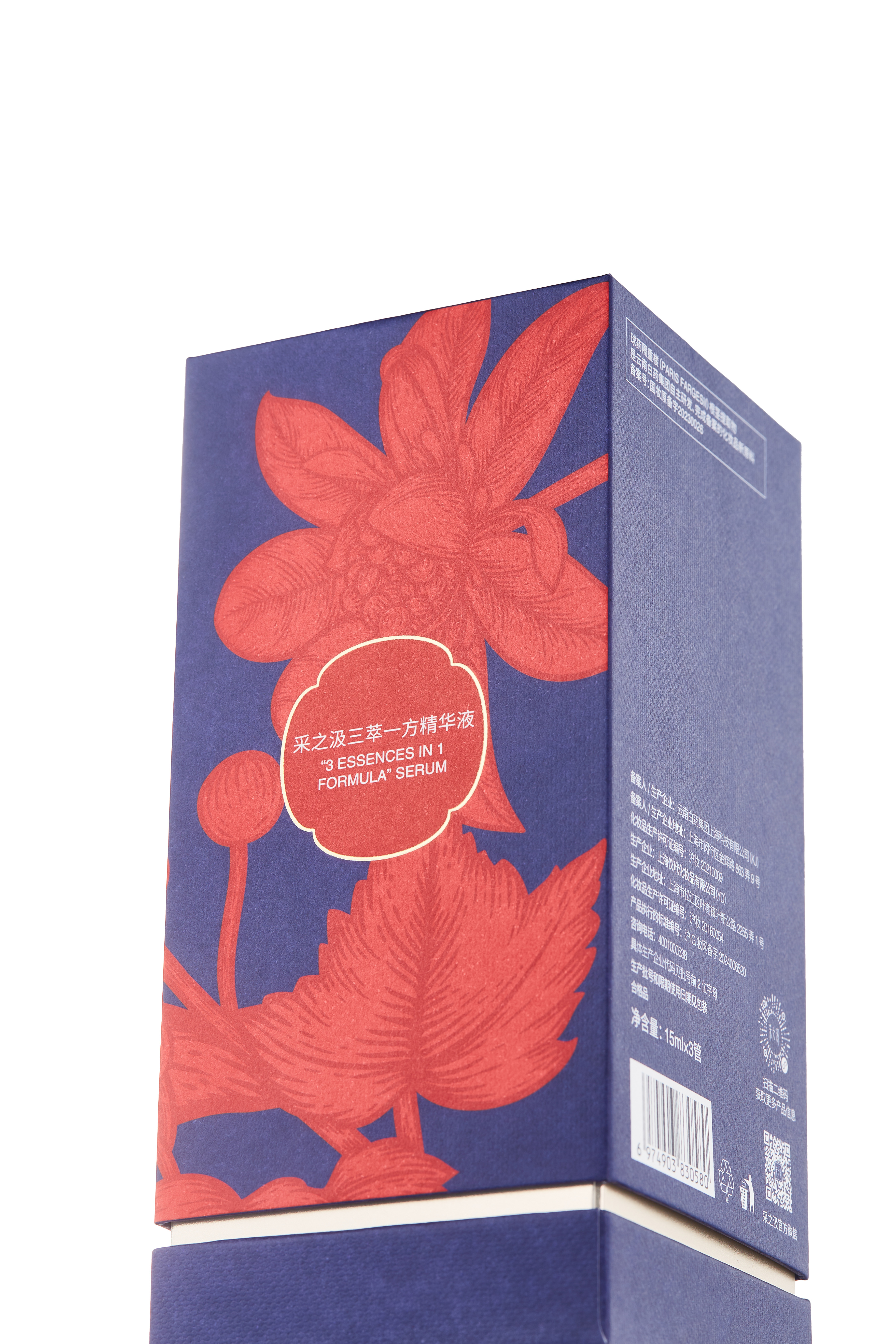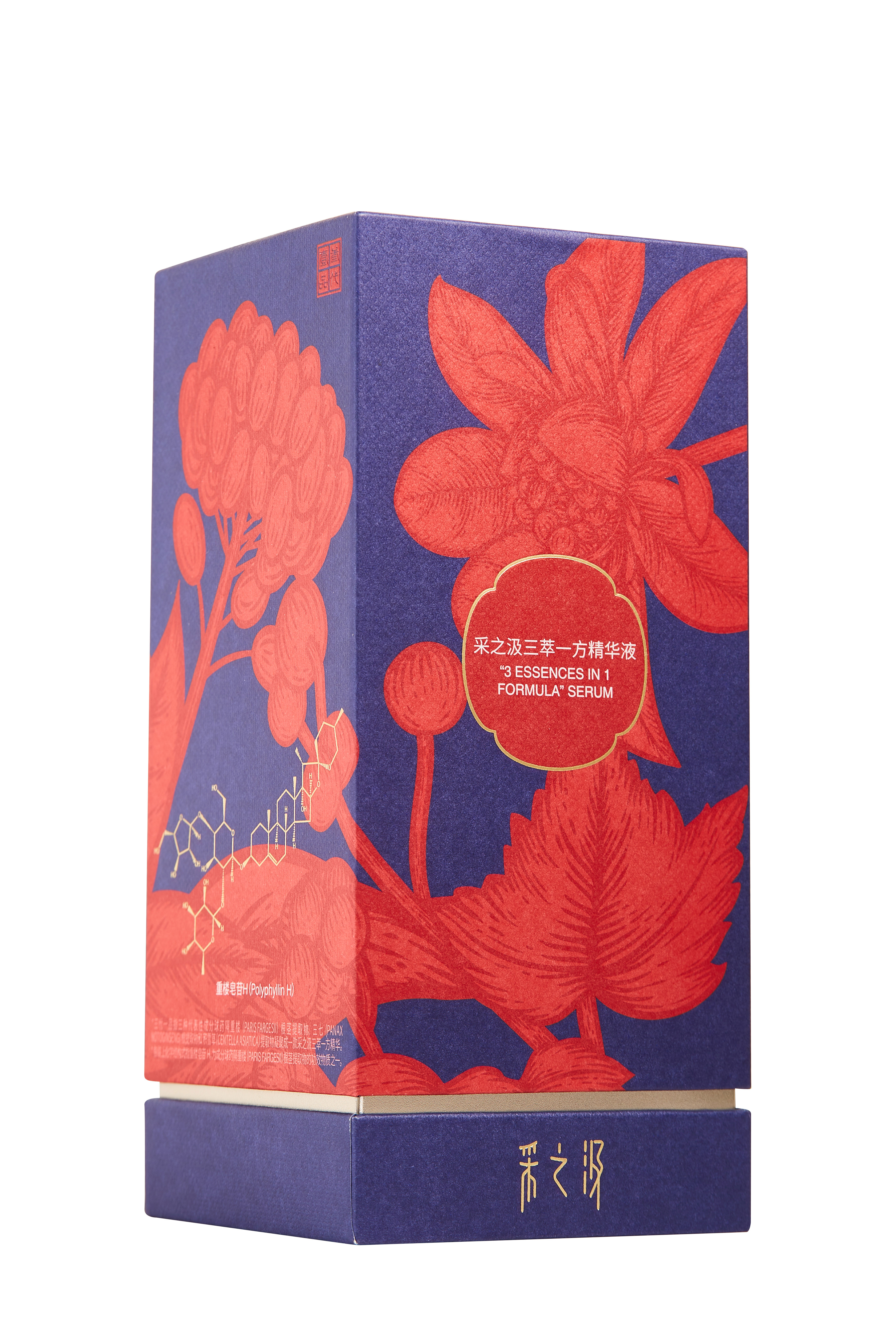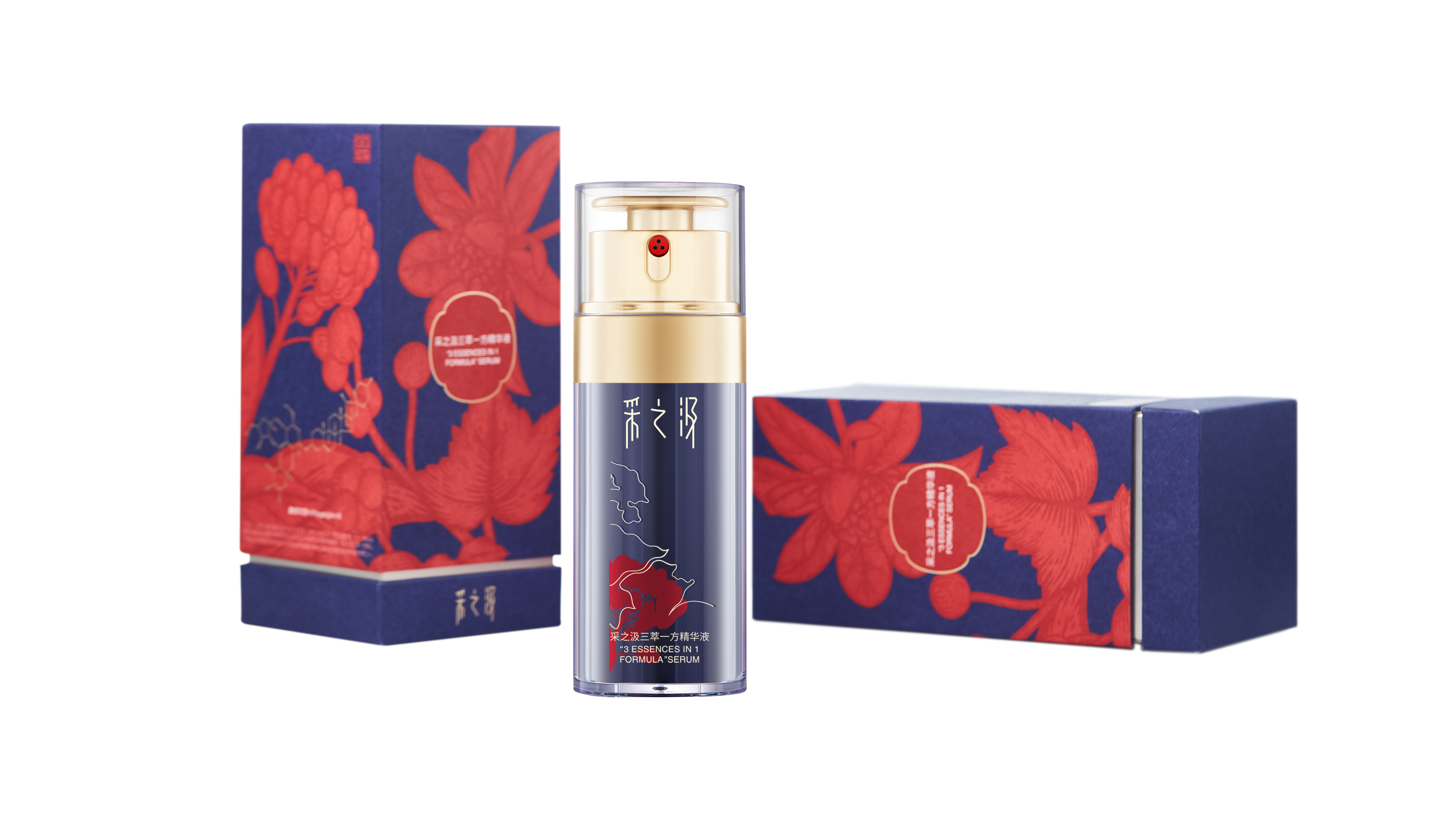 The packaging for Caizhiji “3 essences in 1 formula” serum innovatively marries Yunnan’s rich intangible cultural heritage elements with local herbal medicines, which not only suggests the product’s powerful functions on skin repair and protection, but also embodies the brand’s unique Yunnan’s aesthetics.