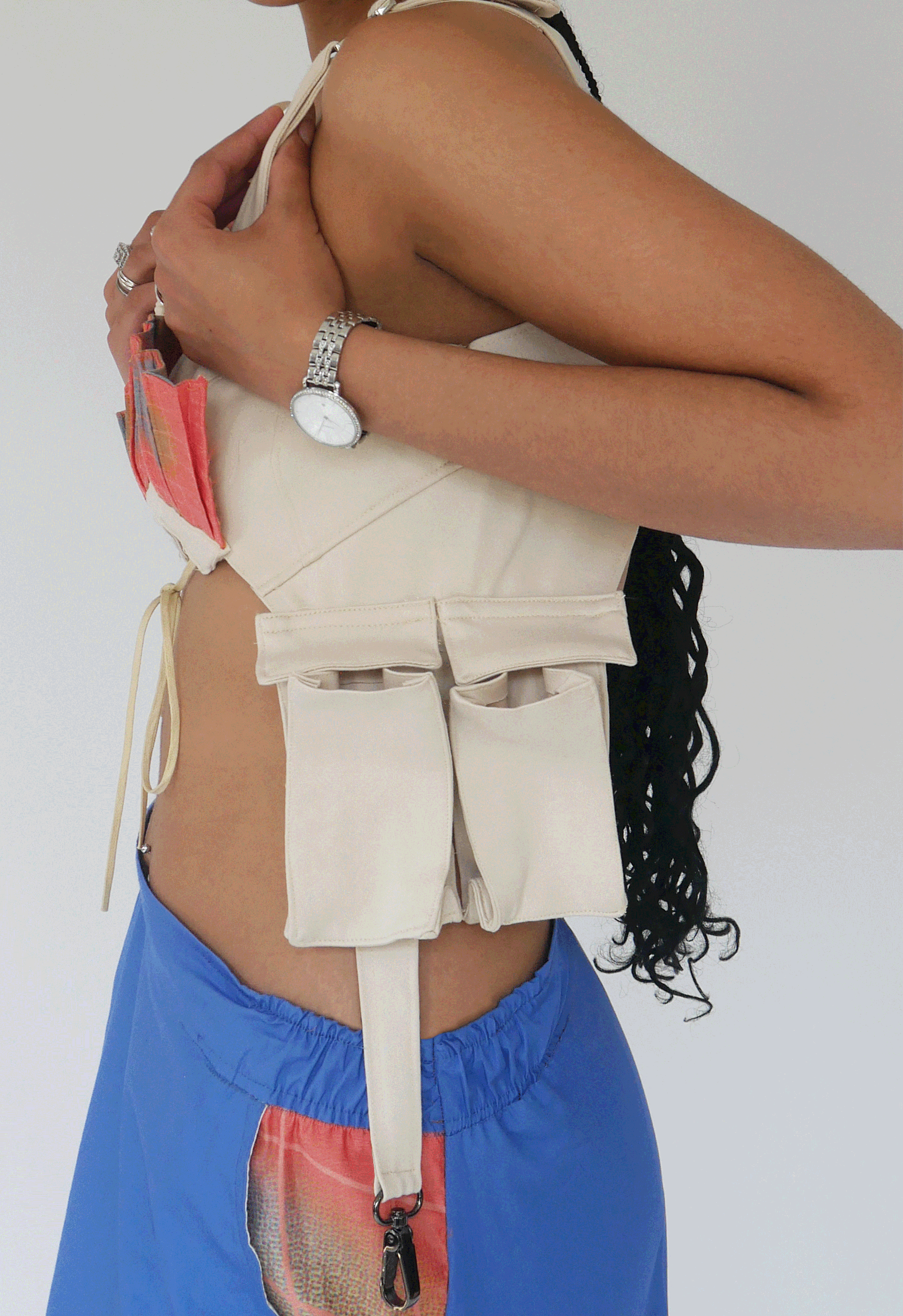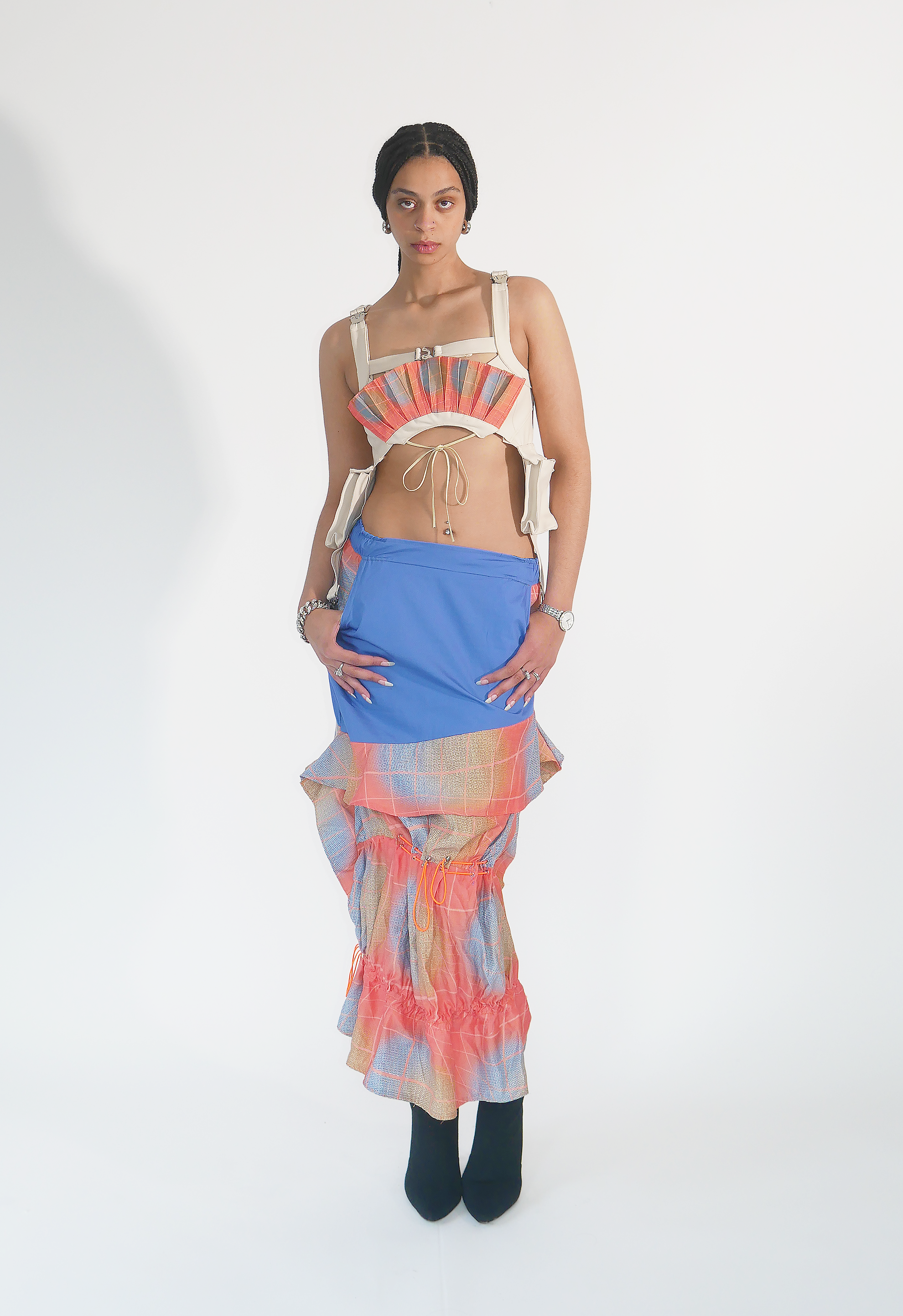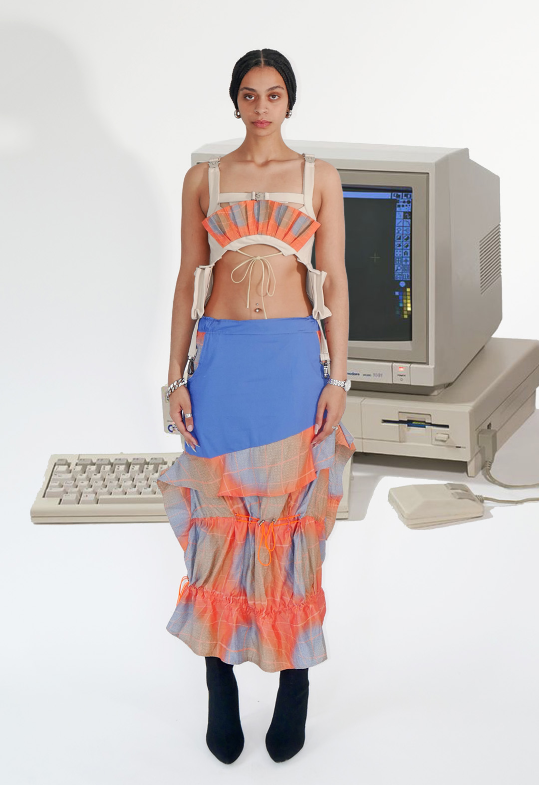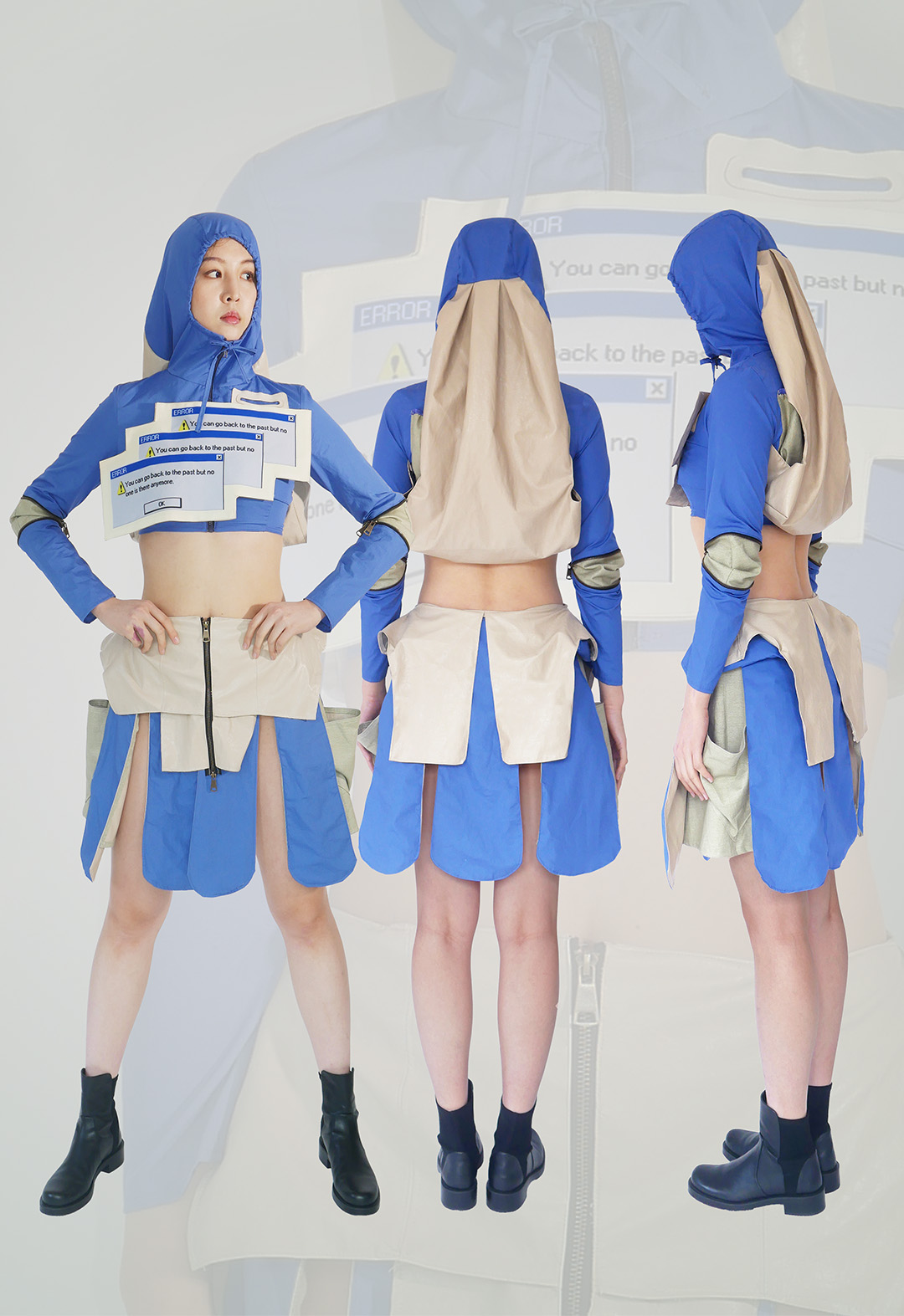 Dreamcore, a surrealistic aesthetic womenswear collection, explores the intersection of surrealism and Generation Z culture. This colorful, wearable, and interactive apparel collection features innovative elements such as an LED screen on the jacket, technology-inspired prints on the skirt, and a uniquely designed triangle hat. Together, these components create a playful and whimsical experience, blending fashion with imaginative, tech-infused artistry.