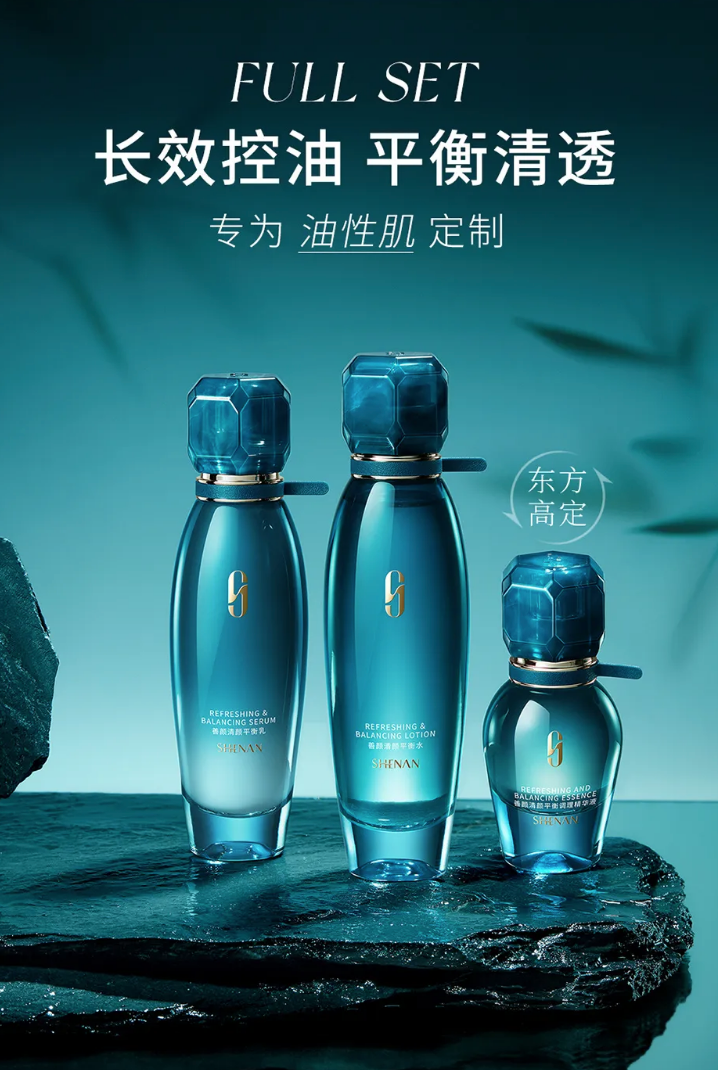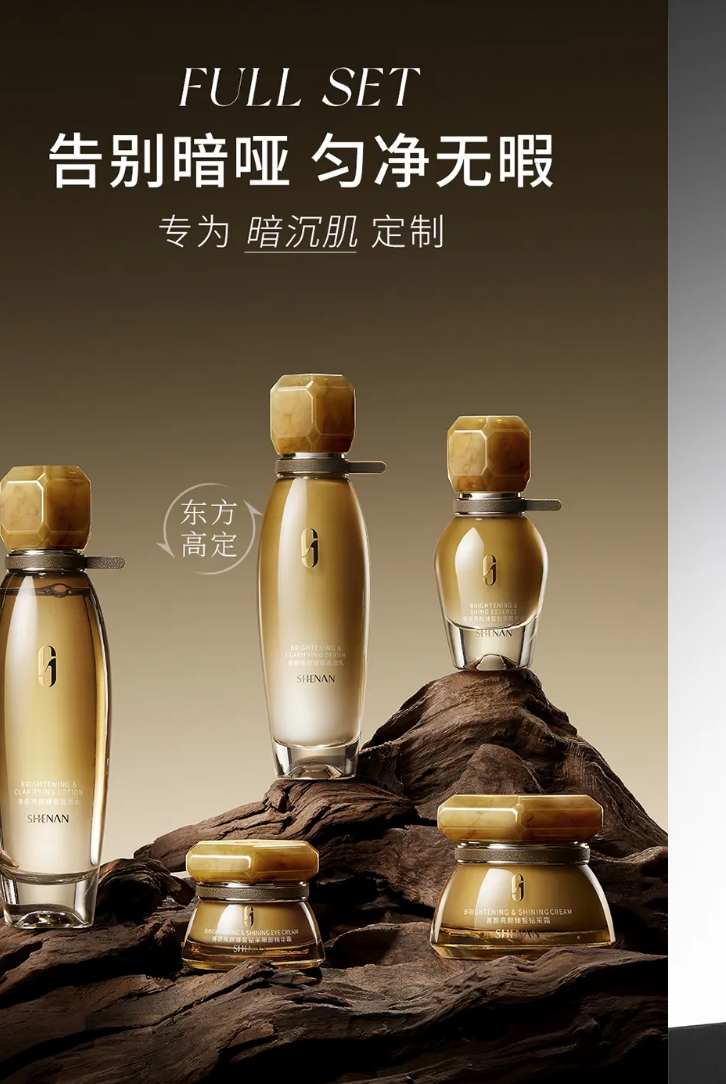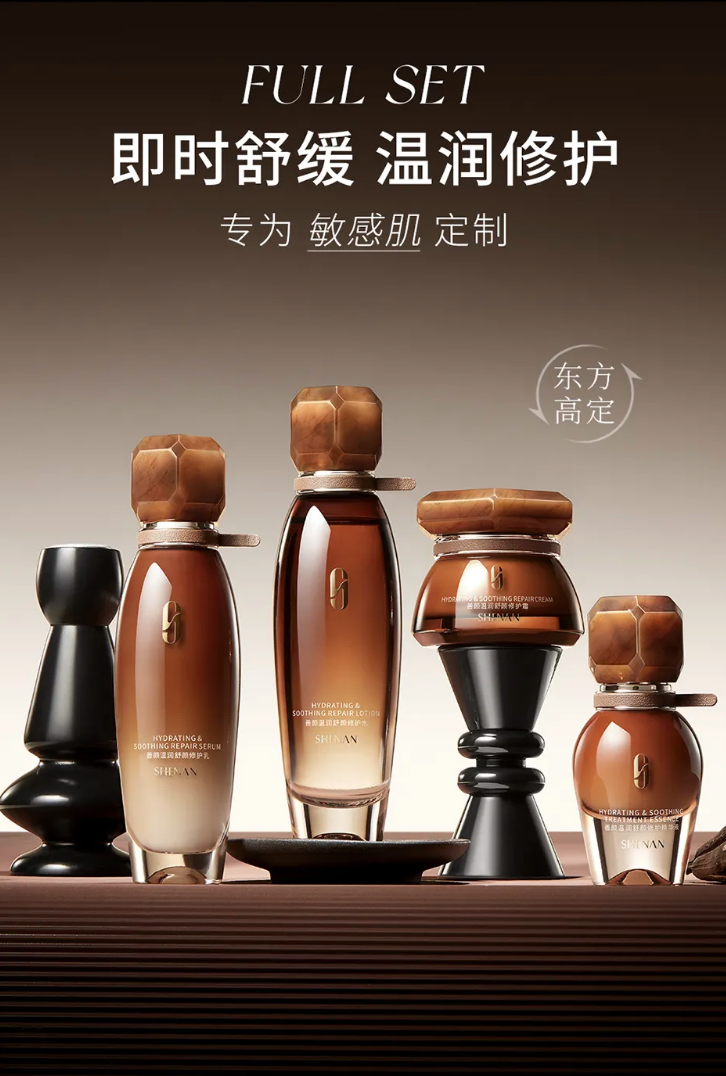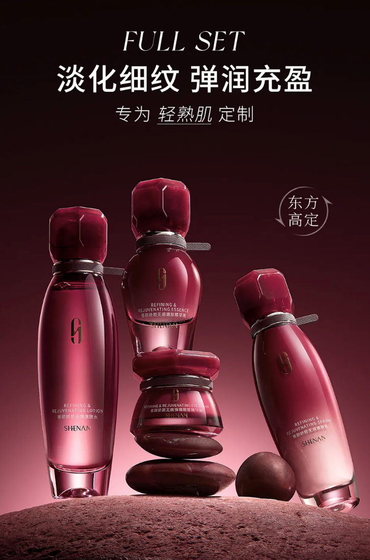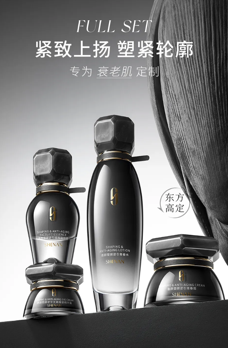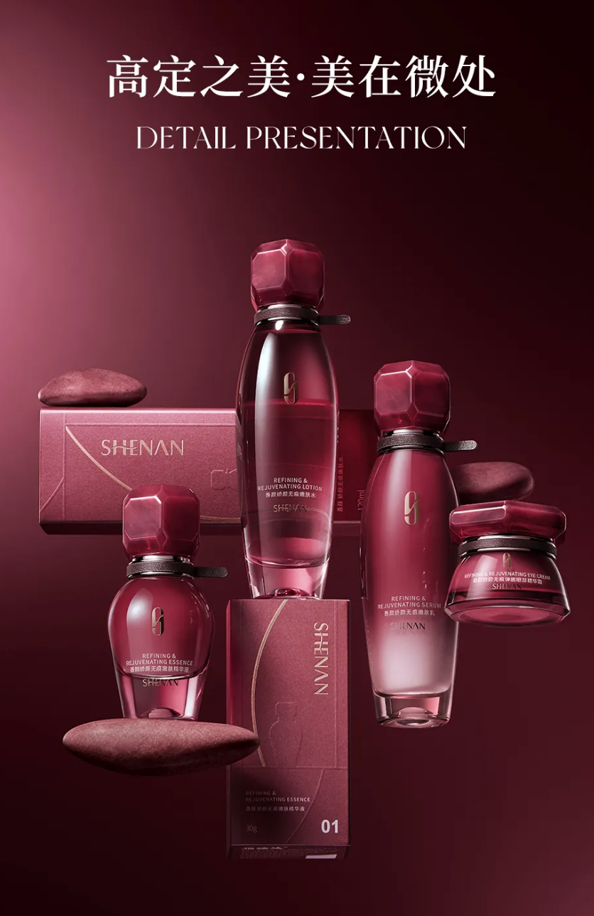 The product visually presenting a linear progression and transformation through shapes, echoing the brand's concept of precision skincare, while adding intricate details to convey that Shenan brand always accompanies consumers with specialized technology and new ideas. Retain time and bloom with new life!