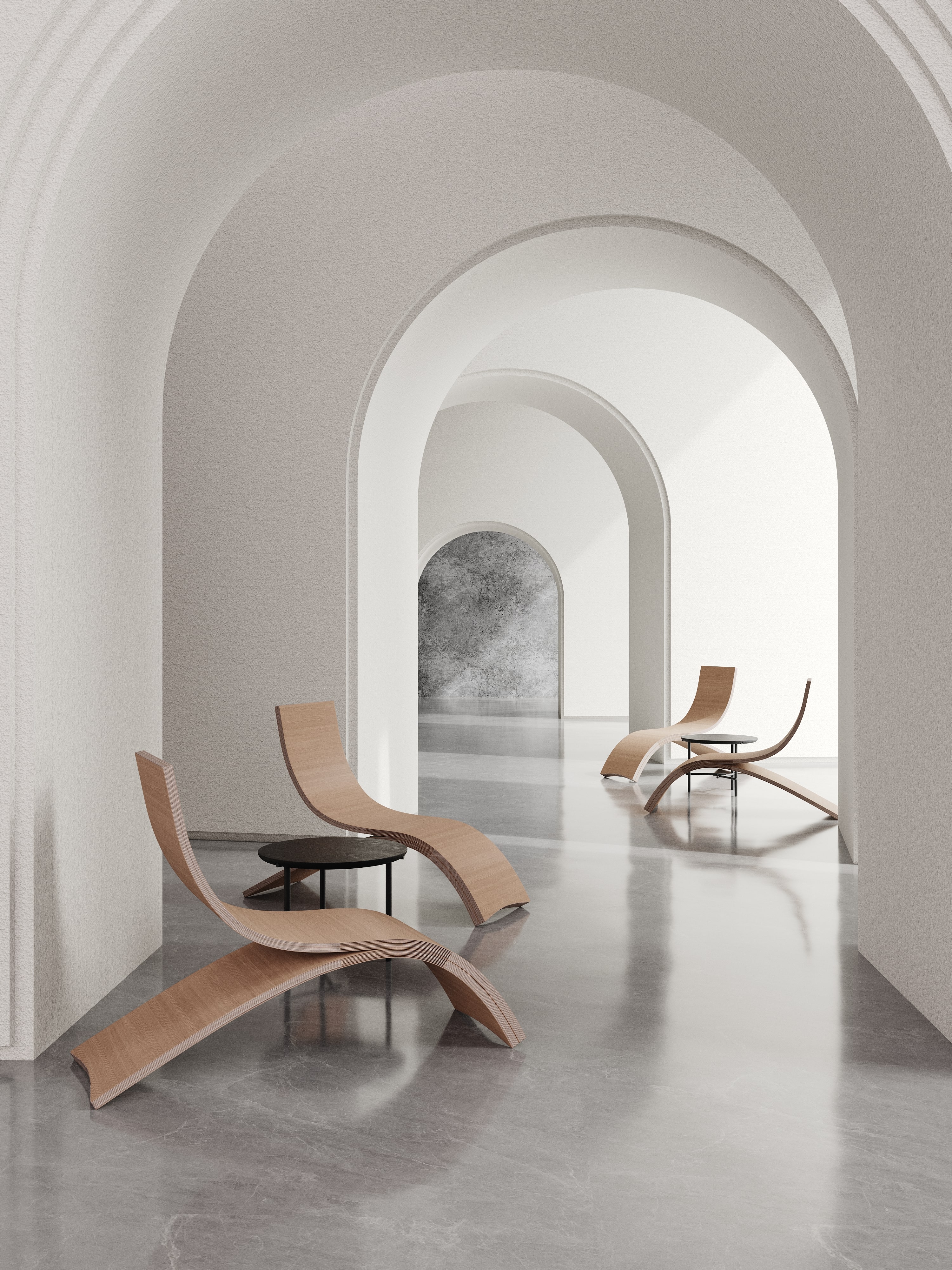 Inspired by the arch structure in classic architecture, our chair deconstructs this form to adapt to the industrial age, breaking away from traditional chair designs. The stool and support are composed of two simple arcs, transforming the arch into a practical structural component. This design contrasts sharply with the modernist architectural lines and industrial materials like reinforced concrete and glass, providing a sense of comfort and warmth through traditional wood.