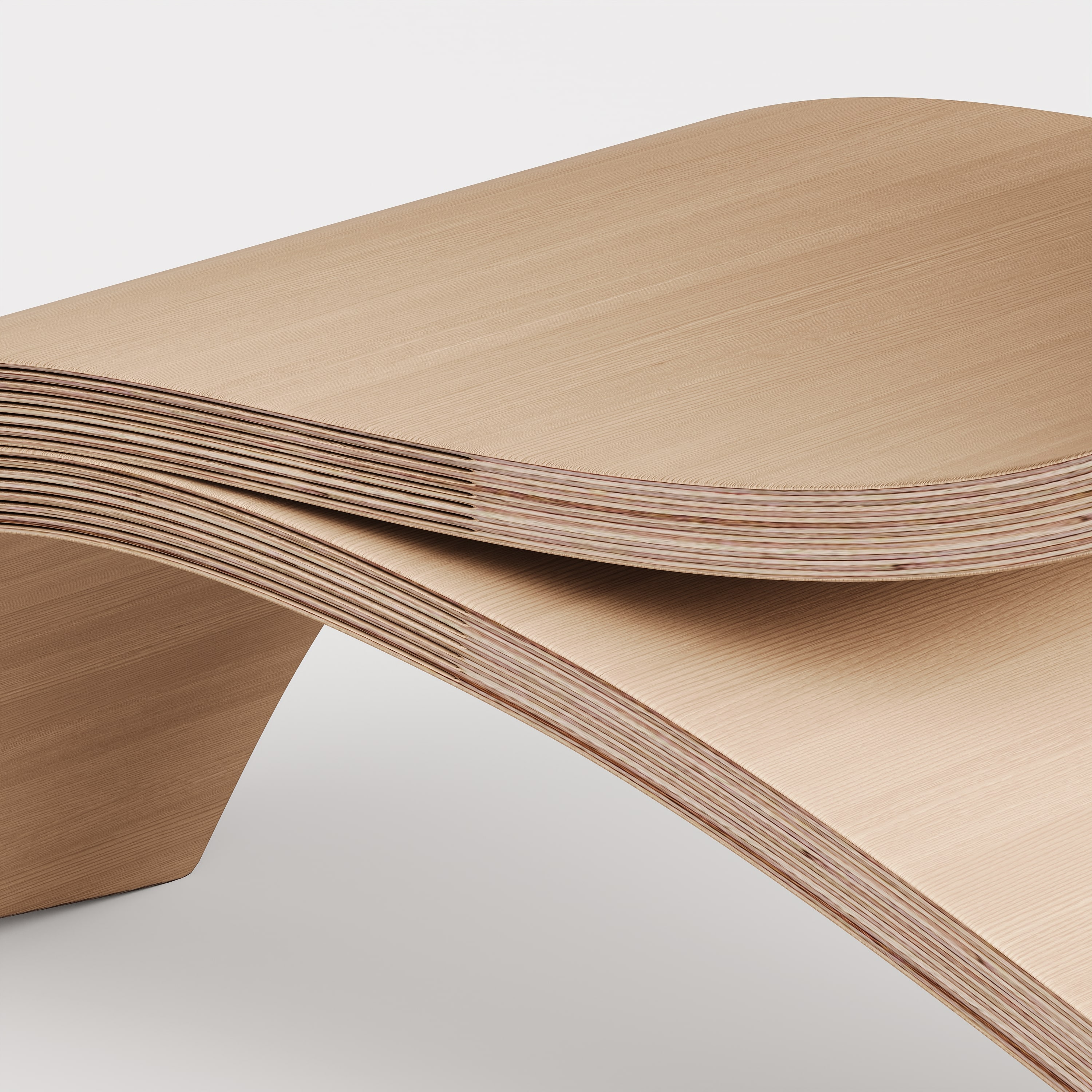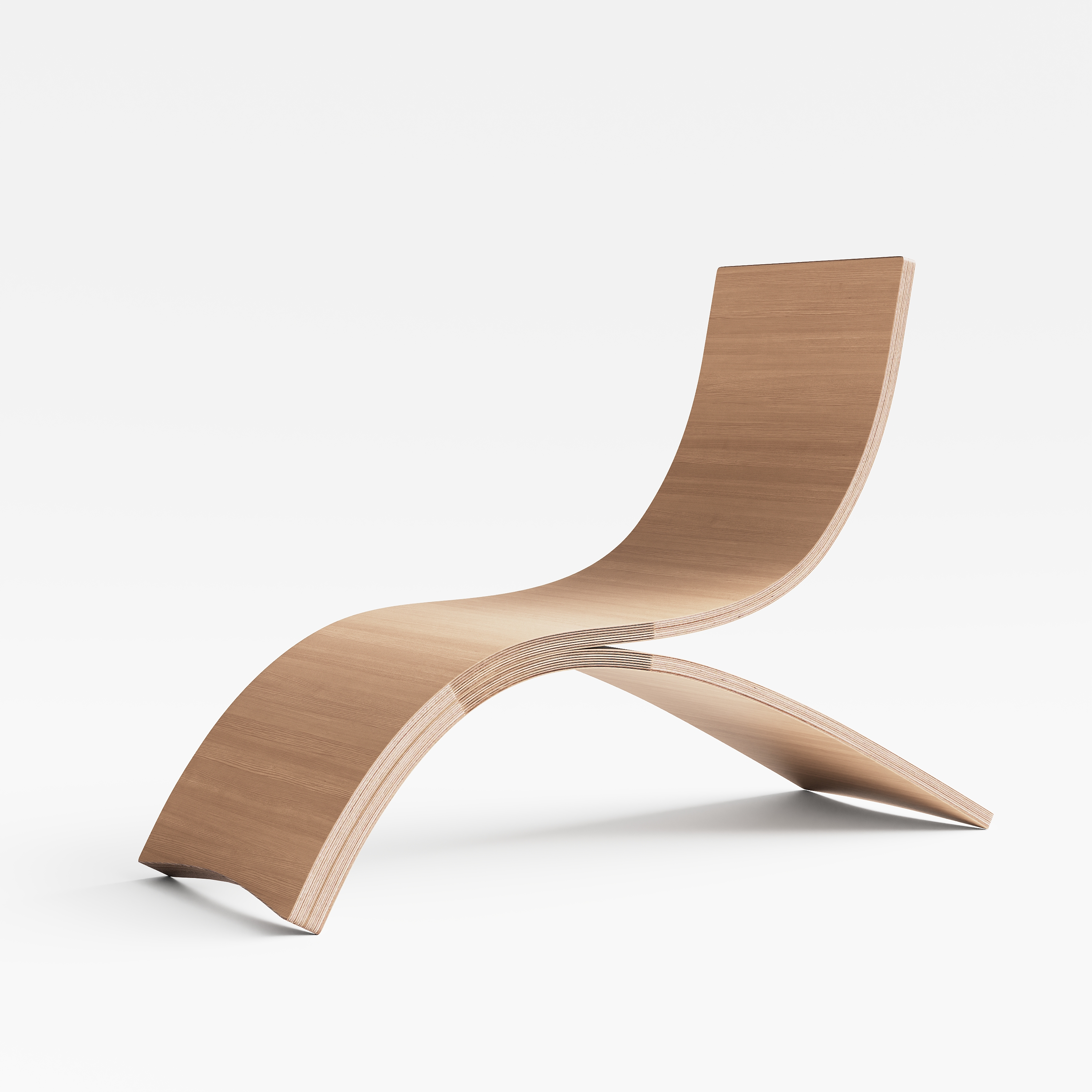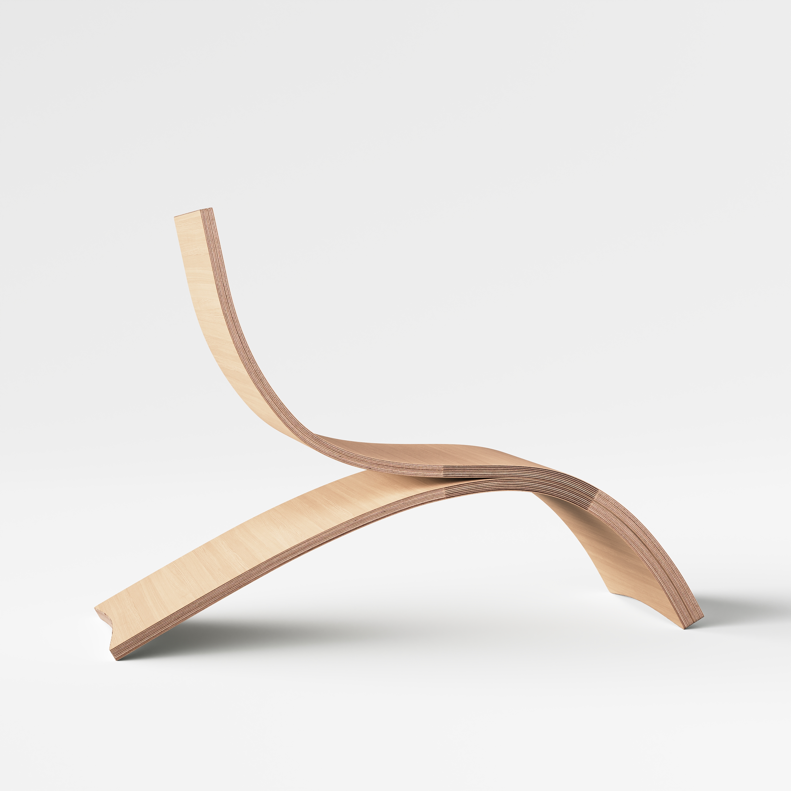We use Laminated Veneer Lumber (LVL) to make this chair, utilizing market scraps to reduce waste. LVL is made of multiple layers of thin veneer produced by rotary peeling, allowing for a seamless and uniform arch design. By taking advantage of wood’s anisotropic properties—where wood fibers expand and contract differently with changes in humidity—we bend thin pieces of wood around a form and then glue them tightly to hold their shape. This highlights the simplicity and elegance of our chair while emphasizing sustainability and efficient use of materials.
