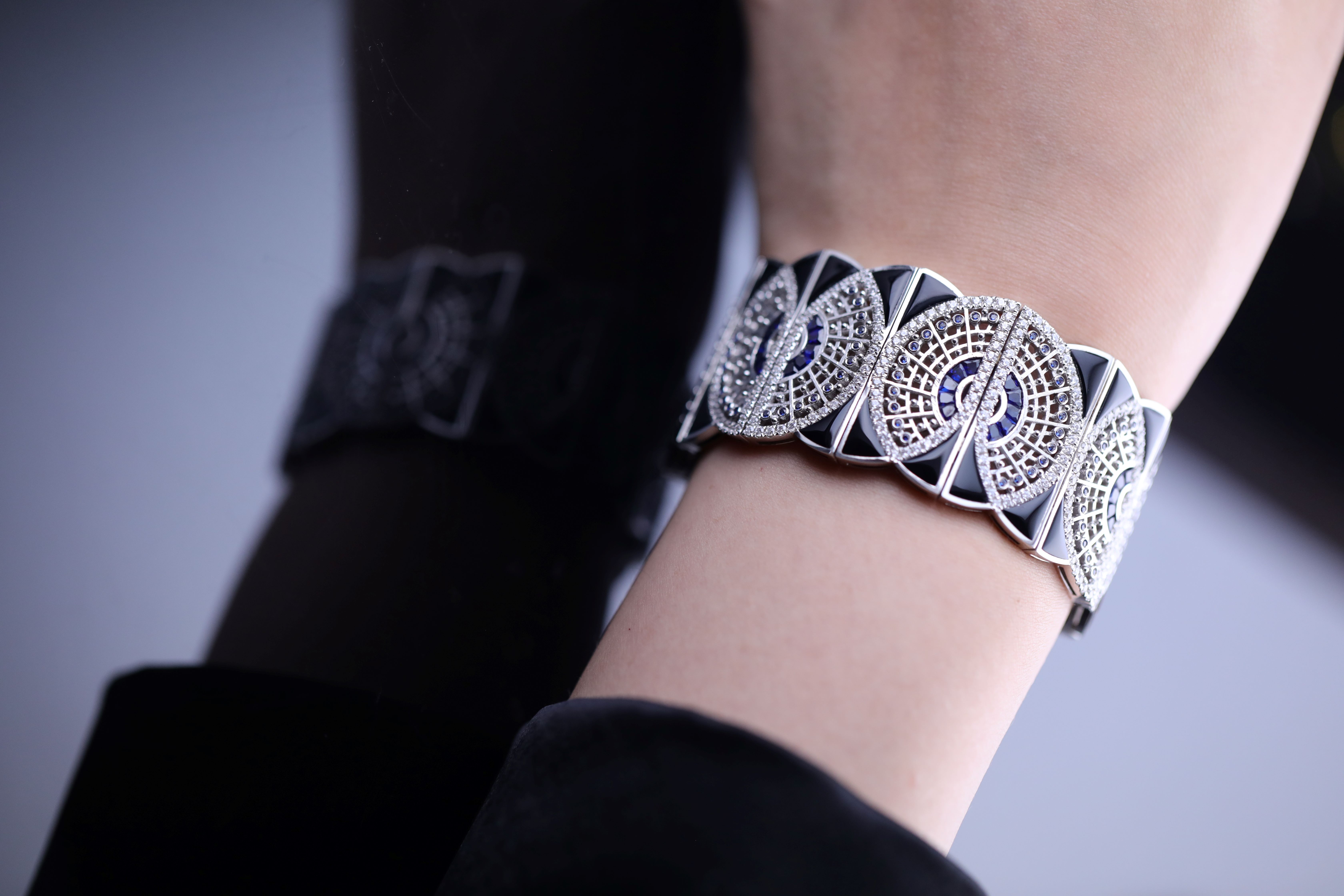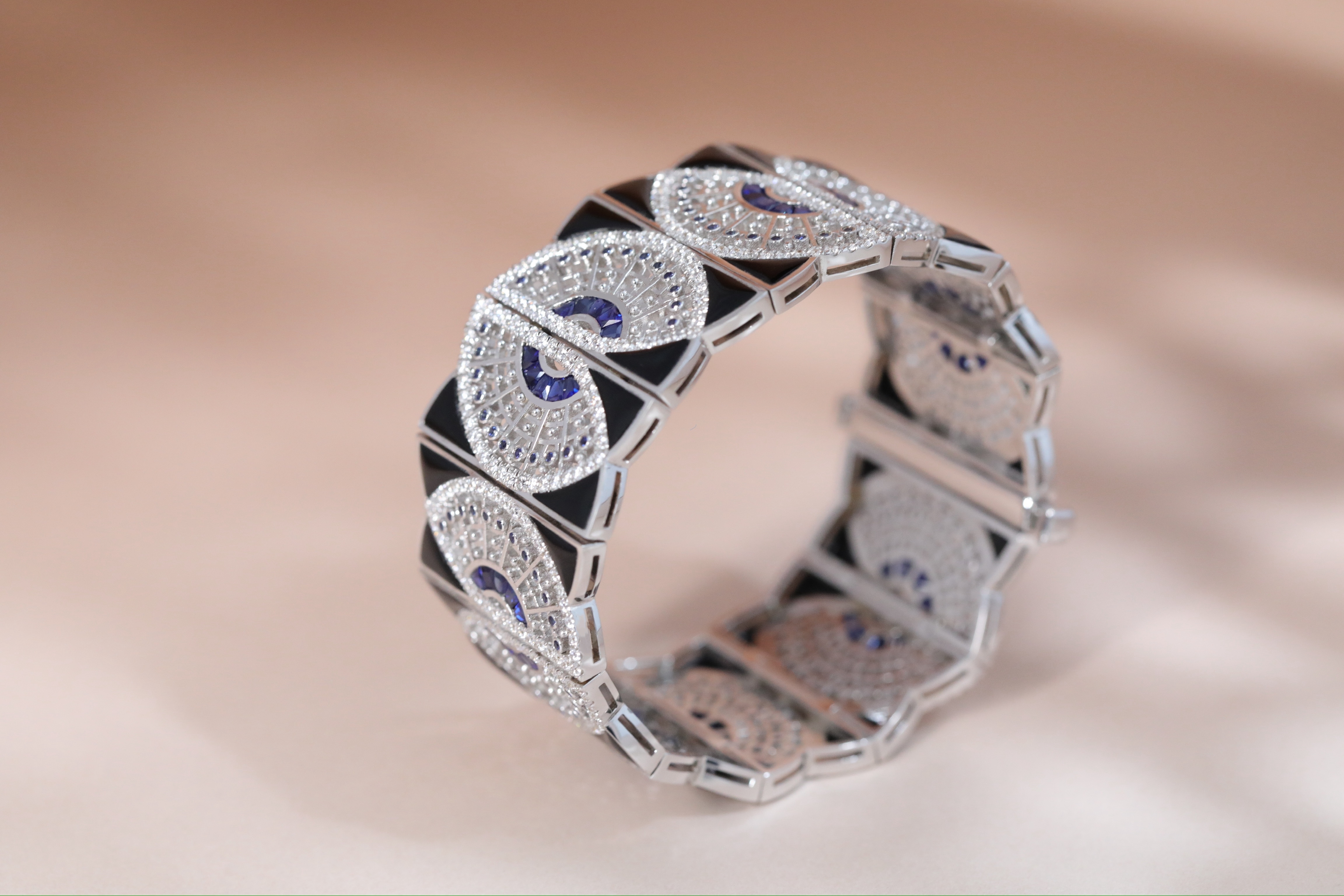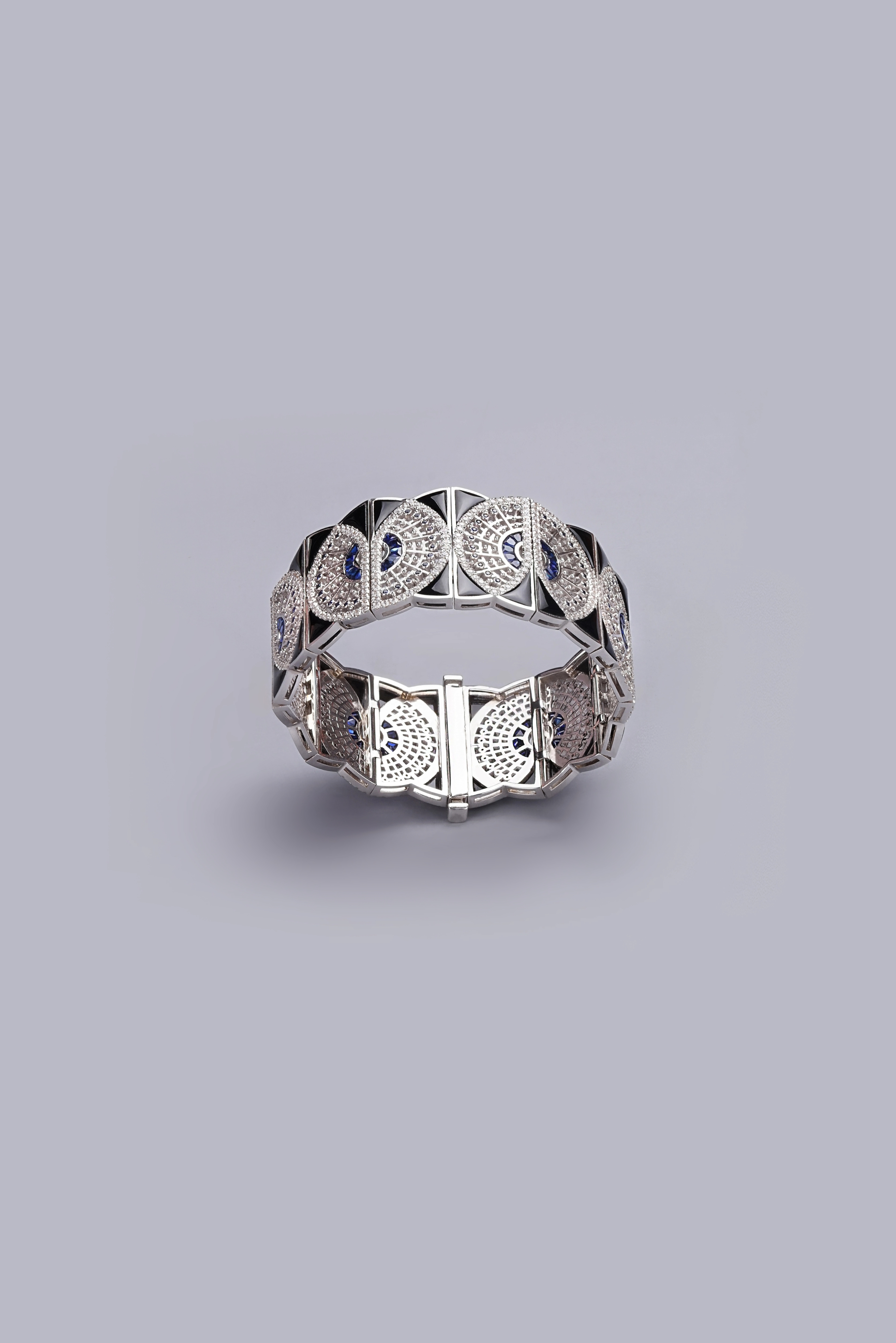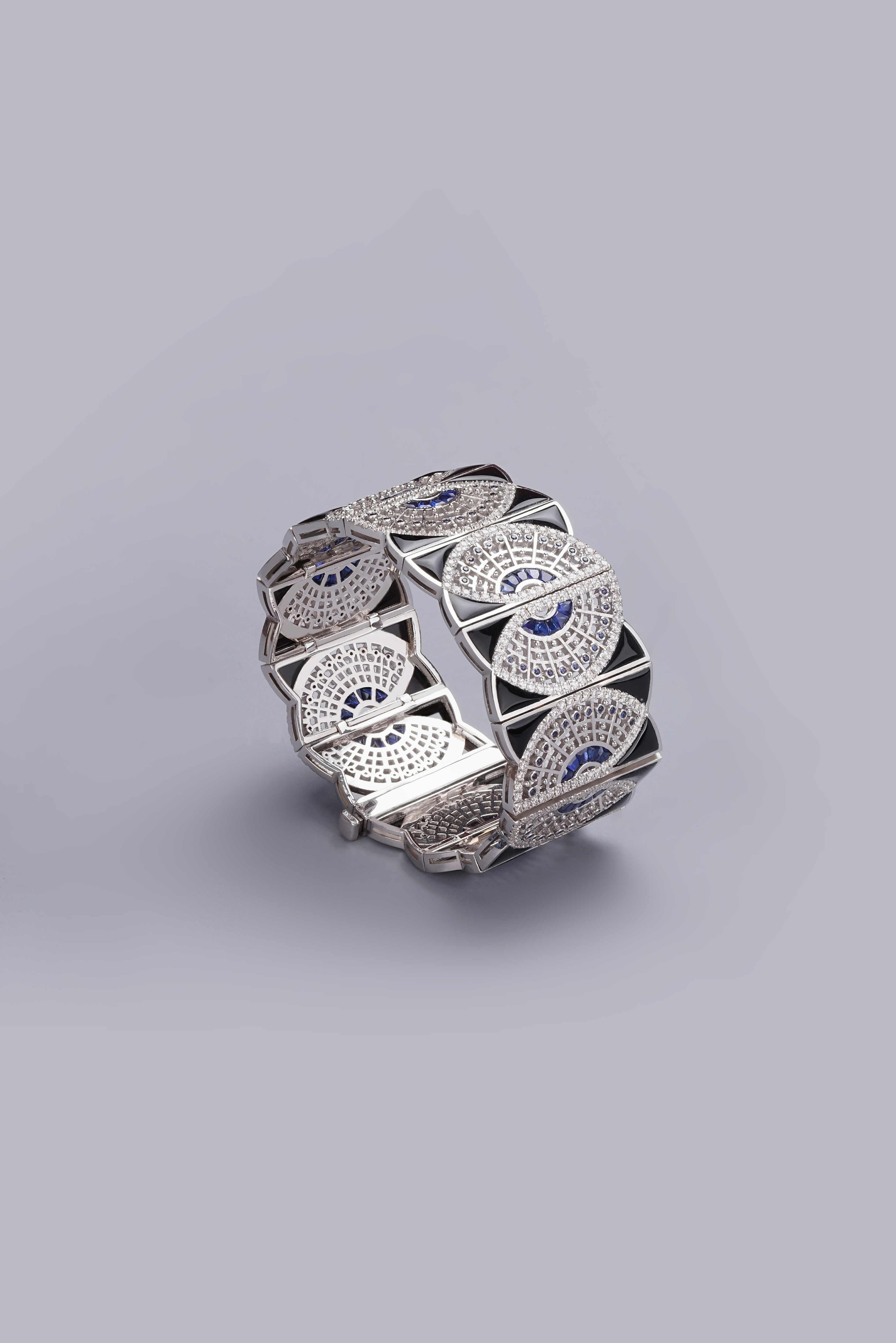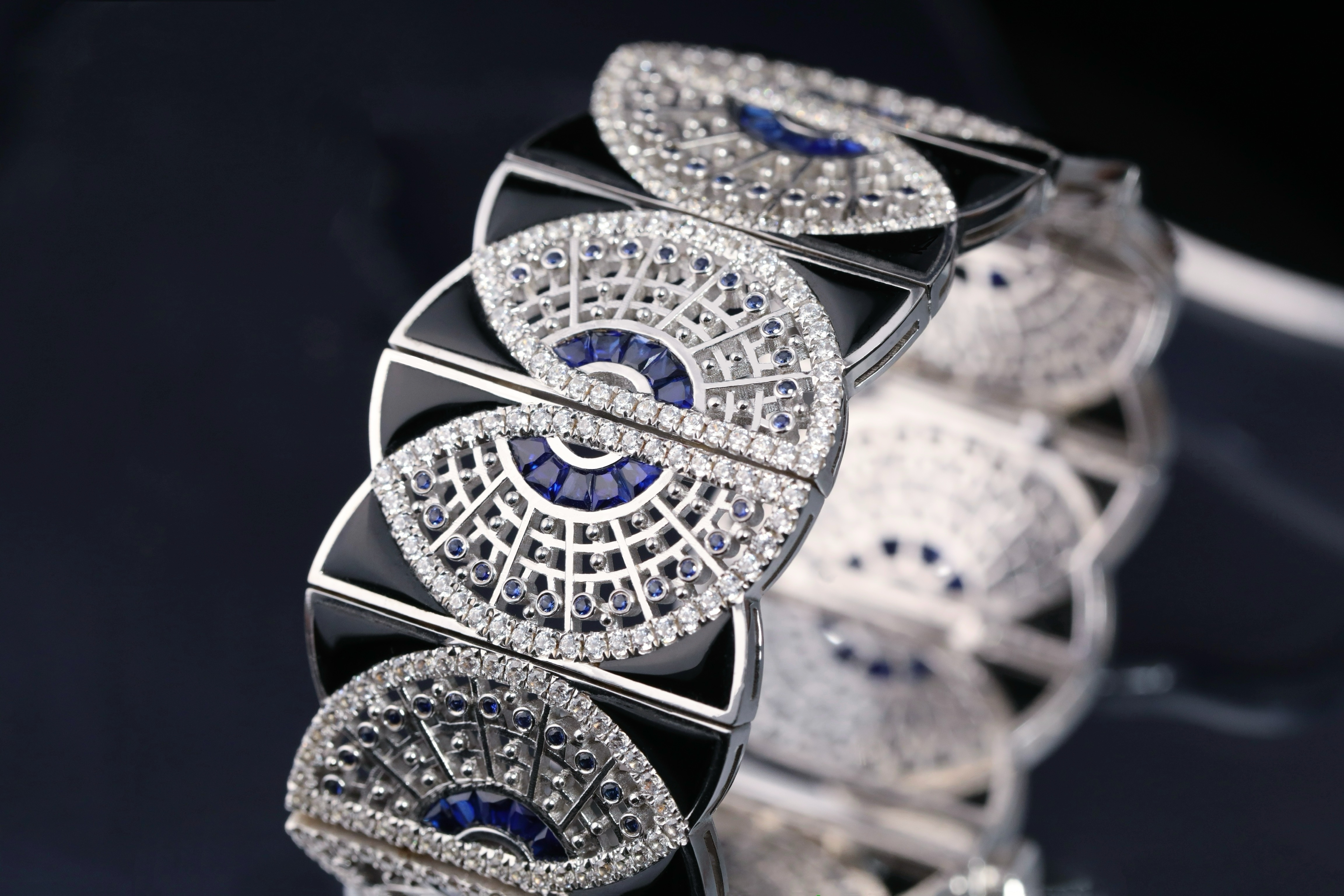 Material selection plays a crucial role in bringing the bracelet's design to life. High-quality black onyx, white diamonds, and sapphires are carefully chosen to symbolize different elements of the Bohemian world. The deep, mysterious black onyx represents the night sky, exuding a sense of calm and stability. The brilliant white diamonds, shining like the brightest stars, symbolize guidance and direction, while the cool, serene sapphires reflect the moonlit rivers of the Bohemian landscape, adding a touch of mystery and depth.