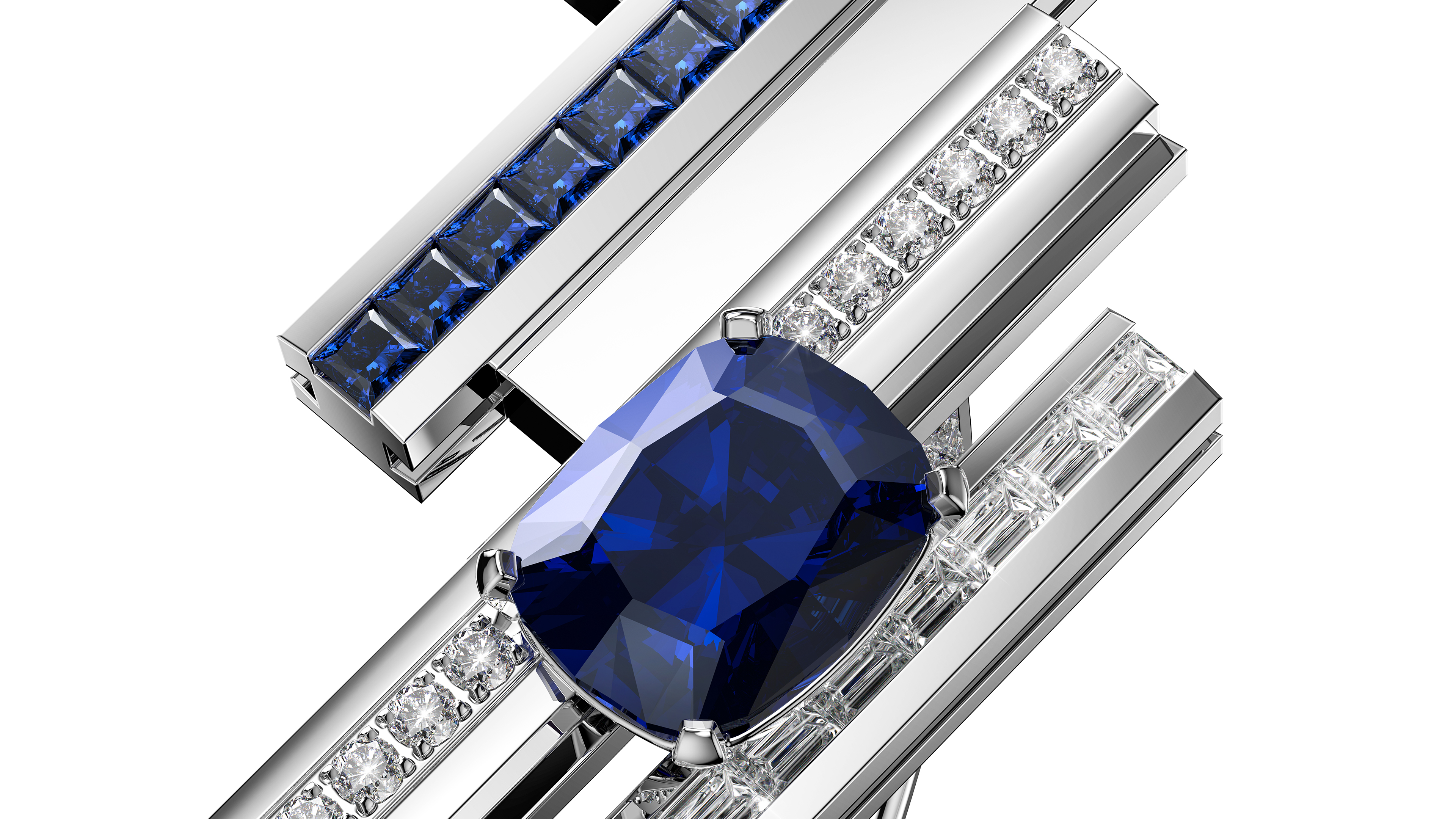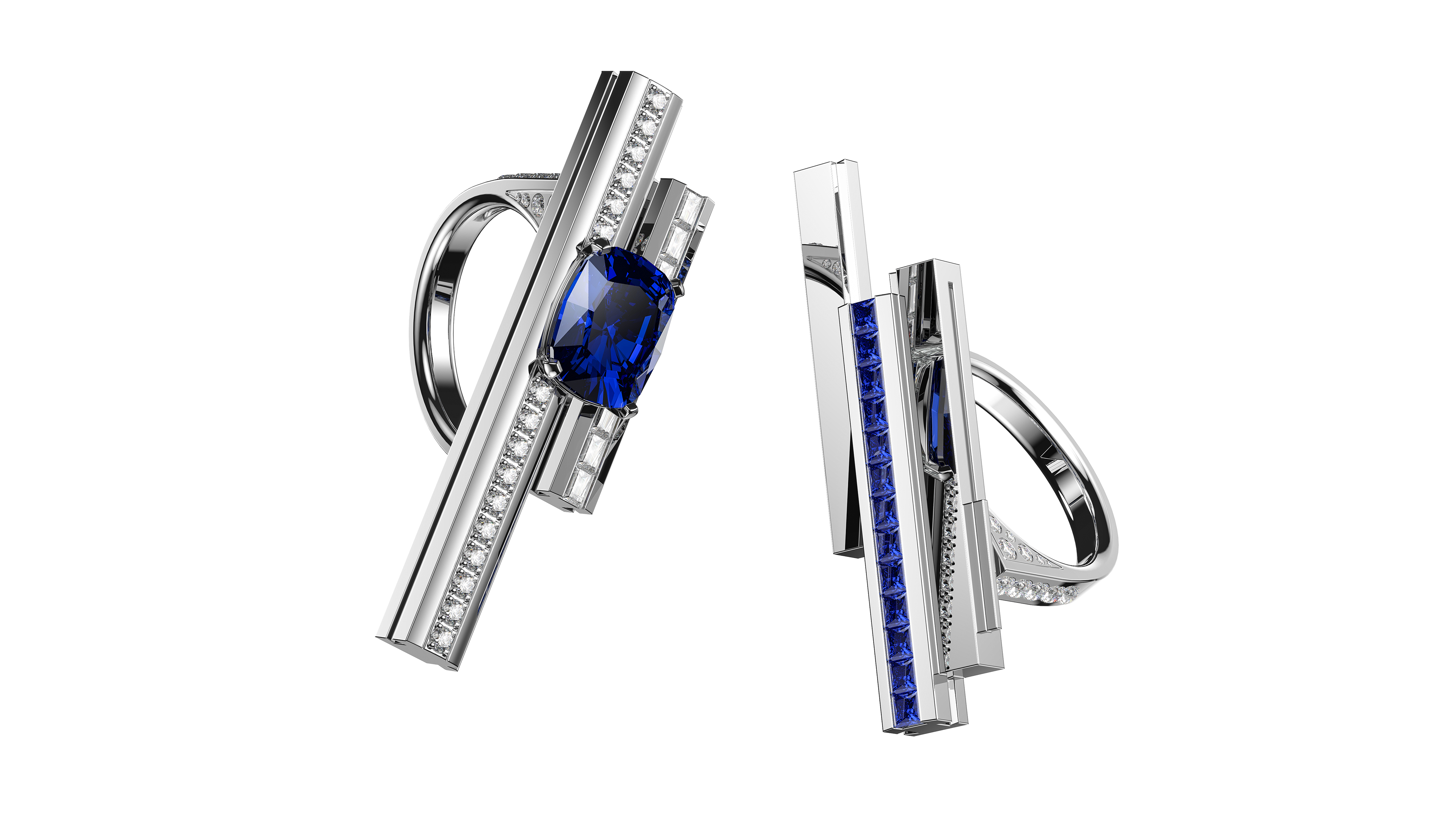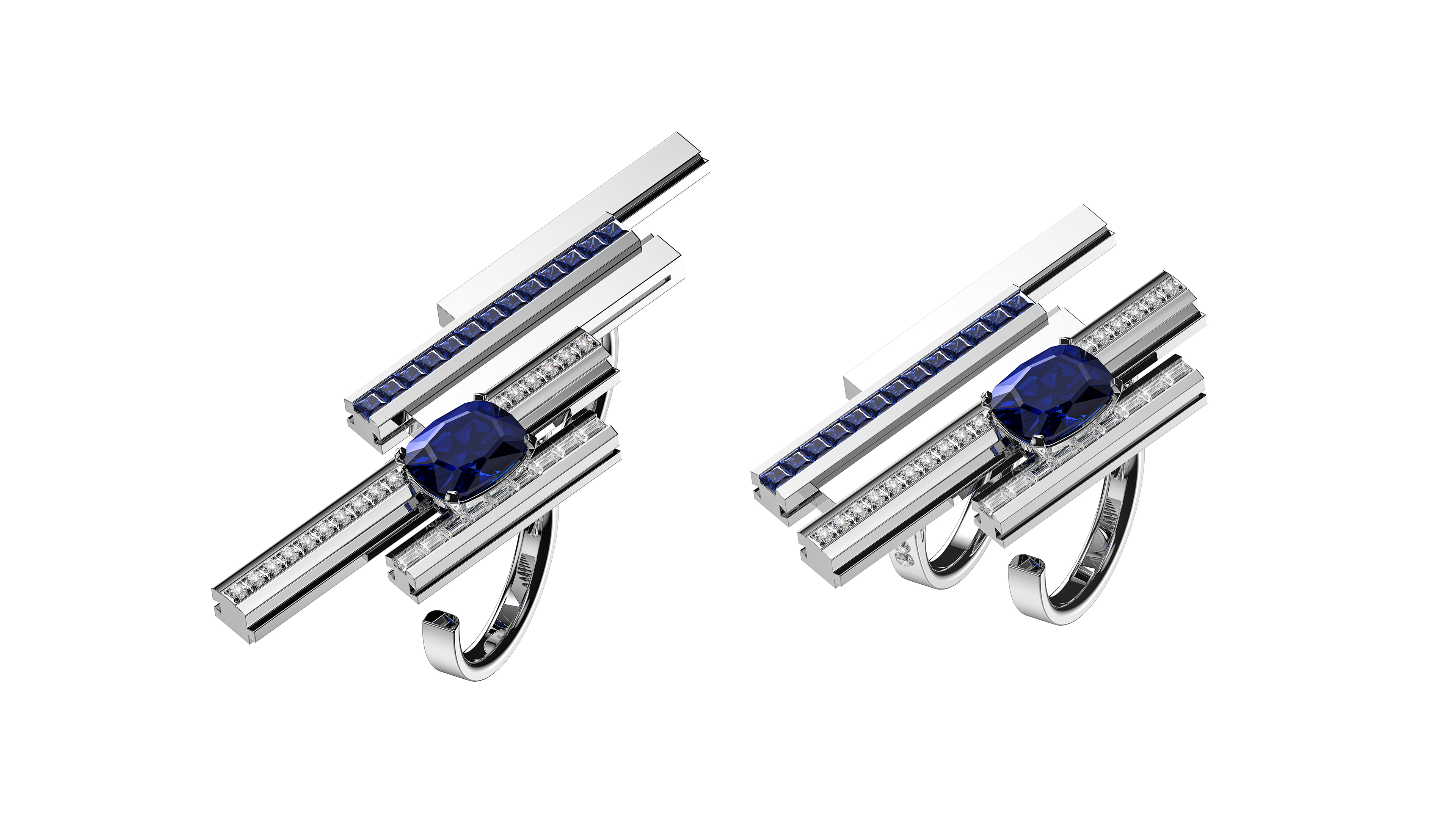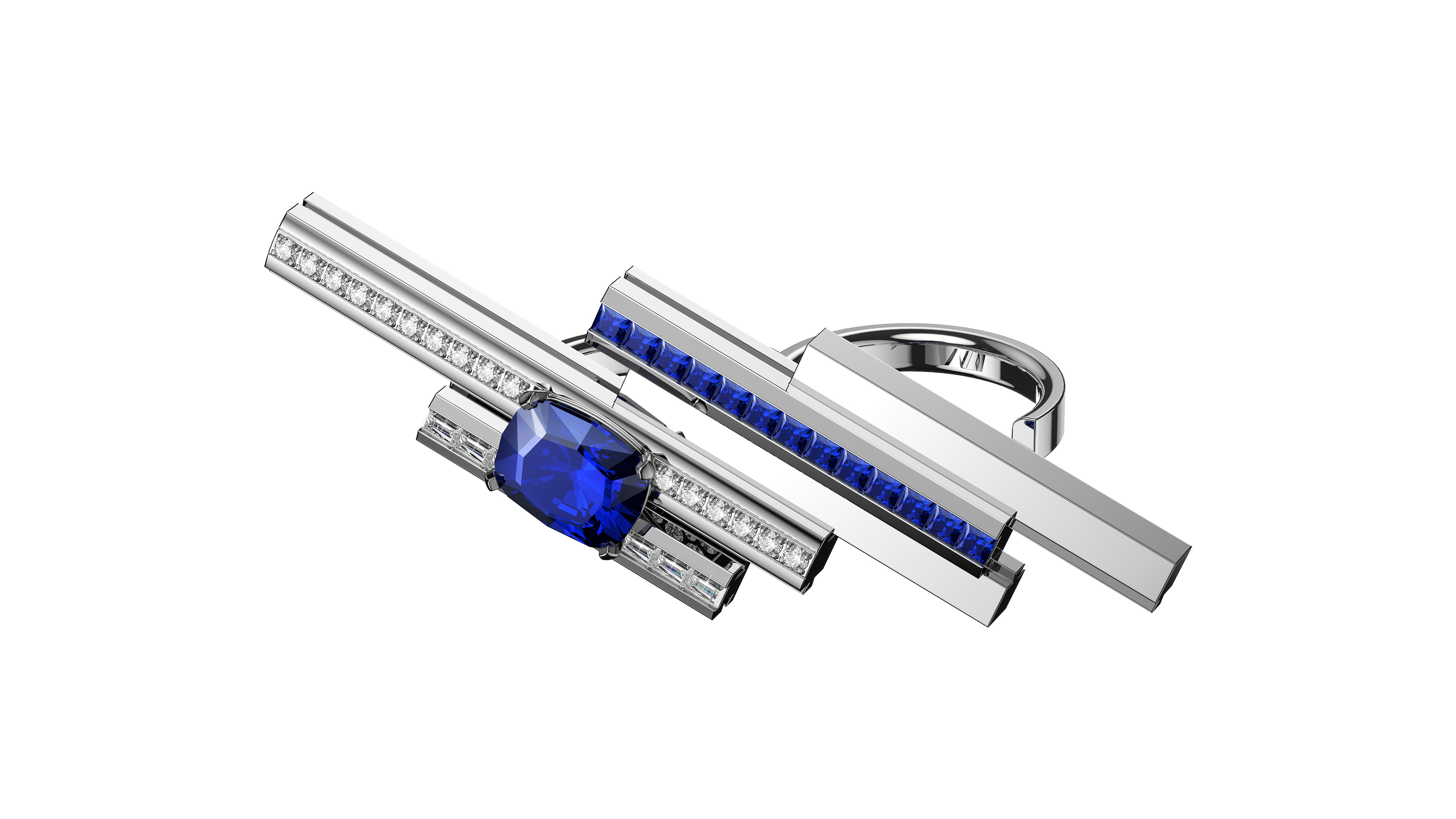 The ring features a minimalist rectangular structure as its main design element, characterized by smooth lines and an elegant shape. The set gemstones sparkle brilliantly and blend seamlessly with the metal, showcasing the simplicity of modern design while retaining the refinement and craftsmanship of traditional techniques. In addition, the ring's use of three different forms of gemstones, interspersed with diamonds, adds a touch of luxury and mystery to the overall design. The combination of sapphire and 18K white gold further accentuates a sense of elegance and luxury.