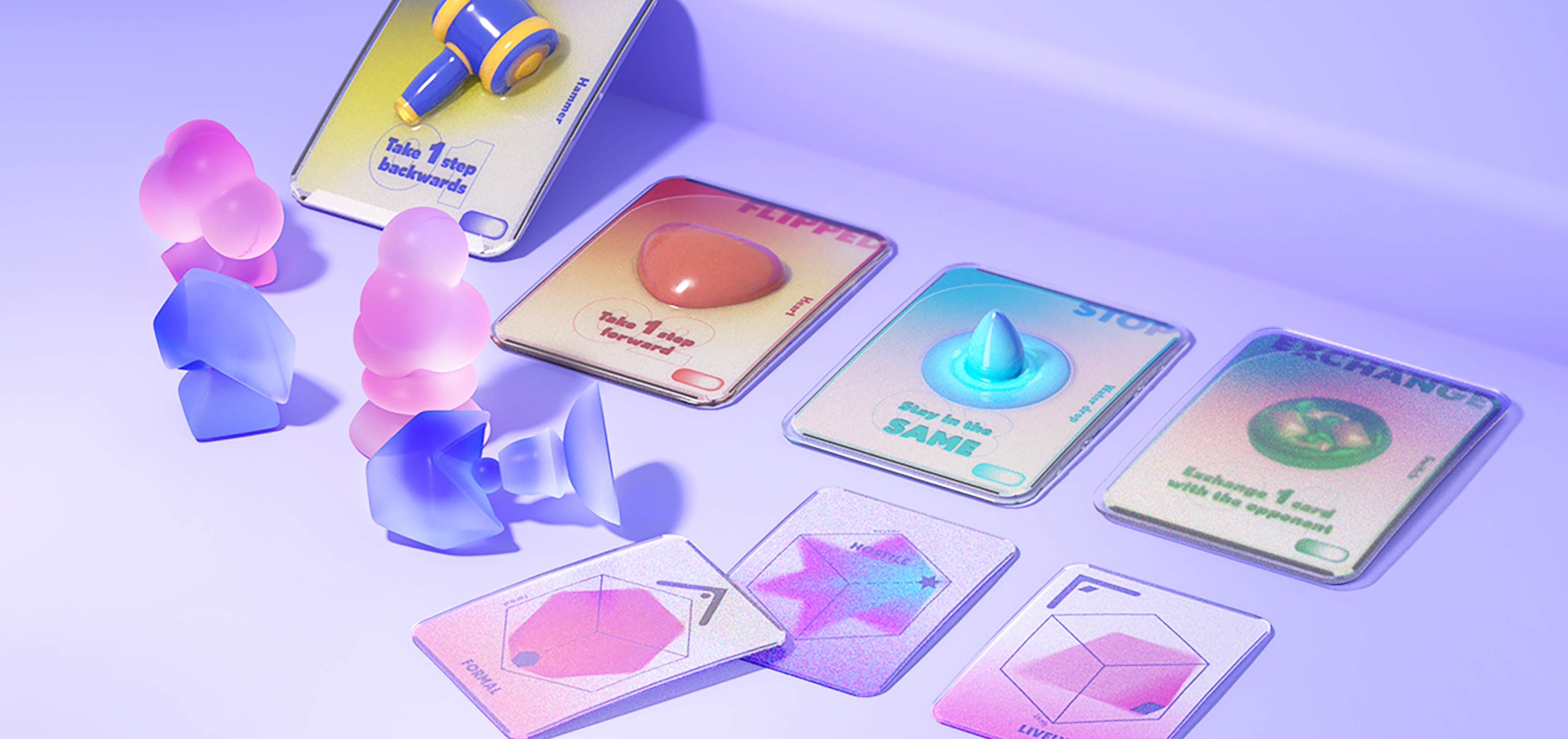 Part 2 features two sets of pieces, six movement cards, and item cards. It's for post-argument or conflict analysis, where players select starting positions representing their interpretations of the conflict. They navigate using movement cards, aiming to understand each other's thoughts, and win by reaching the opponent's position.