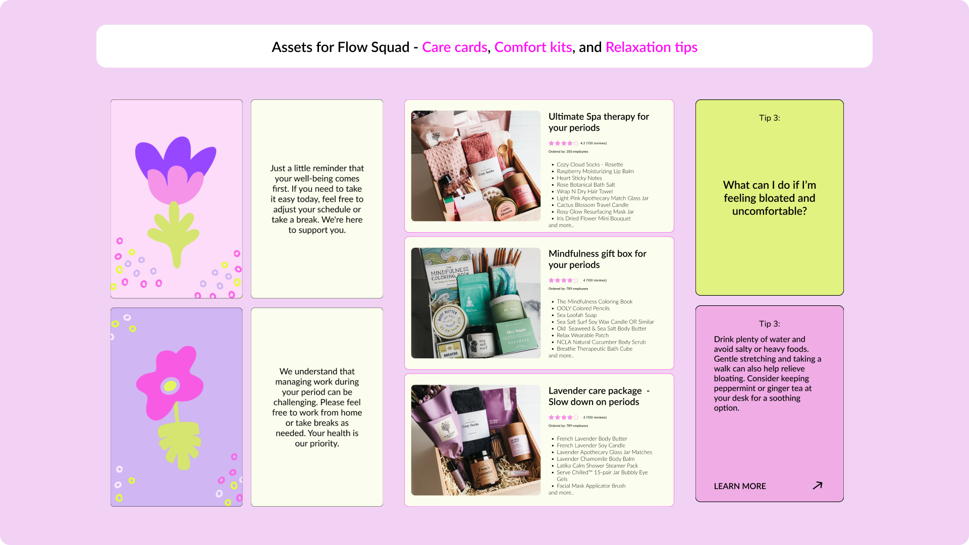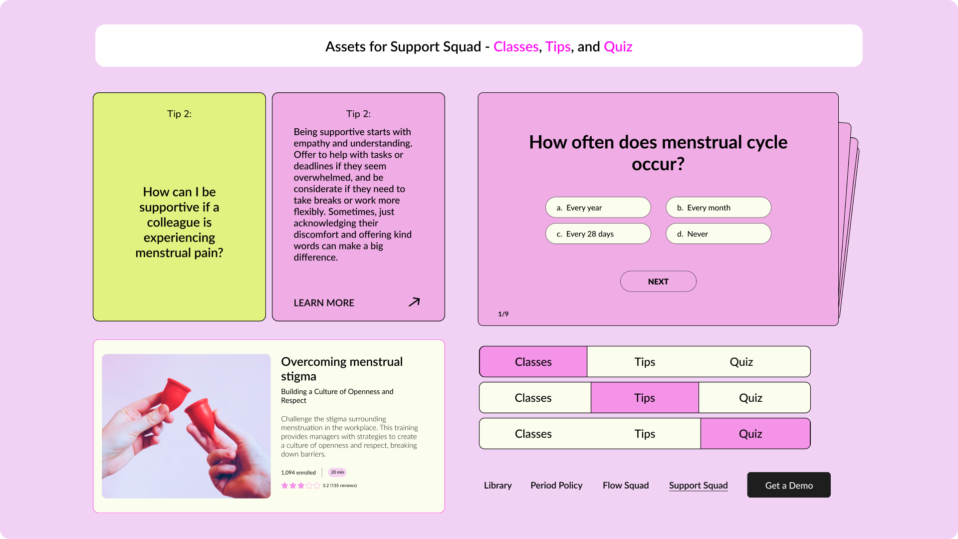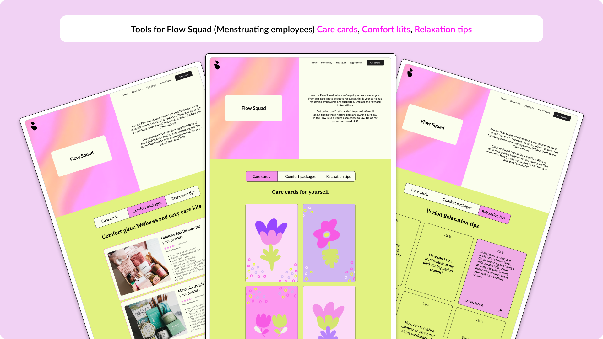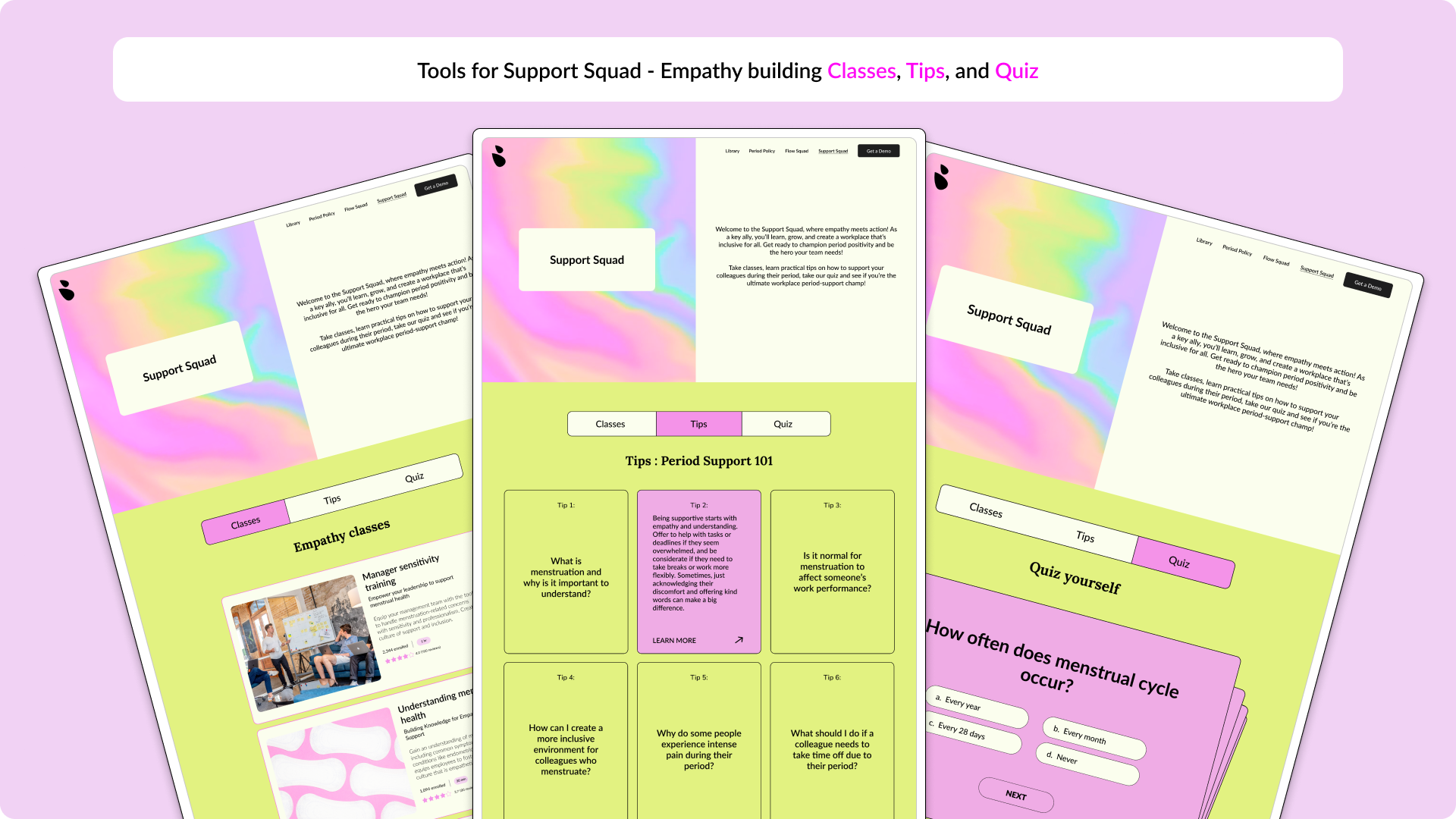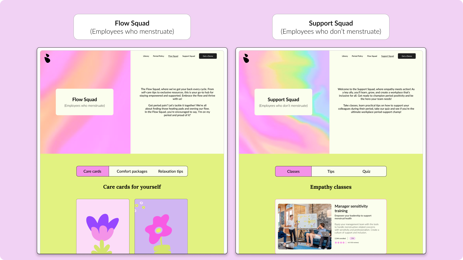 The platform is divided into two key areas: Flow Squad and Support Squad. Flow Squad caters to those who menstruate, offering features like Care Cards, Comfort Kits, and Relaxation Tips to enhance their well-being. Support Squad is designed for non-menstruating employees and includes Empathy Building Classes, practical Tips and Answers to better understand and support their menstruating colleagues, and a Quiz to reinforce their learning.