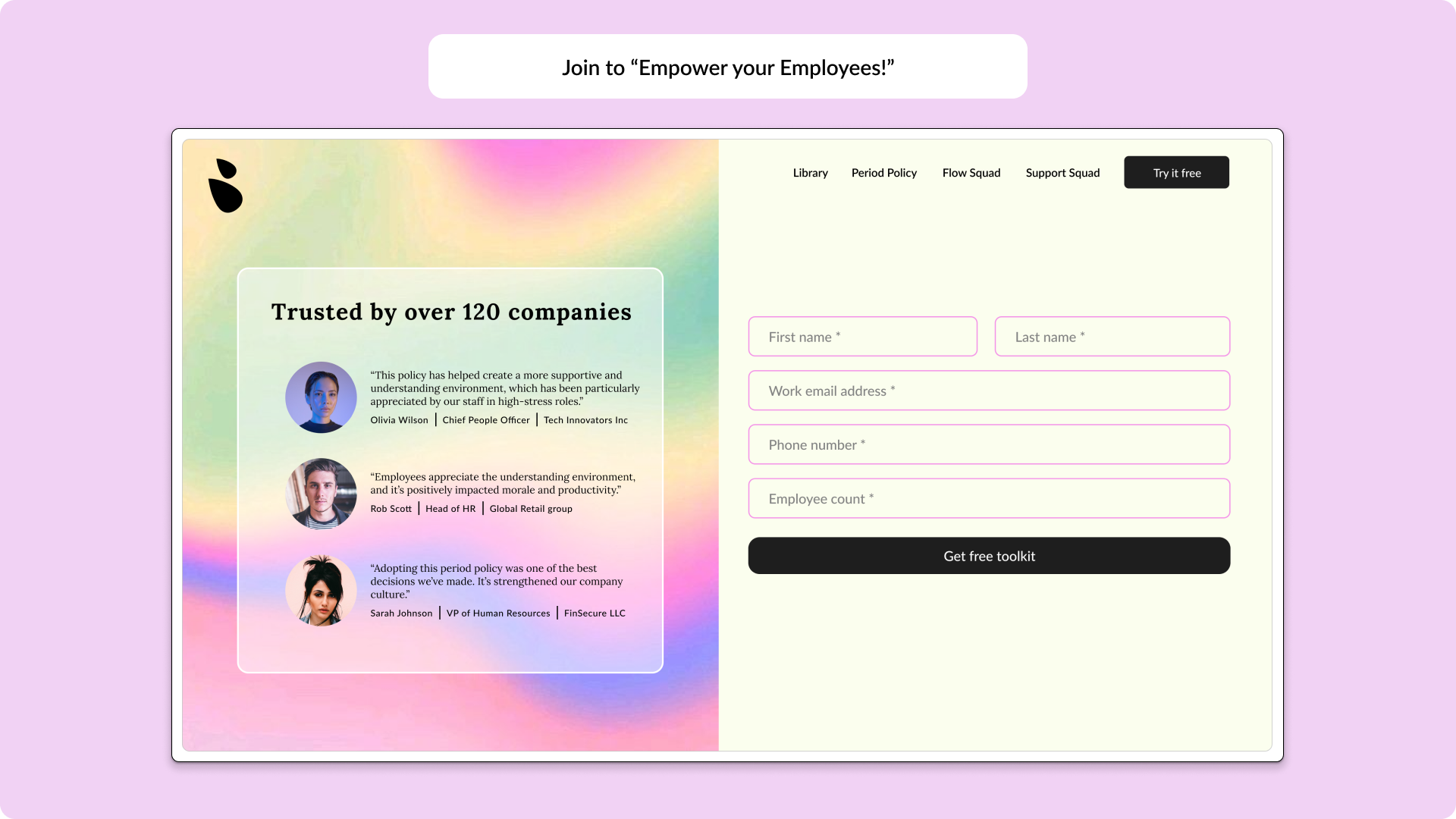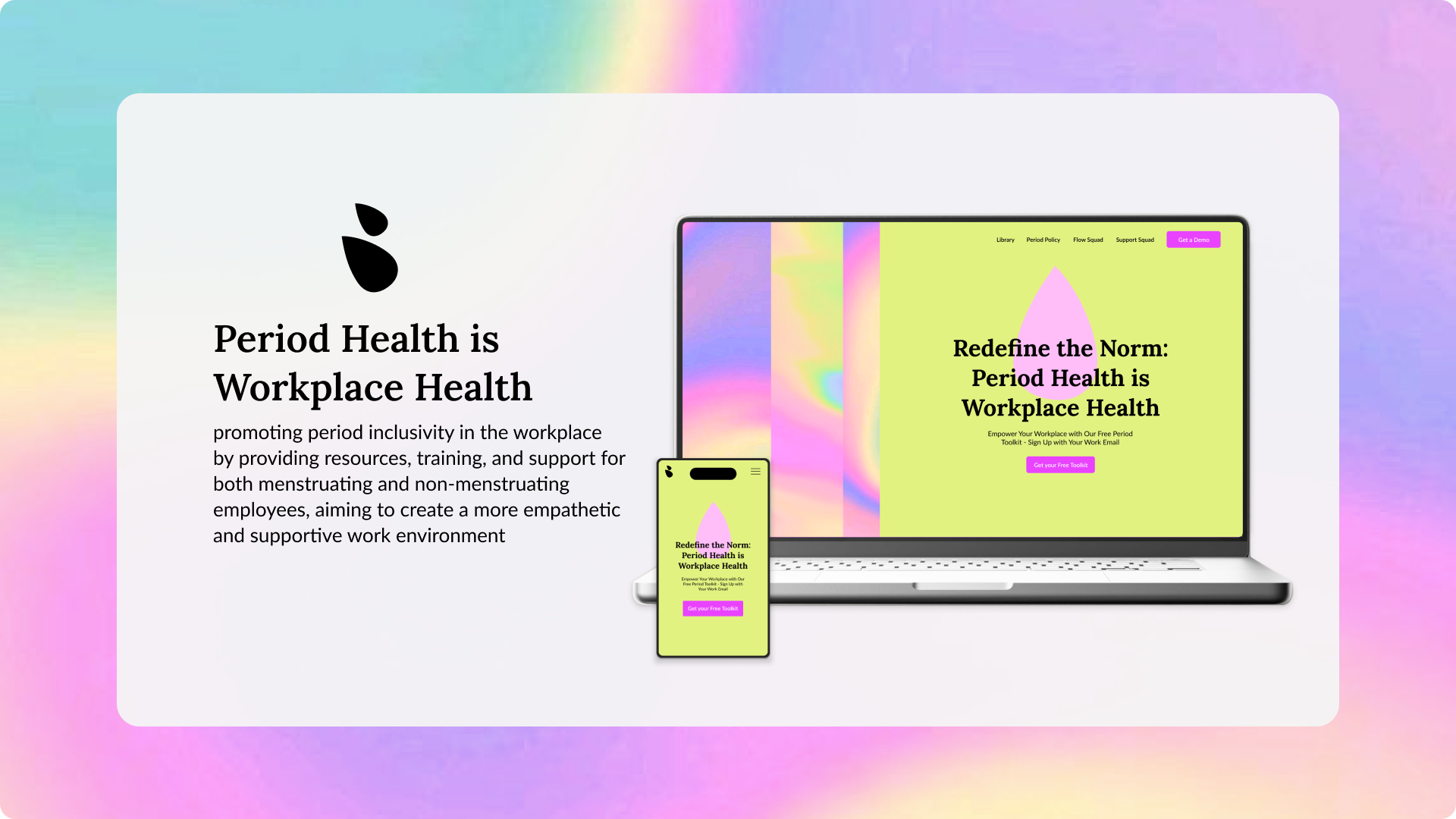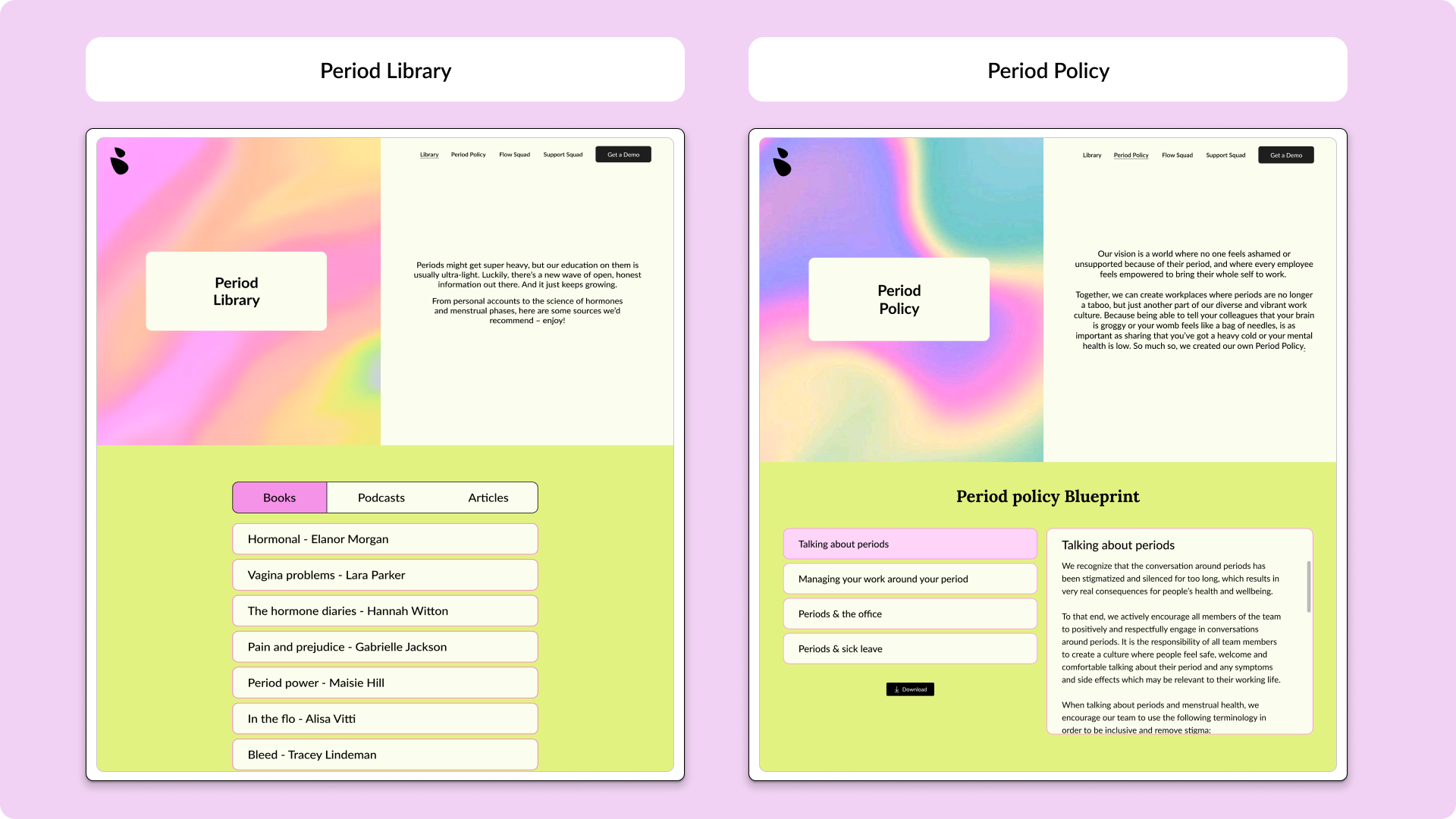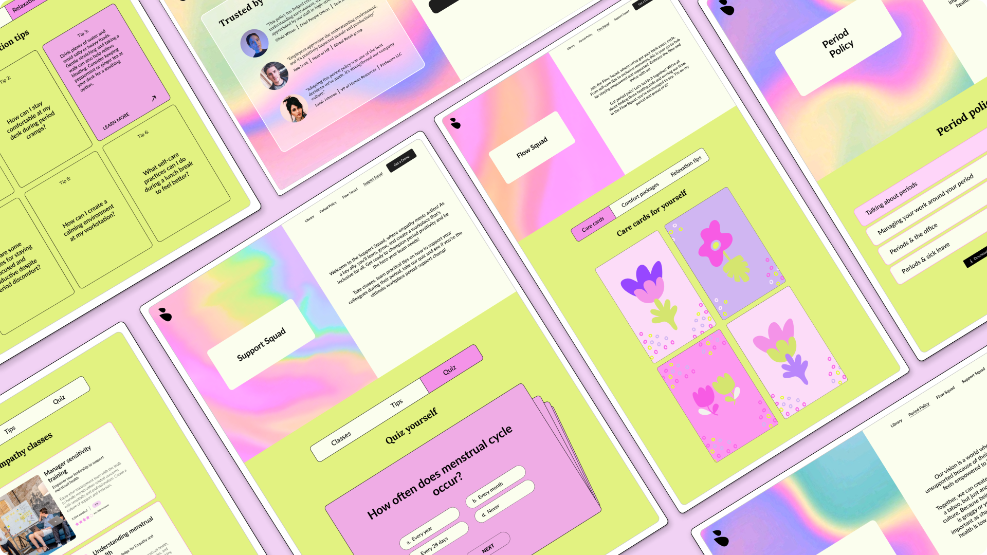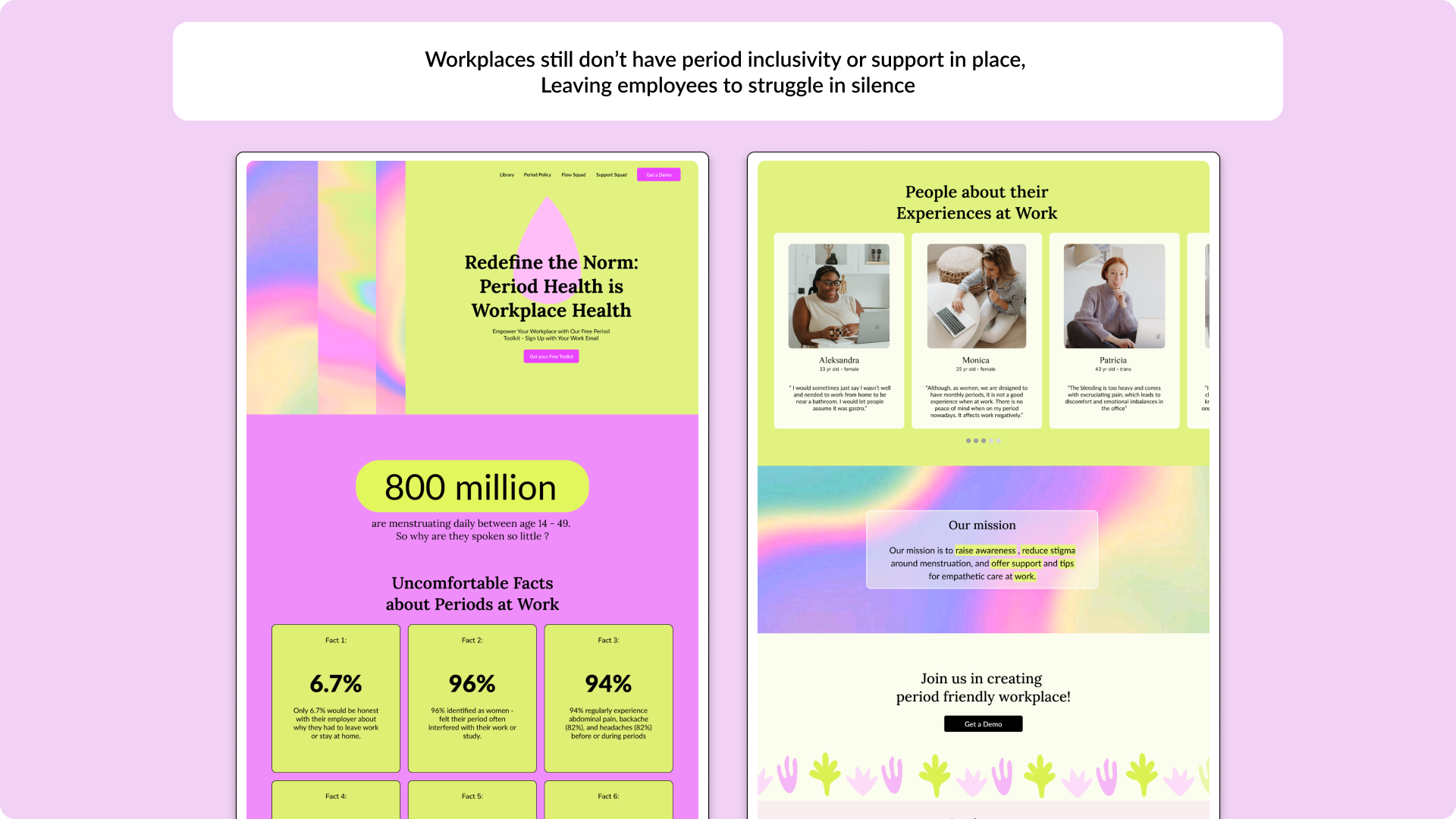 For the design of this platform, I chose a vibrant palette of fluorescent yellow, light pink, and cream to create an uplifting and inclusive atmosphere. These colors break away from the traditional red and orange often associated with periods, allowing the design to challenge conventional narratives and reduce stigma. The background images feature abstract representations of flow, symbolizing movement, continuity, and support, aligning with the platform's mission to foster a more empathetic and forward-thinking workplace environment. This approach ensures that the visuals are both engaging and welcoming, resonating with a broad audience while maintaining a fresh, modern aesthetic.