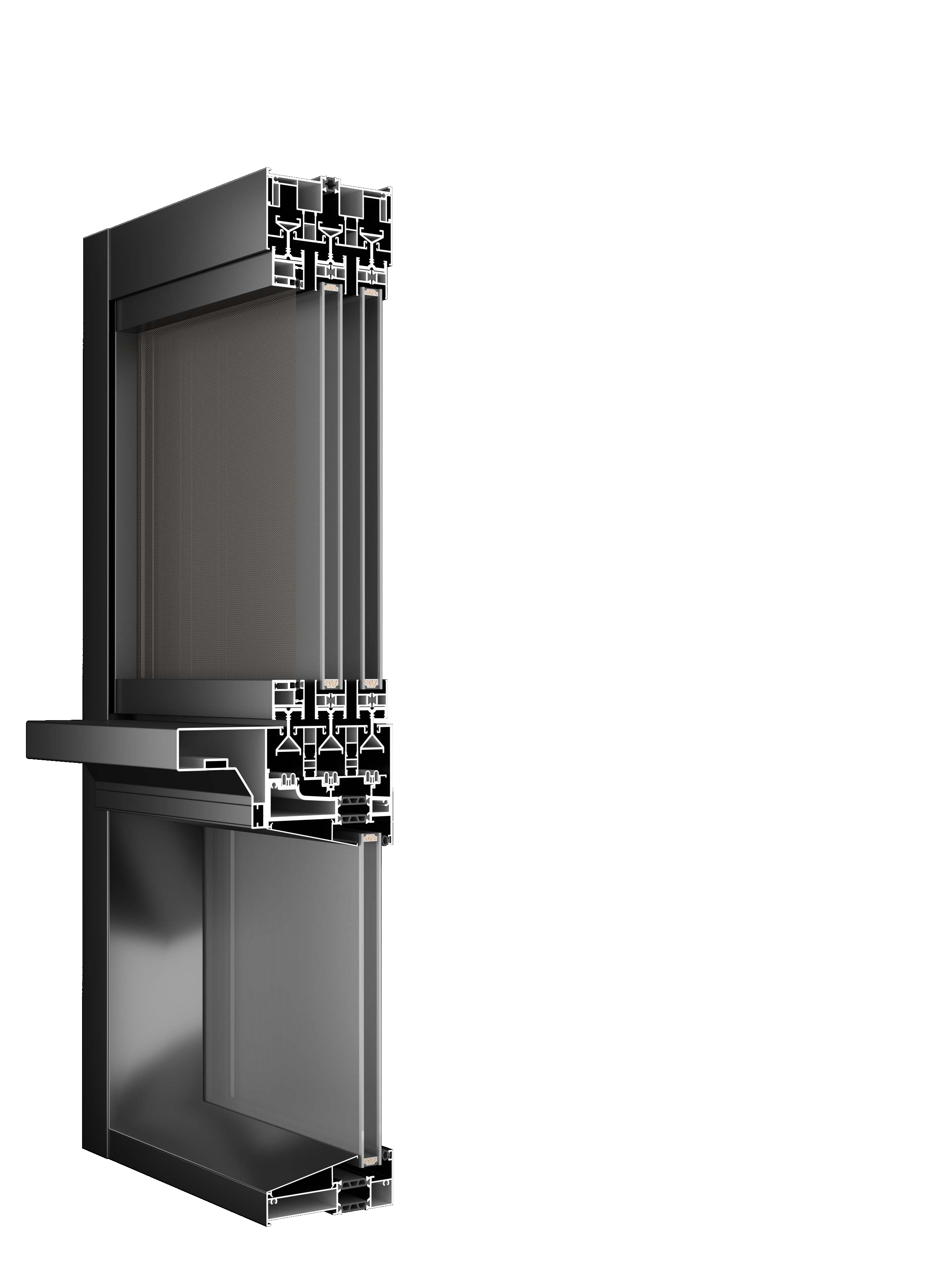 Multiple cavity structure improves heat insulation performance.6063-T5 virgin aluminium alloy (wall thickness 3.5mm), The stressed positions are thickened for processing, remaining stable in wind and rain. Fixed sash and glass sash adopt 5+12A+5 large insulating glass to enhance the sound insulation performance. Super large handrail · Track barrier-free design. PA66 national standard nylon heat insulation strip.
