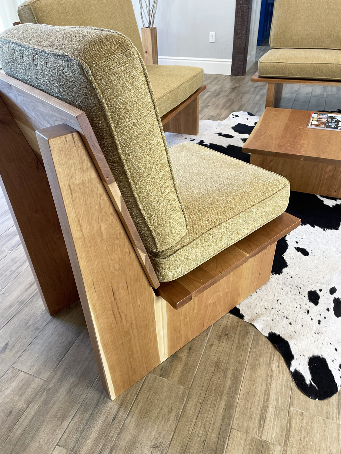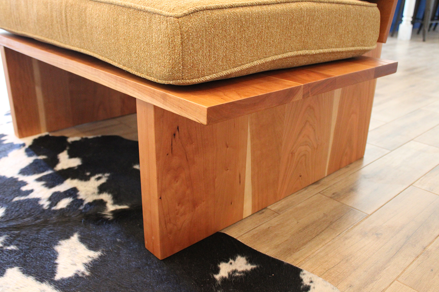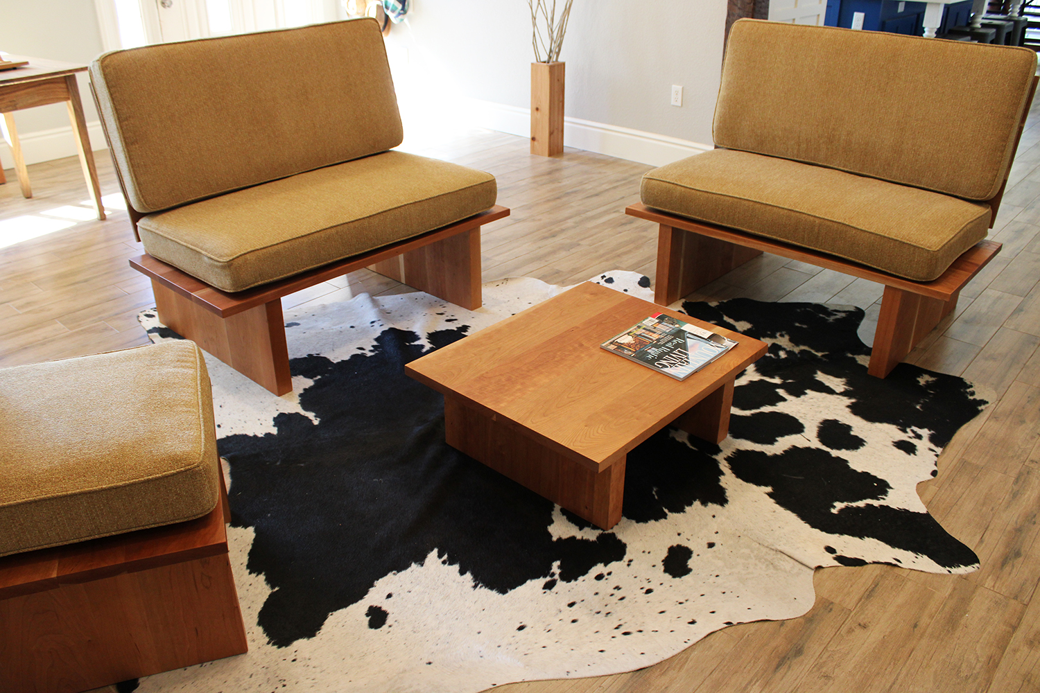 The Felten Collection is a complete living room set inspired by platform sofas and the midcentury modern aesthetic. Built with care and traditional craftsmanship, the set includes two sofas, a chair, and a coffee table. Each piece is crafted from solid American Black Cherry that provides a natural warmth while the design strikes a balance between chunky and elegant, striving to present a refined and highly functional furniture collection. Finished with hand-rubbed oil urethane, the Felten furniture was crafted to provide a lifetime of enjoyment.
