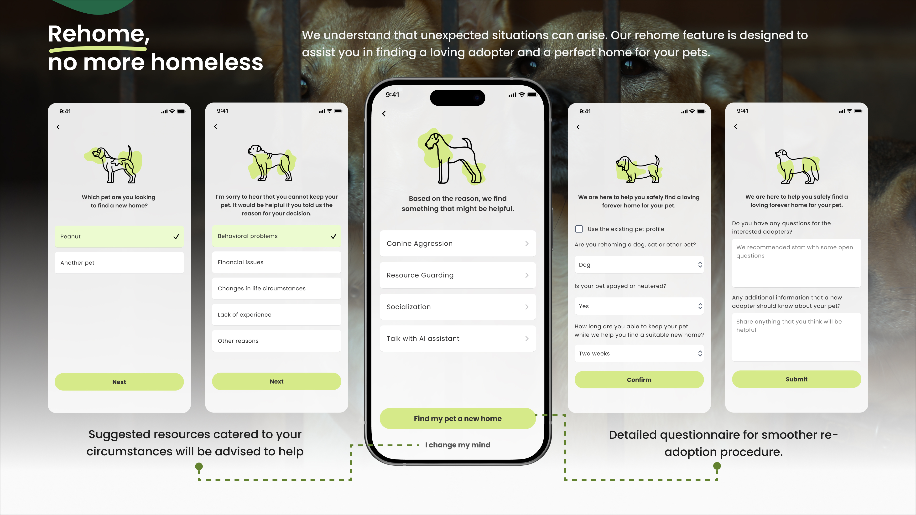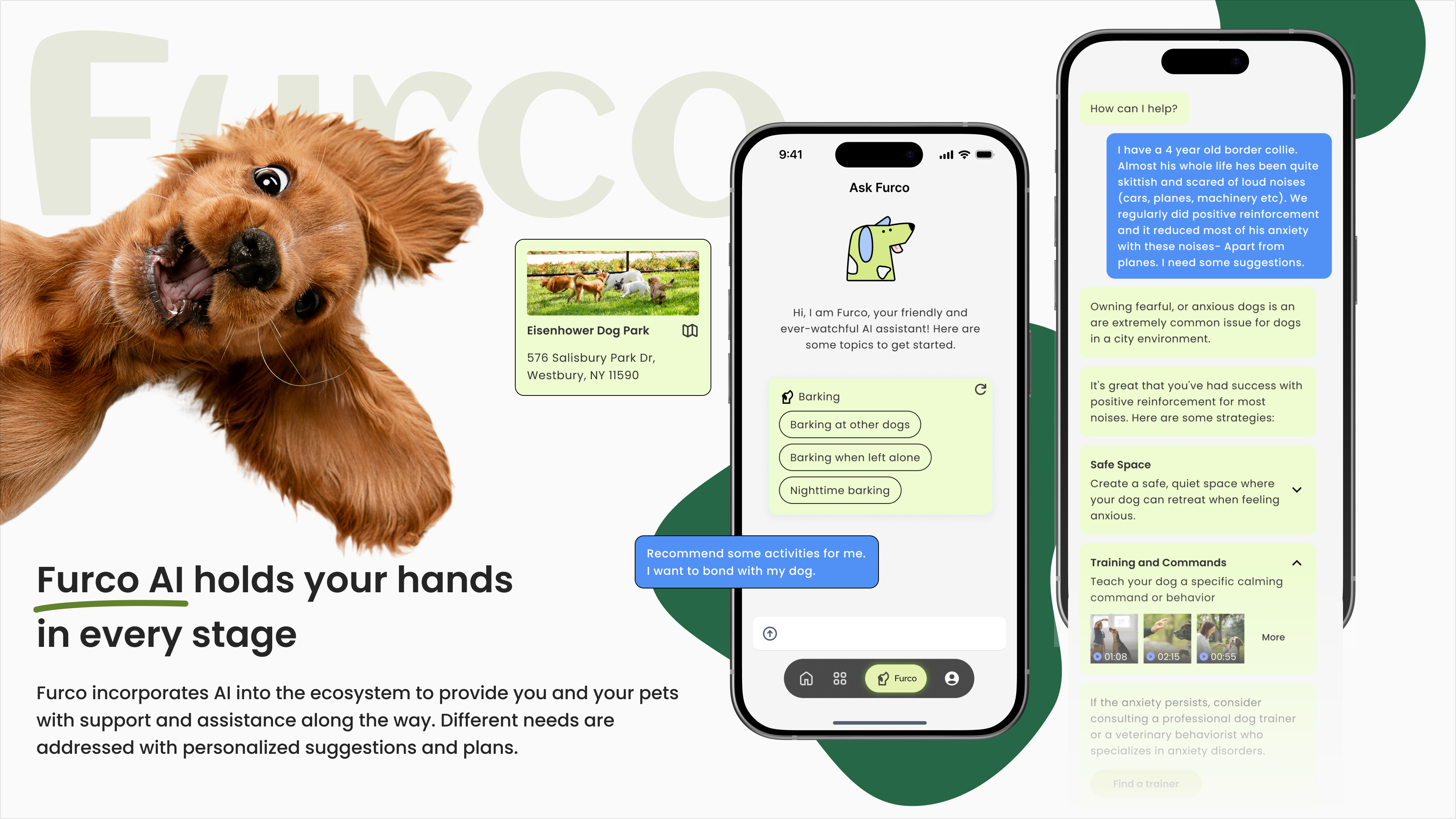 Furco provides a comprehensive, AI-powered platform that simplifies pet care management, makes personalized recommendations, and assists pet owners at every step of their pets' life journeys, including rehoming if necessary.
