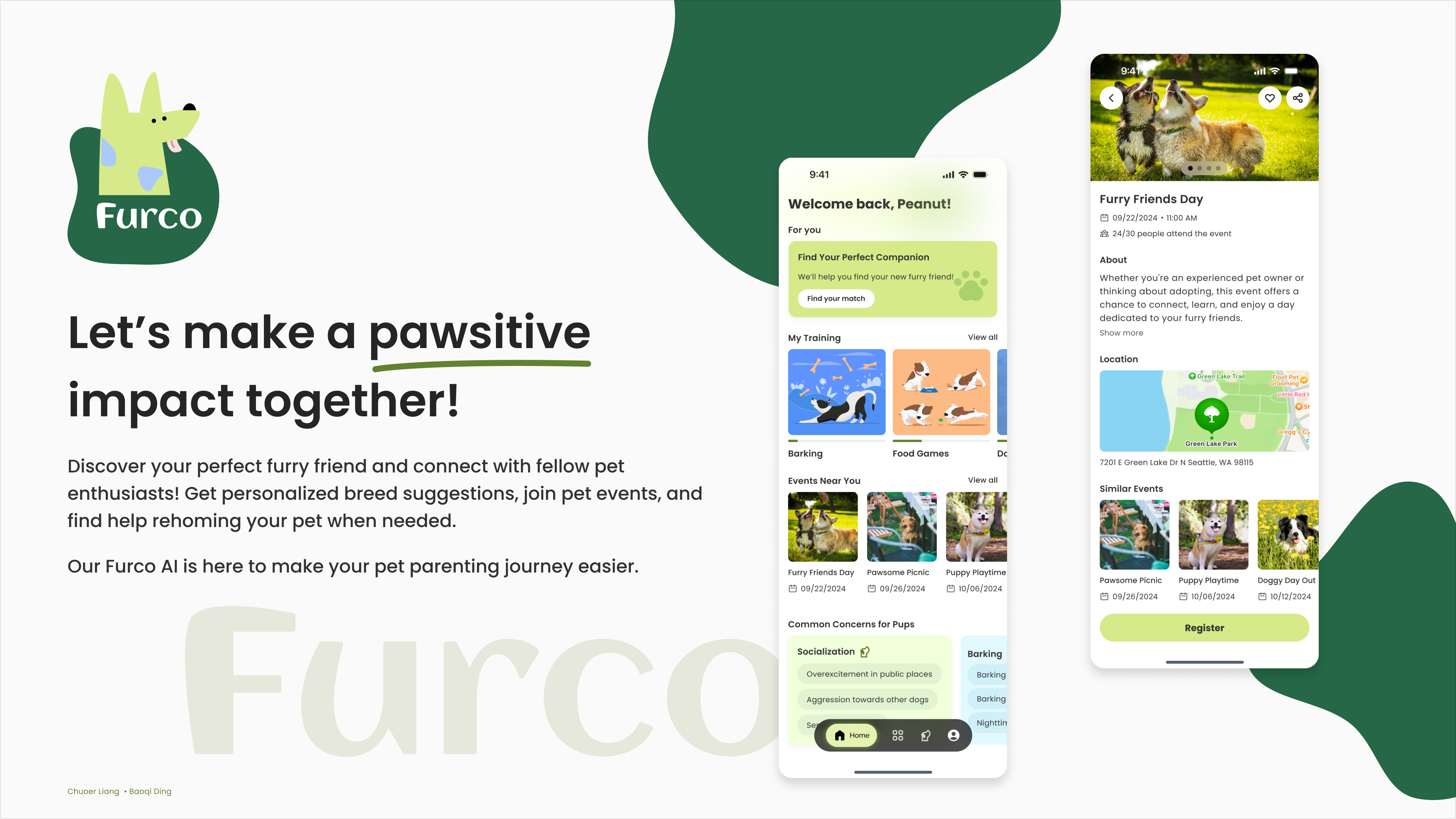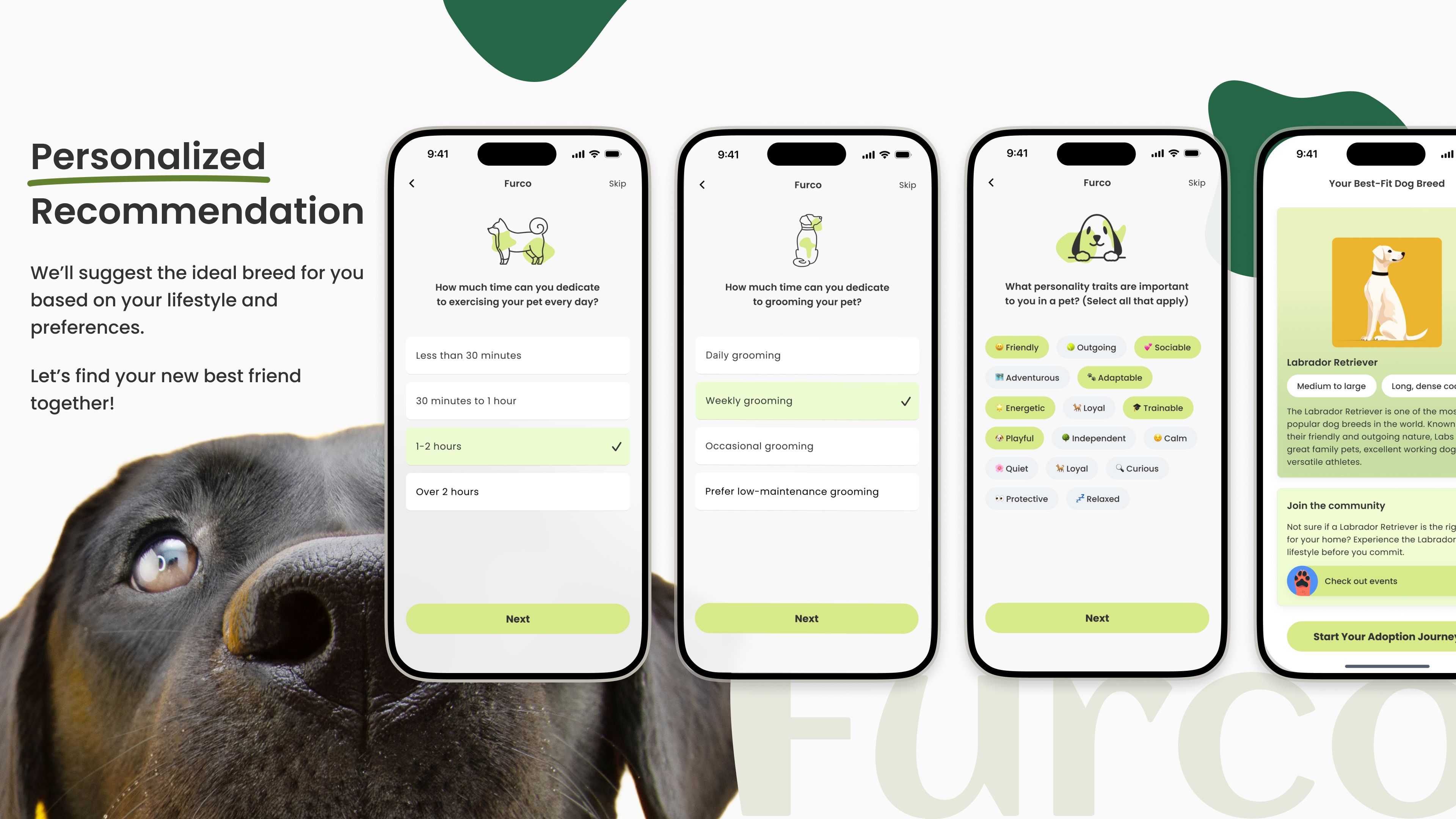 Furco is an all-in-one solution for empowering and enriching your pet's life. Our AI-driven app provides personalized breed recommendations based on your lifestyle, connects you with local community events and resources, and offers crucial support when rehoming is necessary. More than just an app, it’s a tool for making a meaningful difference -- helping to reduce euthanasia rates by responsible rehoming.