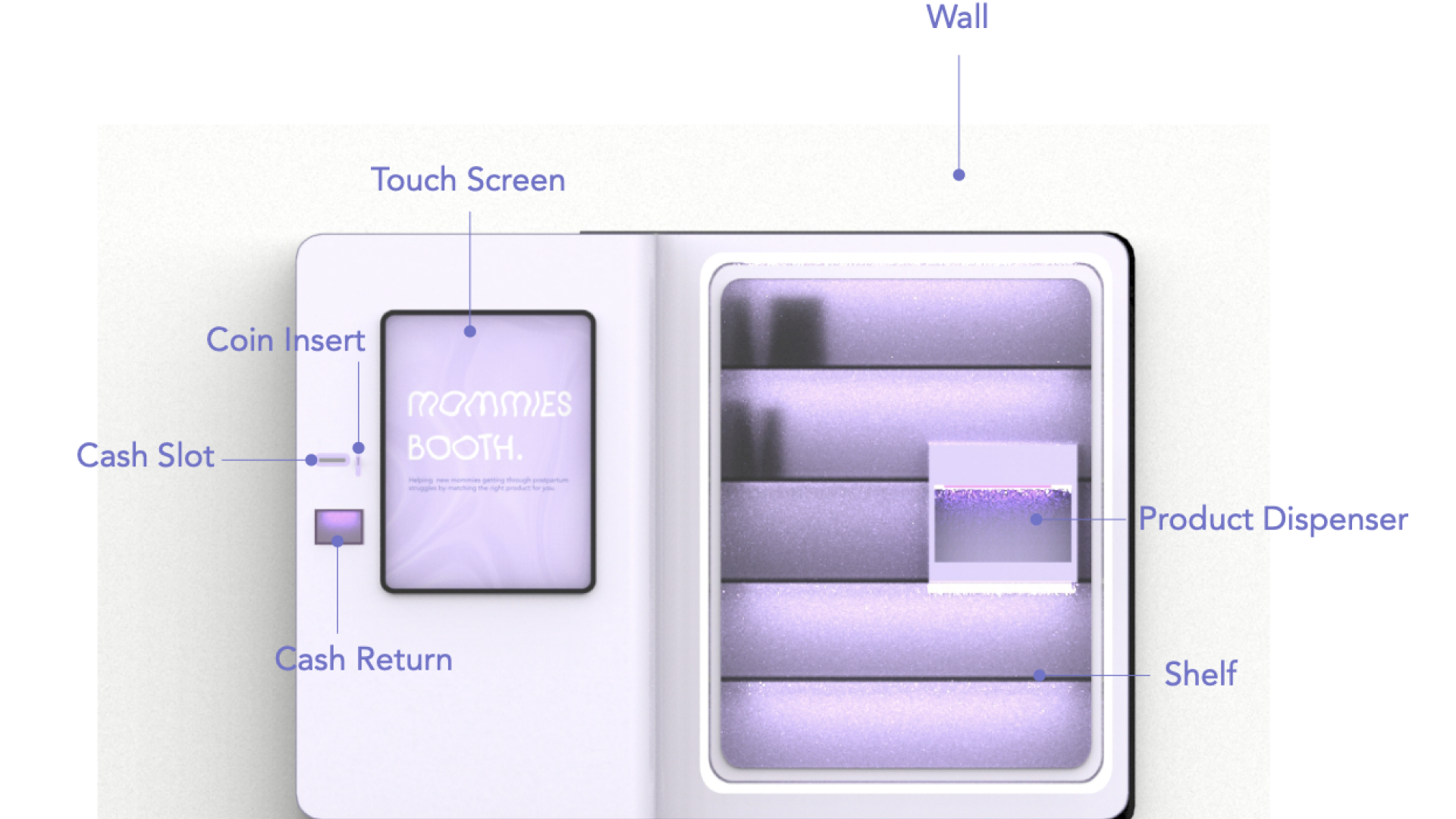 Mommies'Booth is a groundbreaking initiative designed to address the pressing need for accessible, personalized postpartum care for new mothers. The project combines a user-friendly mobile application with strategically placed vending machine stations in public spaces, making essential resources and products readily available to women during this critical time.