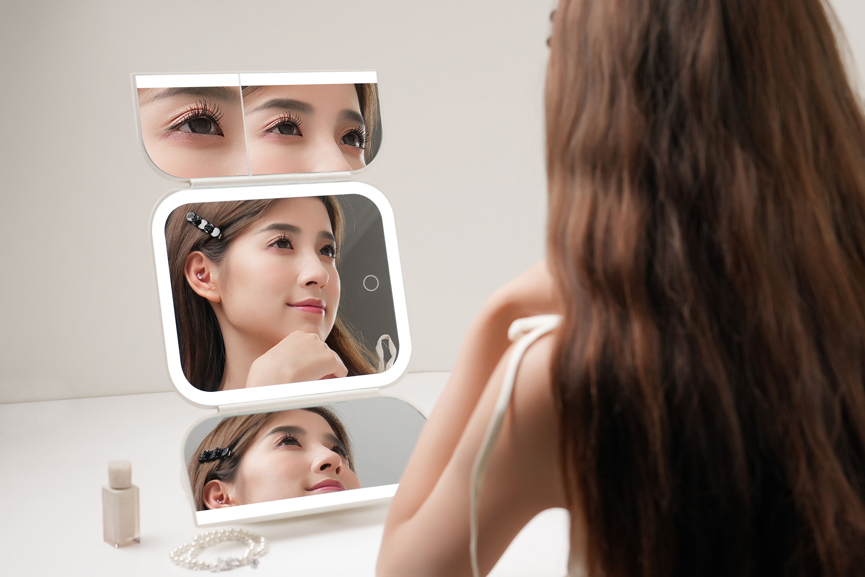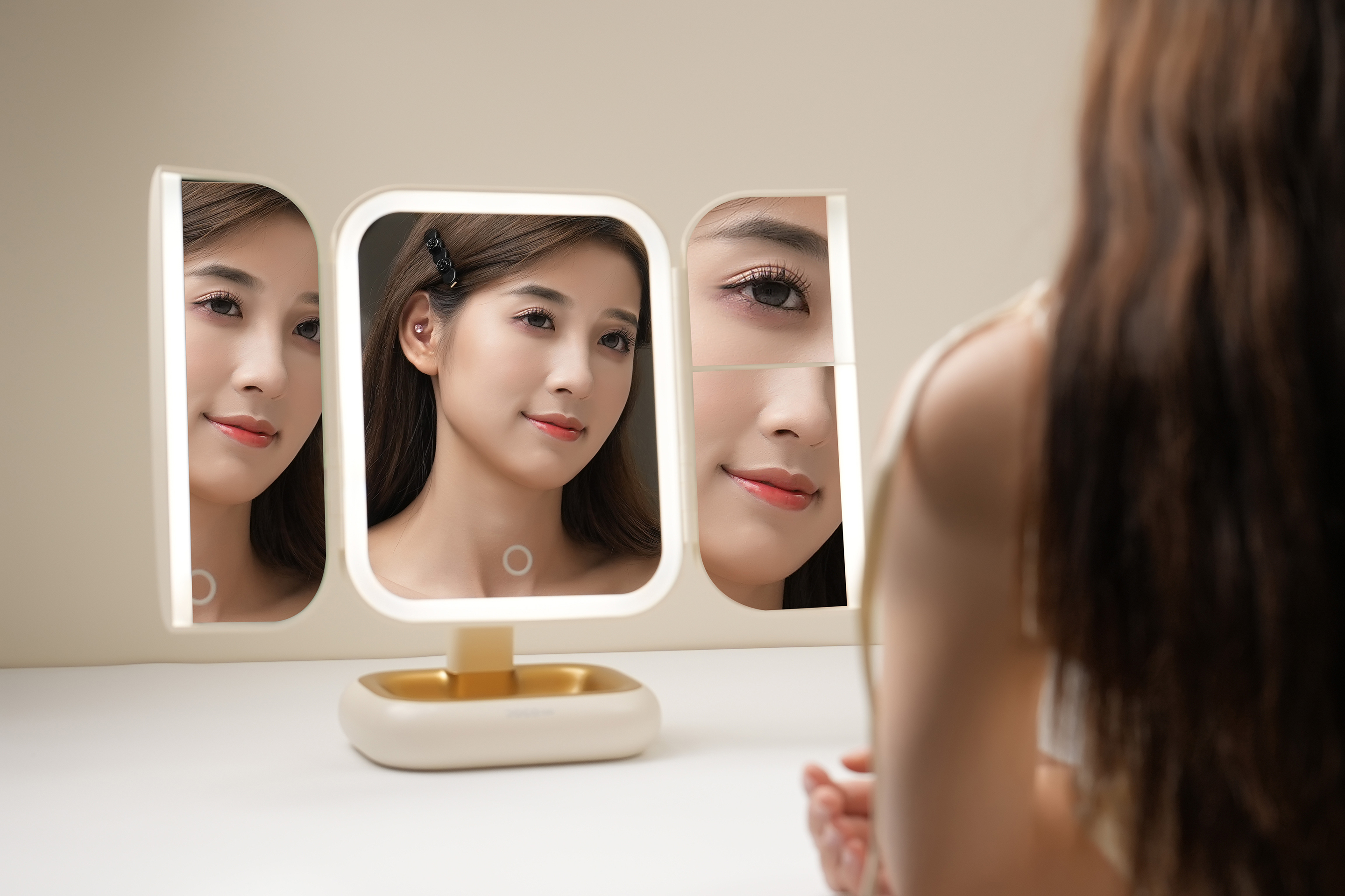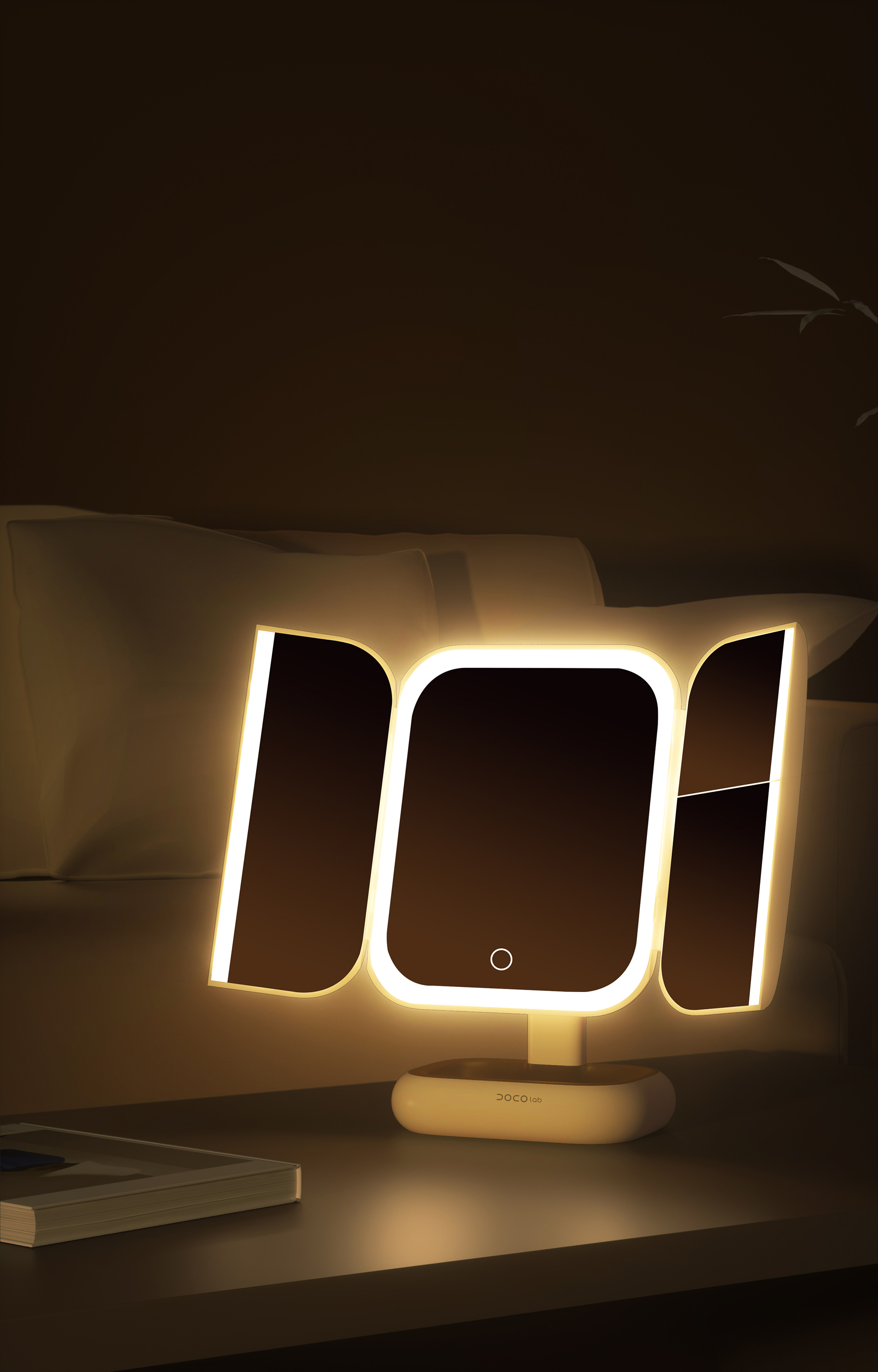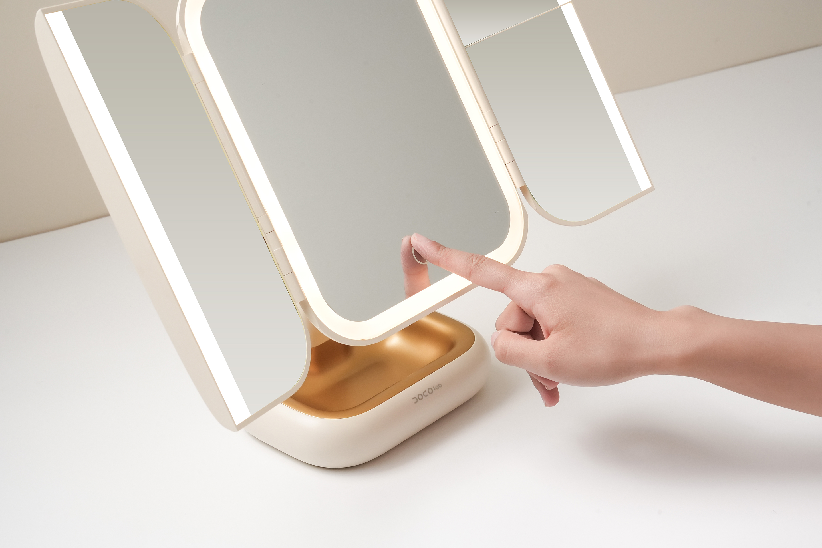 DOCOLAB Makeup Mirror adopts a trifold design, optimizing space utilization and providing a makeup mirror solution that allows multiple angles and light adjustment.
