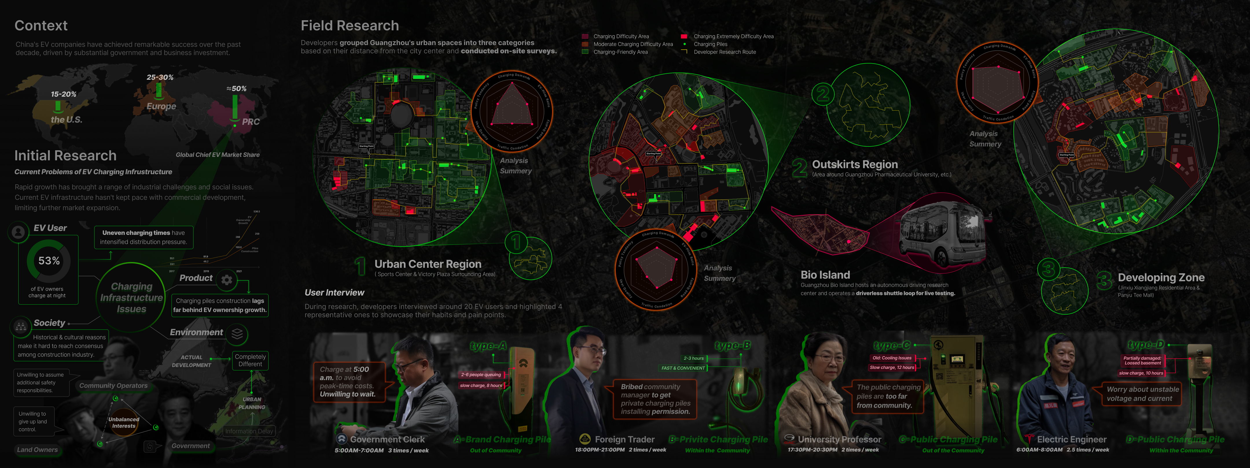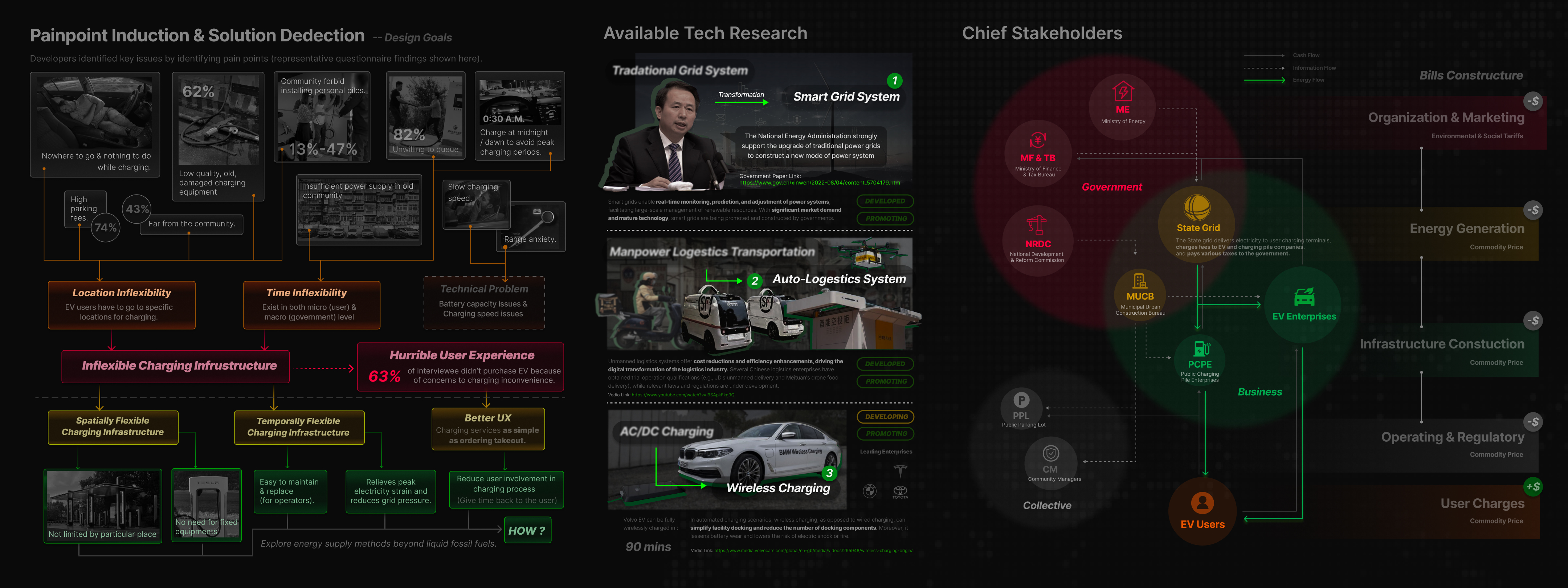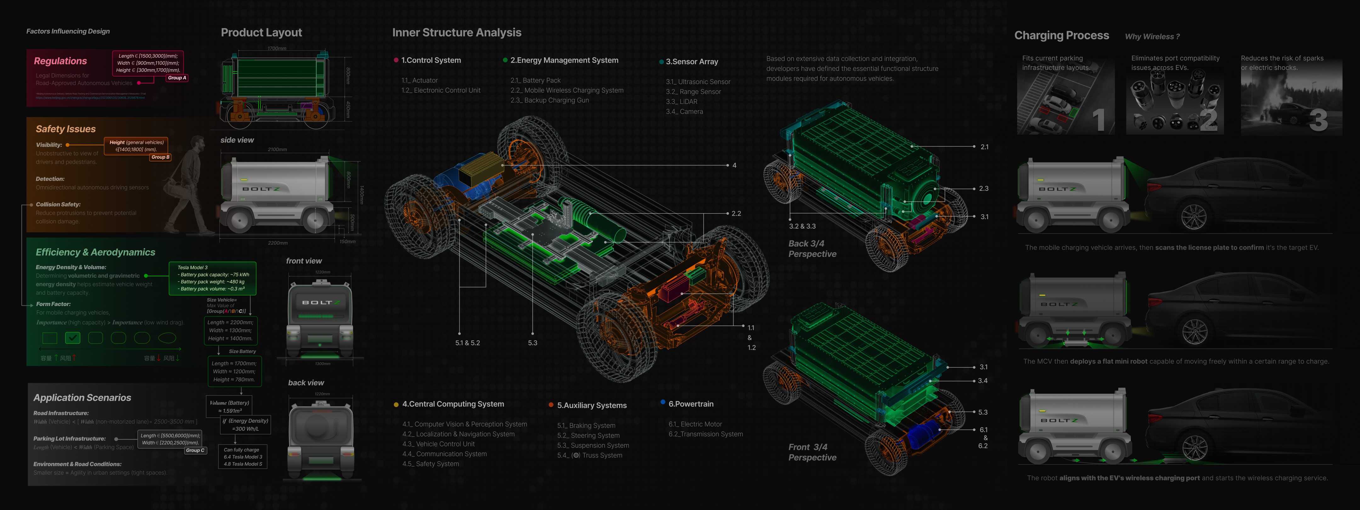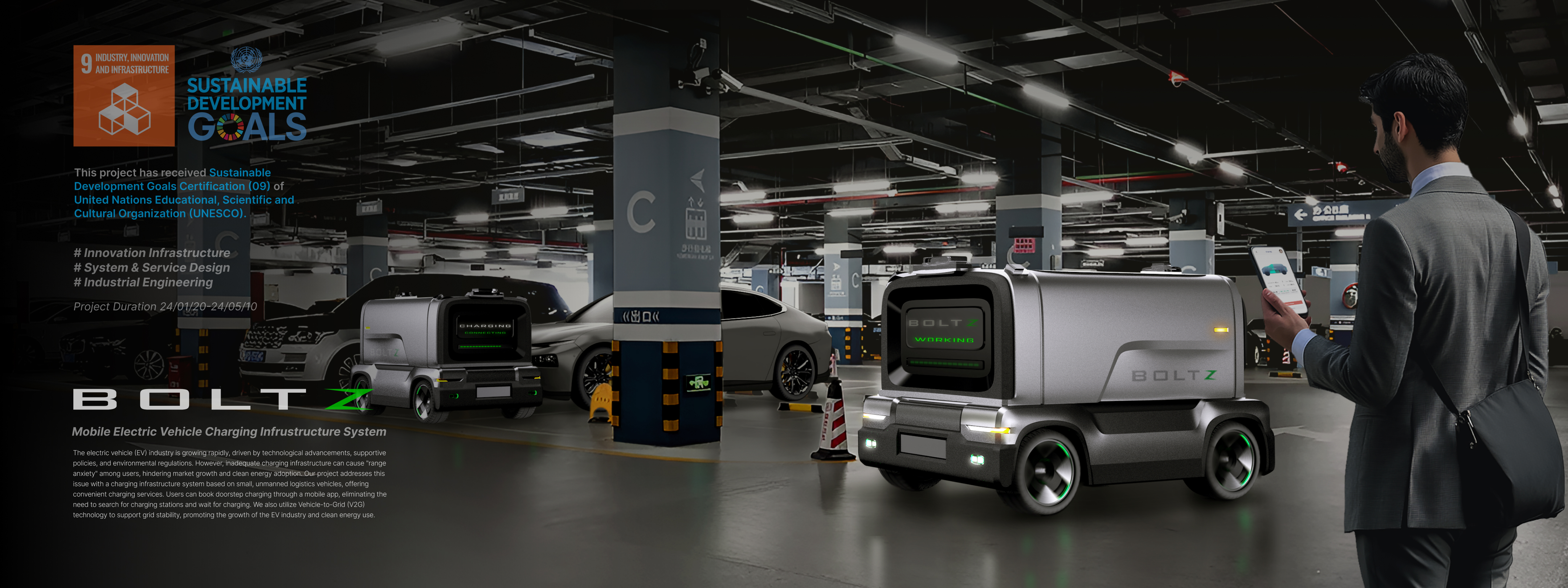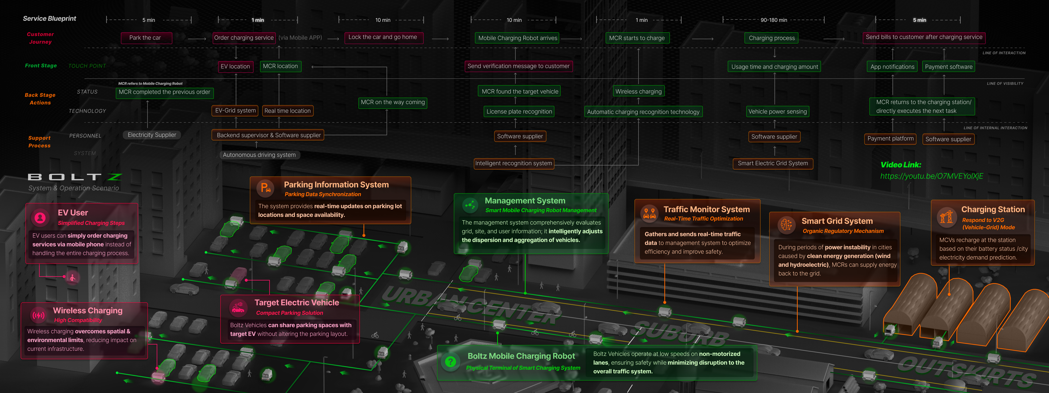 The EV industry is expanding quickly due to technological advancements, supportive policies, and environmental regulations. However, insufficient charging infrastructure causes "range anxiety," hindering growth and clean energy adoption. Our project tackles this issue with a charging infrastructure system using small, autonomous logistics vehicles for convenient doorstep charging via a mobile app. This eliminates the need to find and wait at charging stations. Additionally, we leverage V2G technology to support grid stability, fostering EV industry growth and clean energy use.