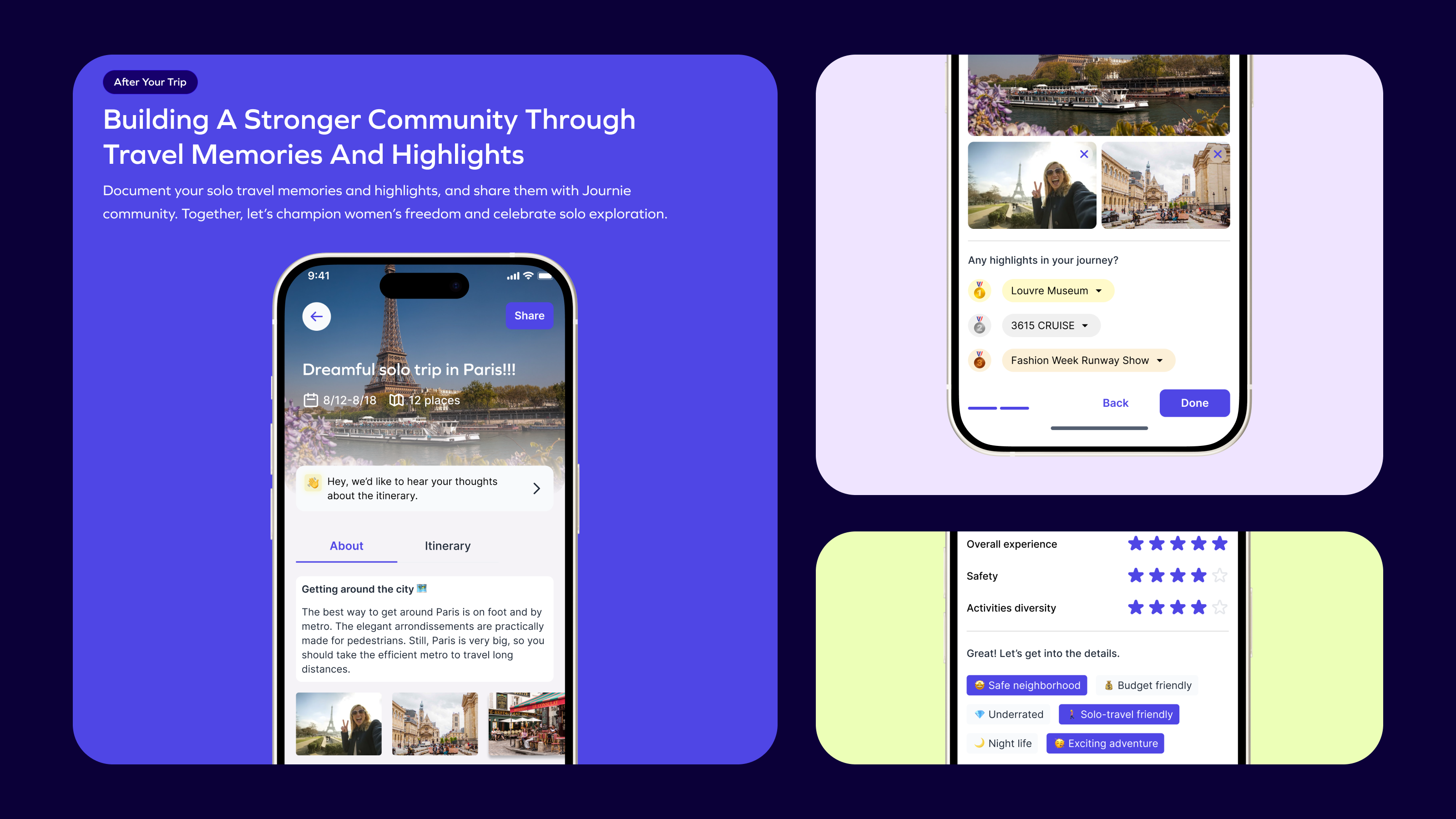 Beyond the practicalities of travel planning, Journie fosters a strong community of like-minded women who share a passion for adventure. Even before their trip starts, users can connect with other travelers, share experiences, and access valuable travel tips from the Journie community. Journie also encourages travelers to document and share their journeys, creating a rich tapestry of stories that inspire and empower others.