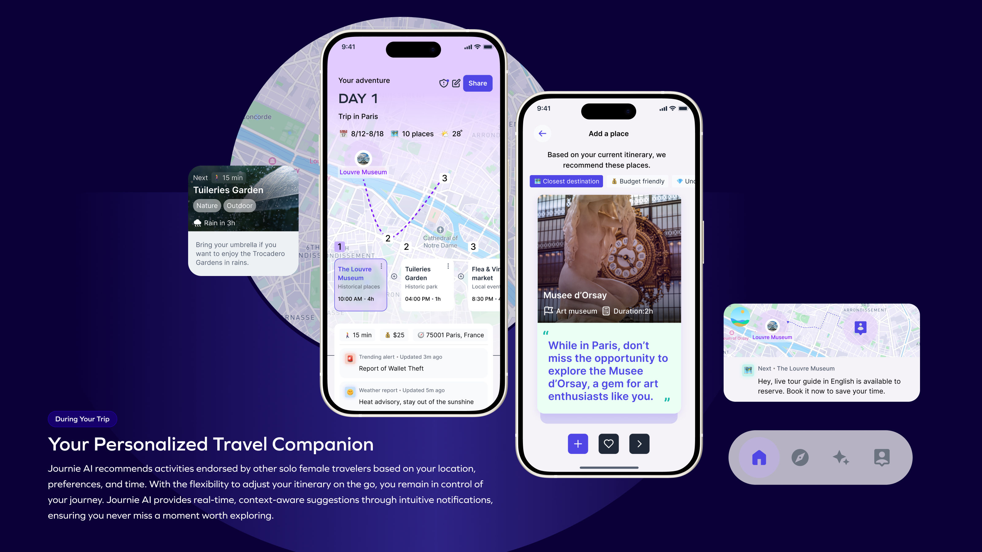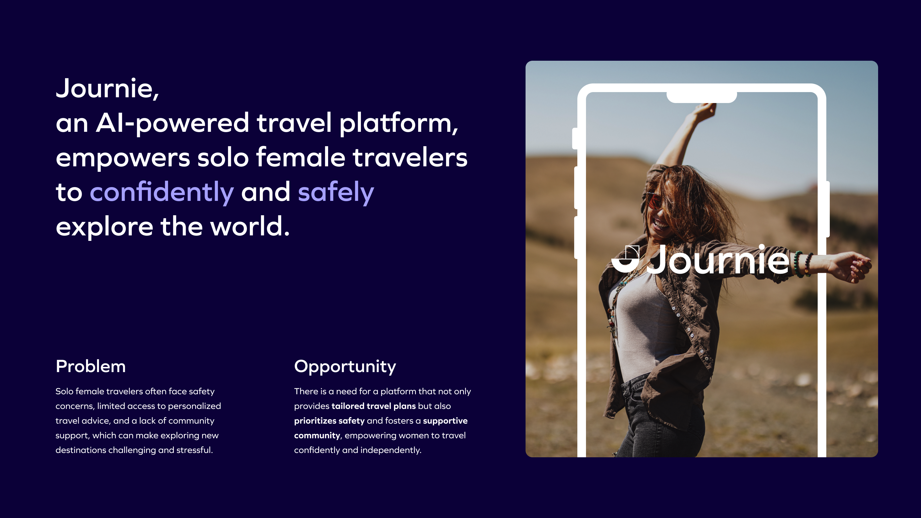 Journie, an AI-powered travel platform, empowers solo female travelers to confidently and safely explore the world. Recognizing the unique challenges women face while traveling alone, Journie offers a suite of tools and features that prioritize personalization, safety, and community connection. The platform allows users to create personalized travel itineraries based on their interests, local climate, and trending events, with the flexibility to adjust plans on the go.