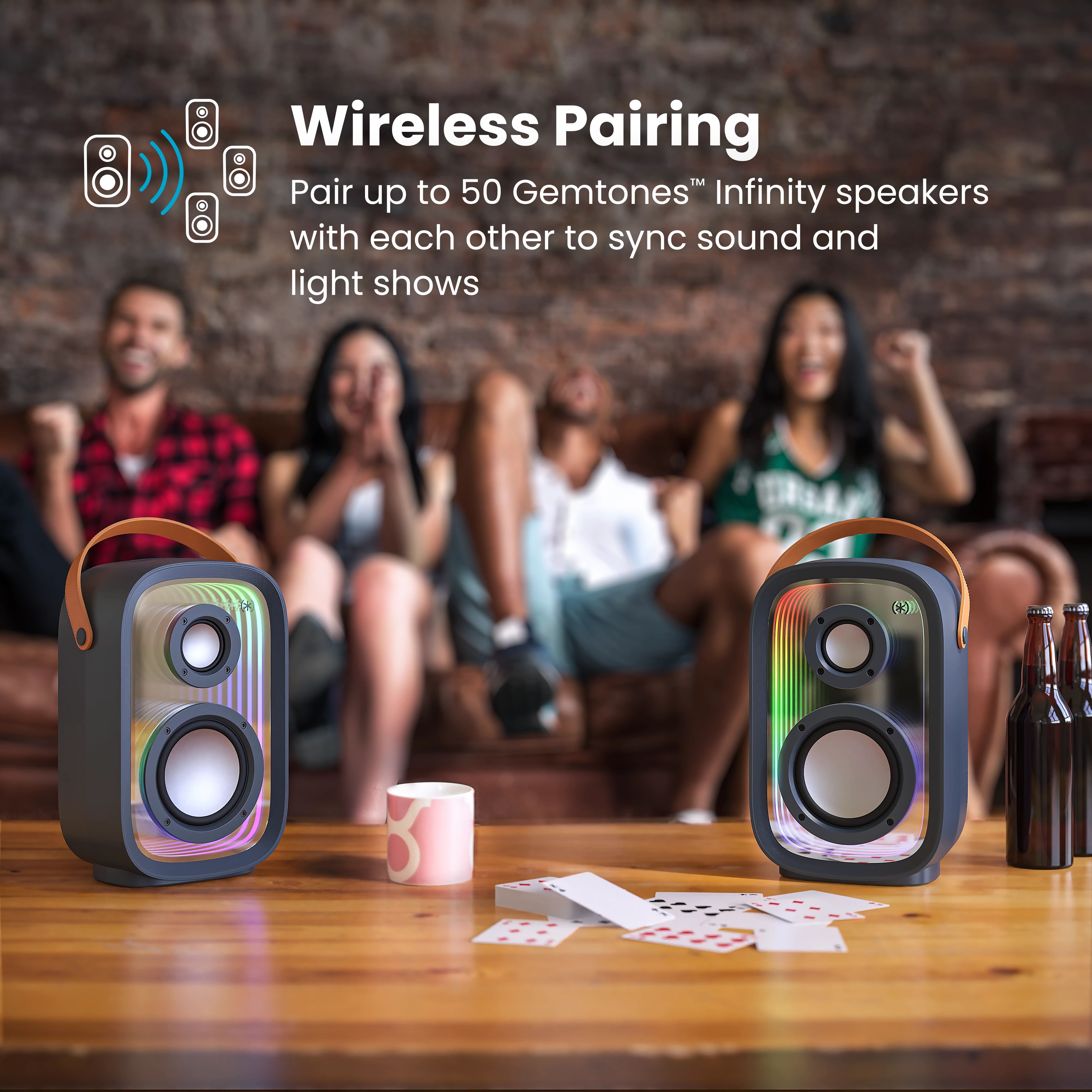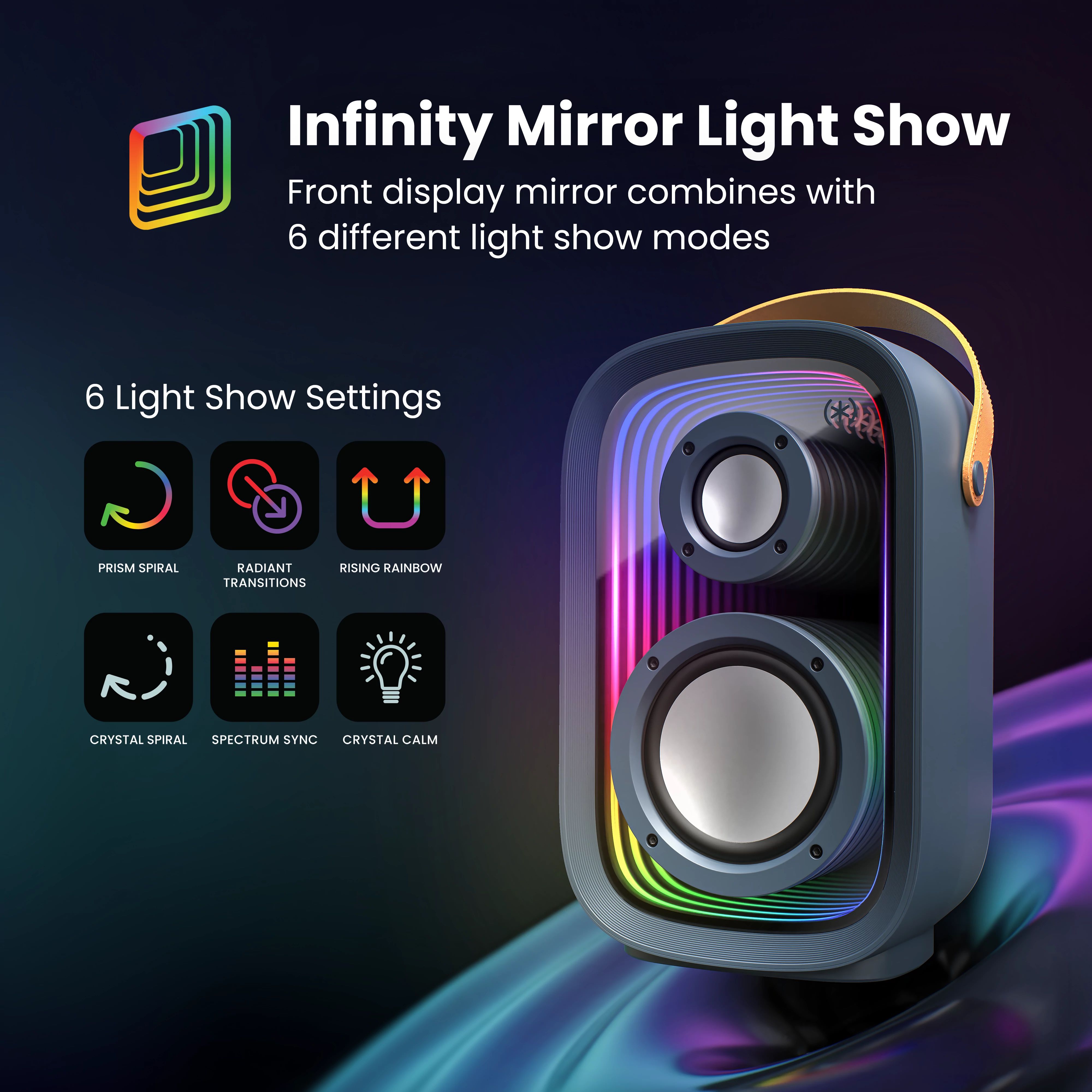 Its vibrant Infinity Mirror Light Show settings instantly energize any room, offering the perfect blend of style and entertainment with six dynamic light settings that sync to the beat of the music. Coupled with four customizable equalization audio modes, it provides an immersive, high-quality music experience without compromising on visual flair. For an even richer experience, you can wirelessly pair up to 50 Infinity speakers for a seamless, expansive soundscape.