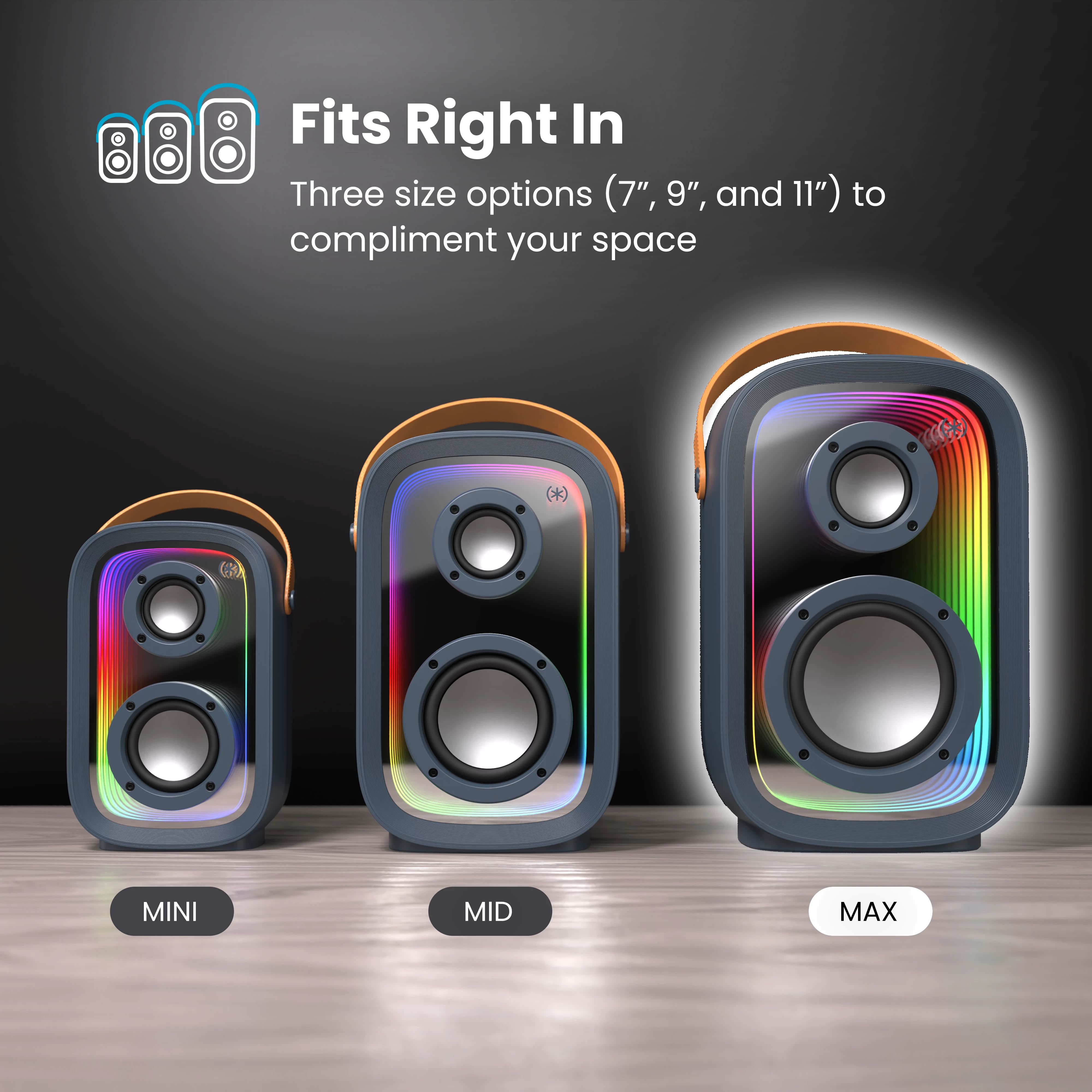 Available in three portable sizes—Mini, Mid, and Max—each model is crafted to stand out, making it ideal for any occasion or personal use. Its lightweight build and convenient leatherette strap make it effortlessly portable, so you can take the party wherever you go.