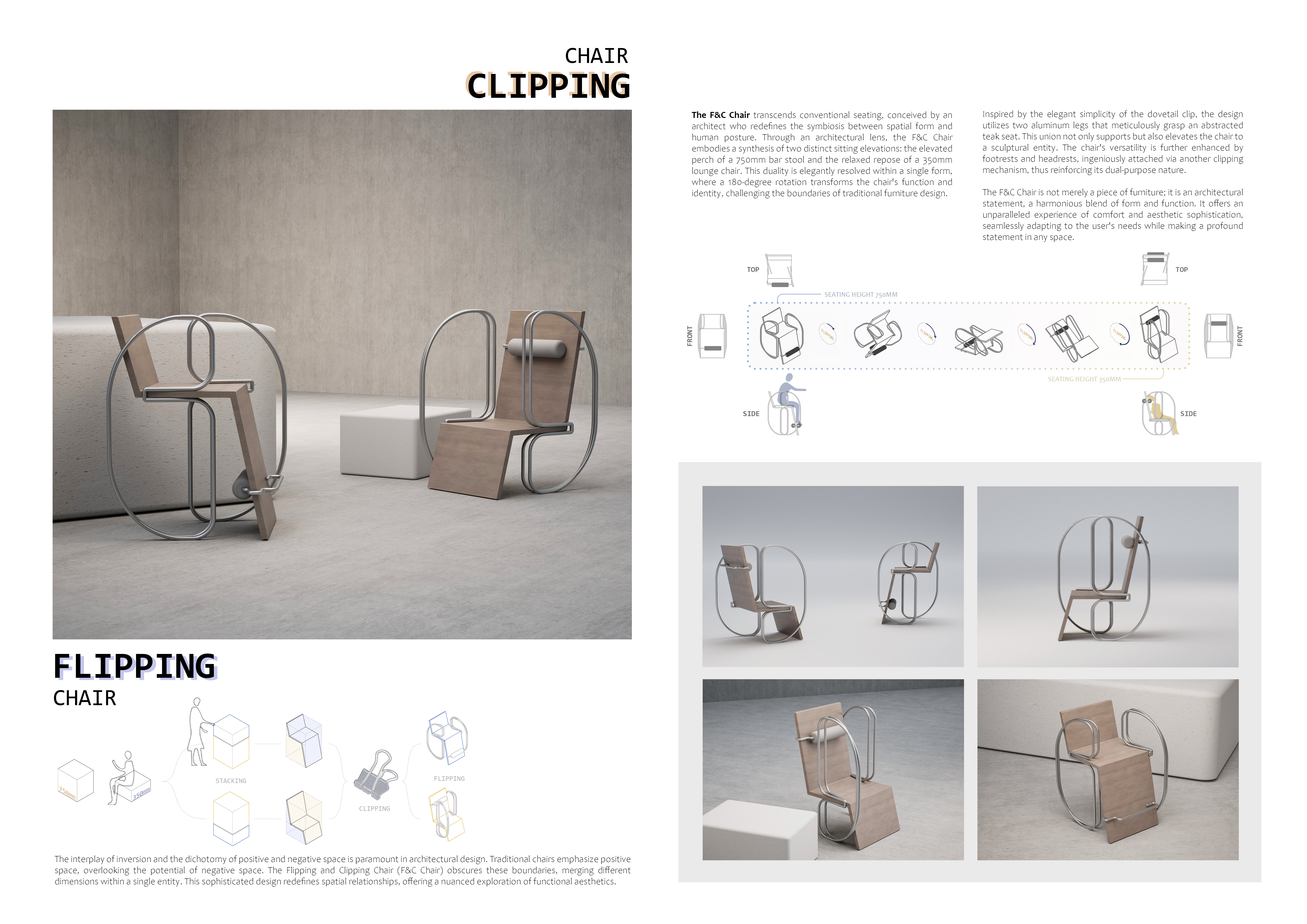 The F&C Chair transcends conventional seating, conceived by an architect who redefines the symbiosis between spatial form and human posture. Through an architectural lens, the F&C Chair embodies a synthesis of two distinct sitting elevations: the elevated perch of a 750mm bar stool and the relaxed repose of a 350mm lounge chair. This duality is elegantly resolved within a single form, where a 180-degree rotation transforms the chair's function and identity, challenging the boundaries of traditional furniture design.