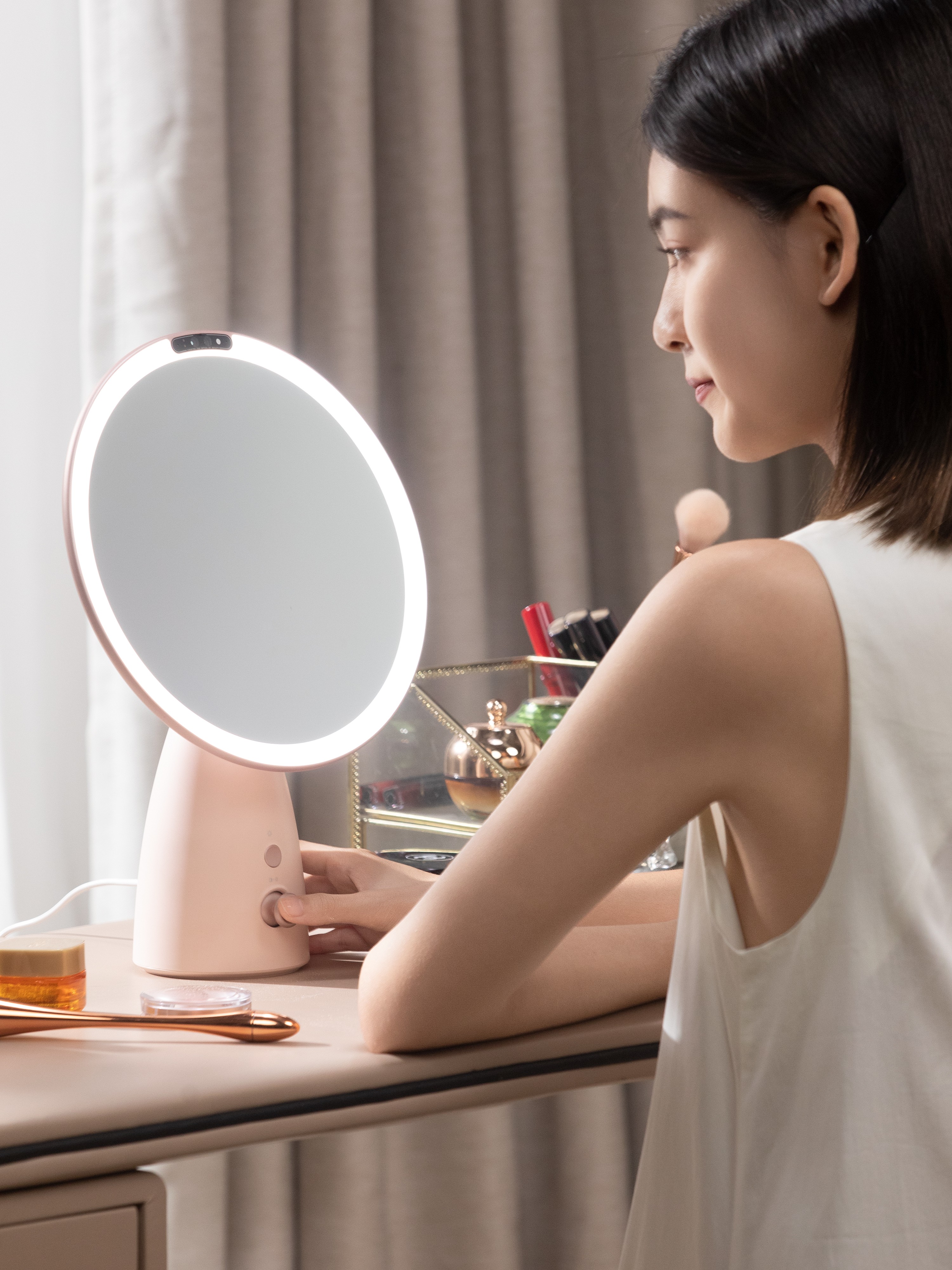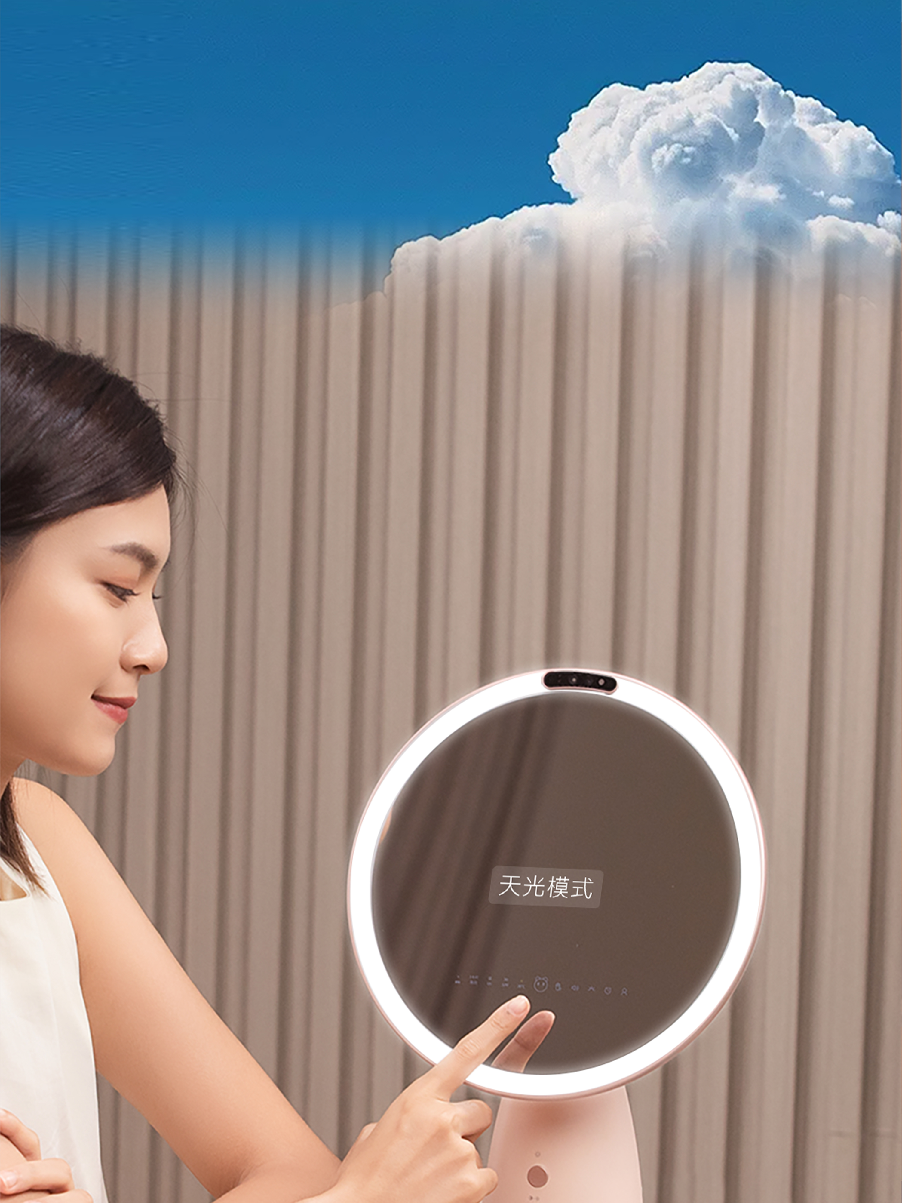 To adapt to diverse usage scenarios, the makeup mirror is equipped with multiple sets of light sources, which can achieve nine lighting effects ranging from natural light to various specific occasions, such as daylight, morning light, stage light, and live streaming. Especially the industry-first ‘daylight’ mode can simulate the outdoor lighting conditions of the user's current location, ensuring consistency of makeup indoors and outdoors. In addition, the product features a five-way button that allows users to freely adjust the brightness and color temperature of the light, as well as quickly switch between different modes, enhancing convenience.