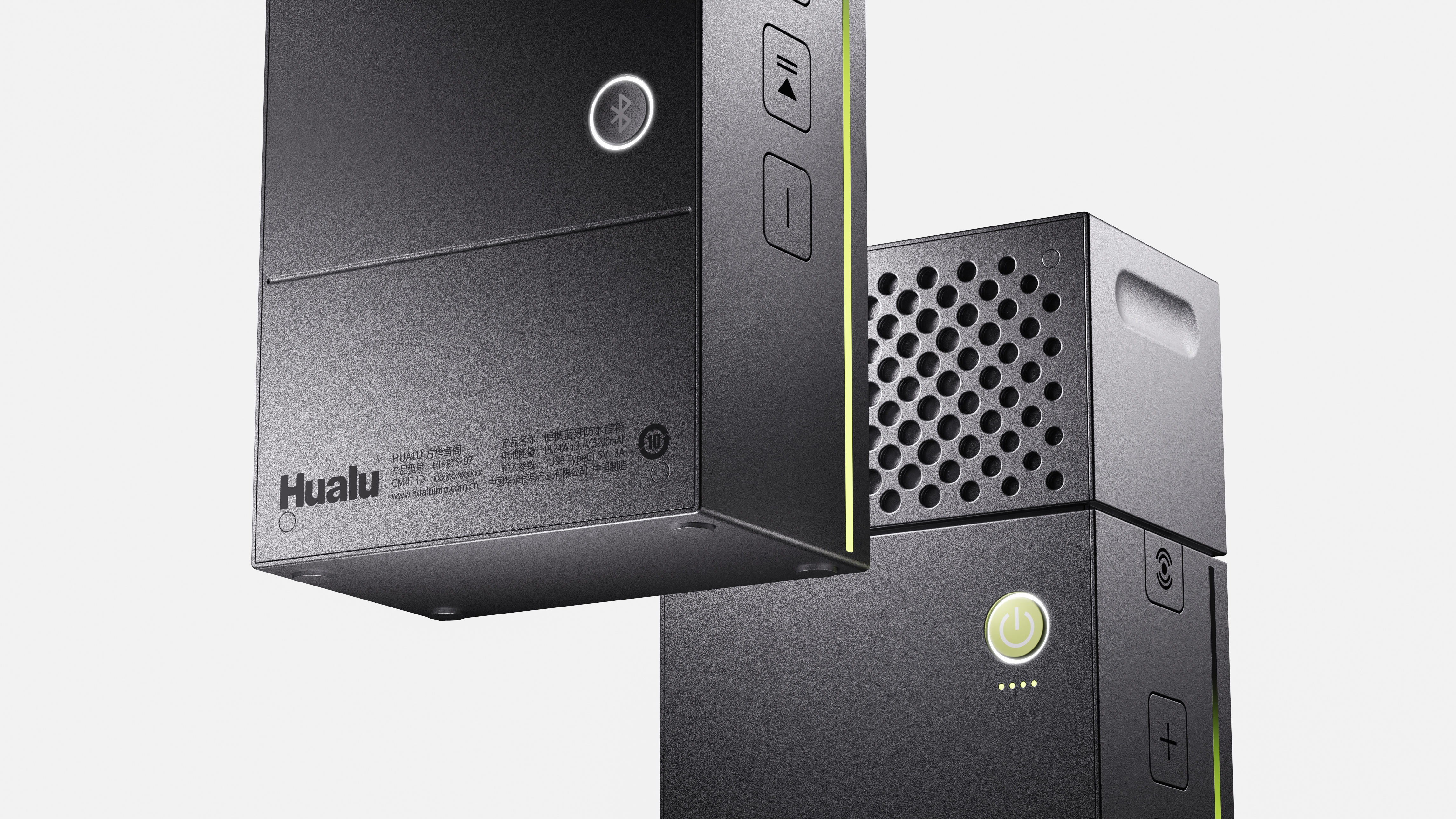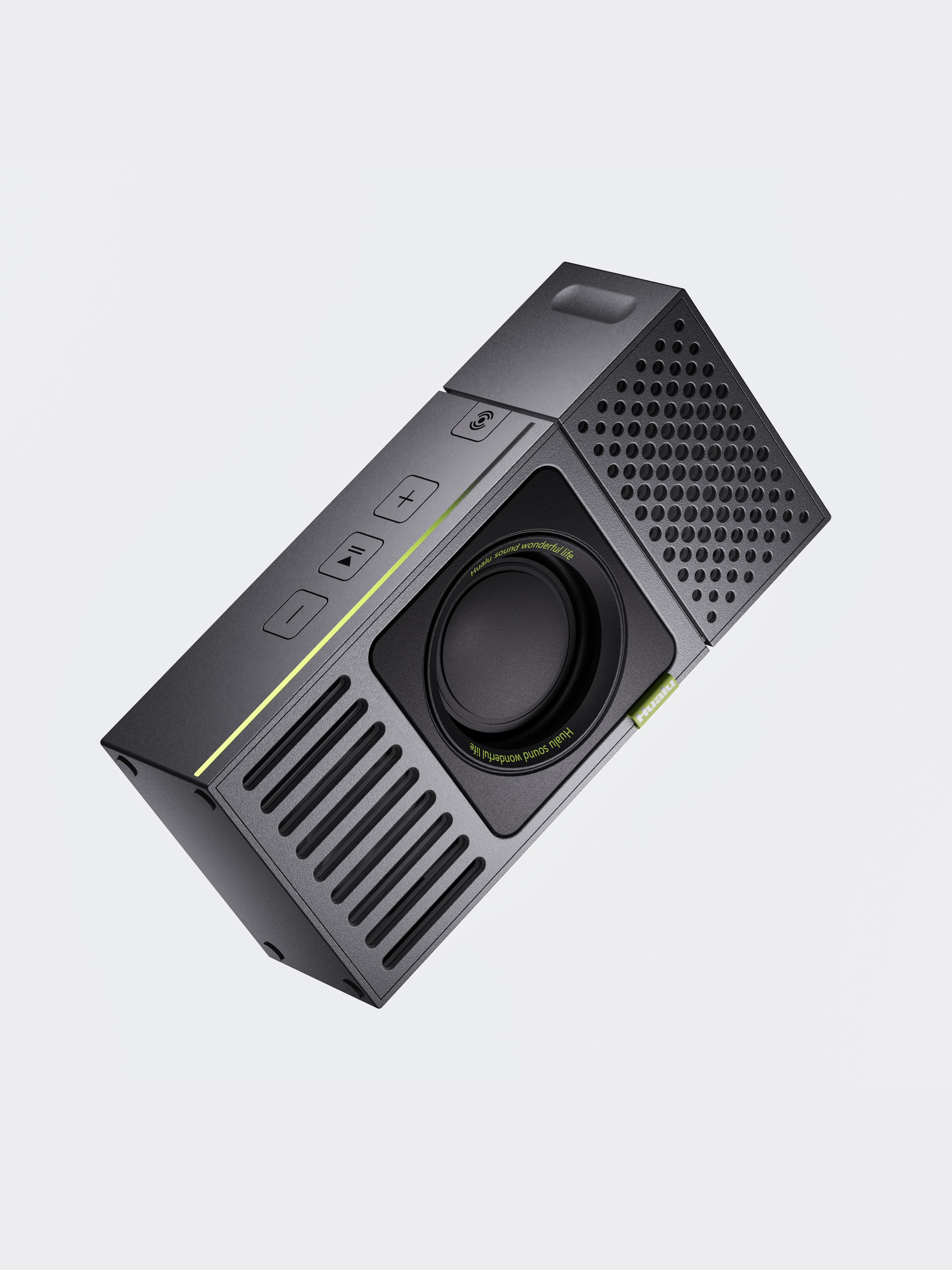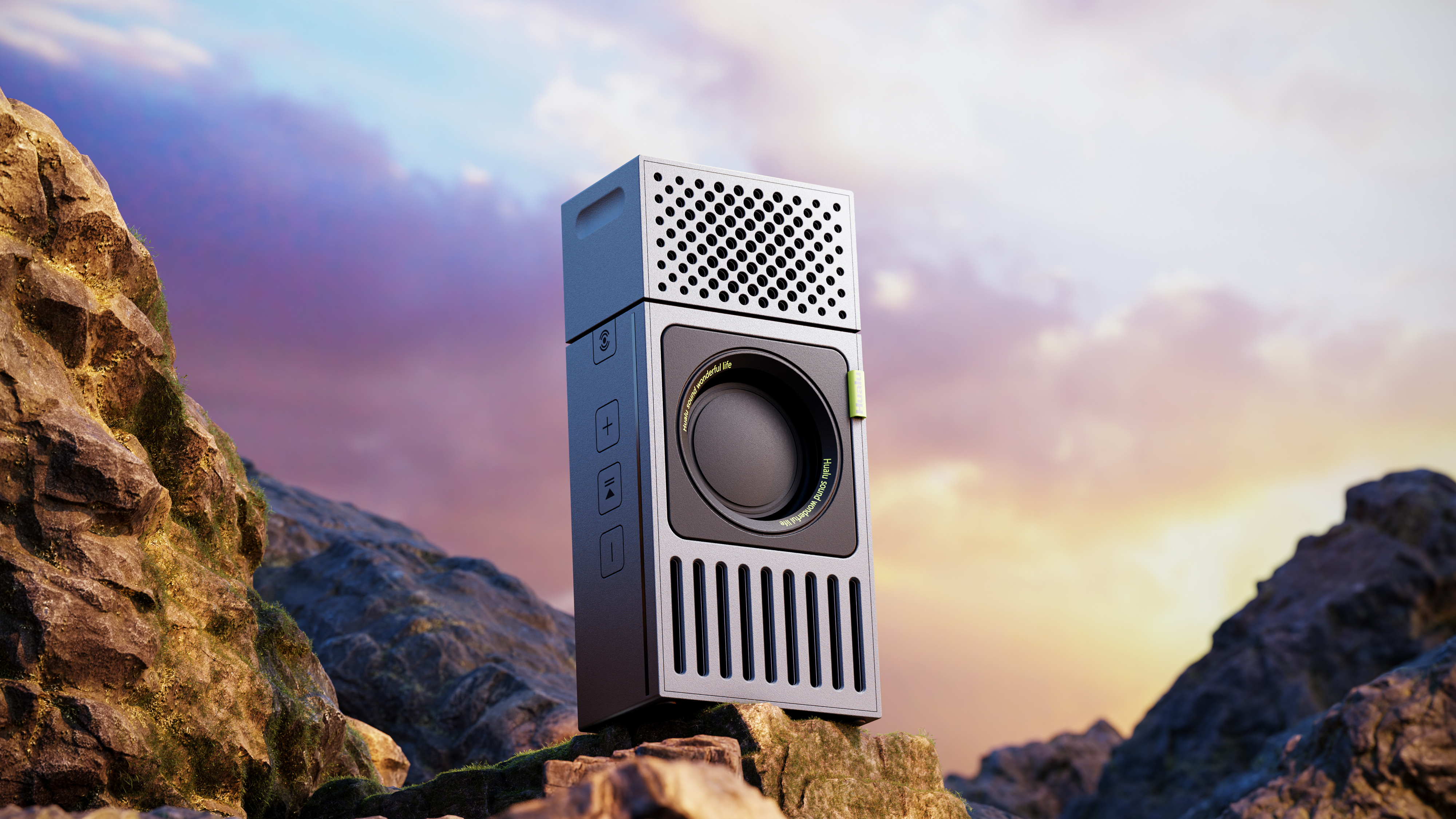 The device's compact design not only facilitates ease of transport but also allows for both horizontal and vertical placement to accommodate various environmental needs. Upon activation and deactivation, the dynamic lighting effects from the integrated light strip contribute to a highly engaging interactive experience, thereby enhancing the intelligent interaction between the user and the speaker. Additionally, to better harmonize with outdoor settings, the design draws inspiration from vintage speakers while aligning with contemporary minimalist aesthetics through the use of sleek geometric lines and a vibrant, bold, contrasting colour palette. This combination creates a striking visual balance between rugged durability and avant-garde fashion.