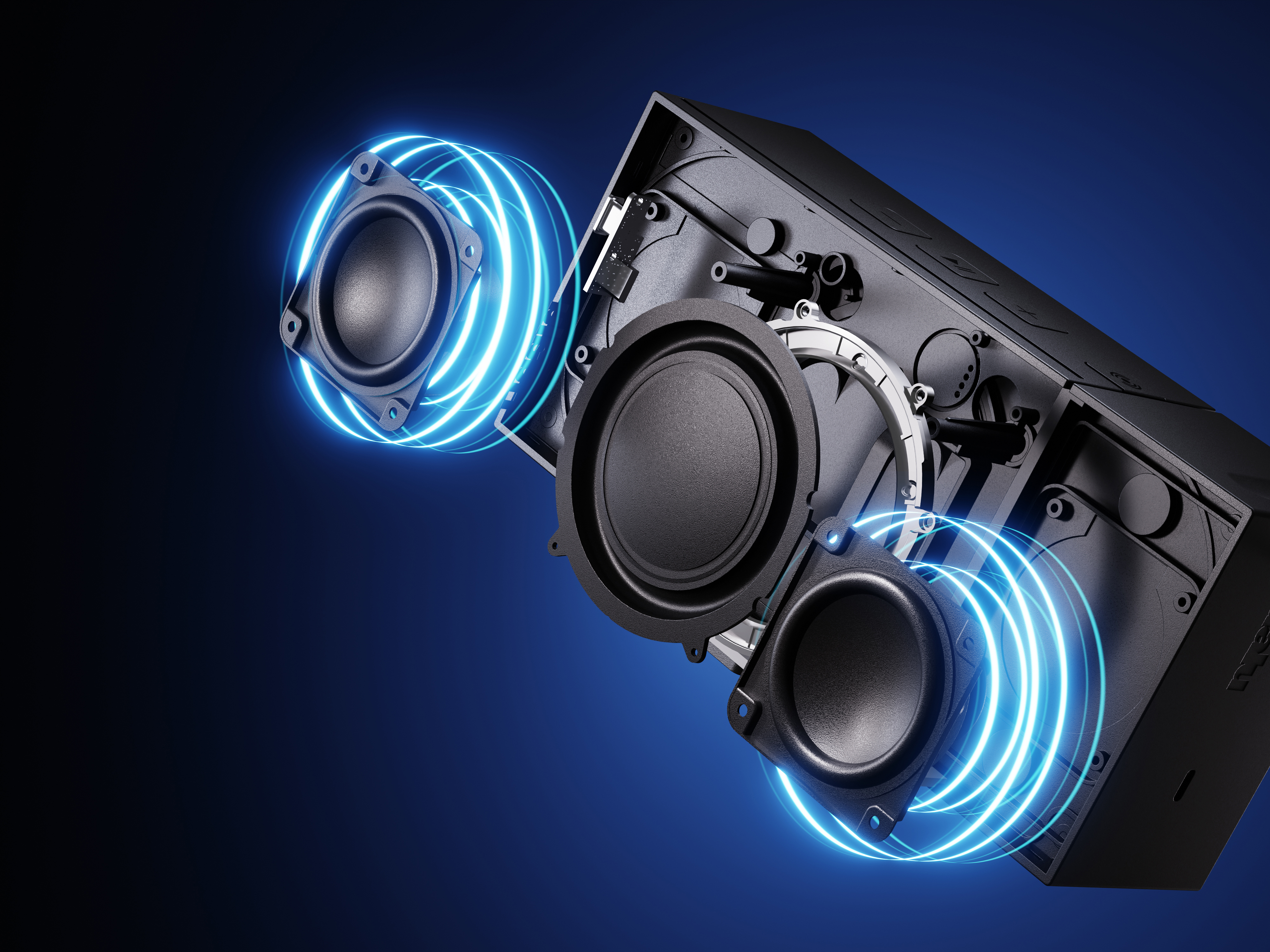 Utilizing Dynamore surround sound technology, the speaker significantly broadens the sound field, providing users with a three-dimensional listening experience. Coupled with AI equalizer technology, sound quality is automatically optimized based on the speaker's placement, delivering a more natural and seamless auditory effect. Additionally, the inclusion of two aluminium full-range drivers and a passive bass radiator further enhances the immersive experience.